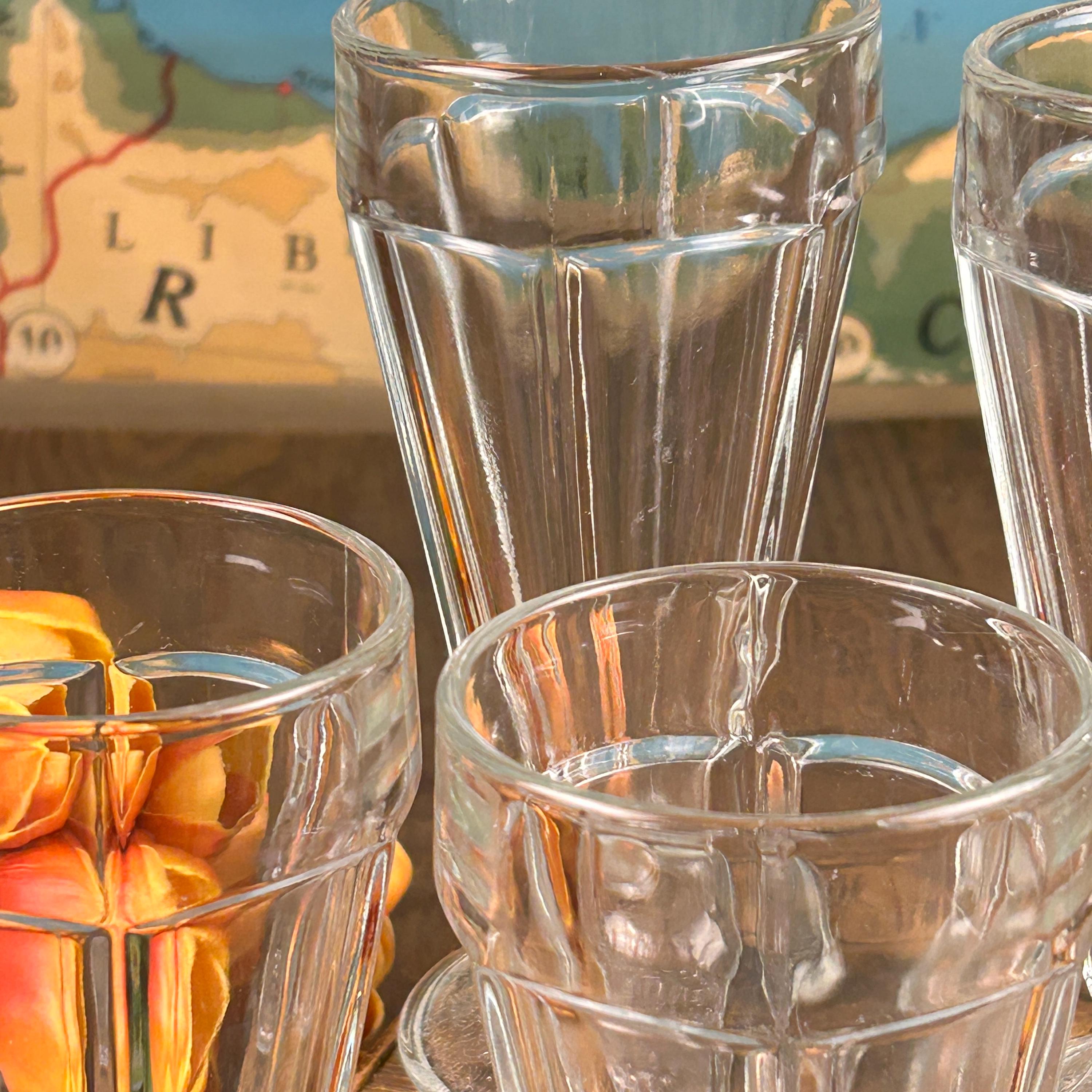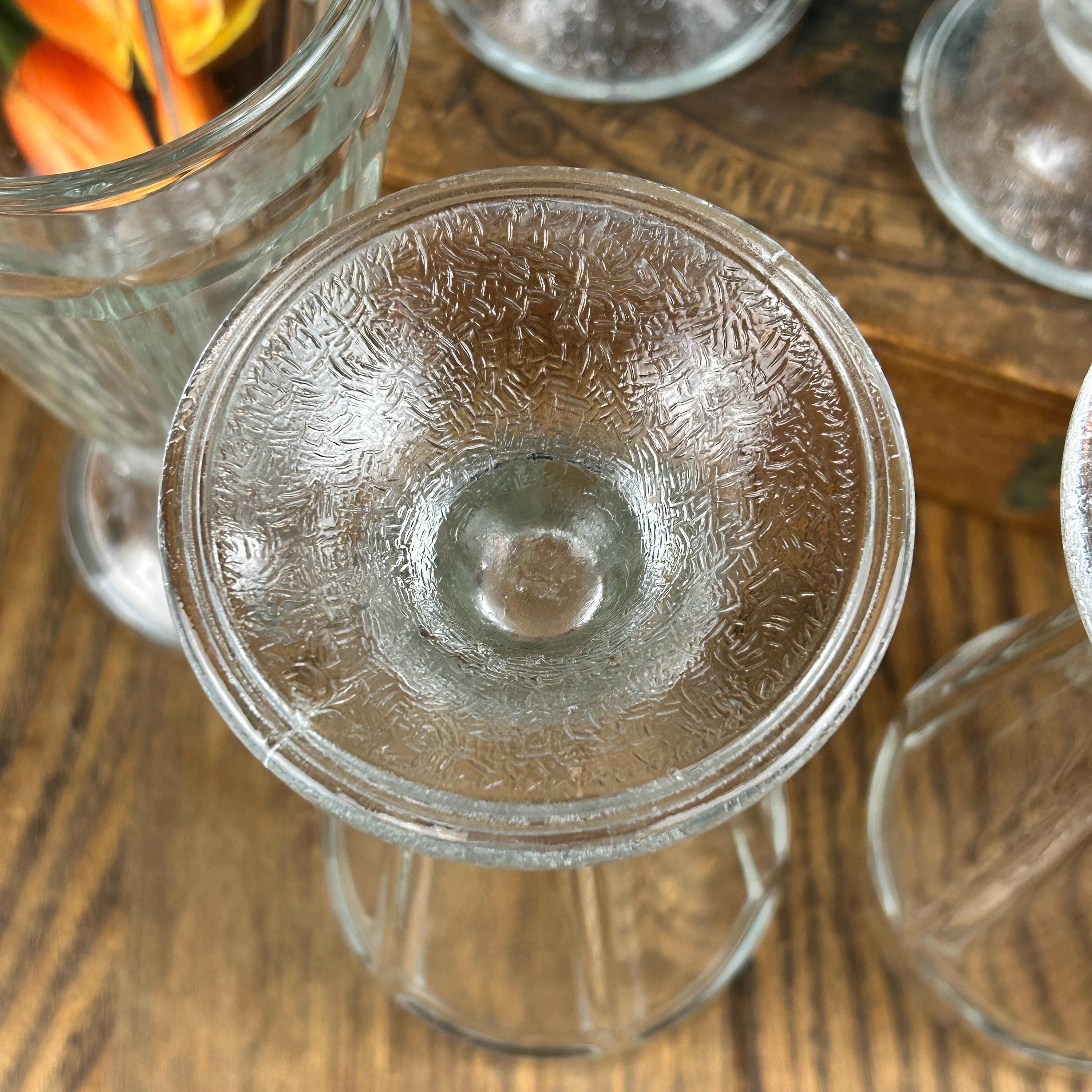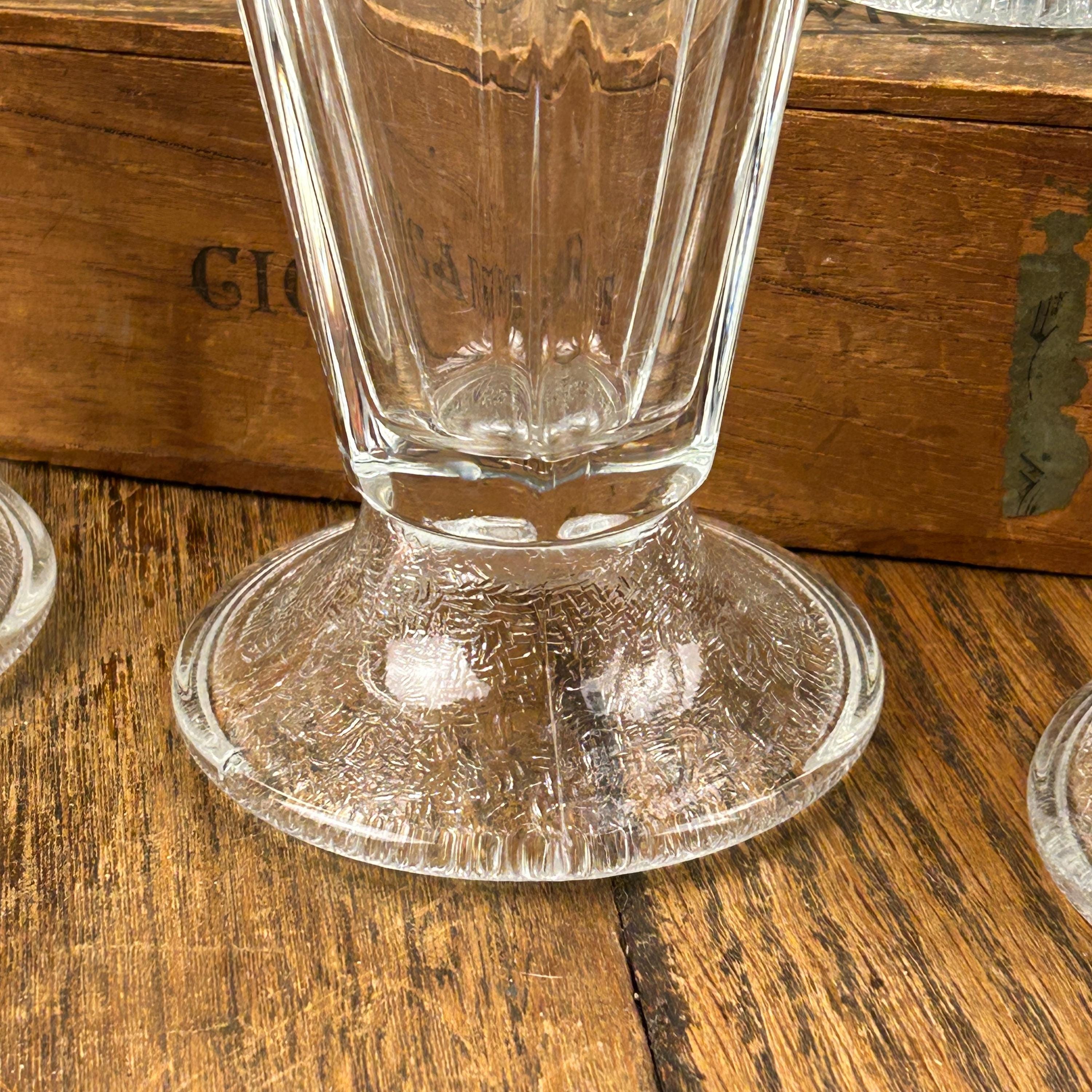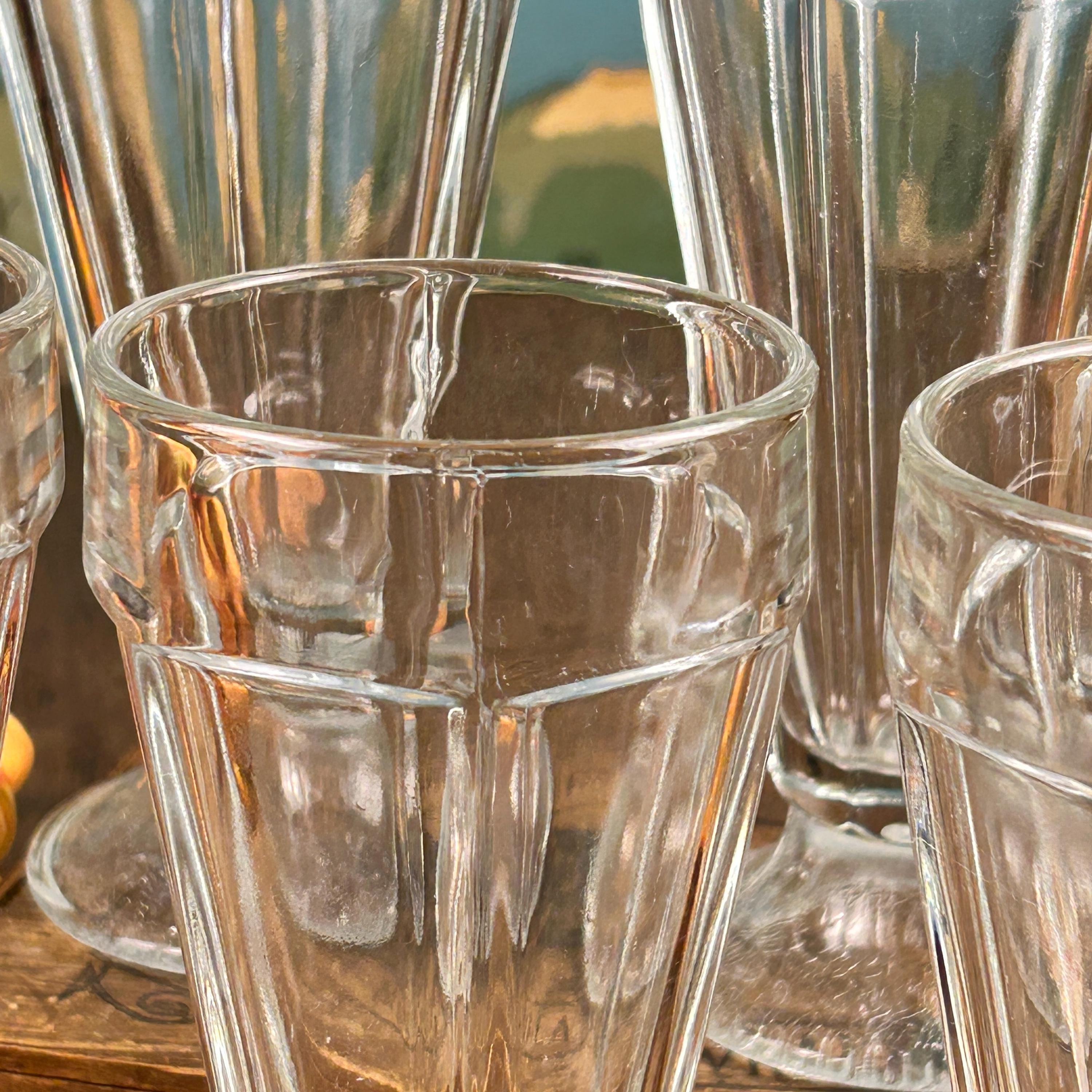 This is a rare vintage set of five soda shop milkshake glasses—the perfect addition to any midcentury modern kitchen decor.