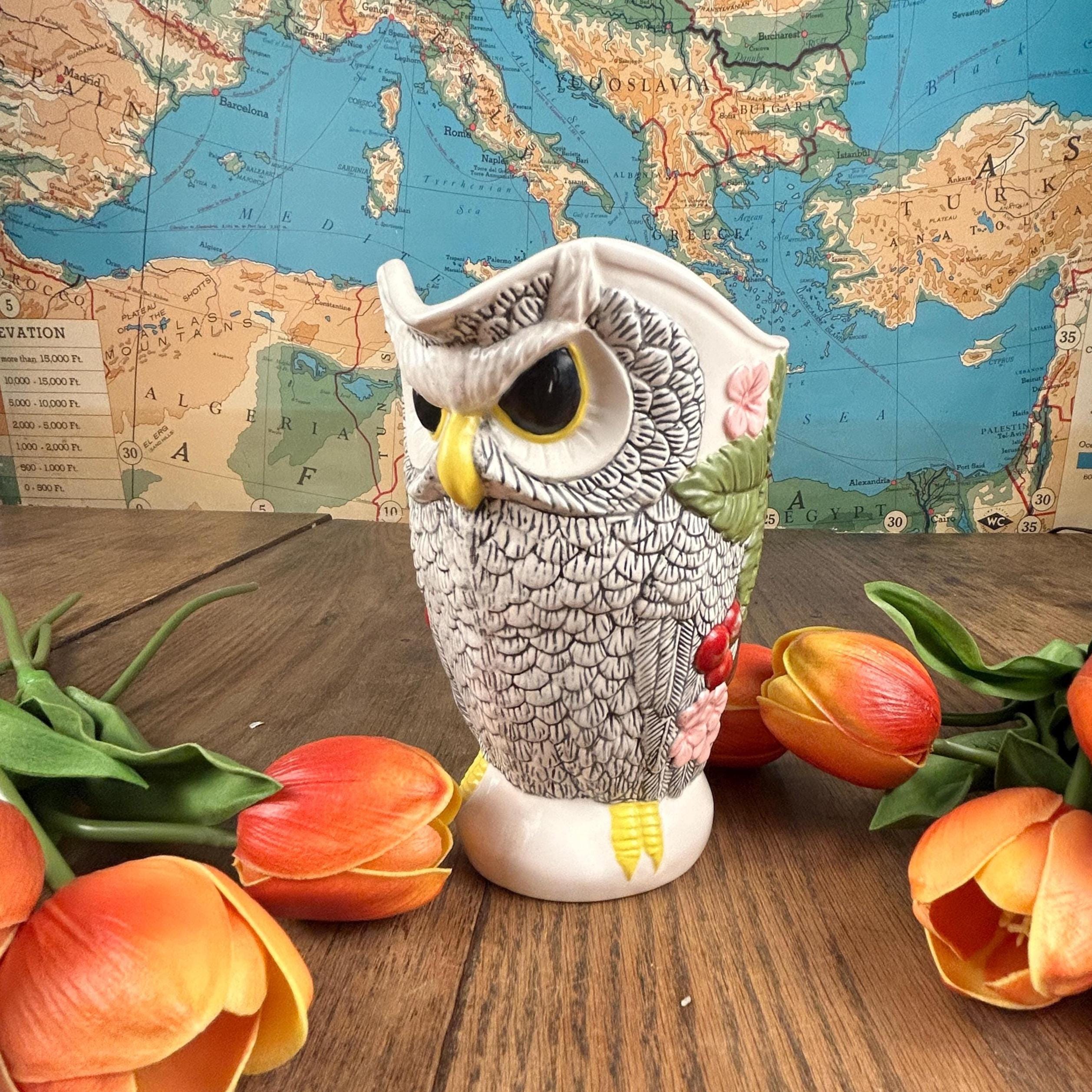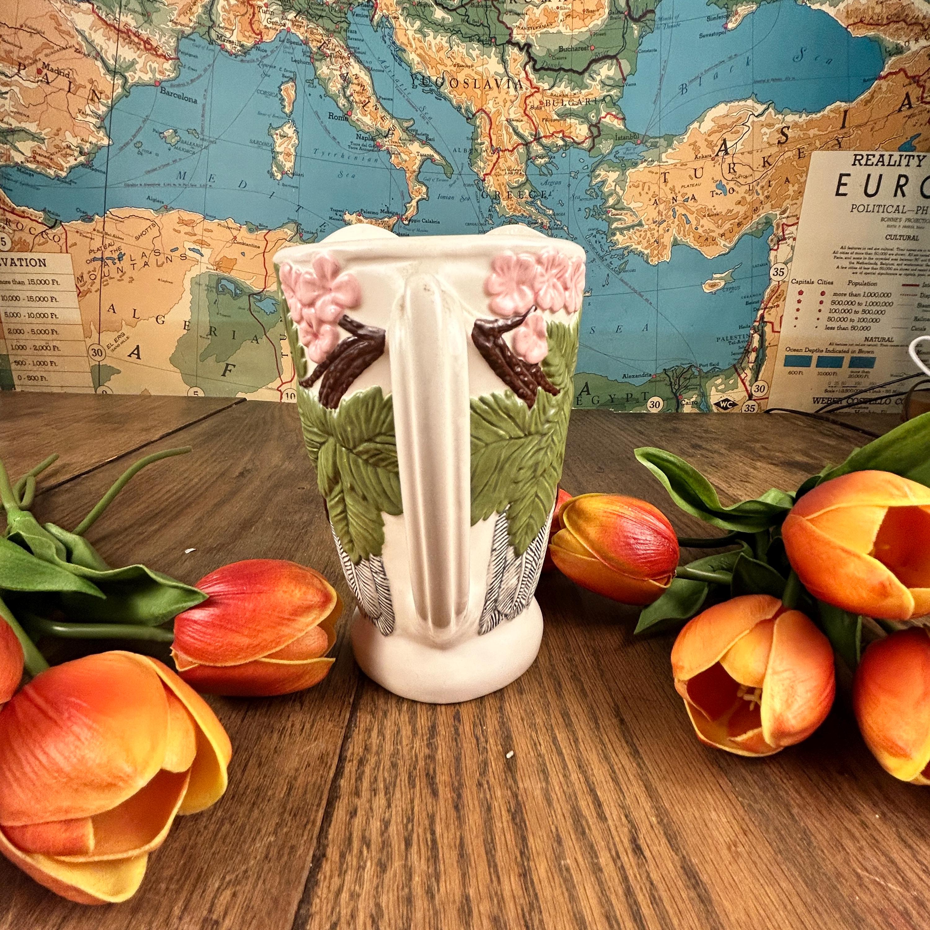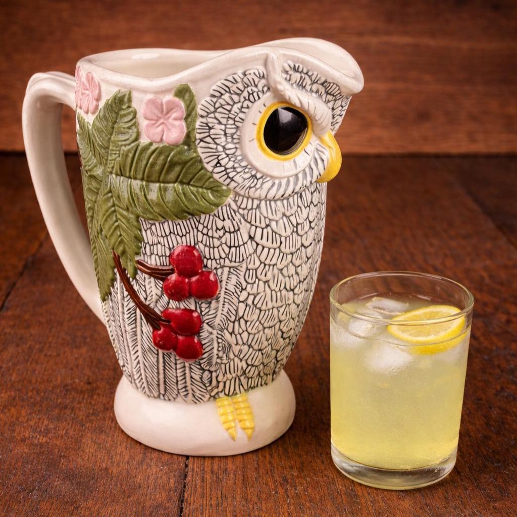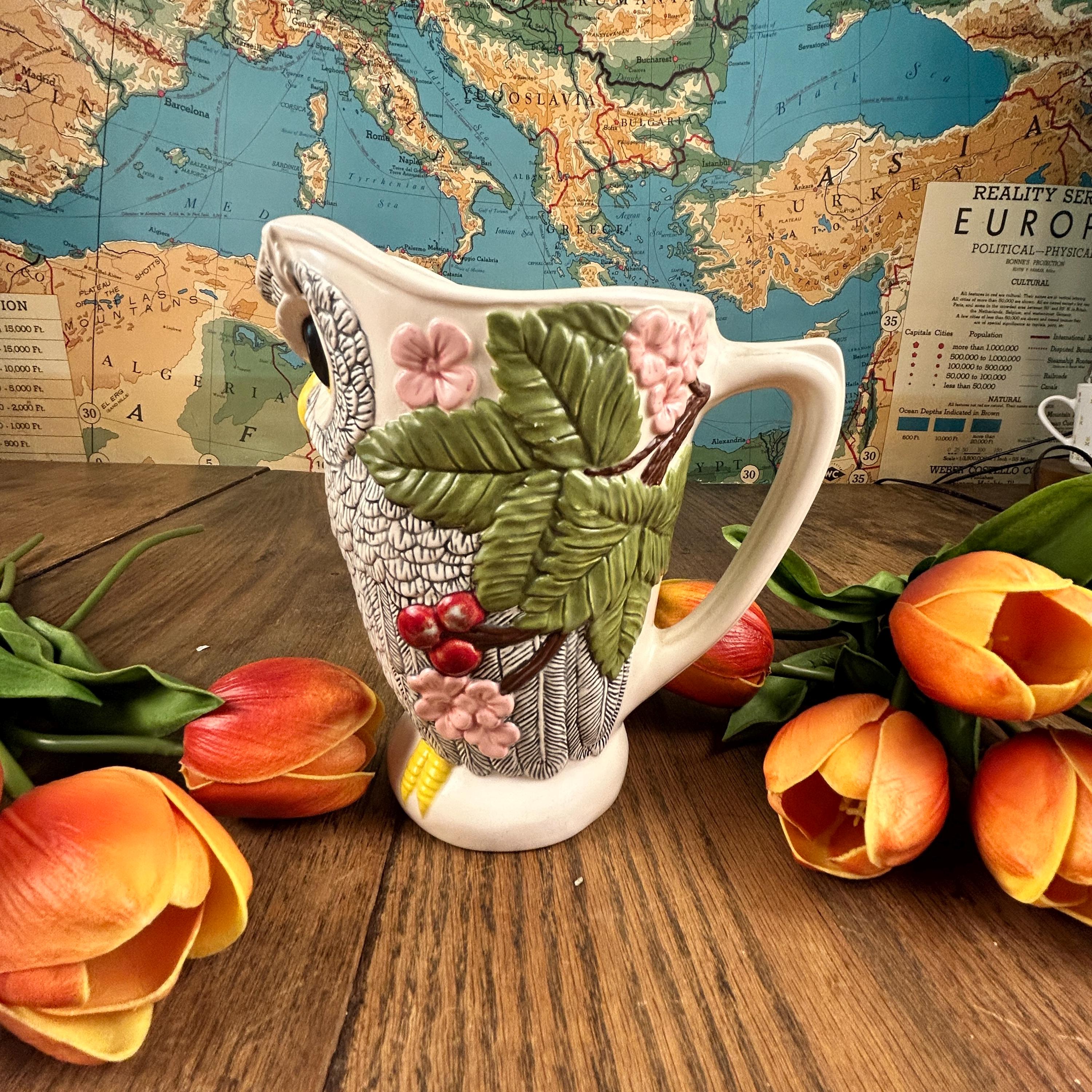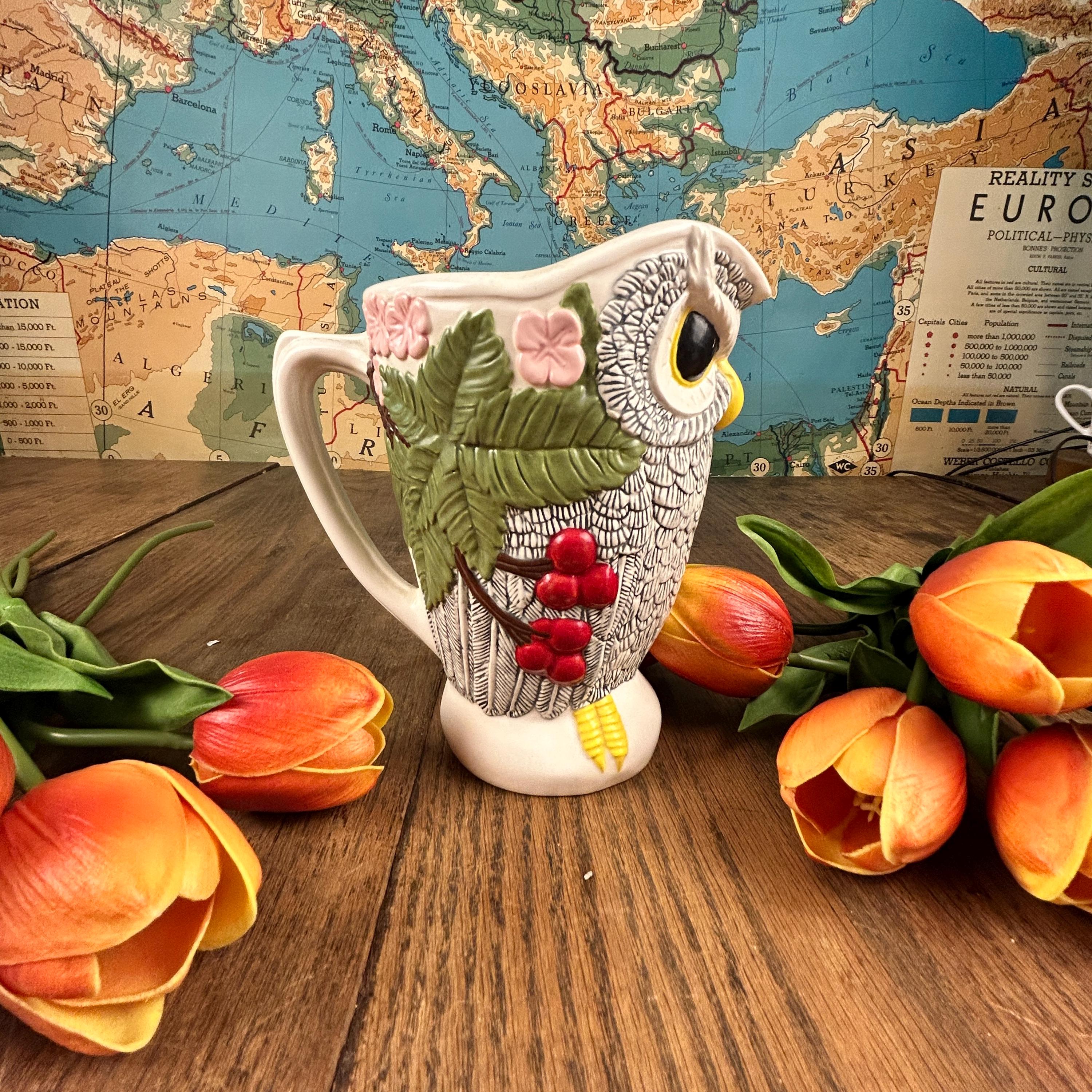 This beautiful Owl Pitcher is wonderfully crafted. No chips or cracks or defects to be seen. Signed LR on the bottom. Beautifully painted and finished in a semi-gloss. The owl's feathers are intricate and the owl is surrounded by flowers and leaves. A unique and beautiful shape to the pitcher. Very clean.