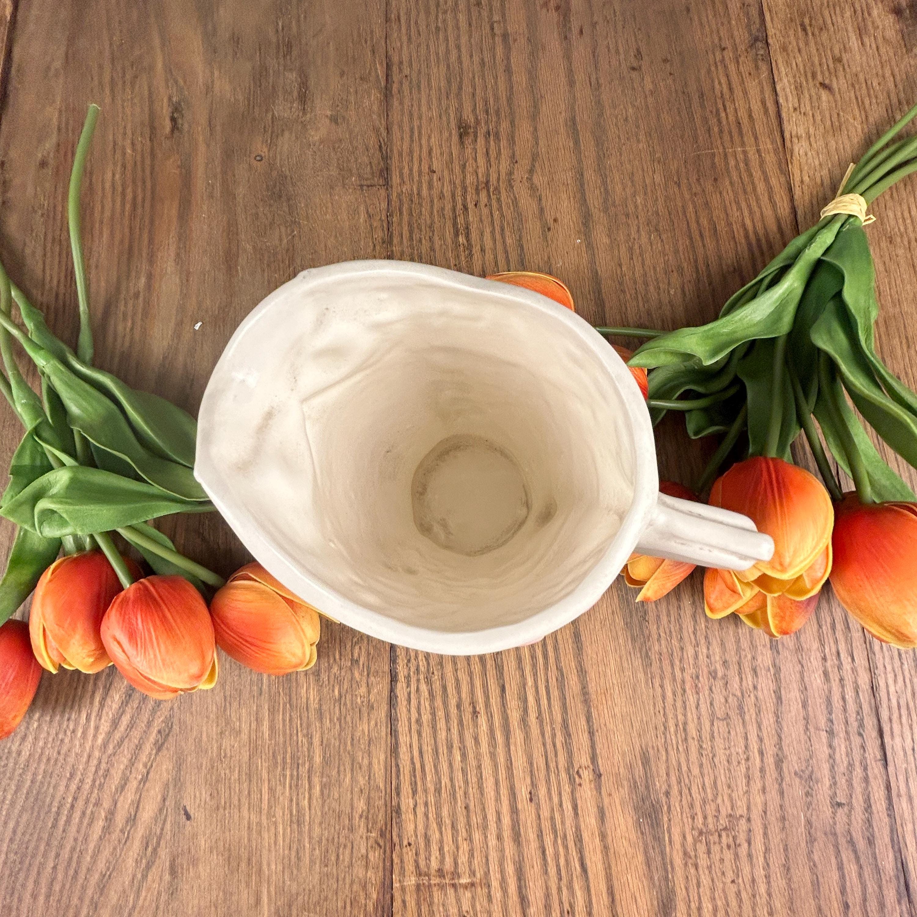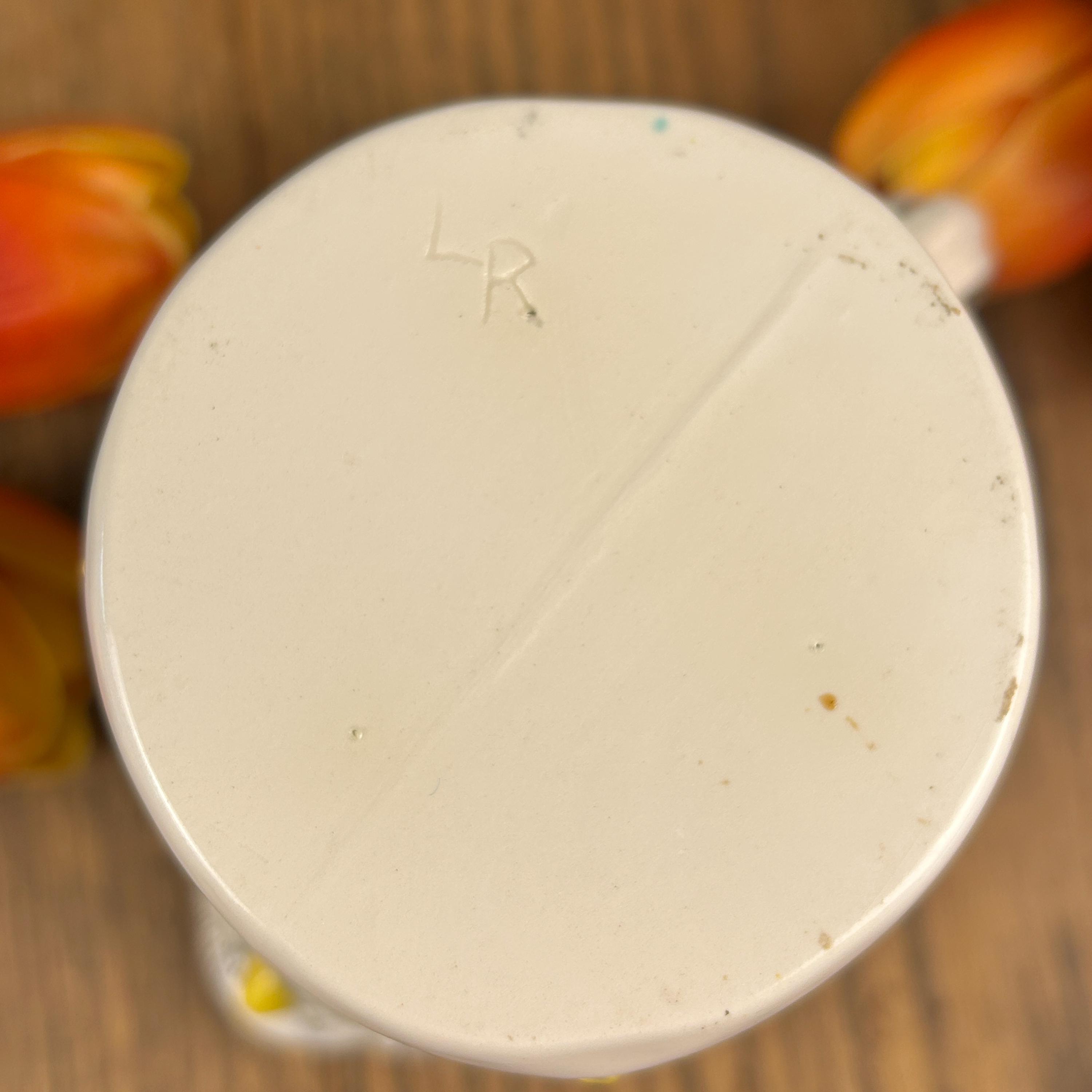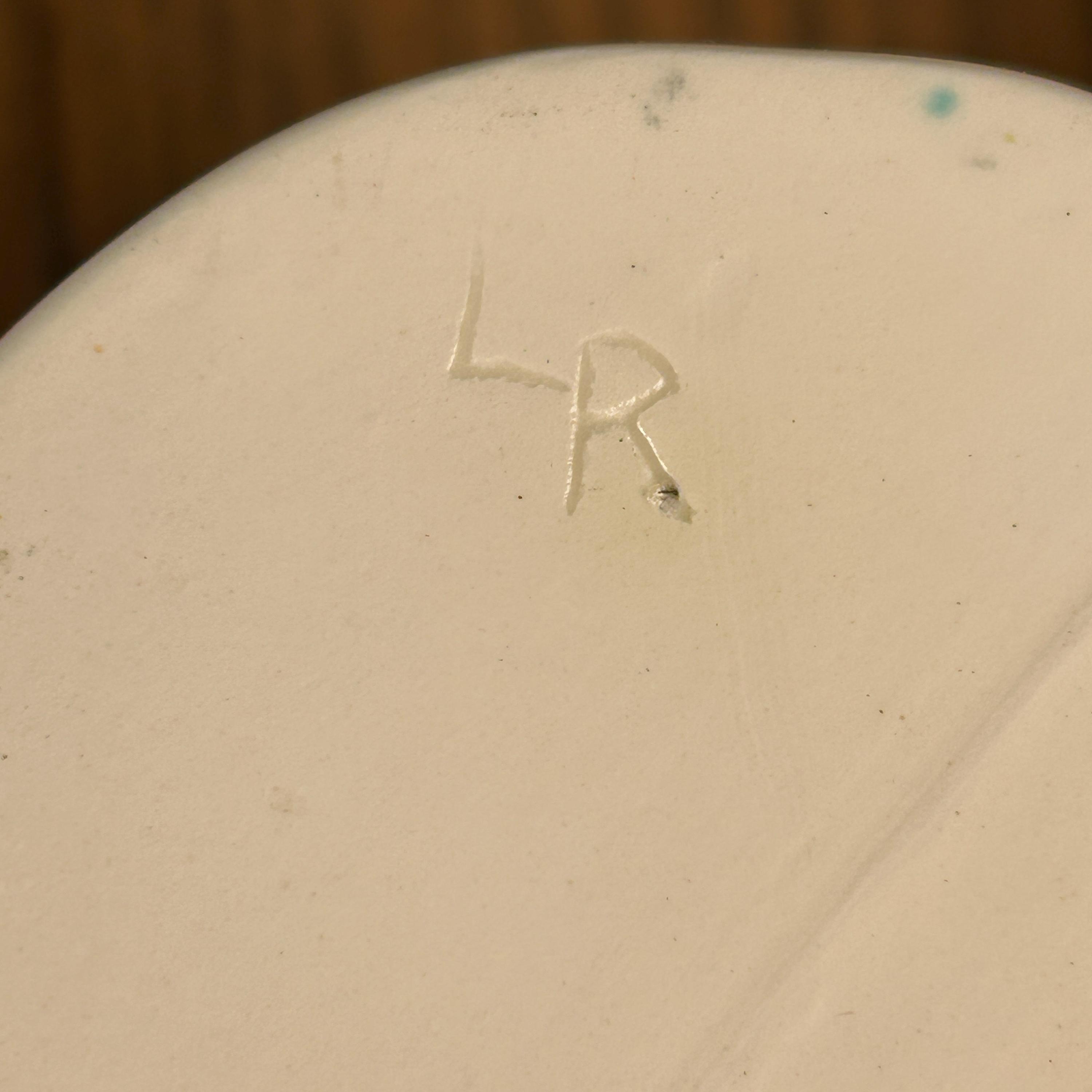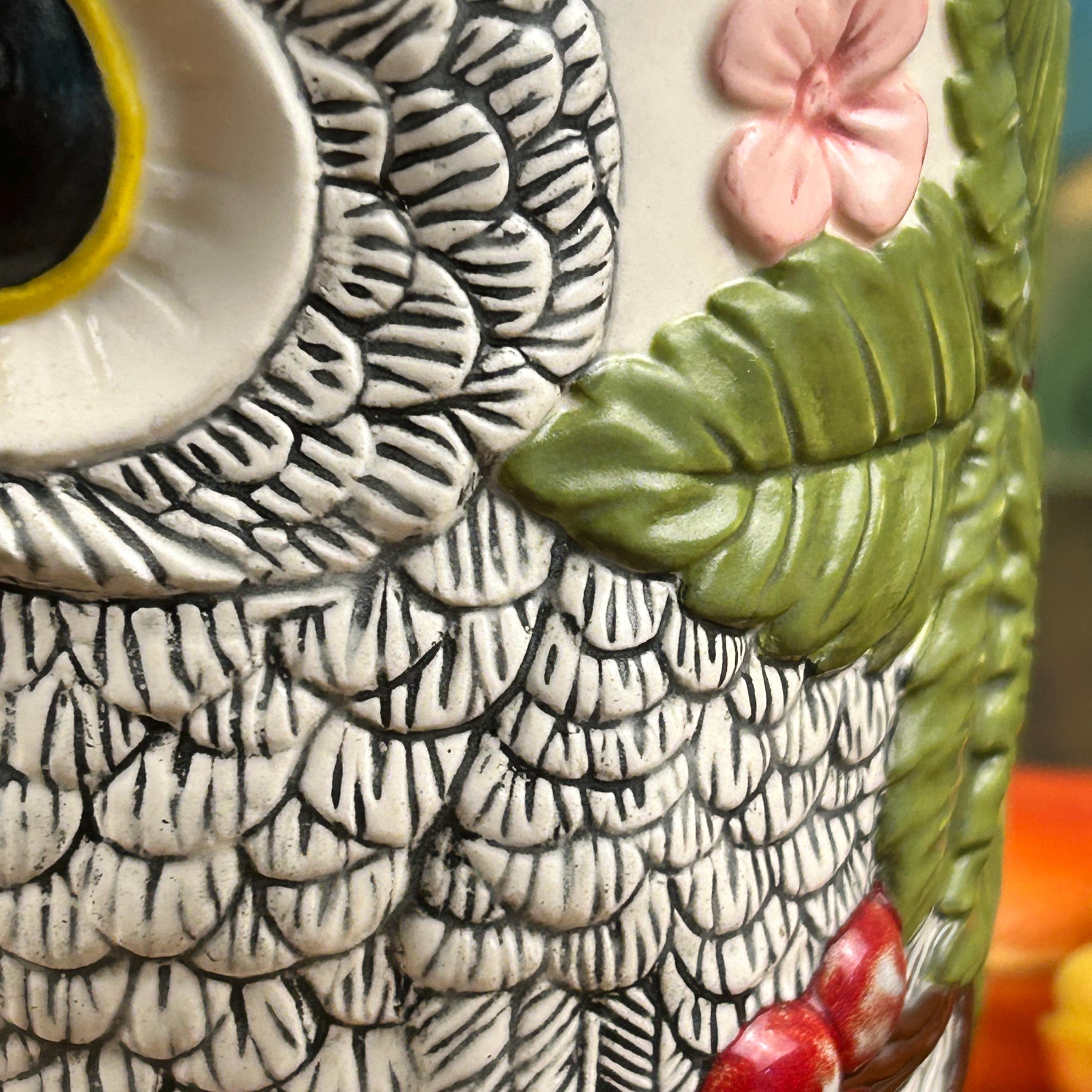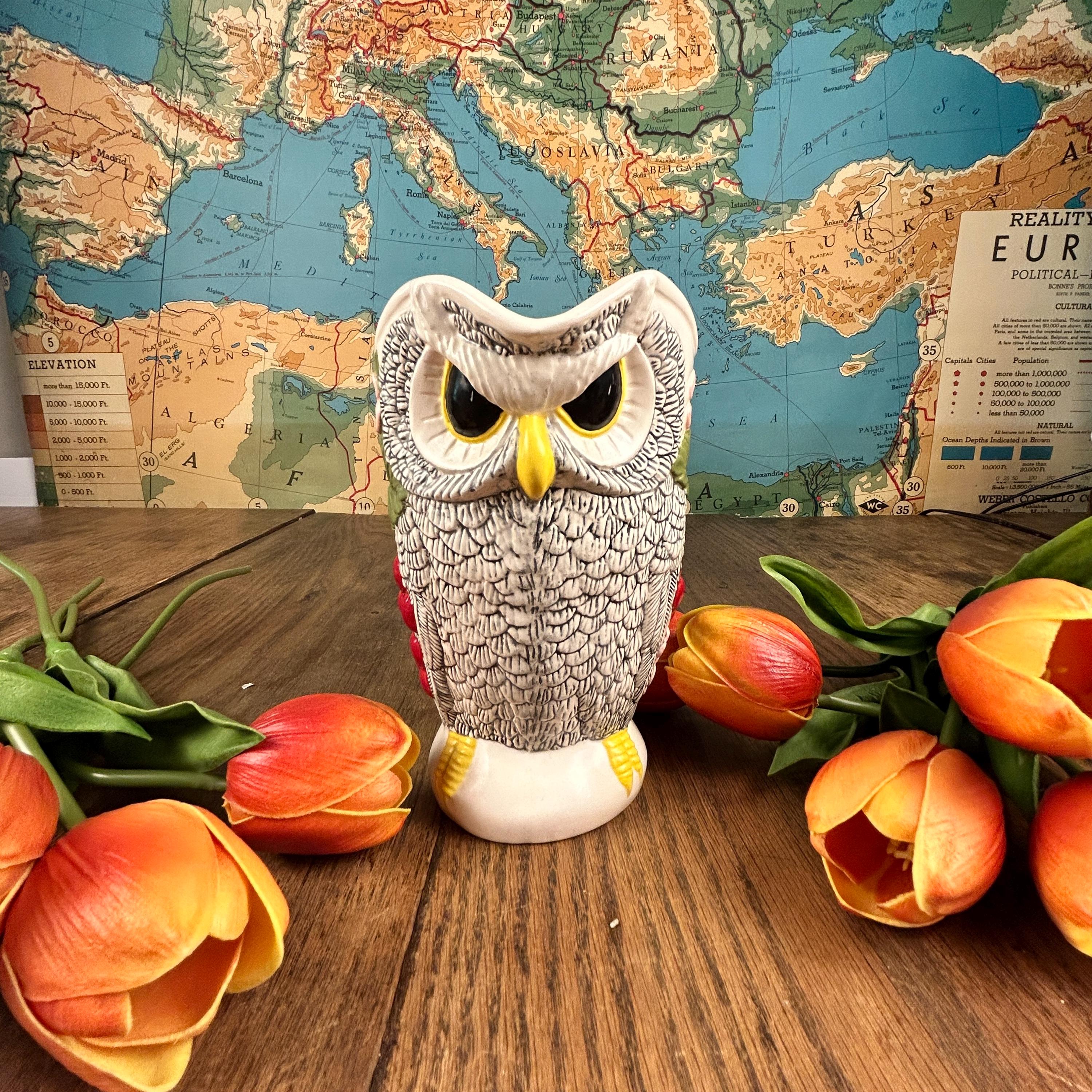This beautiful Owl Pitcher is wonderfully crafted. No chips or cracks or defects to be seen. Signed LR on the bottom. Beautifully painted and finished in a semi-gloss. The owl's feathers are intricate and the owl is surrounded by flowers and leaves. A unique and beautiful shape to the pitcher. Very clean.