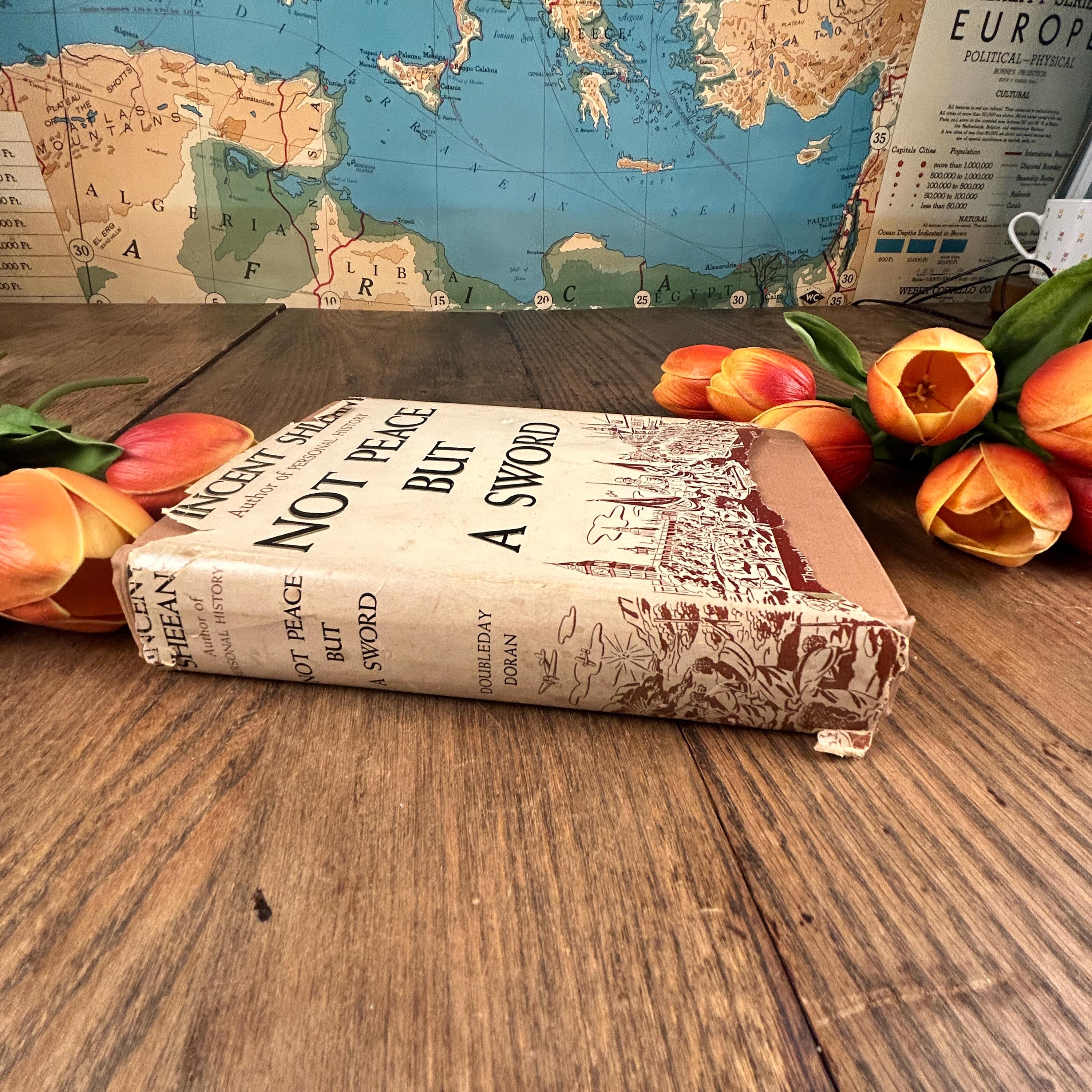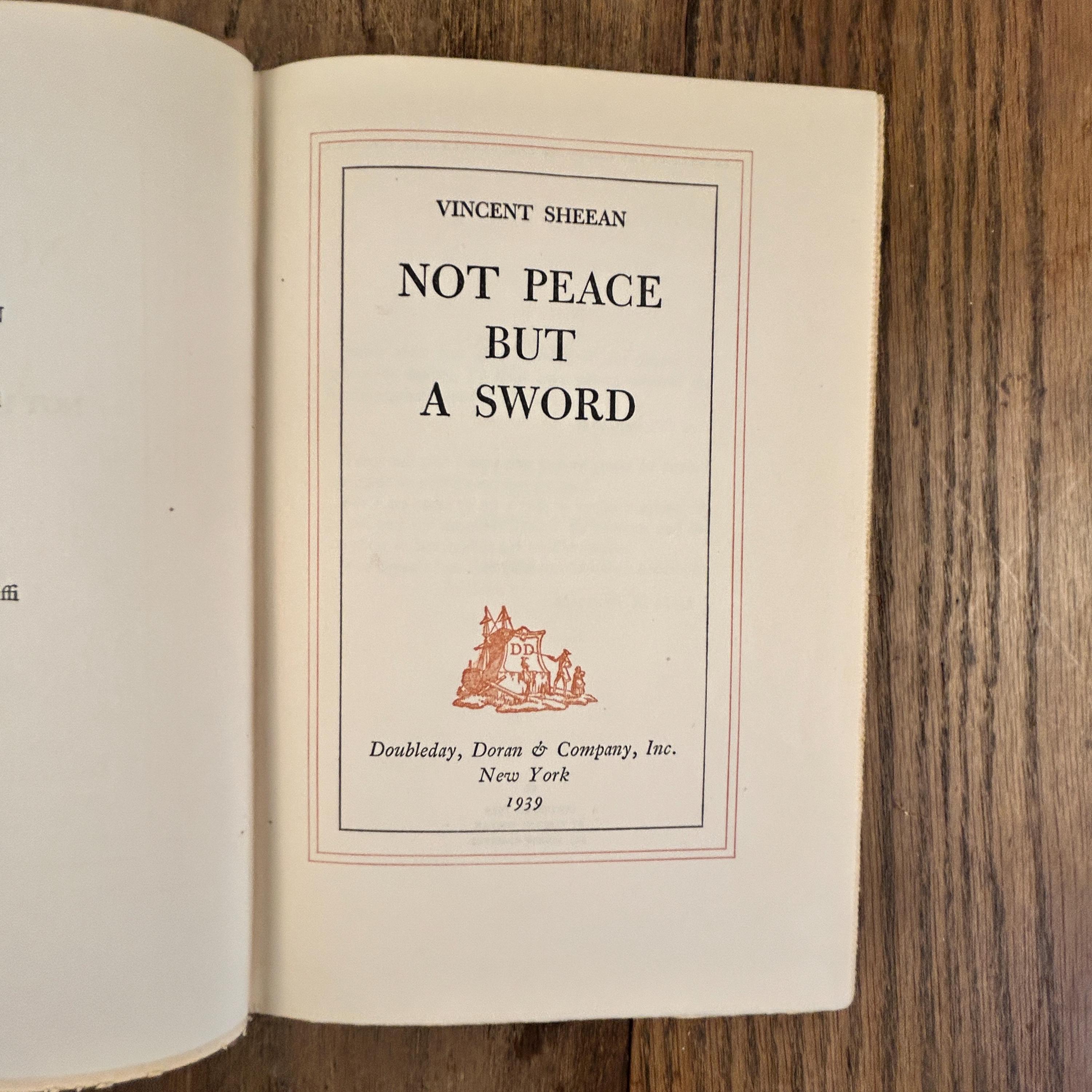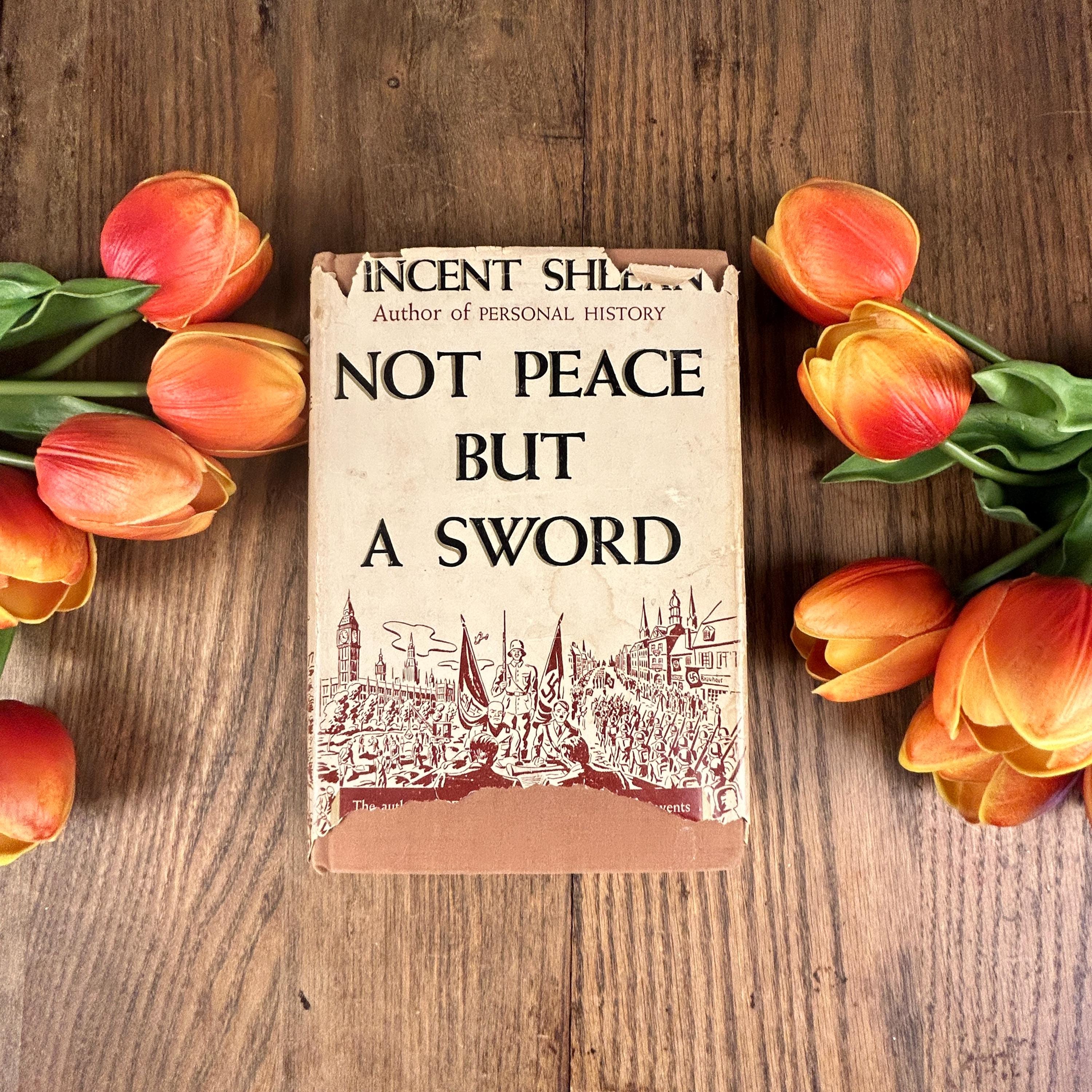 The book's title, prominently displayed on the cover, references a quote from the Bible (Matthew 10:34), where Jesus says, "Think not that I am come to send peace on earth: I came not to send peace, but a sword". The cover also features an illustration of a crowd of people holding flags and banners, with buildings in the background. Vincent Sheean was an American journalist and writer known for his coverage of international conflicts and political events.