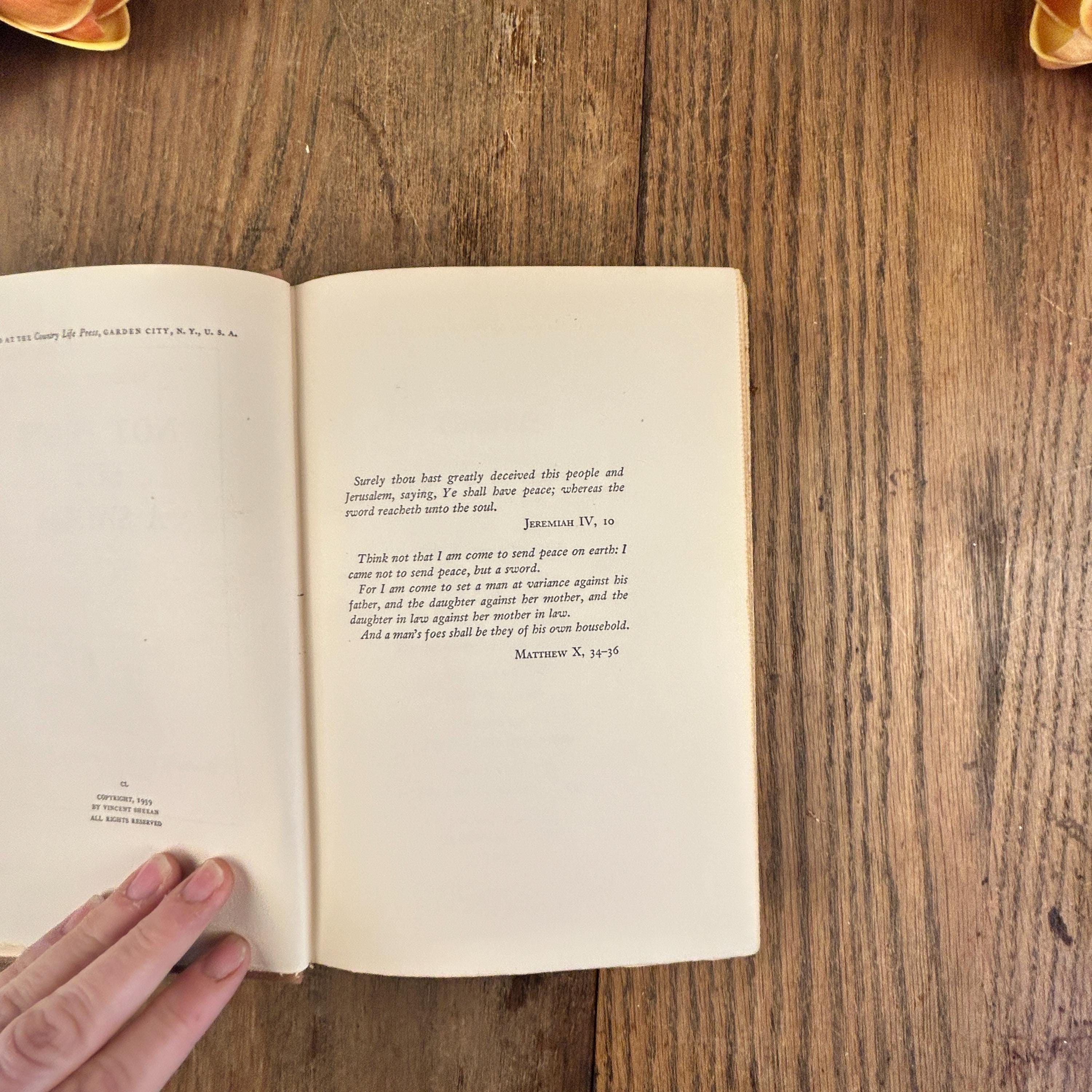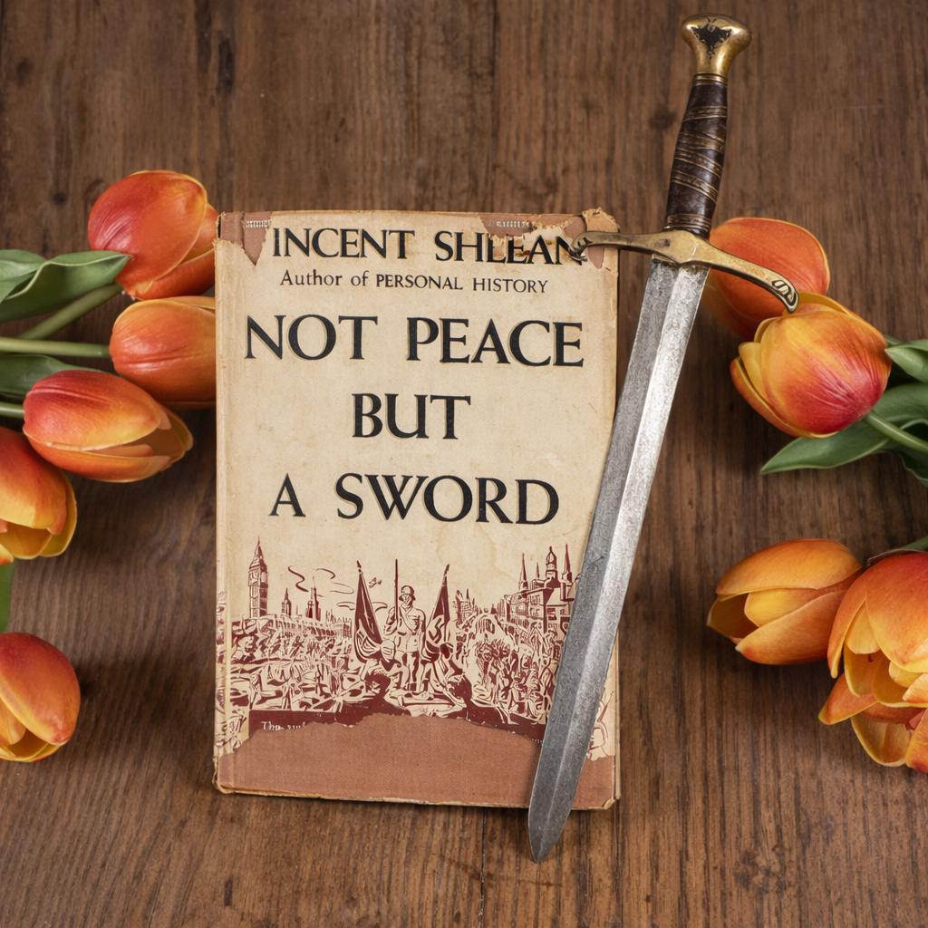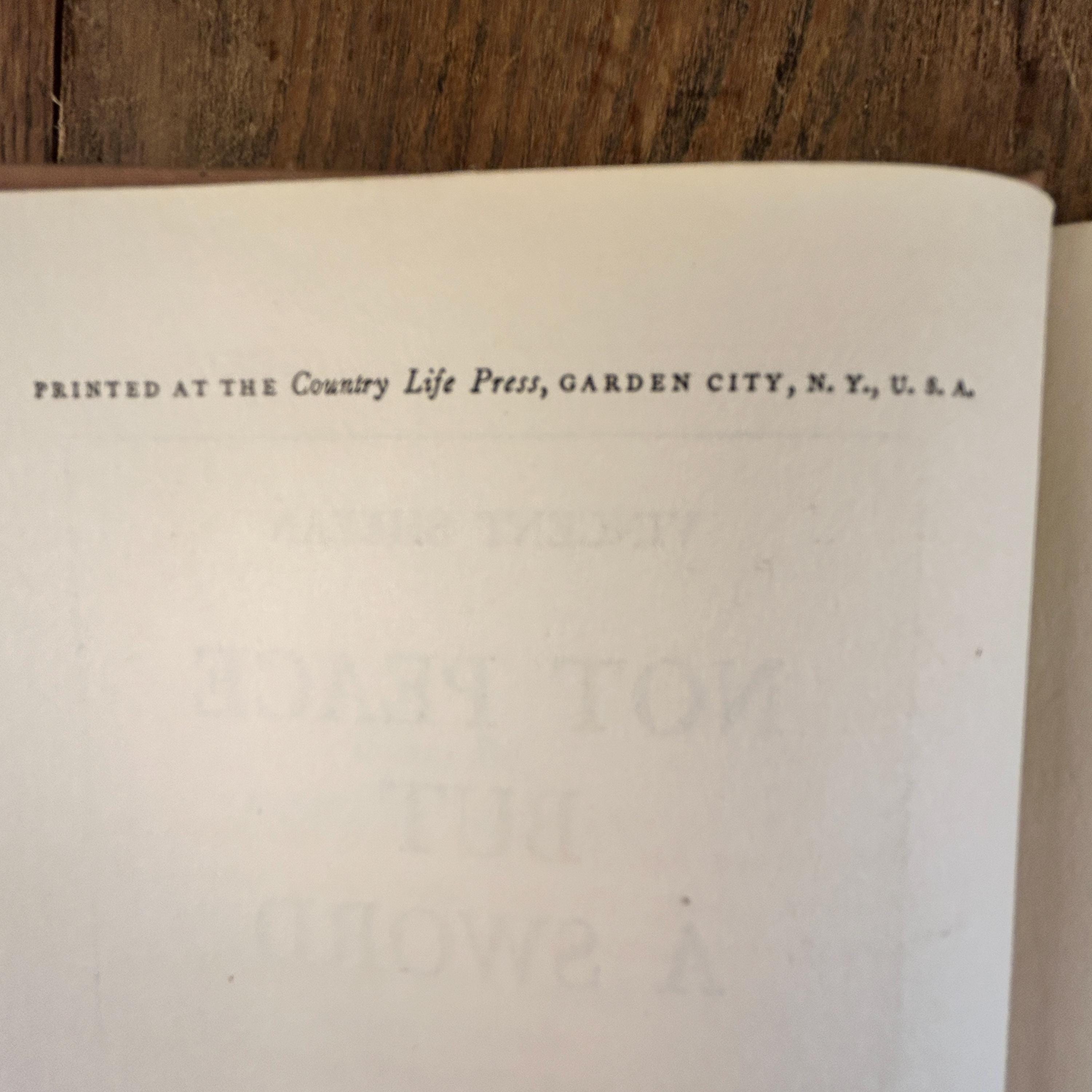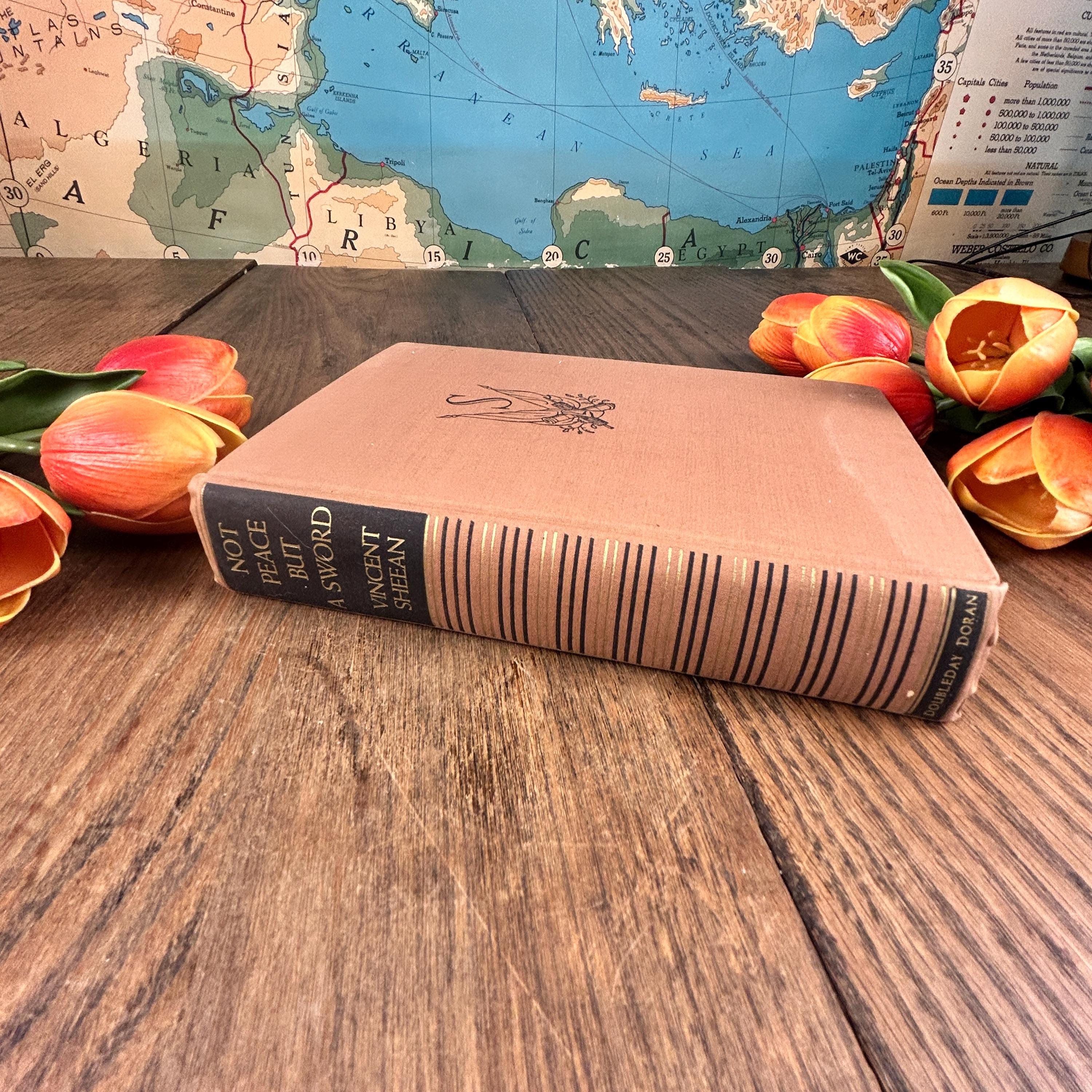 The book's title, prominently displayed on the cover, references a quote from the Bible (Matthew 10:34), where Jesus says, "Think not that I am come to send peace on earth: I came not to send peace, but a sword". The cover also features an illustration of a crowd of people holding flags and banners, with buildings in the background. Vincent Sheean was an American journalist and writer known for his coverage of international conflicts and political events.