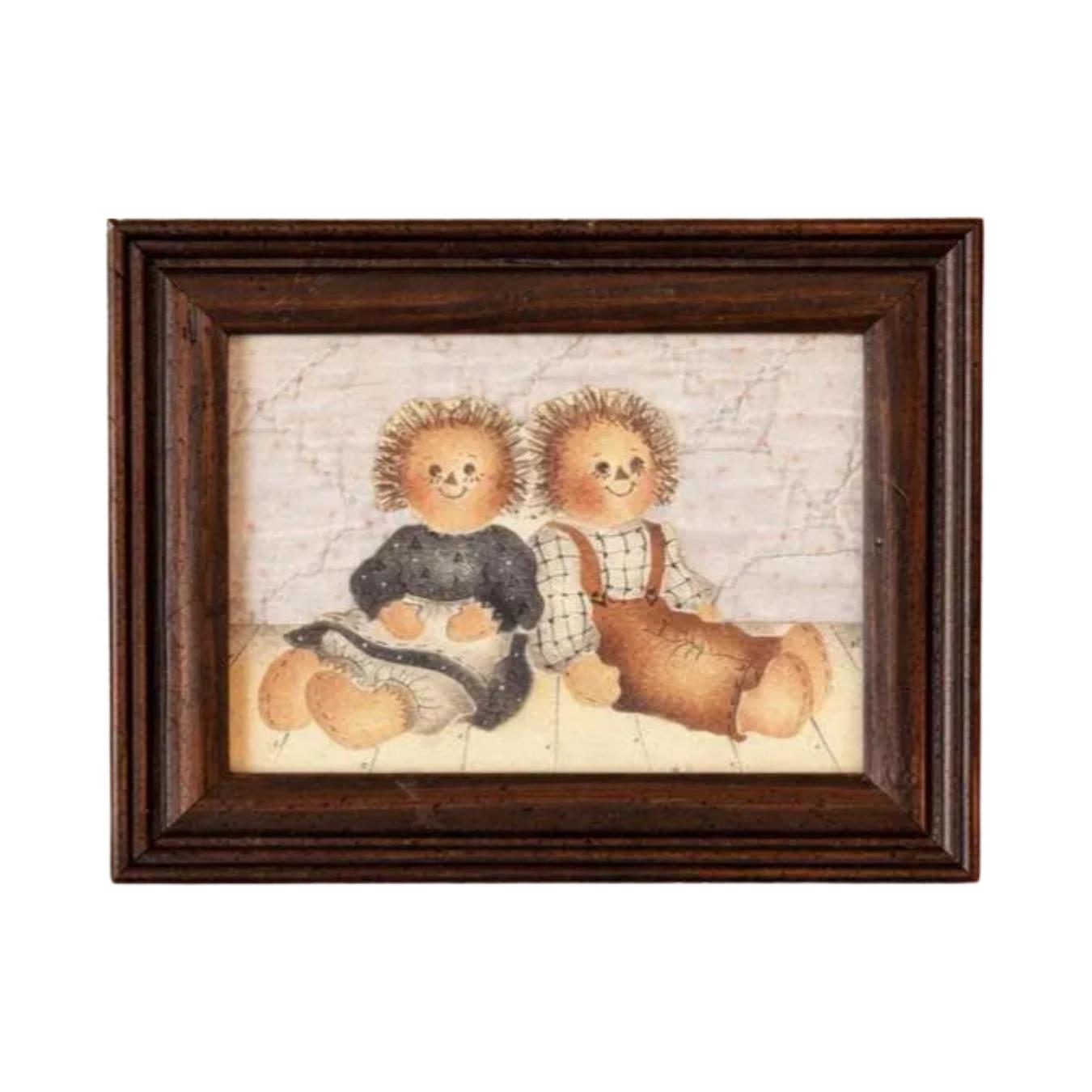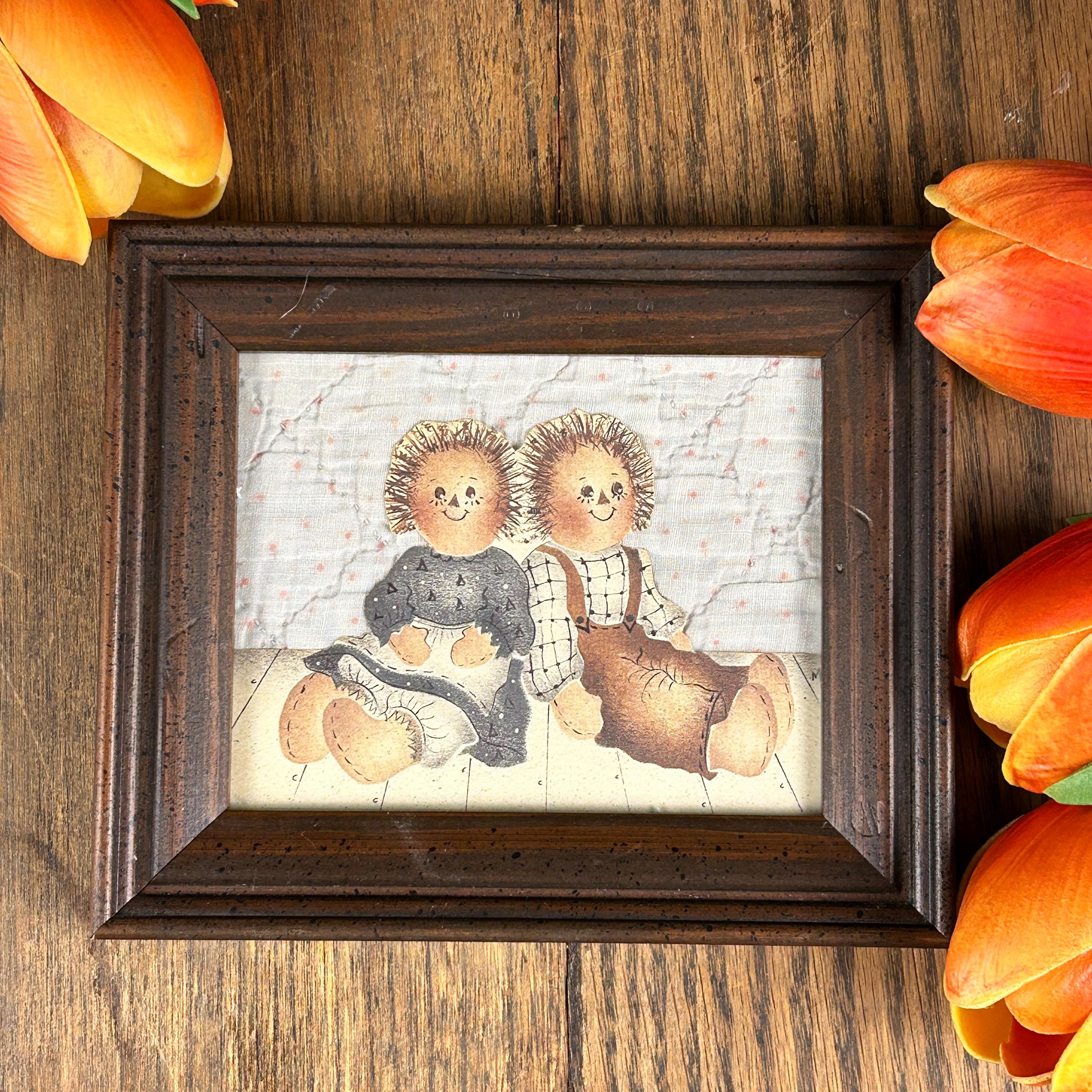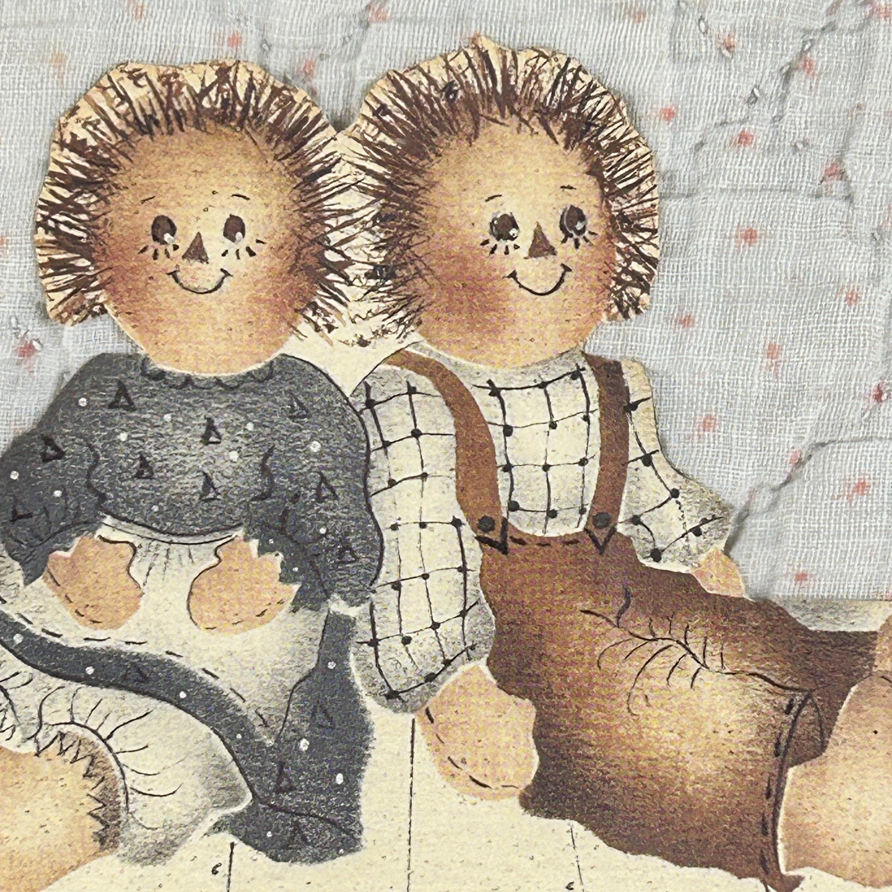 The framed vintage folk art collage depicts two rag dolls, reminiscent of the Raggedy Ann and Andy characters created by Johnny Gruelle. They are carefully cut and mounted on top of an old piece of quilt. This is a one-of-a-kind creation professionally framed in a 6 1/2" x 5 1/2" wood frame. Backing paper is attached as well as a hanger.