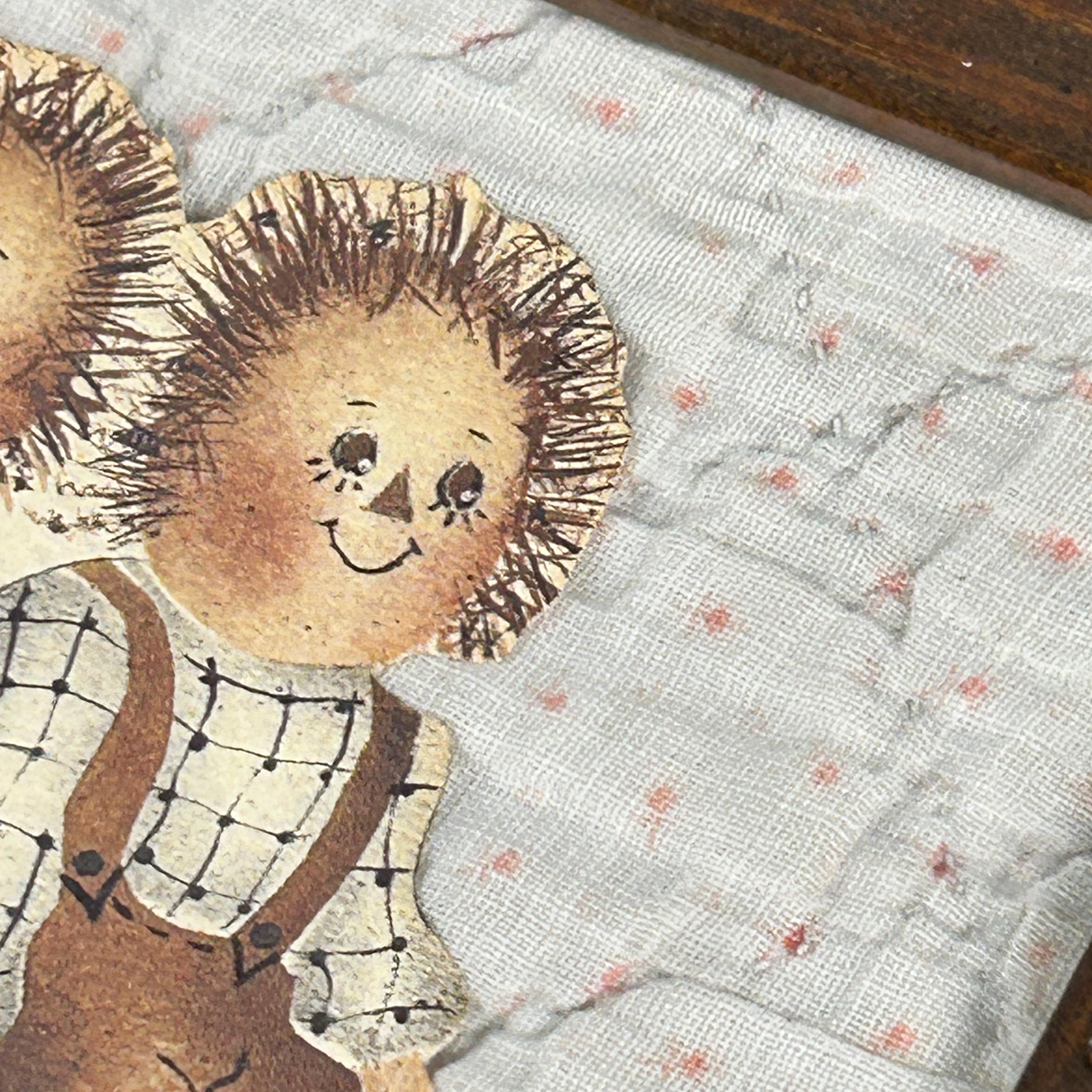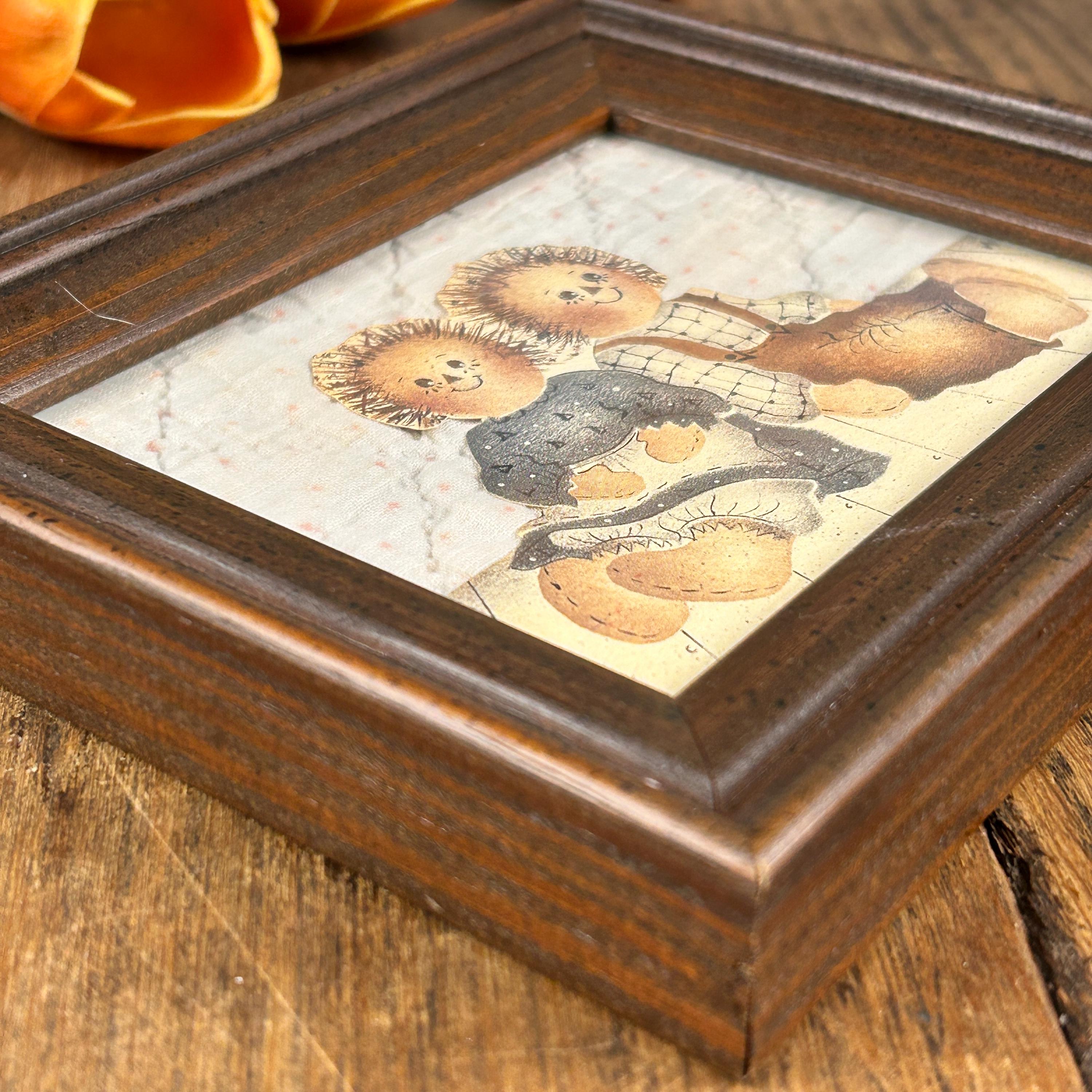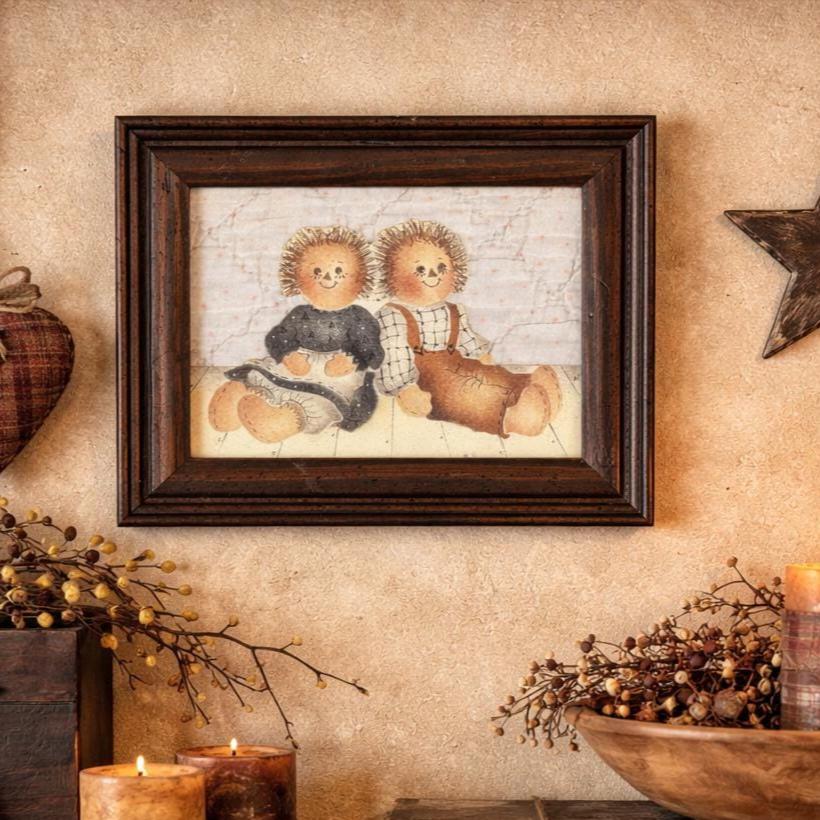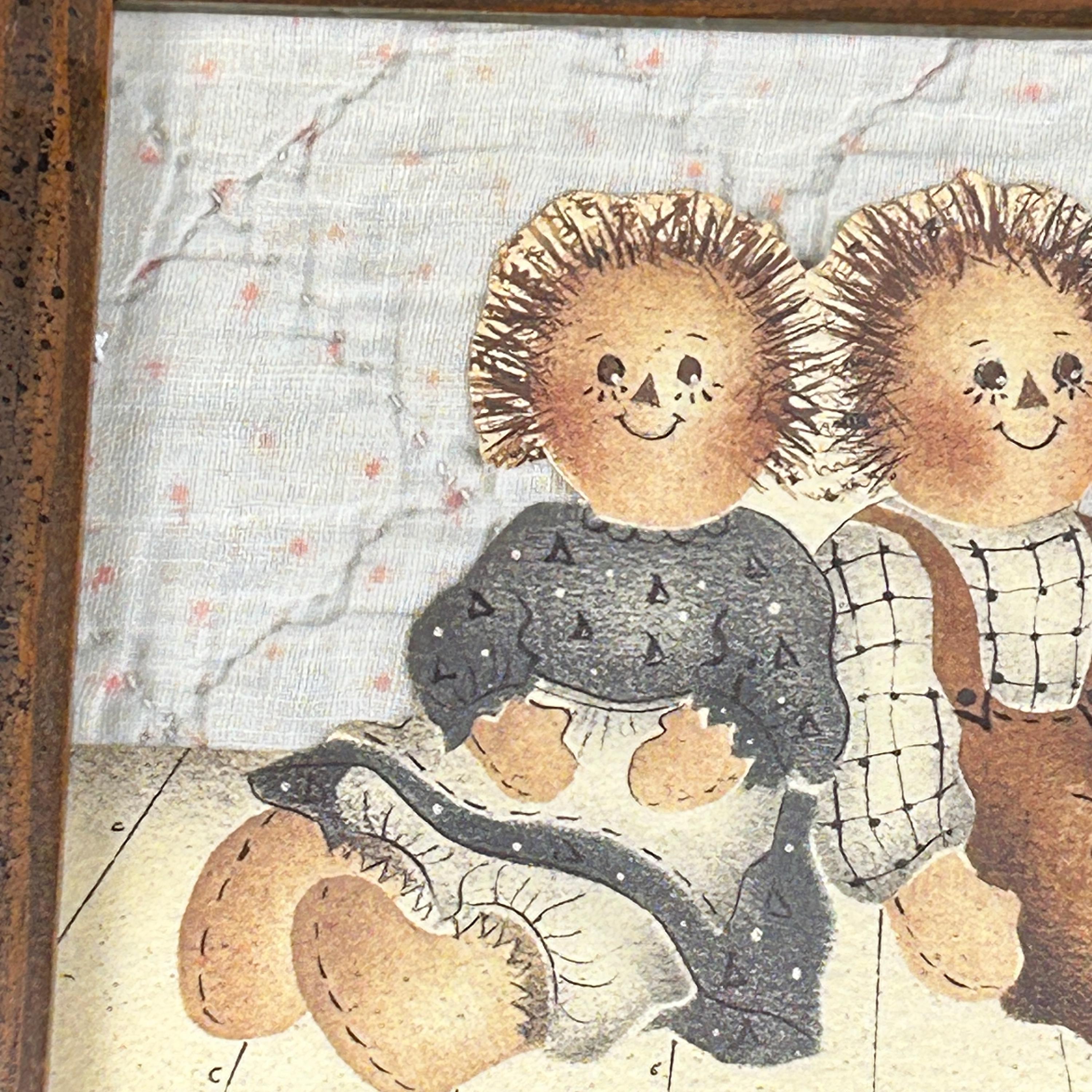 The framed vintage folk art collage depicts two rag dolls, reminiscent of the Raggedy Ann and Andy characters created by Johnny Gruelle. They are carefully cut and mounted on top of an old piece of quilt. This is a one-of-a-kind creation professionally framed in a 6 1/2" x 5 1/2" wood frame. Backing paper is attached as well as a hanger.