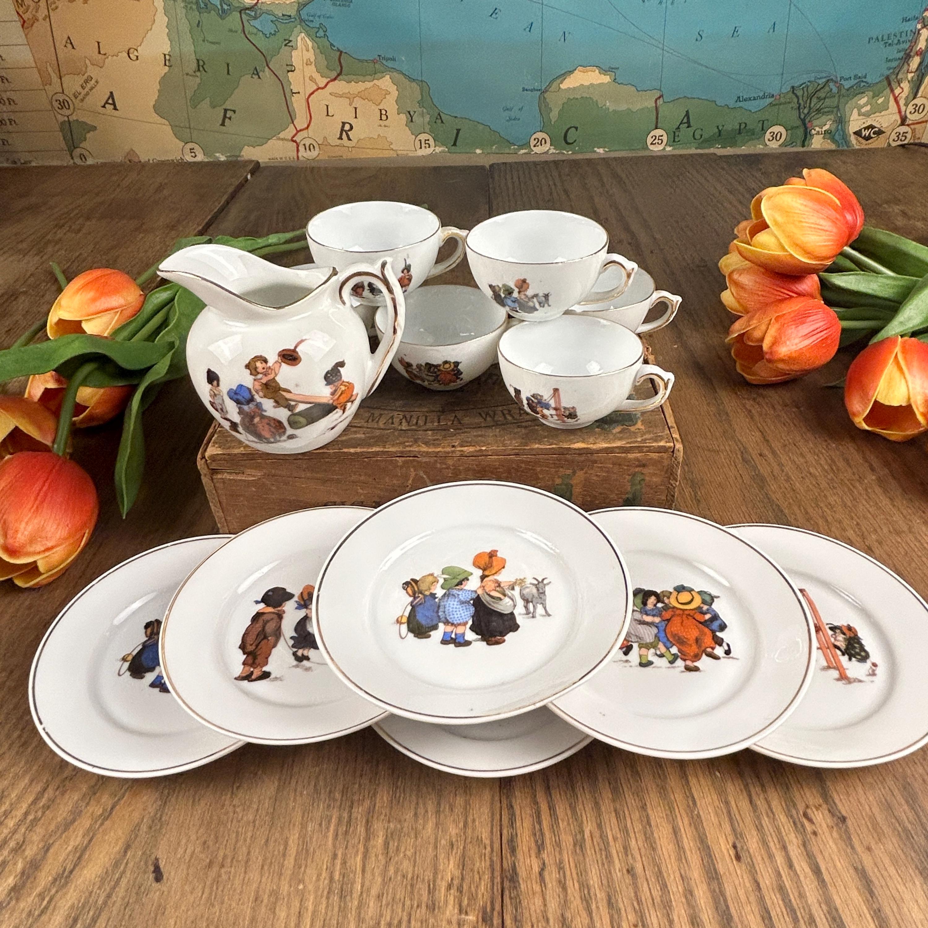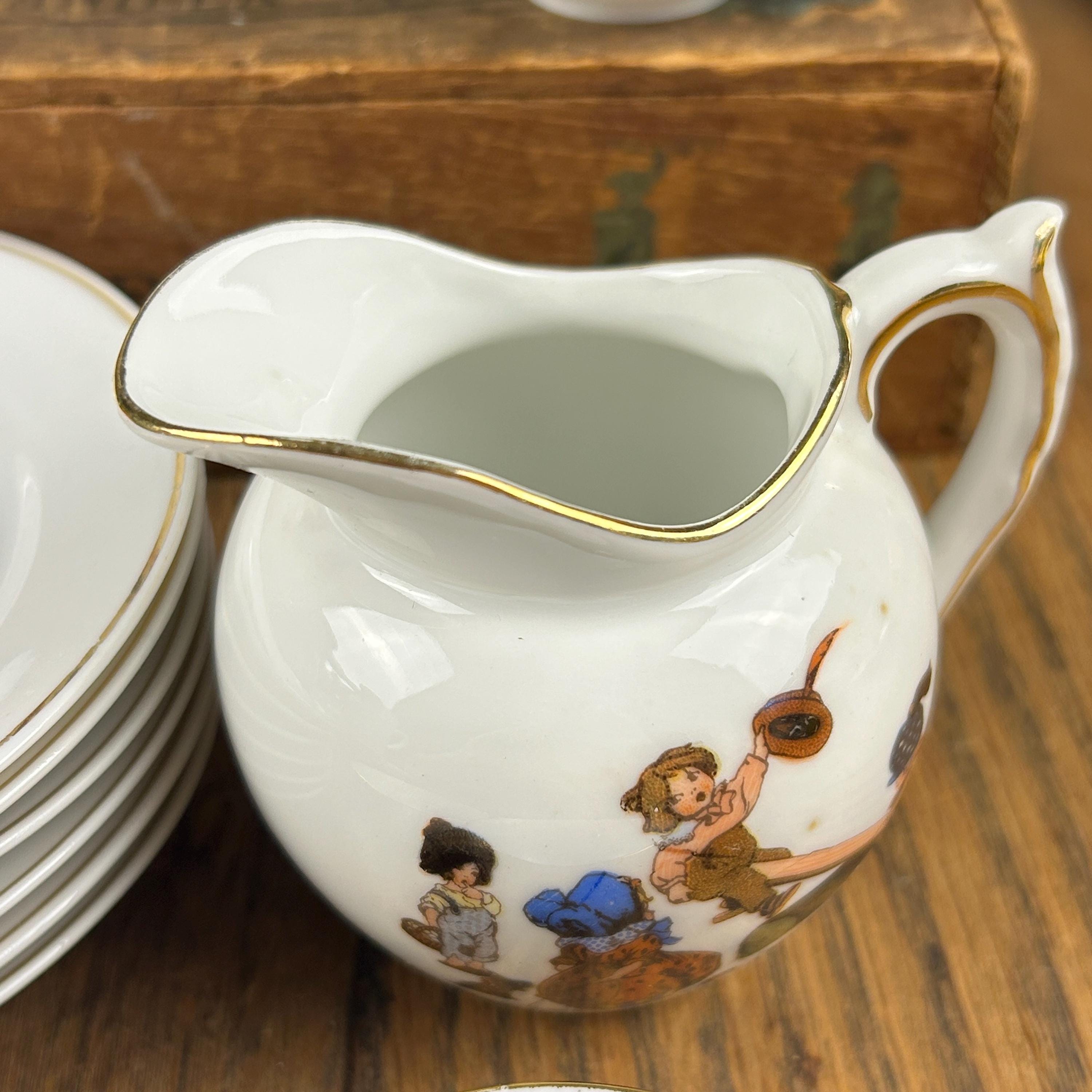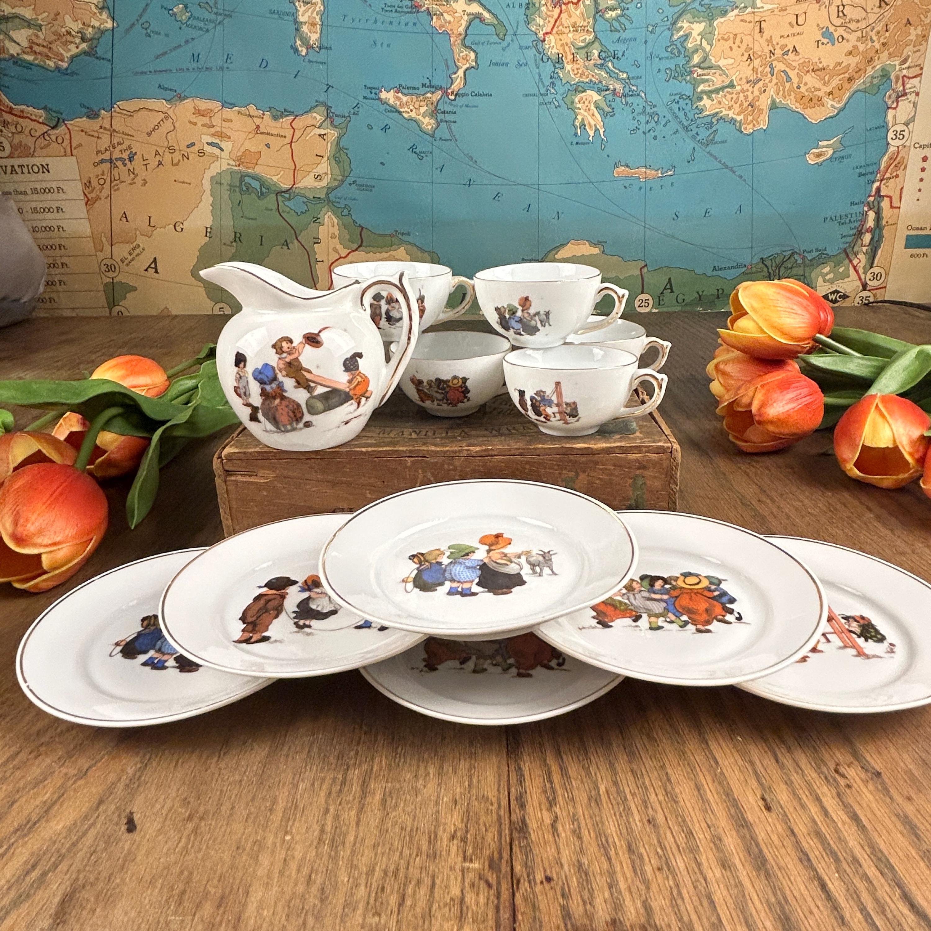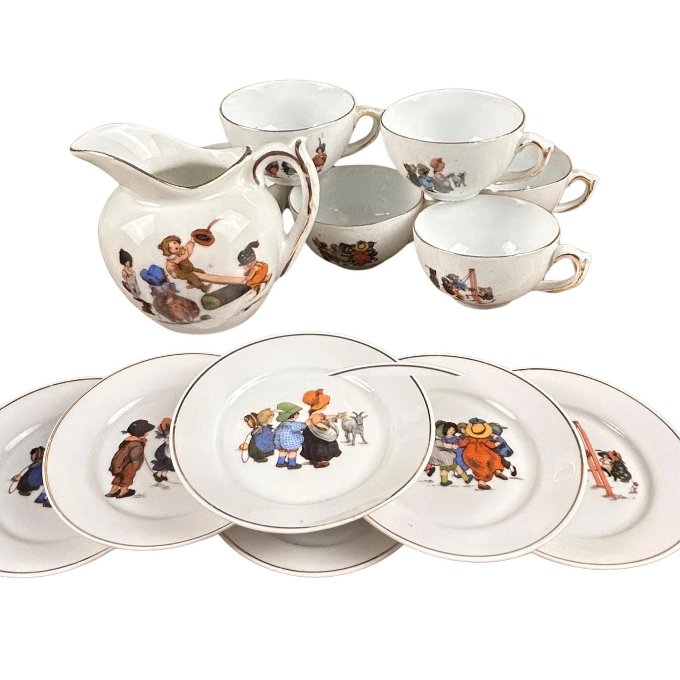This charming antique tea set has 13 pieces and is in beautiful condition. I can find no chips or cracks. There are 6 cups, 6 plates, and one pitcher