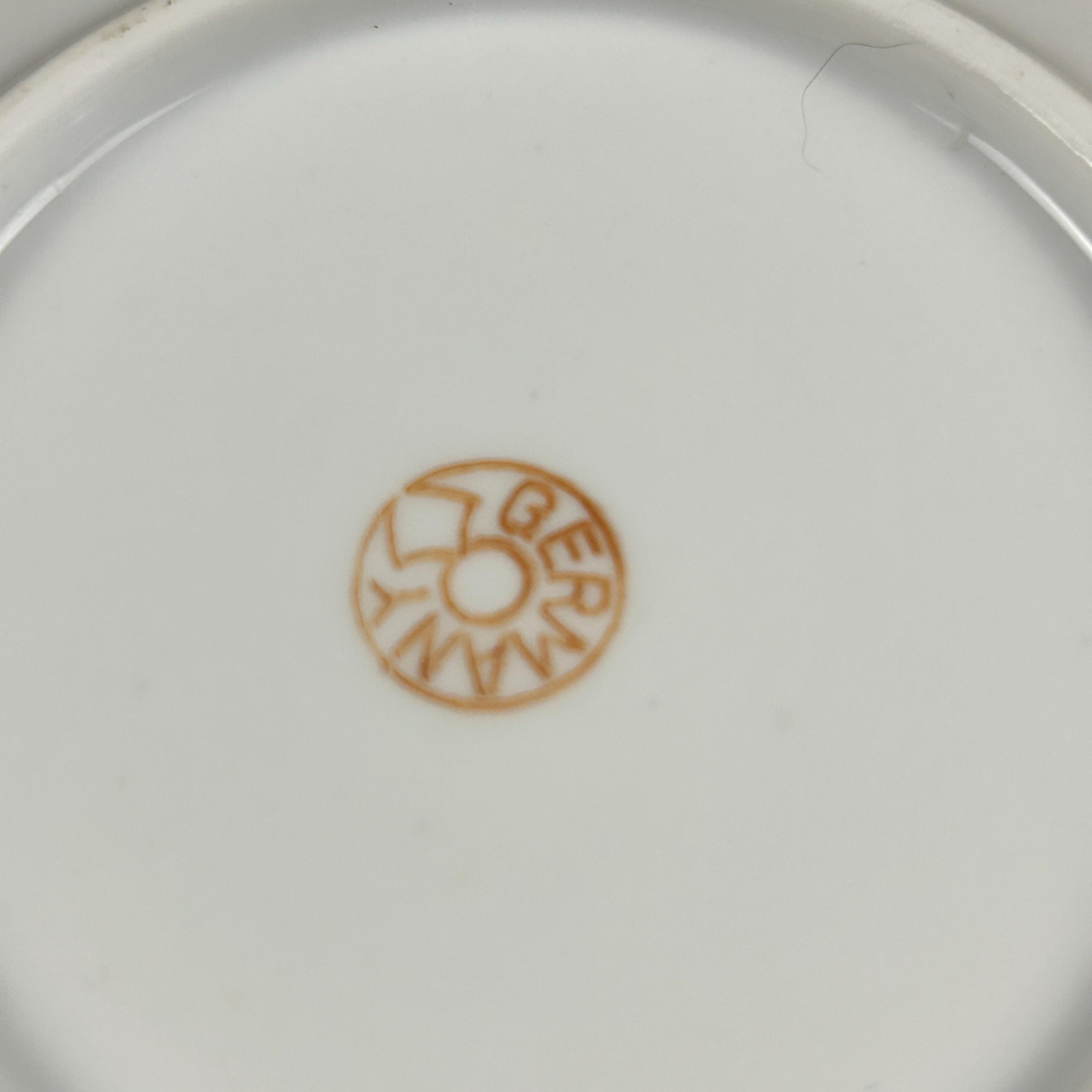 Six saucers which are also marked on the underside and have been accented with gold trim along the outside rim and the rim that would encircle the cup when it is seated on the saucer. Each saucer is 4.5" in diameter and are in great condition.