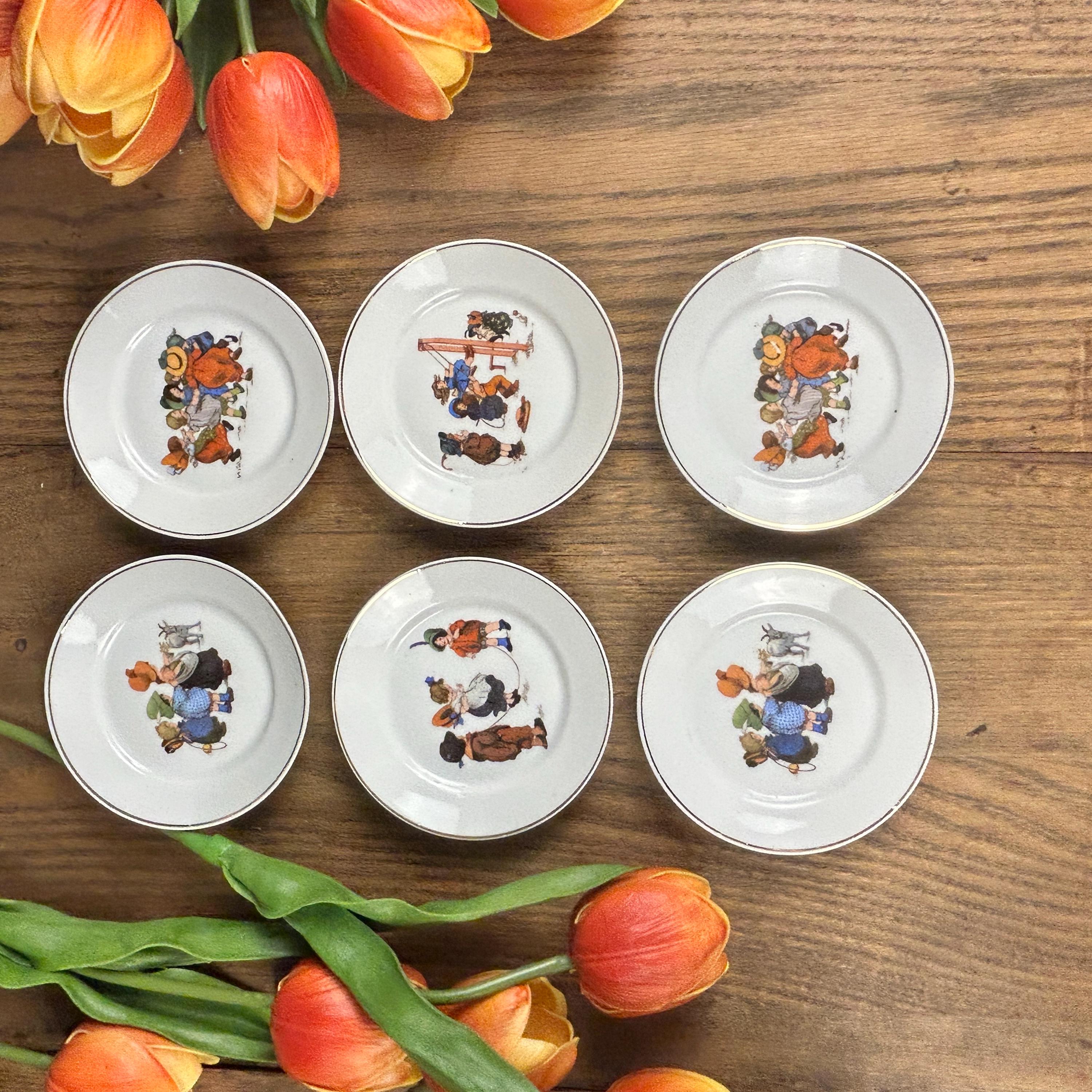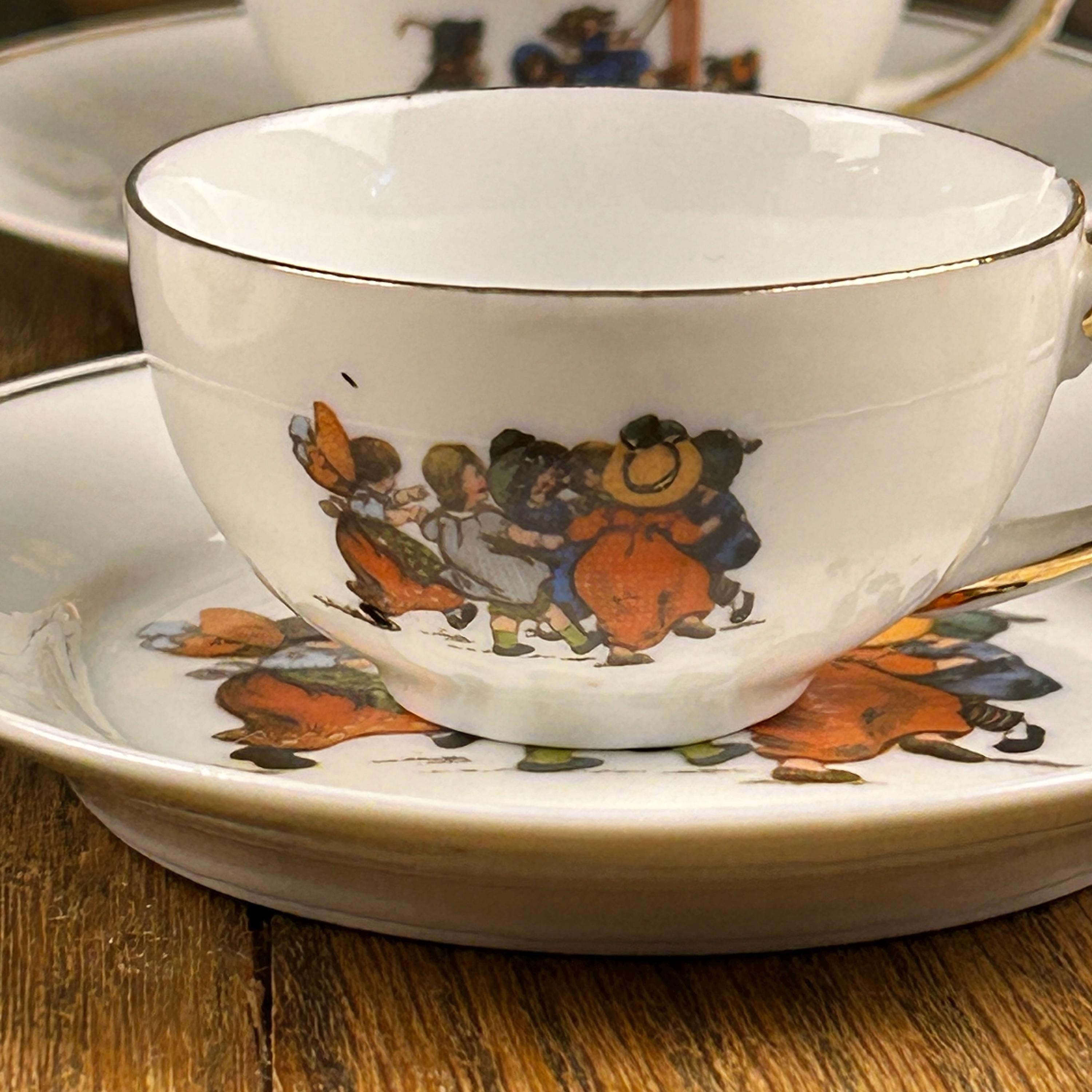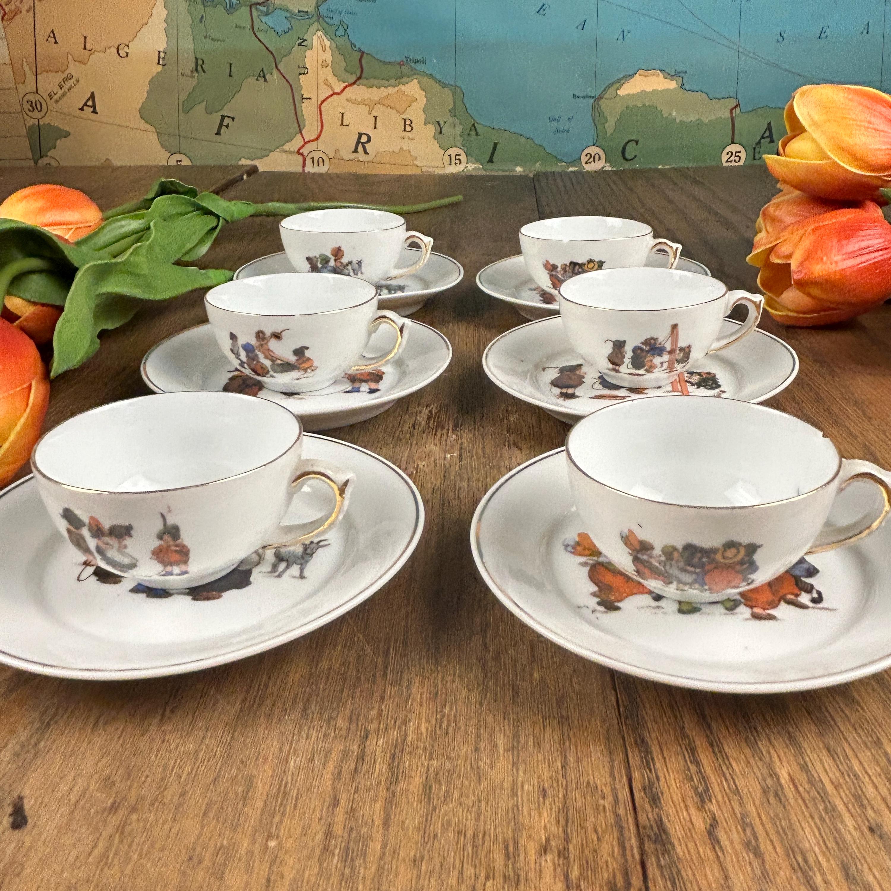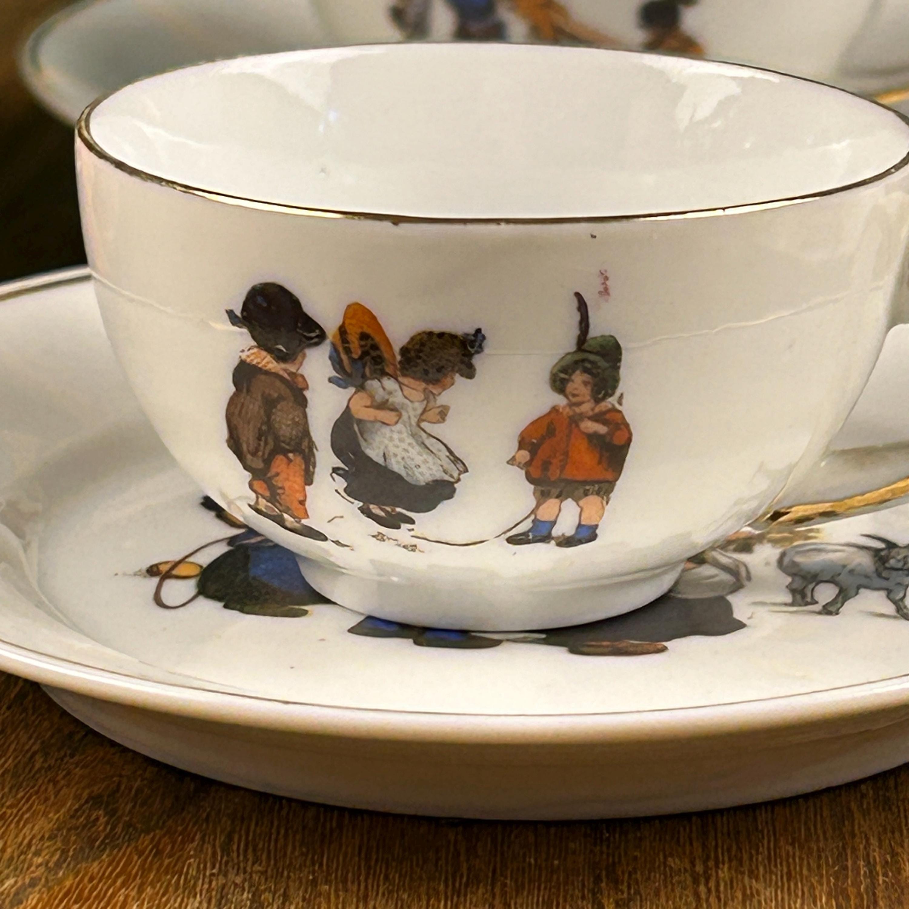 All part of a grown up world, with shopping, taking care of children and housekeeping. The cups are all marked Germany on the bottom. Gold colored gilding along the rim and accenting the handle. Each measures 2" tall.