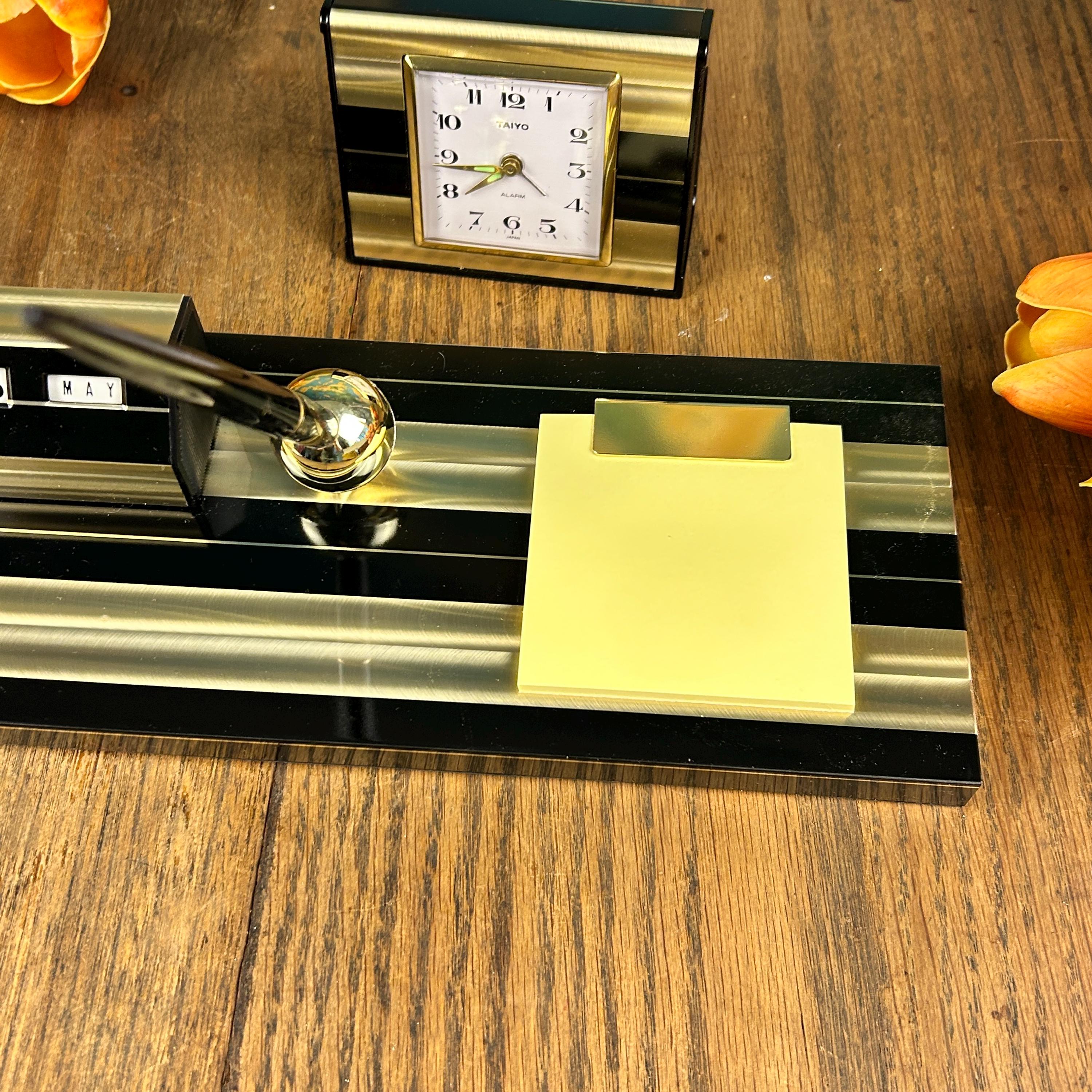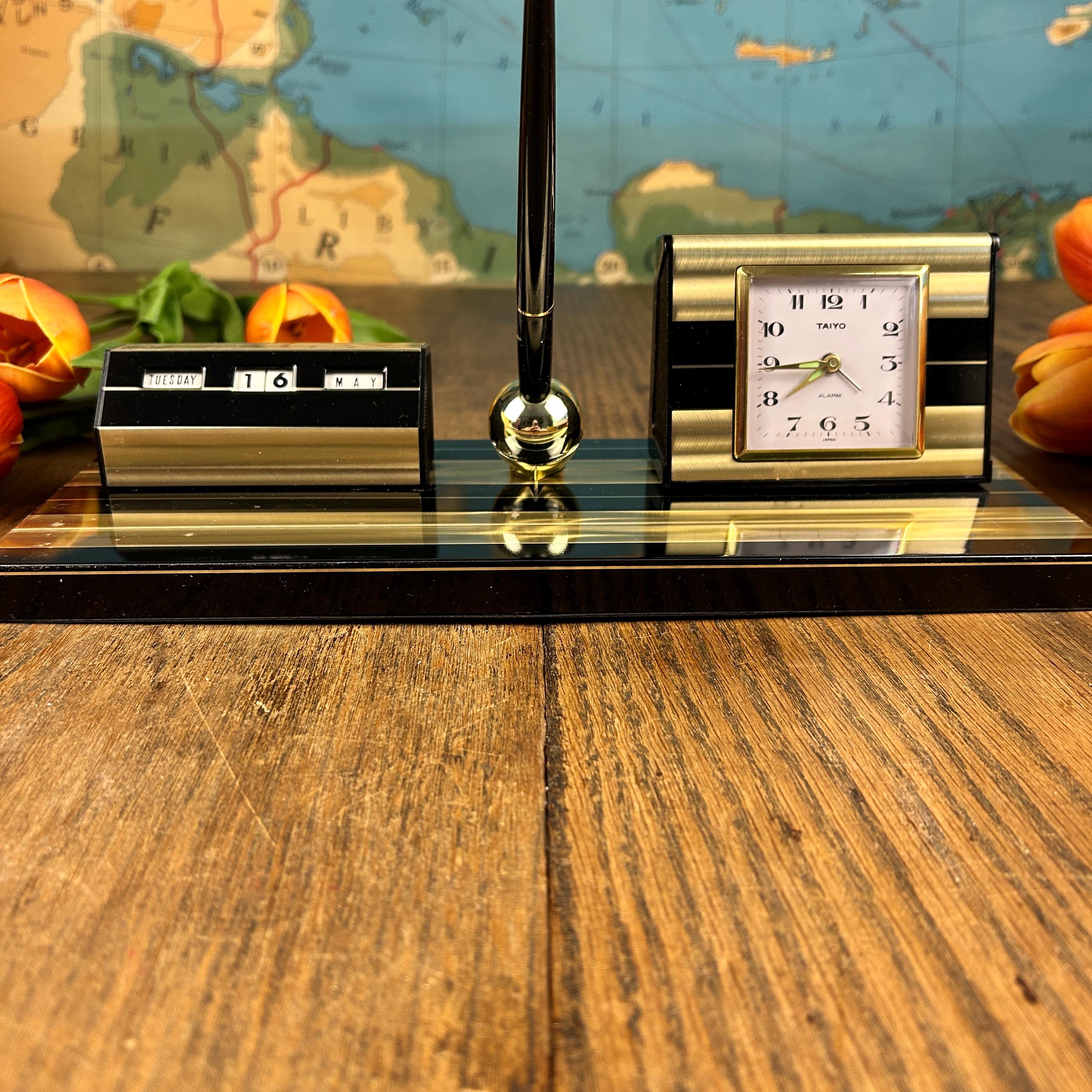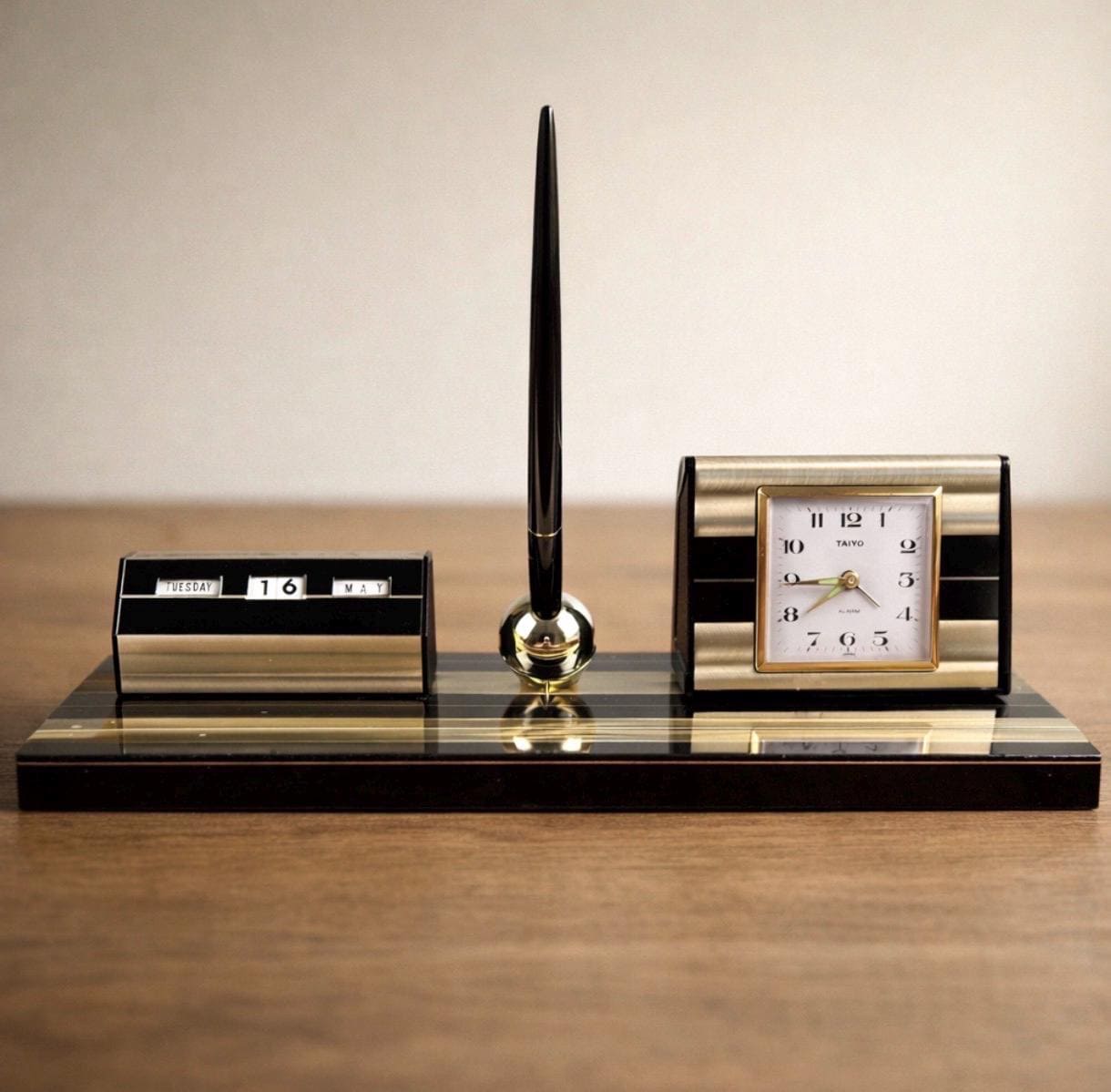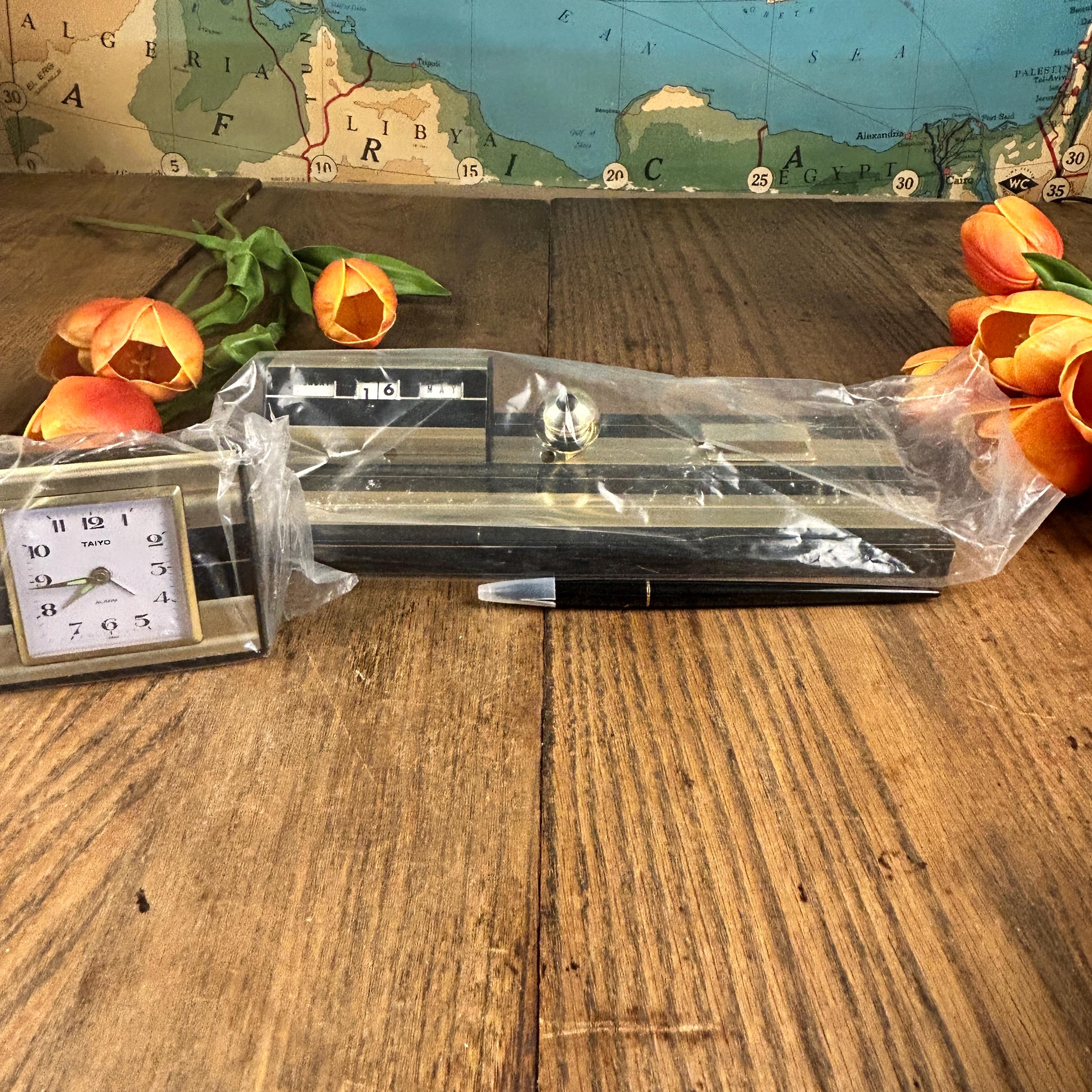 We might not wear suits to work anymore but you can add this gorgeous, new-in-the-box desk set to your office and feel like you've climbed the corporate ladder into a C-suite. Go ahead and make it look like you've gotten a big raise with this lovely Dynasty set that looks like it was stolen from the prop room of the movie Wall Street. This set was made by Taiyo in Japan and features a perpetual calendar you can scroll from the back - every day. The clock is a separate attachment that winds up and seems to work with a ticking sound of course. The pen could use a new ink refill. There are no scratches or any signs of previous use, this would make a very special gift in its original box.