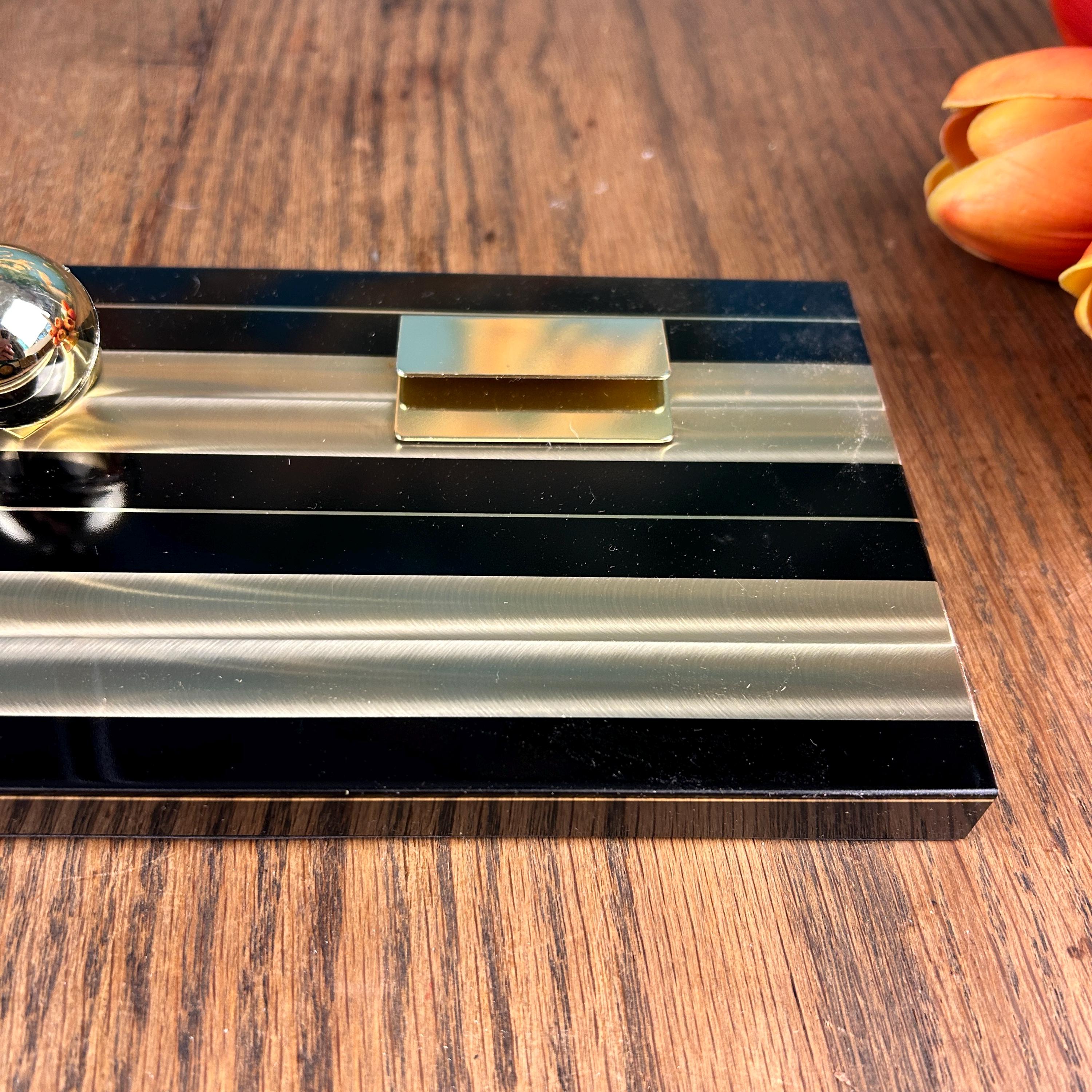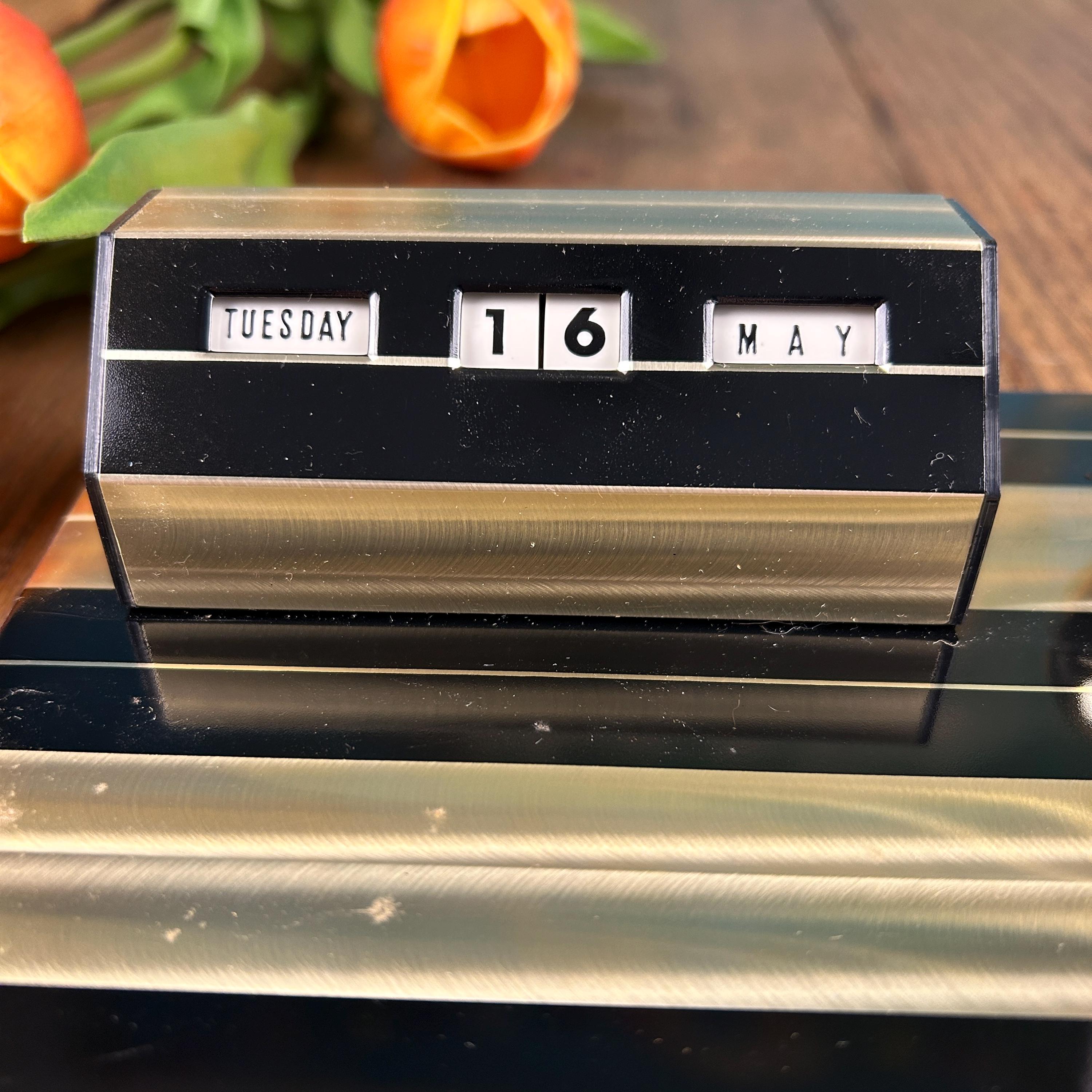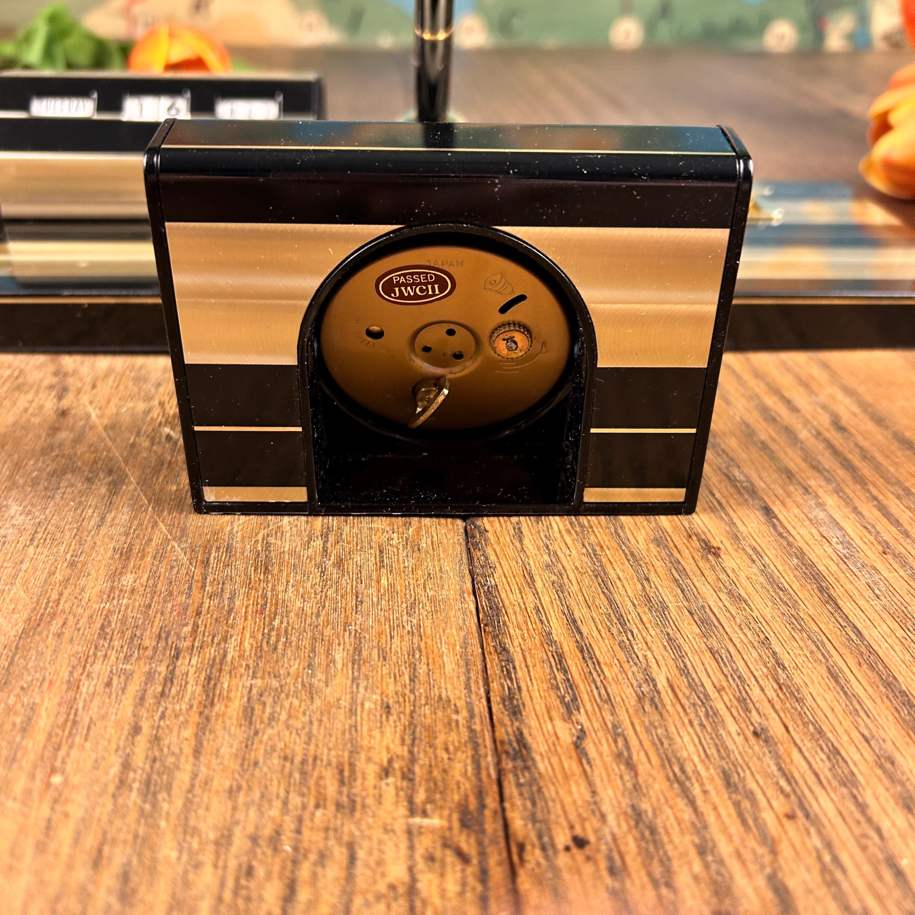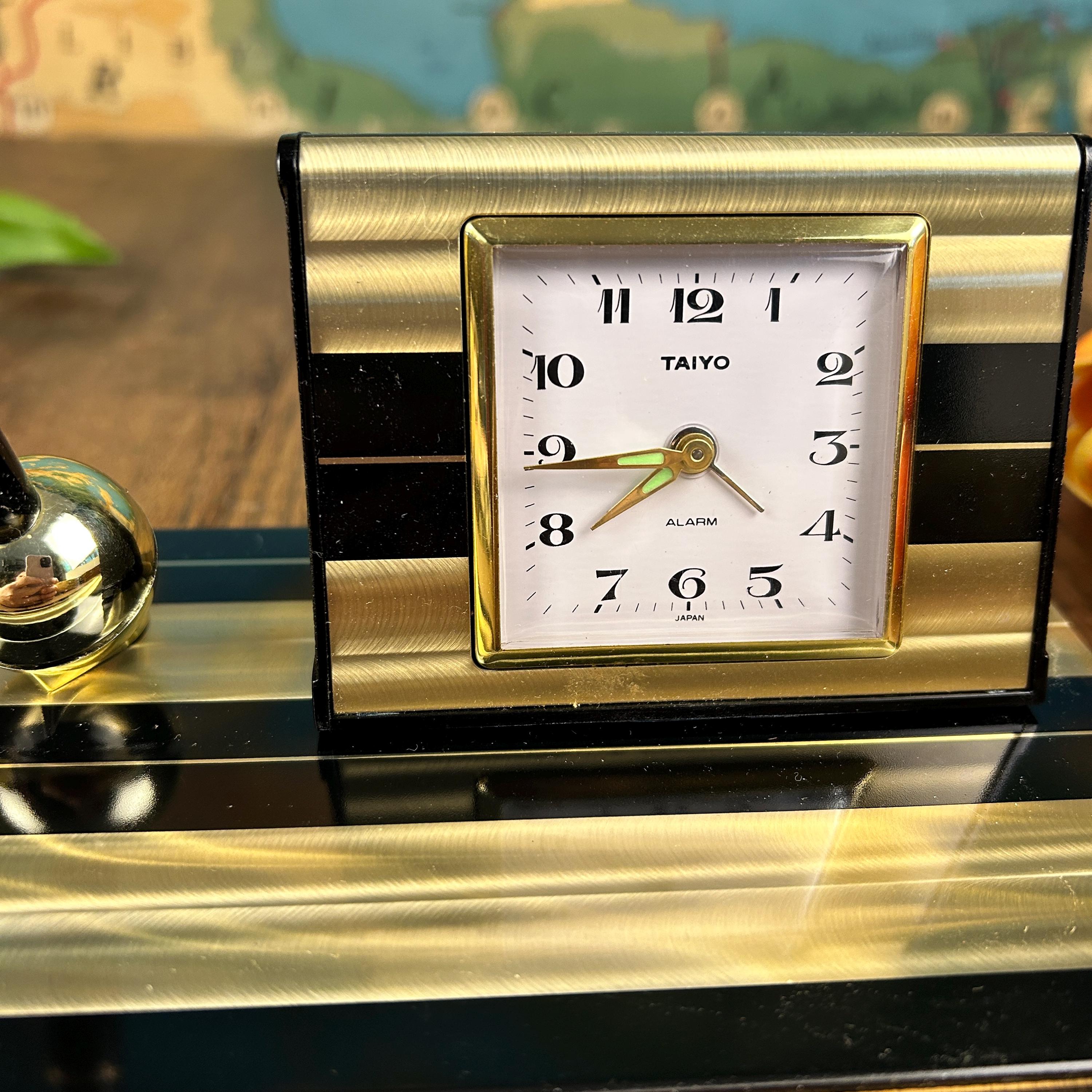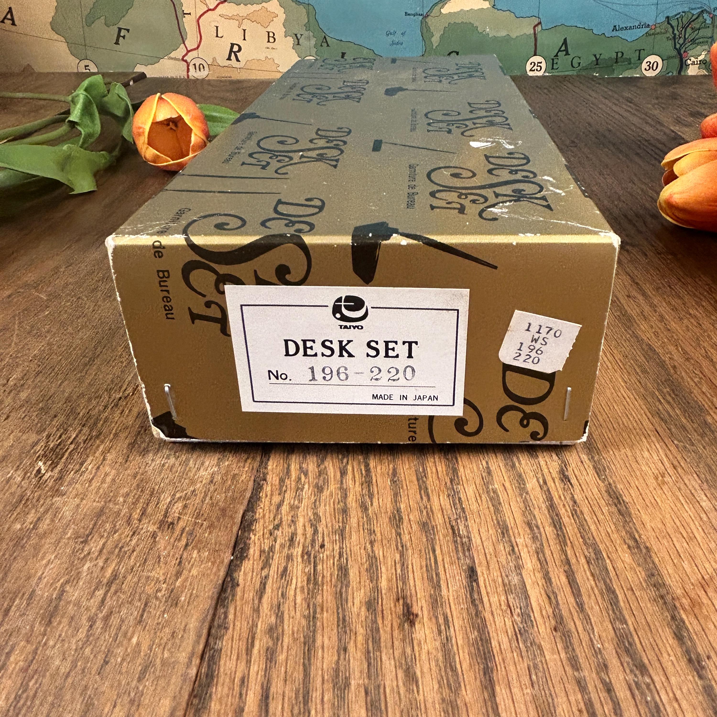 We might not wear suits to work anymore but you can add this gorgeous, new-in-the-box desk set to your office and feel like you've climbed the corporate ladder into a C-suite. Go ahead and make it look like you've gotten a big raise with this lovely Dynasty set that looks like it was stolen from the prop room of the movie Wall Street. This set was made by Taiyo in Japan and features a perpetual calendar you can scroll from the back - every day. The clock is a separate attachment that winds up and seems to work with a ticking sound of course. The pen could use a new ink refill. There are no scratches or any signs of previous use, this would make a very special gift in its original box.