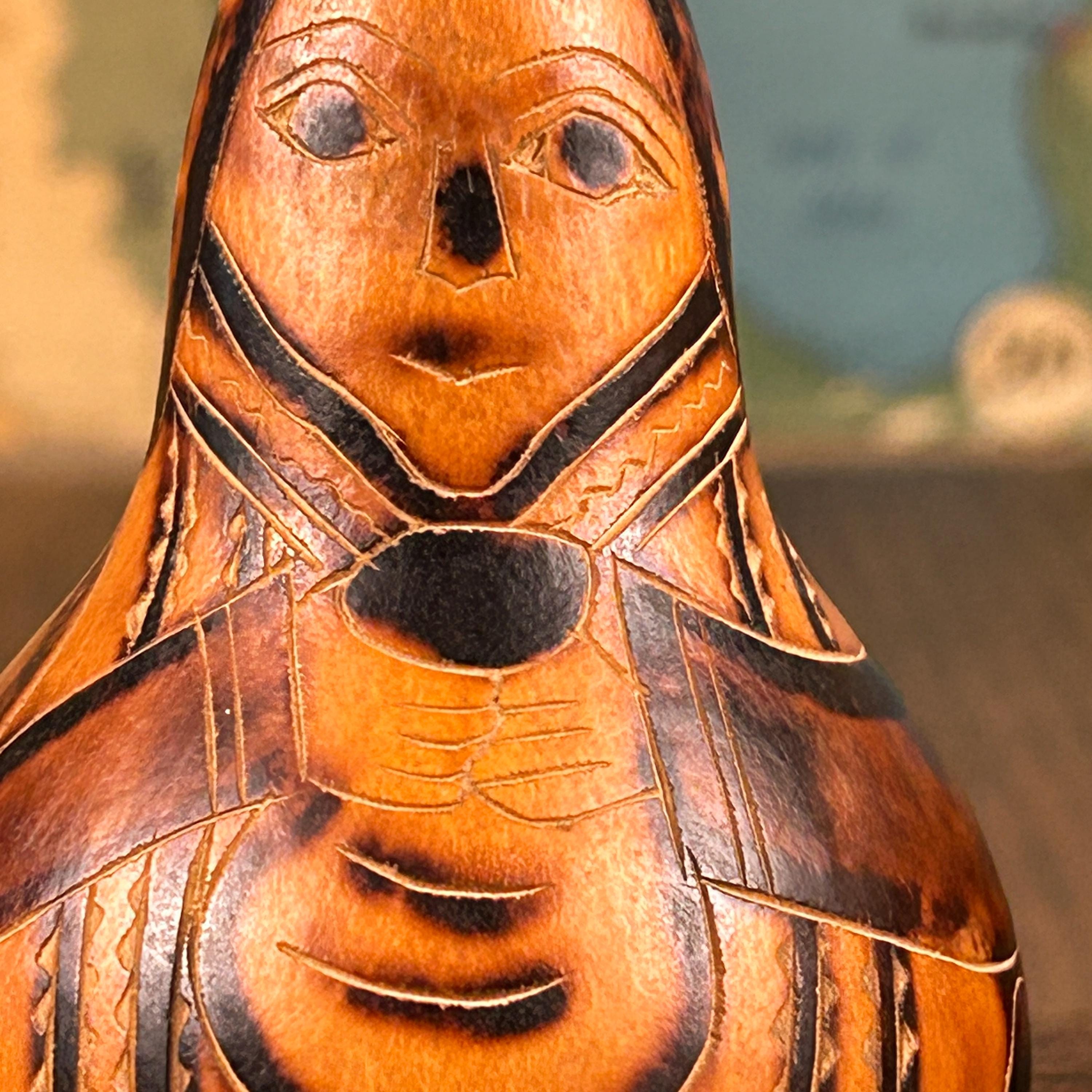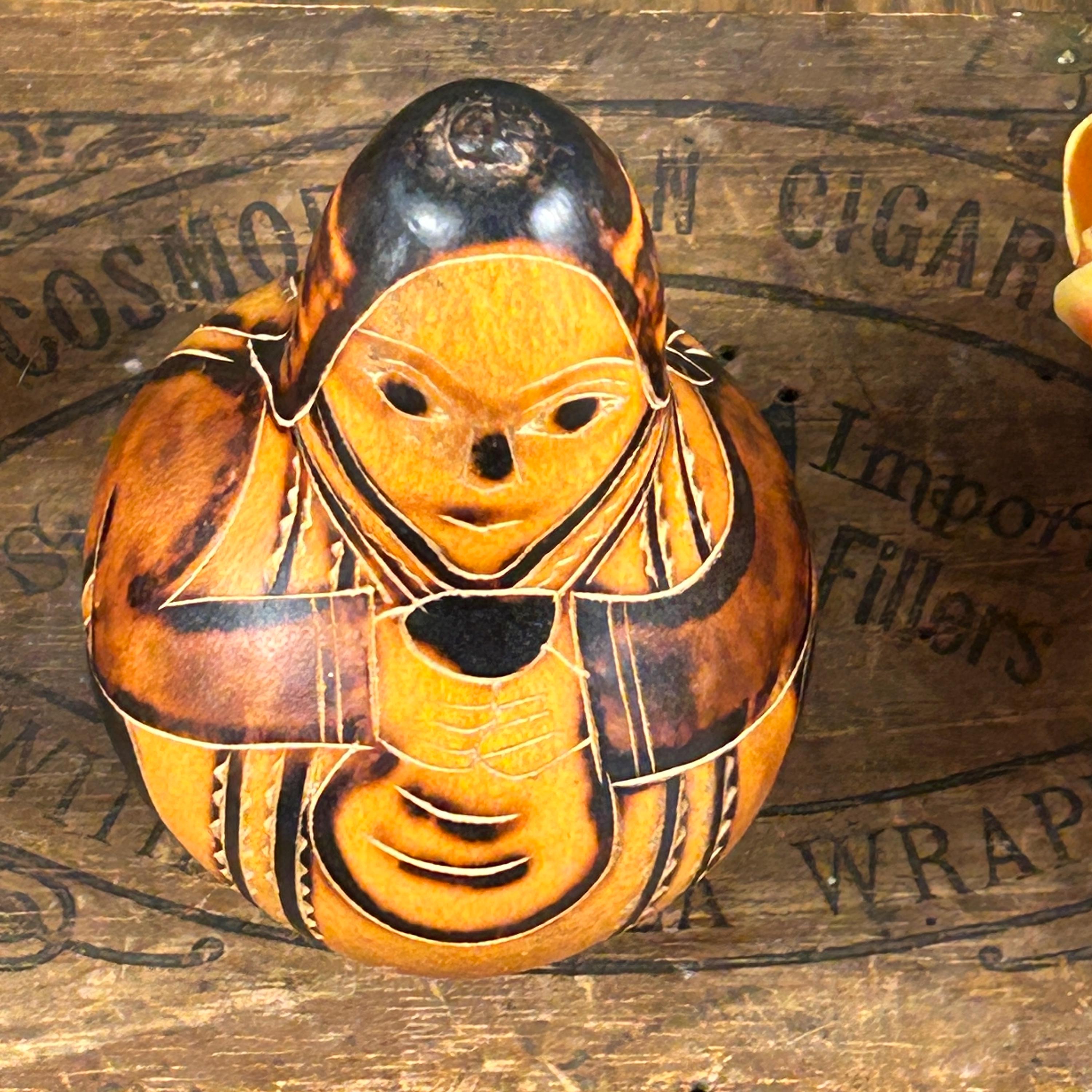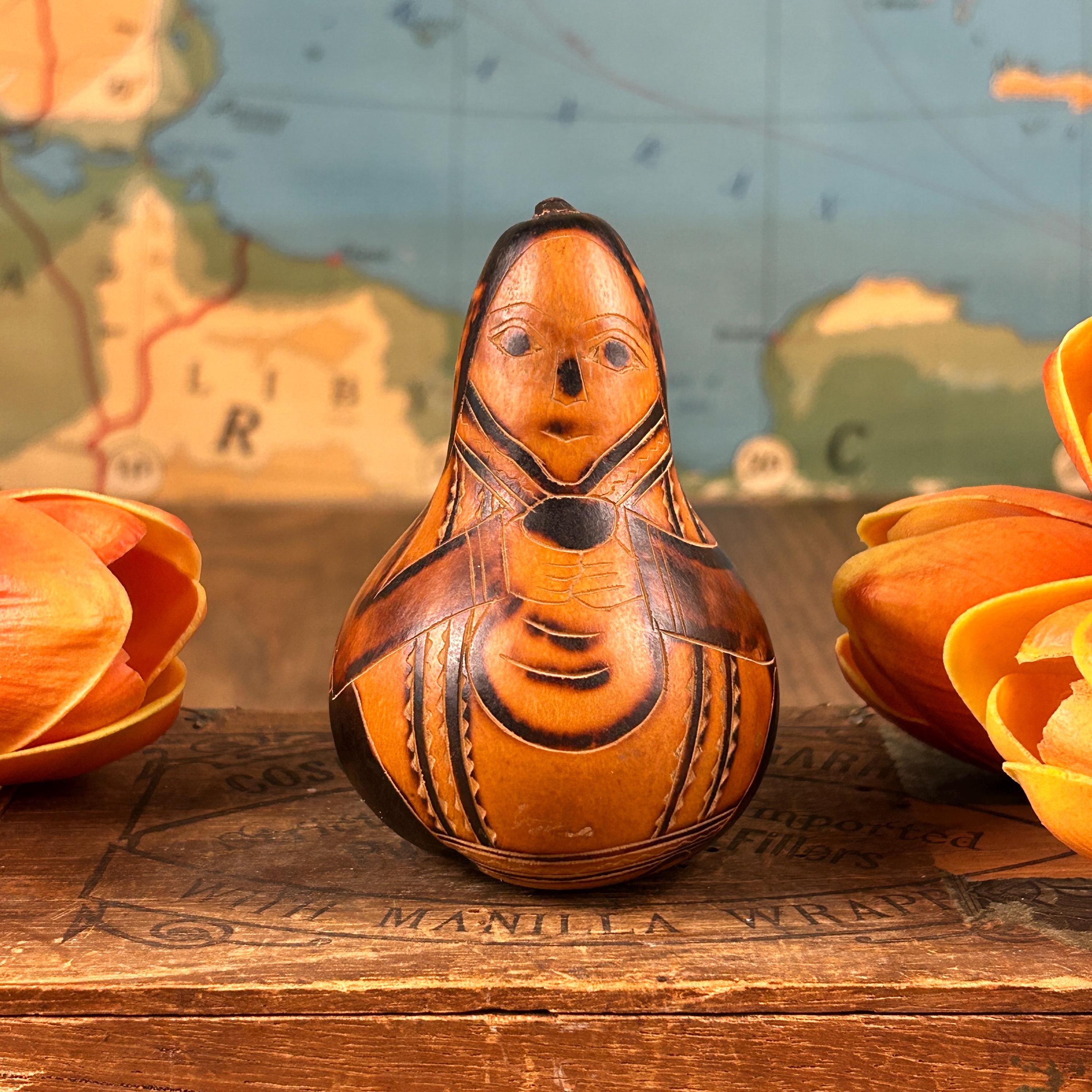 Immerse your home in the rustic charm of Vintage Carved Gourds Rattle, a piece of hand-carved Peruvian Folk Art. This primitive and authentic décor item adds a touch of traditional craftsmanship to your space. The intricately carved gourds, transformed into rattles, showcase the skillful artistry of Peruvian artisans. Whether displayed as a standalone piece or incorporated into your rustic home decor, these vintage carved gourds bring a unique and cultural flair to your living space. Embrace the primitive beauty and traditional artistry with this distinctive piece of Peruvian Folk Art. This is a vintage item and may show minor wear due to age.