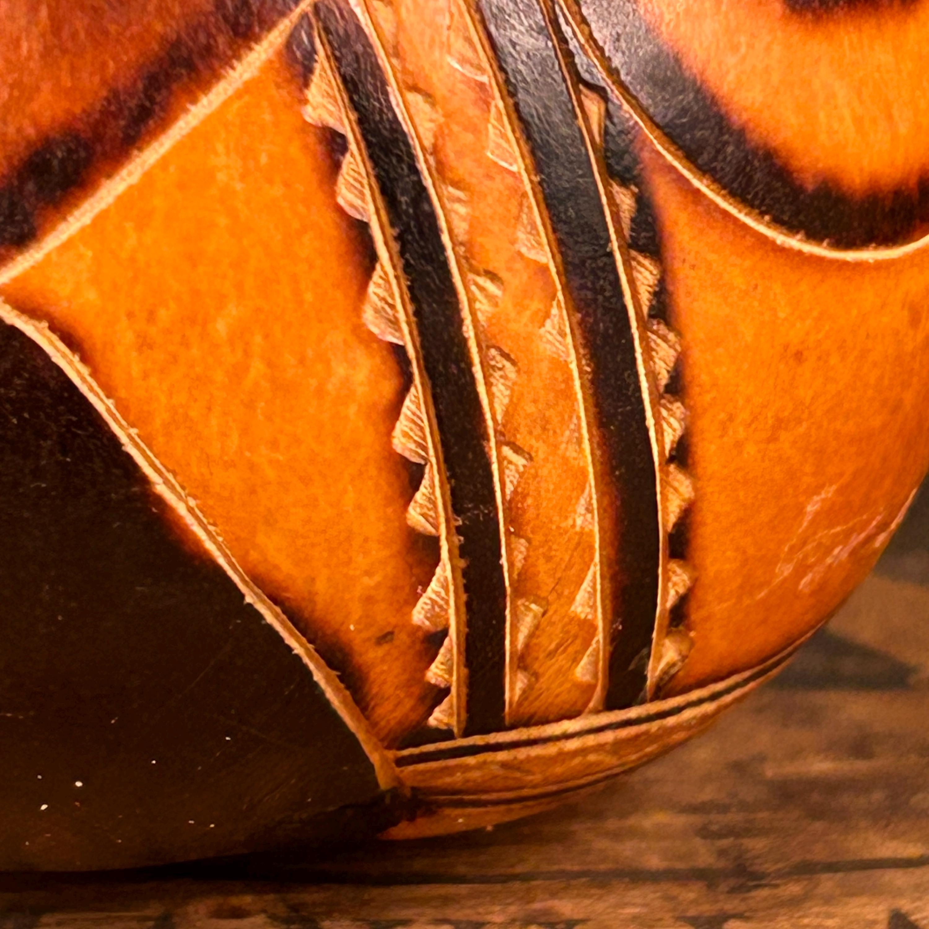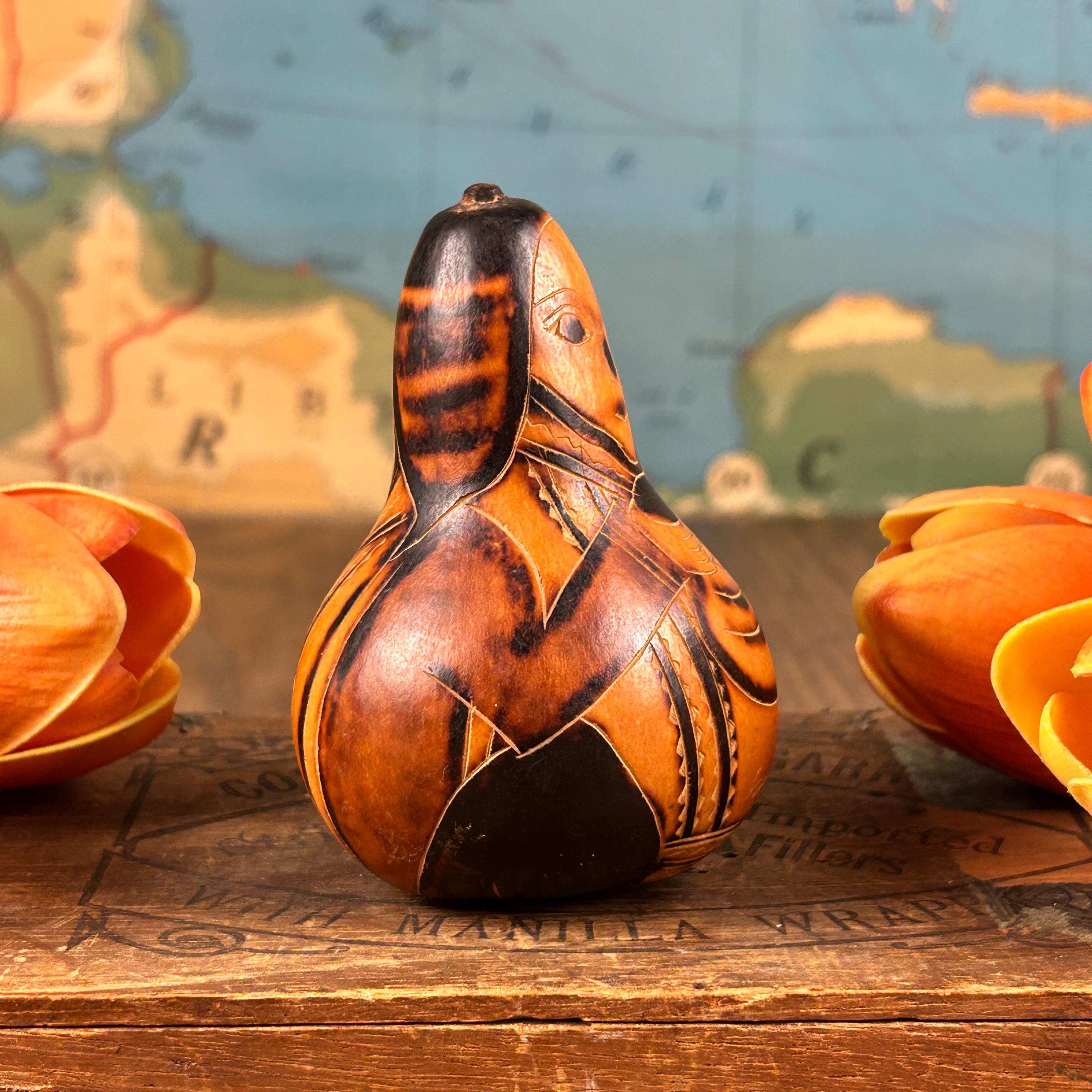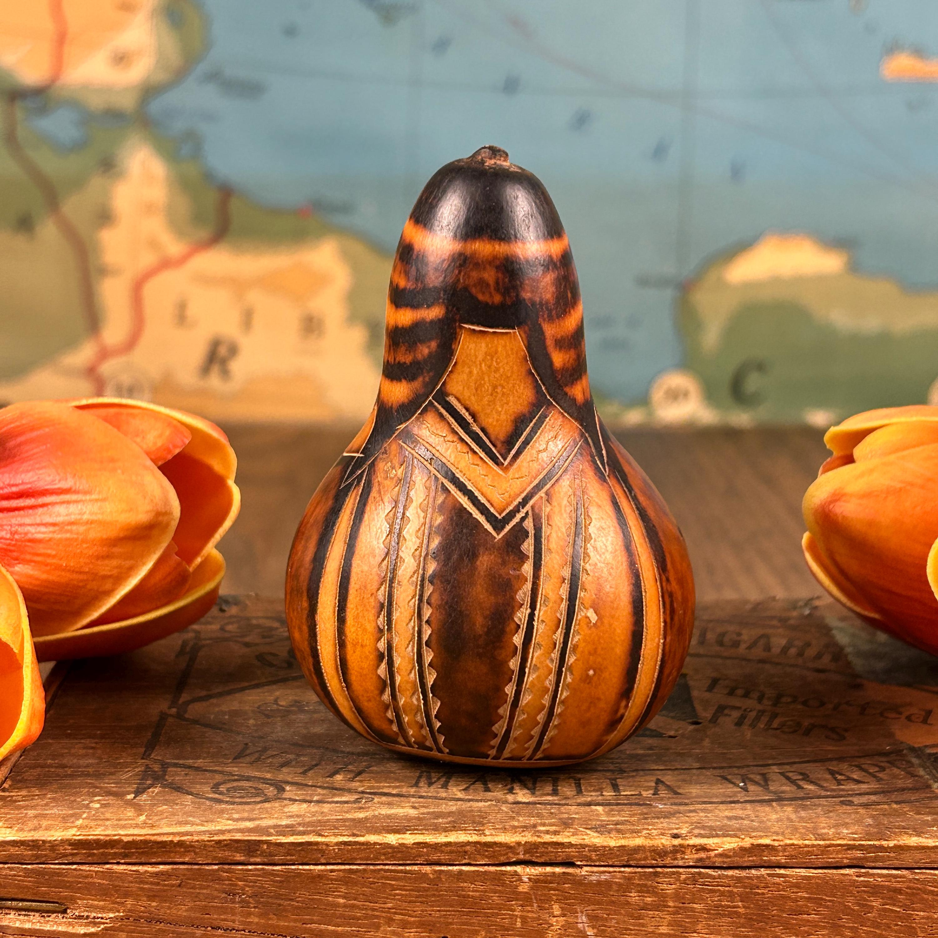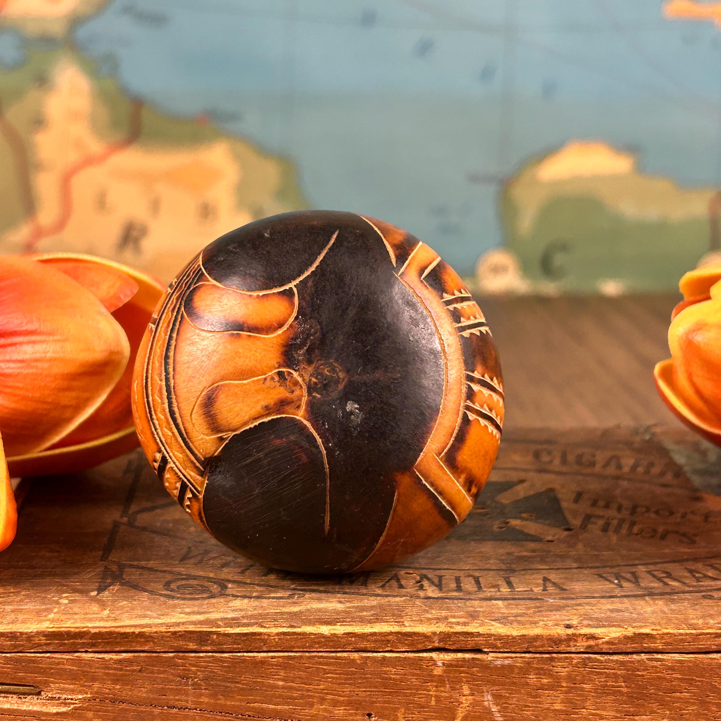 Immerse your home in the rustic charm of Vintage Carved Gourds Rattle, a piece of hand-carved Peruvian Folk Art. This primitive and authentic décor item adds a touch of traditional craftsmanship to your space. The intricately carved gourds, transformed into rattles, showcase the skillful artistry of Peruvian artisans. Whether displayed as a standalone piece or incorporated into your rustic home decor, these vintage carved gourds bring a unique and cultural flair to your living space. Embrace the primitive beauty and traditional artistry with this distinctive piece of Peruvian Folk Art. This is a vintage item and may show minor wear due to age.