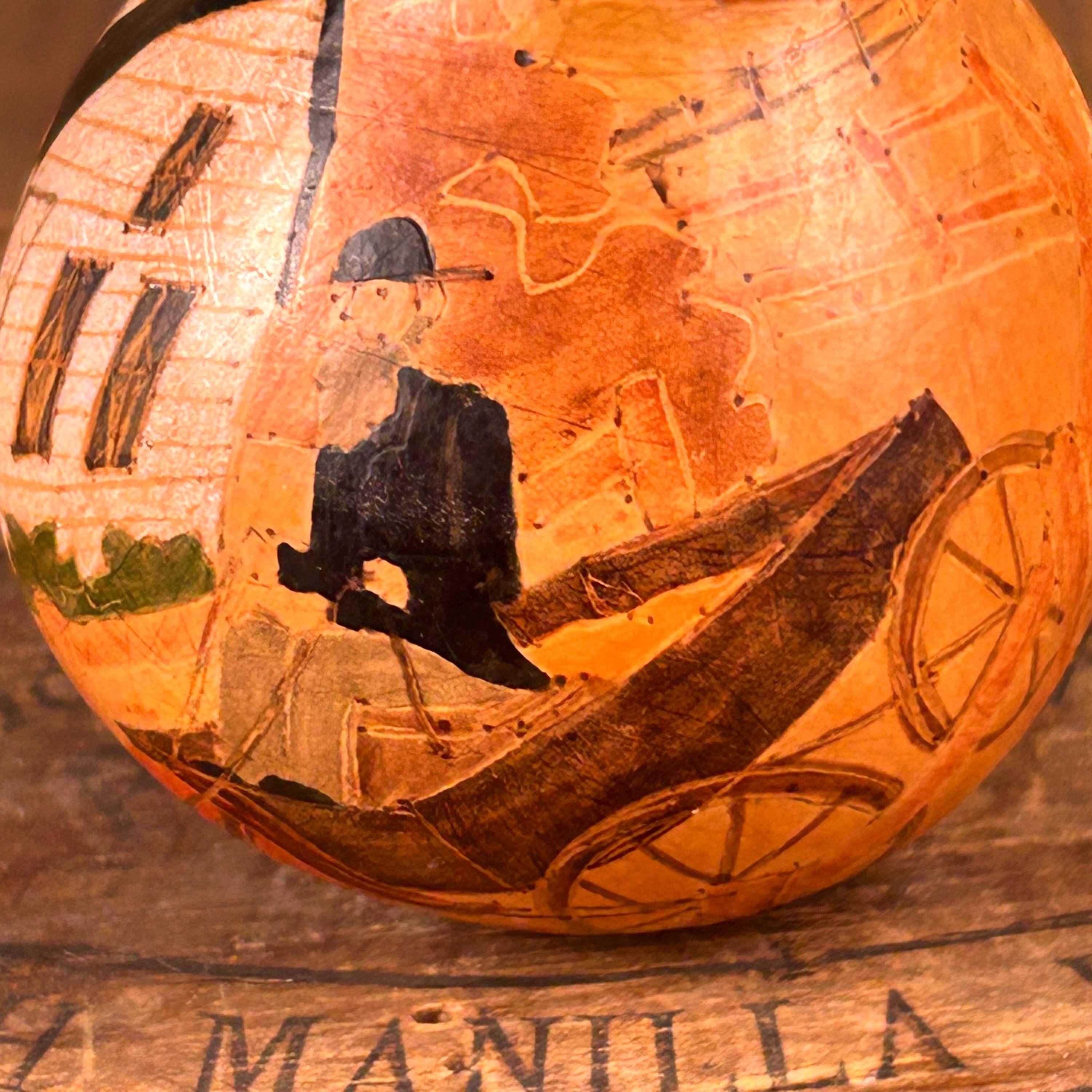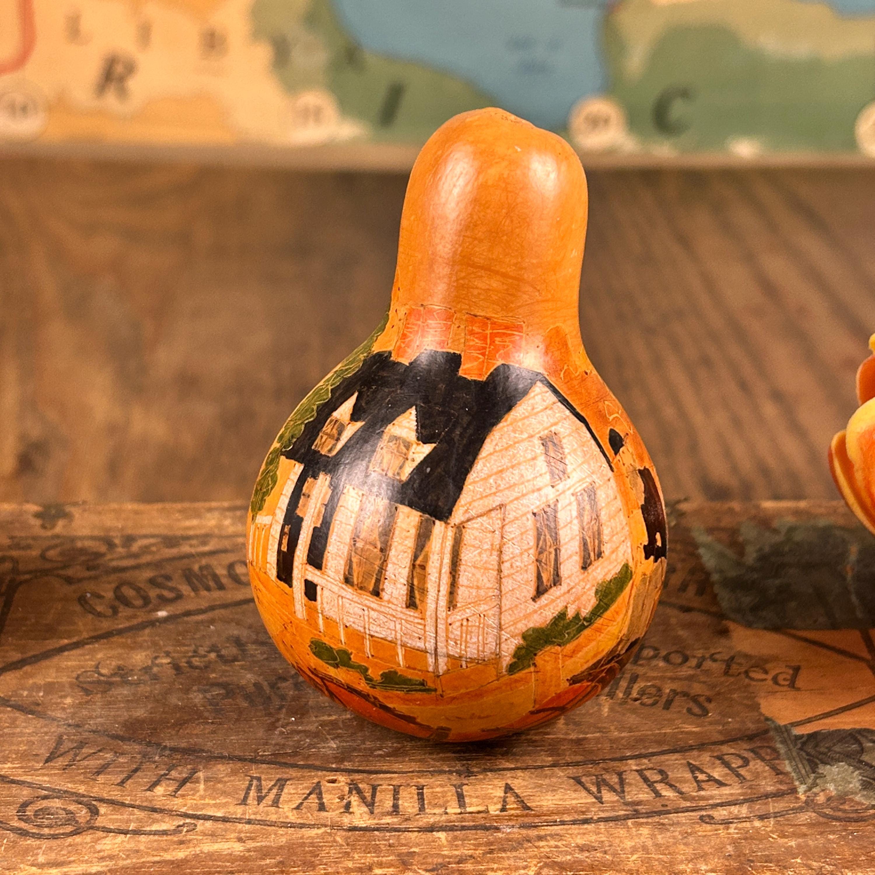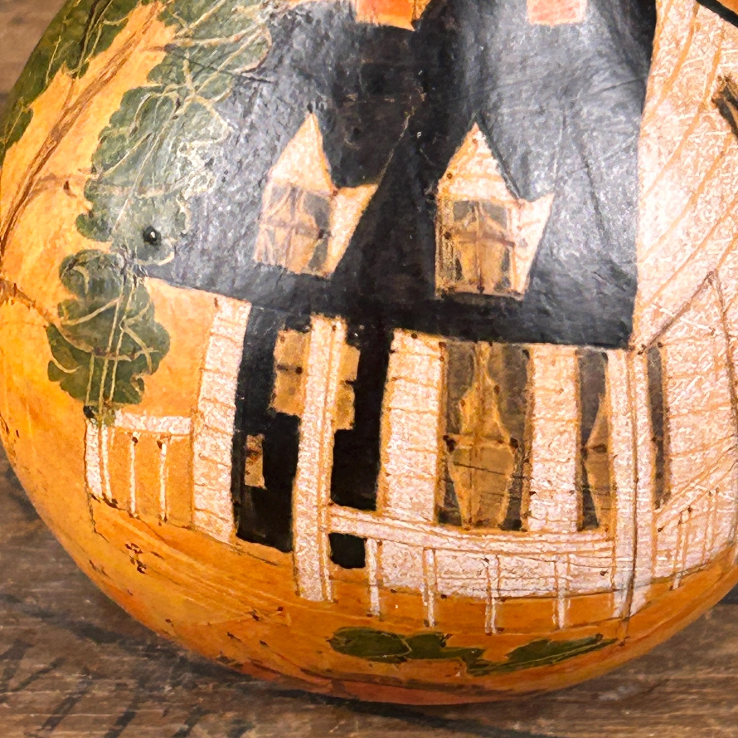 Featured on the gourd are a white farmhouse, a tall tree, a man riding in a farm carriage pulled by a horse. Intricately painted and very detailed.