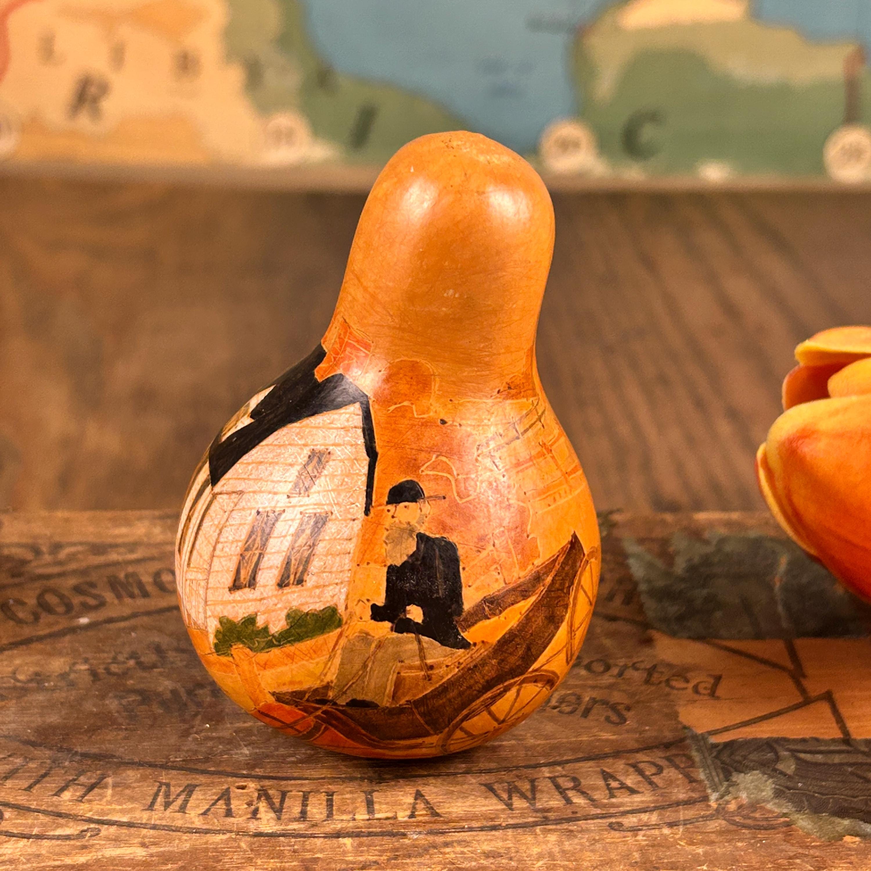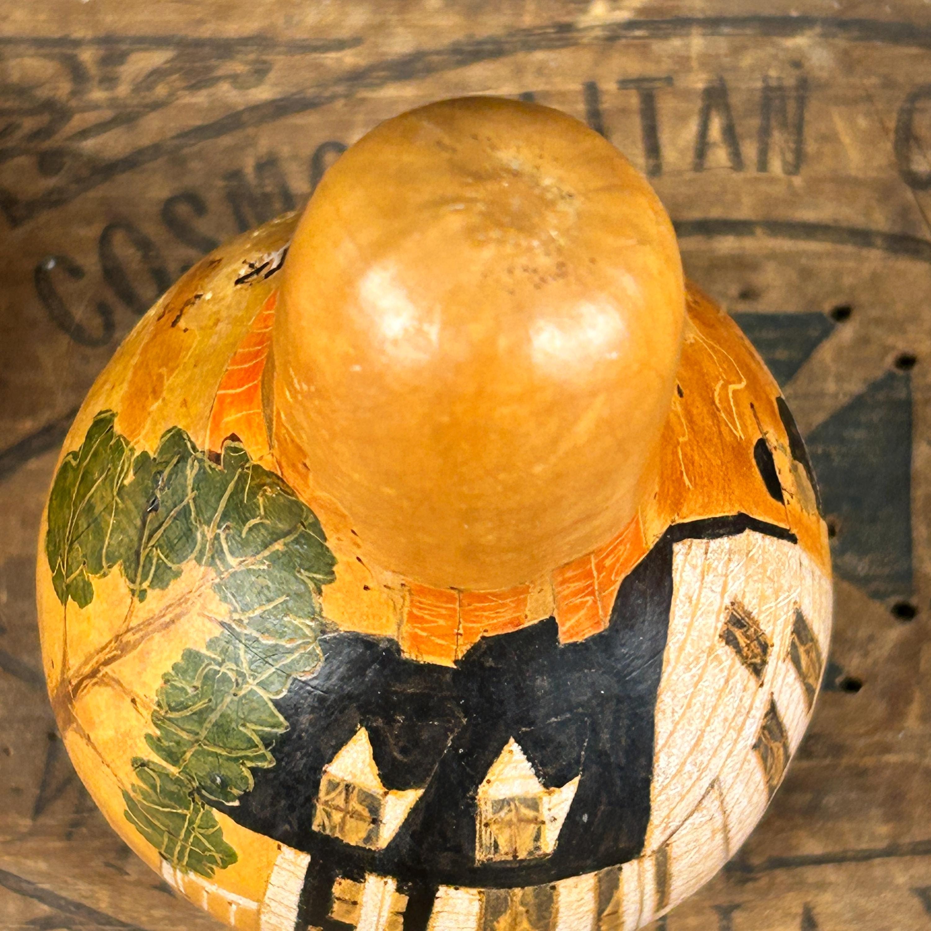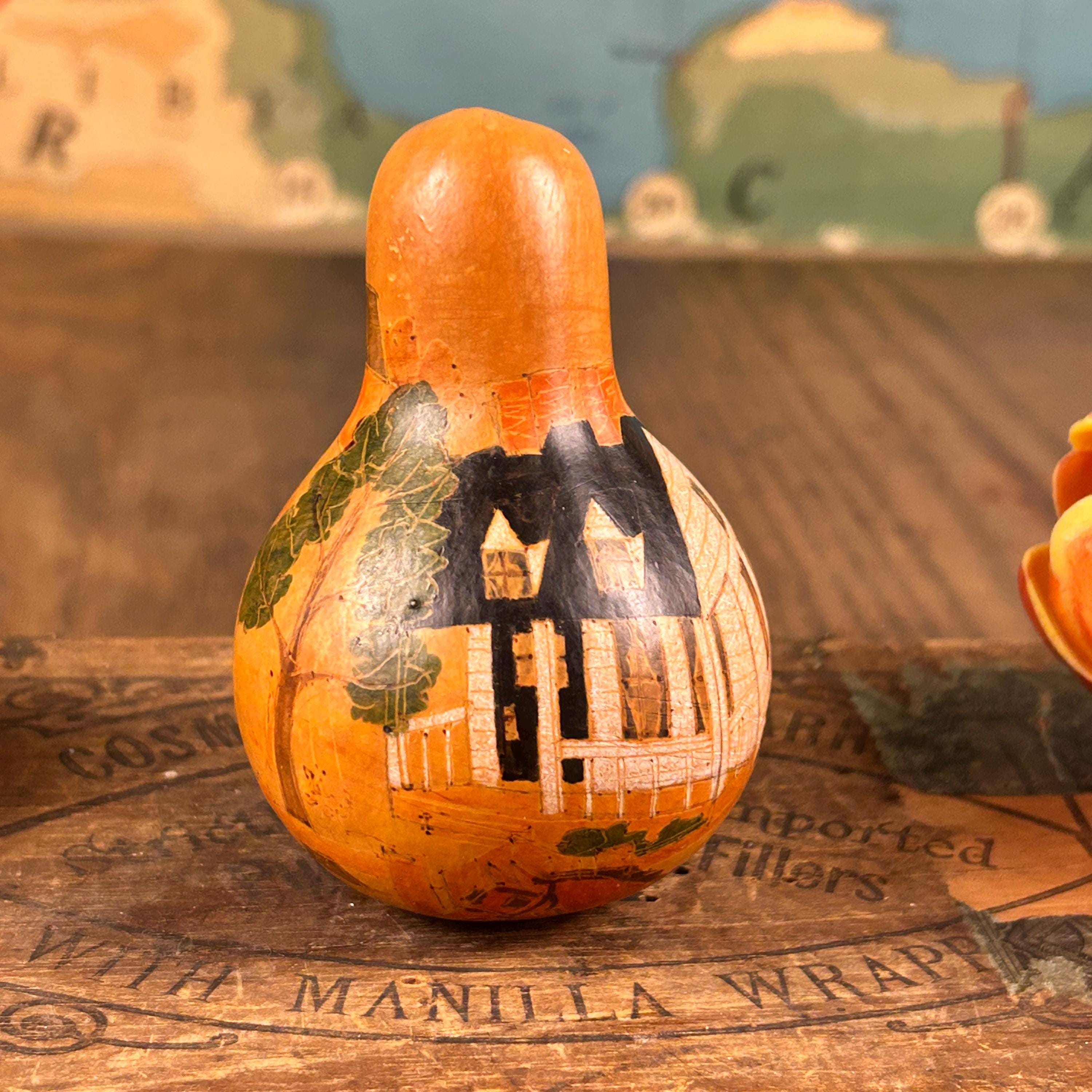 Featured on the gourd are a white farmhouse, a tall tree, a man riding in a farm carriage pulled by a horse. Intricately painted and very detailed.