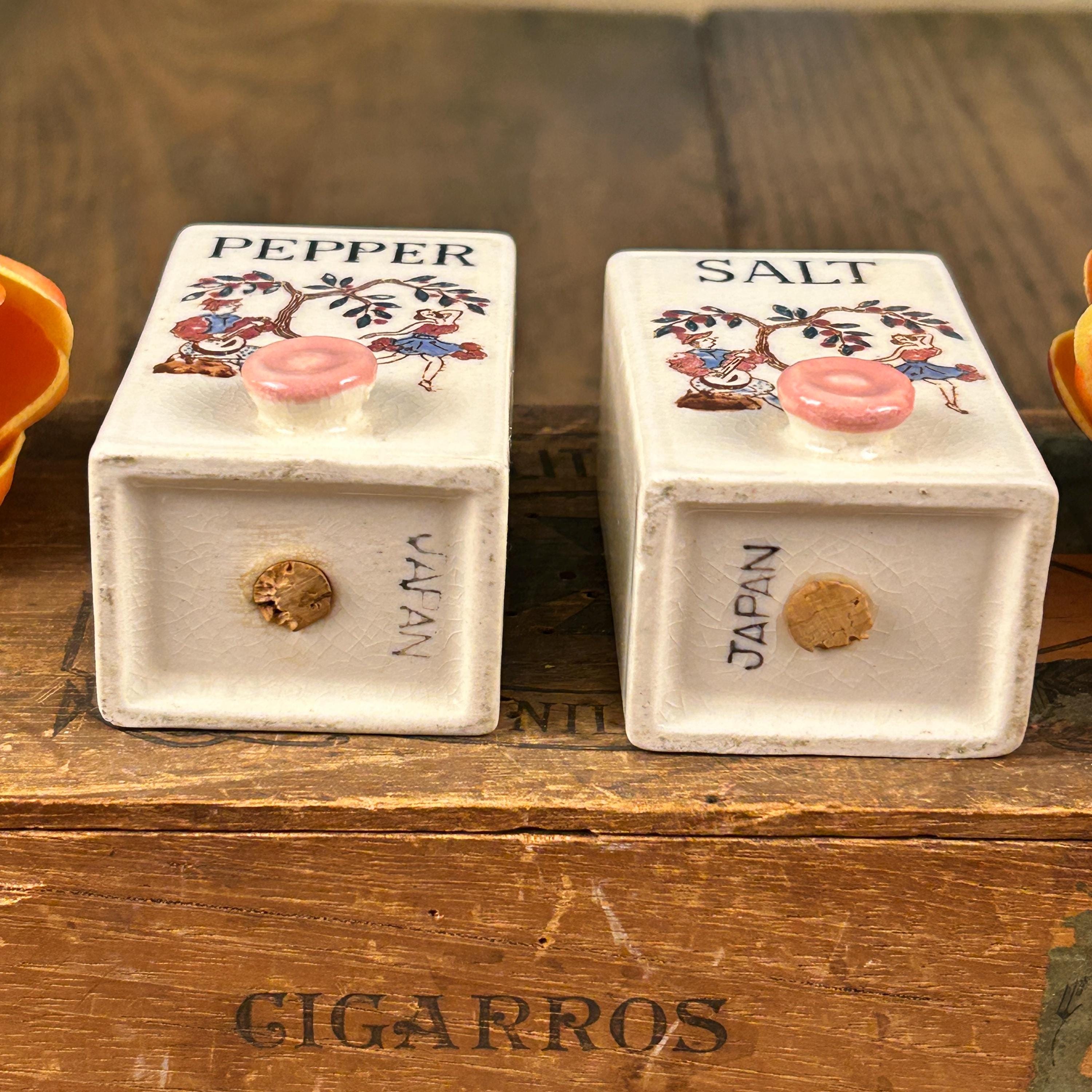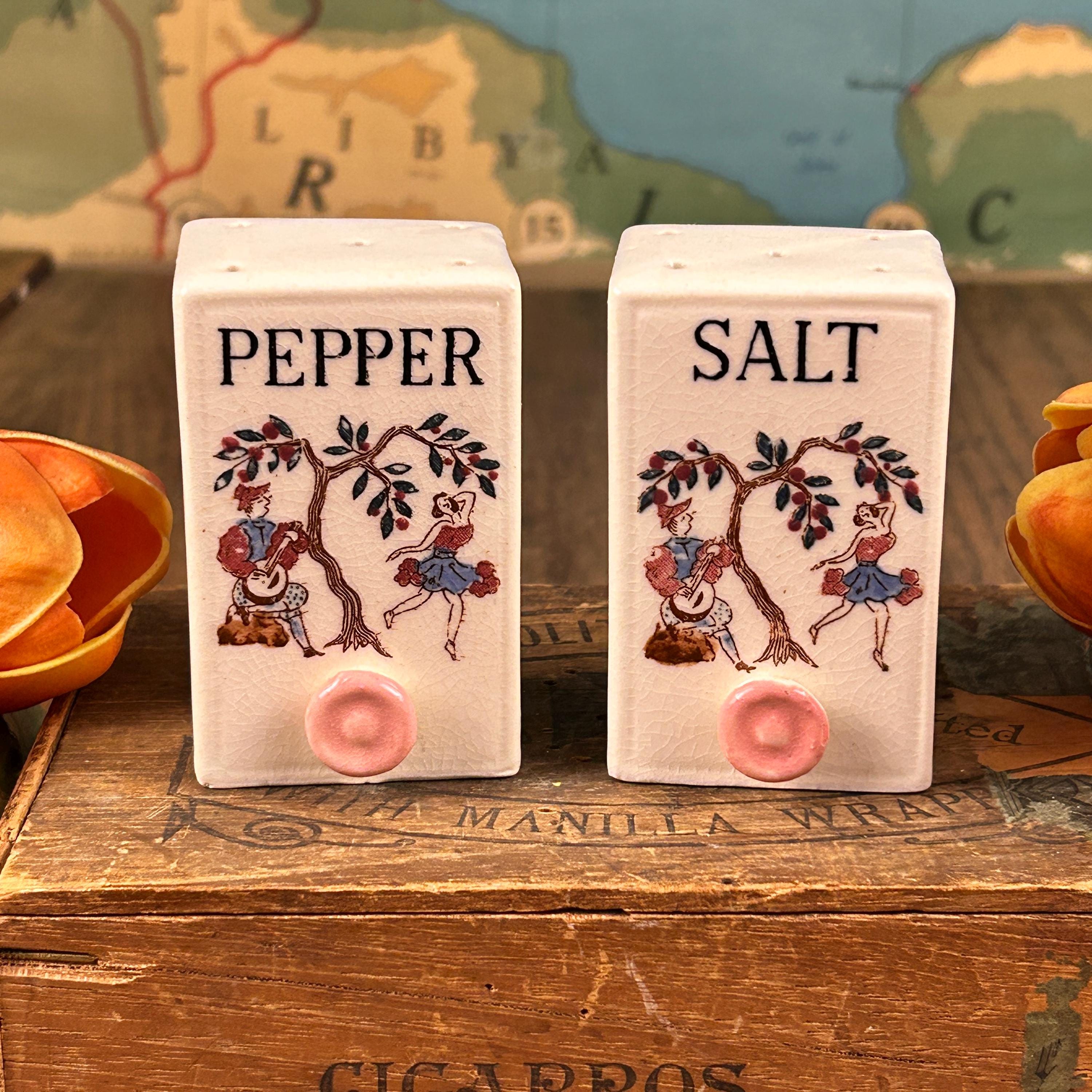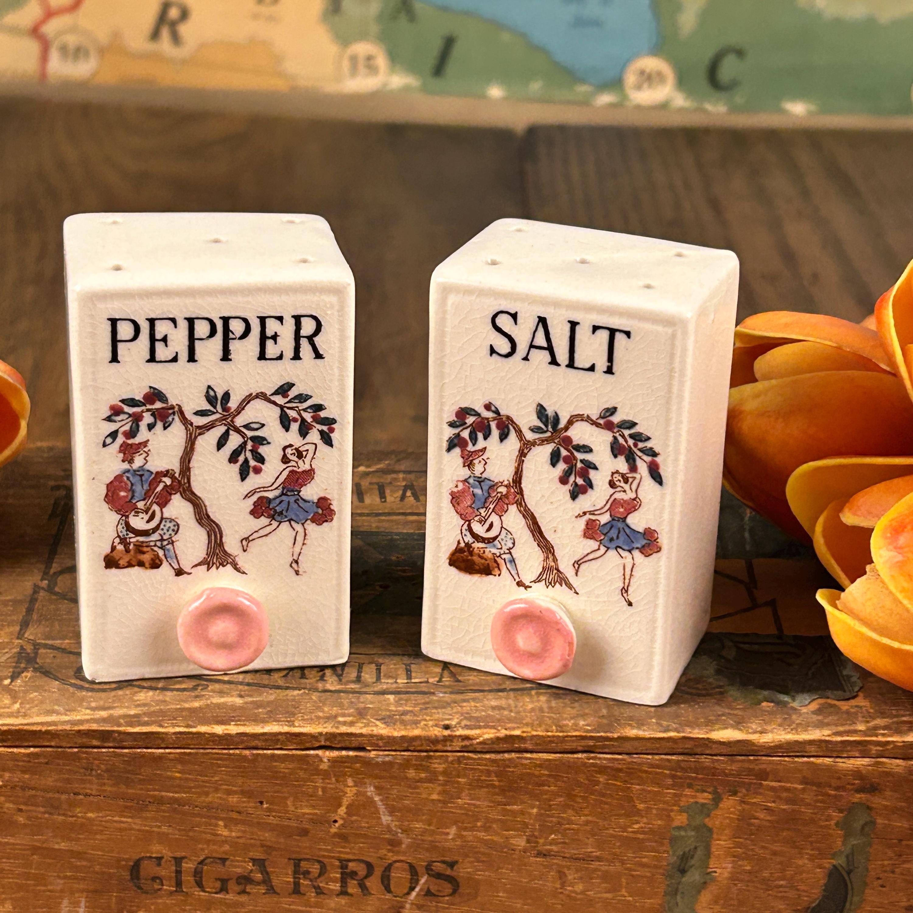 These beautiful little salt and pepper shakers feature a man playing and instrument while a woman dances under a tree. They feature pink knobs that come out of the front of each. Bottom is marked Japan.
