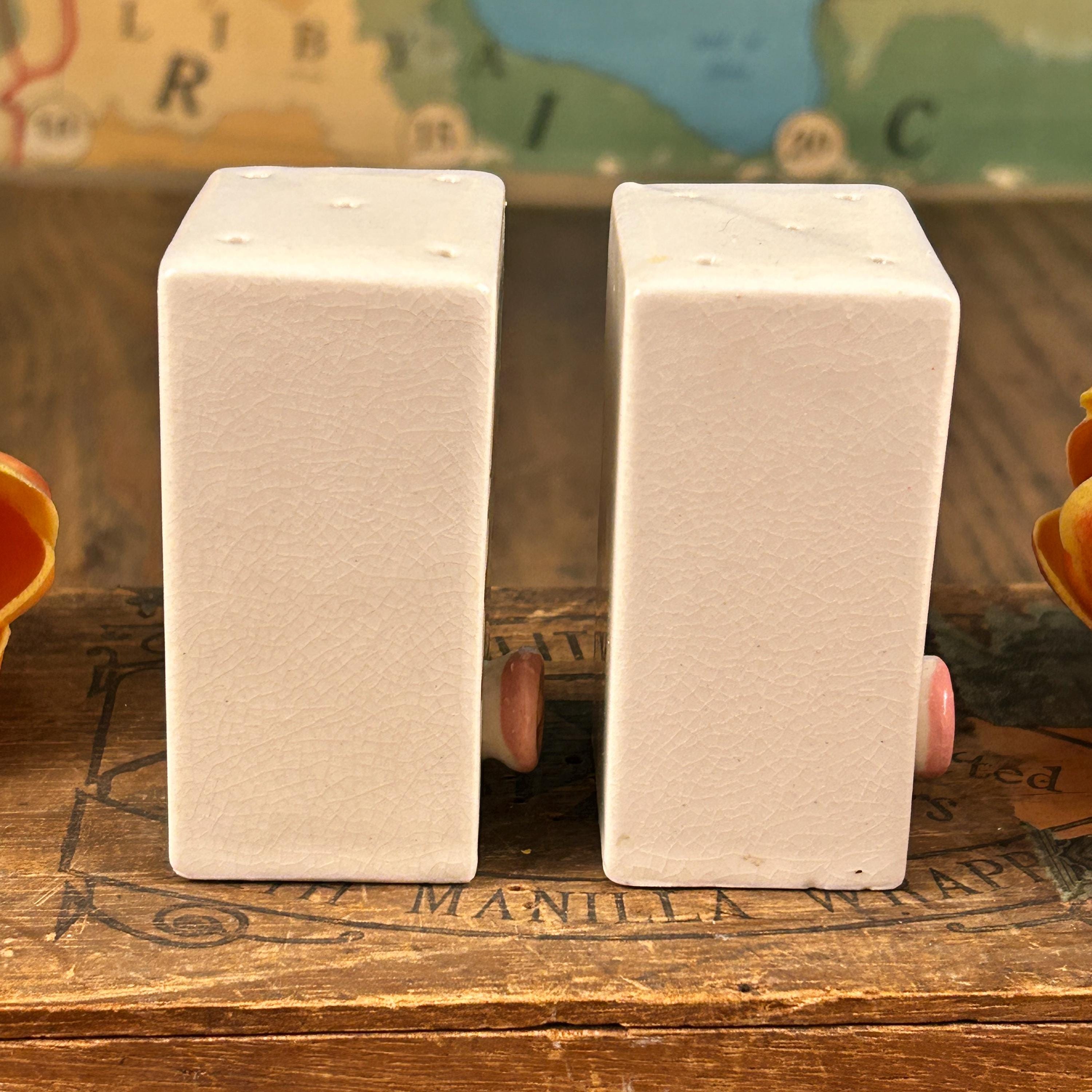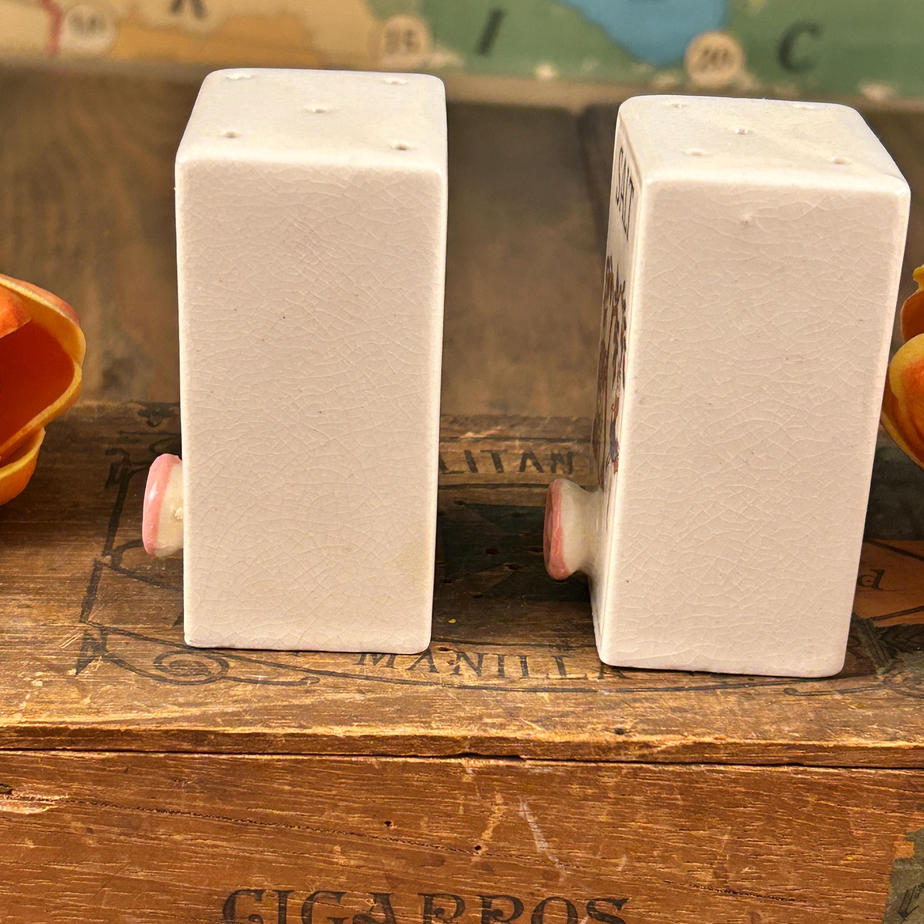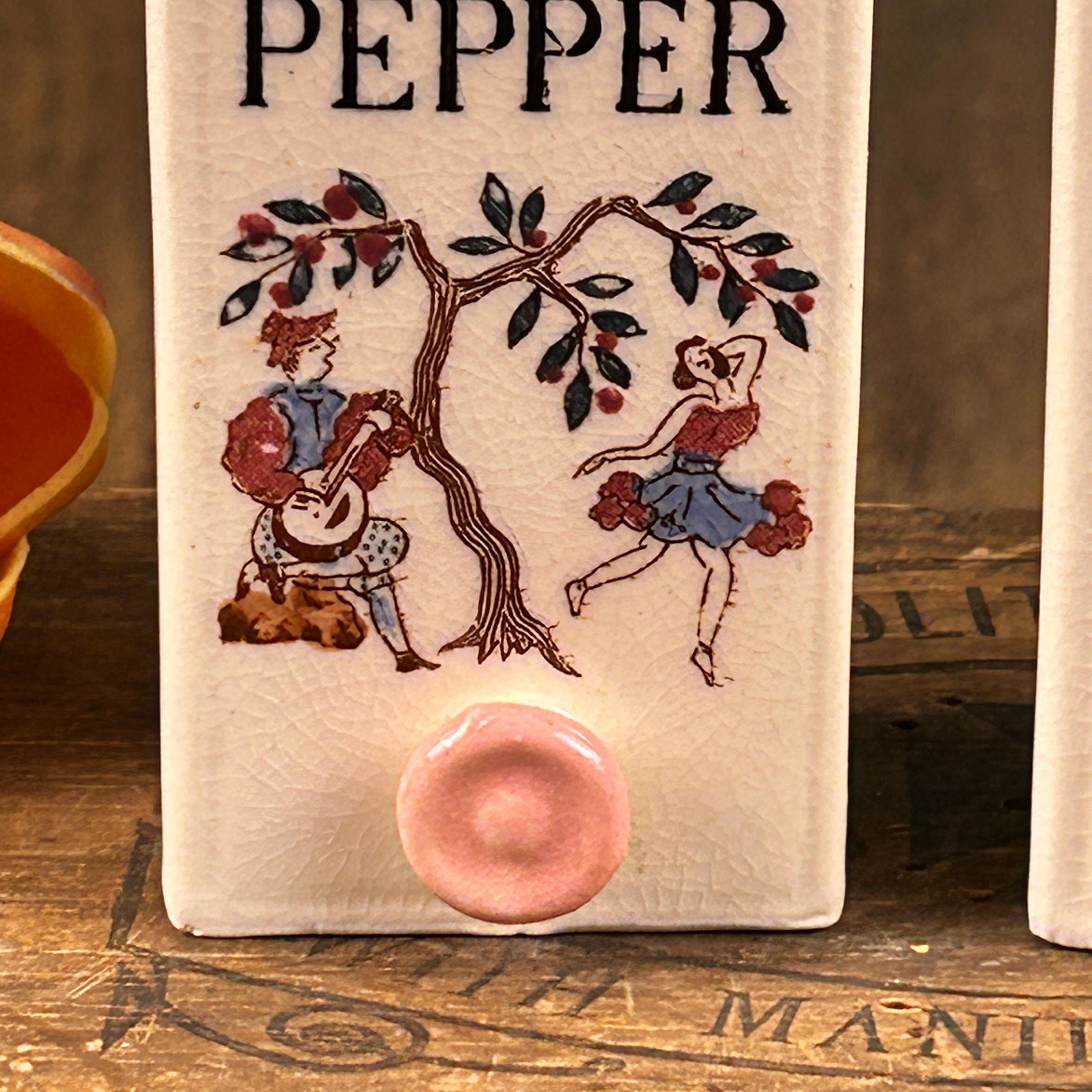 These beautiful little salt and pepper shakers feature a man playing and instrument while a woman dances under a tree. They feature pink knobs that come out of the front of each. Bottom is marked Japan.