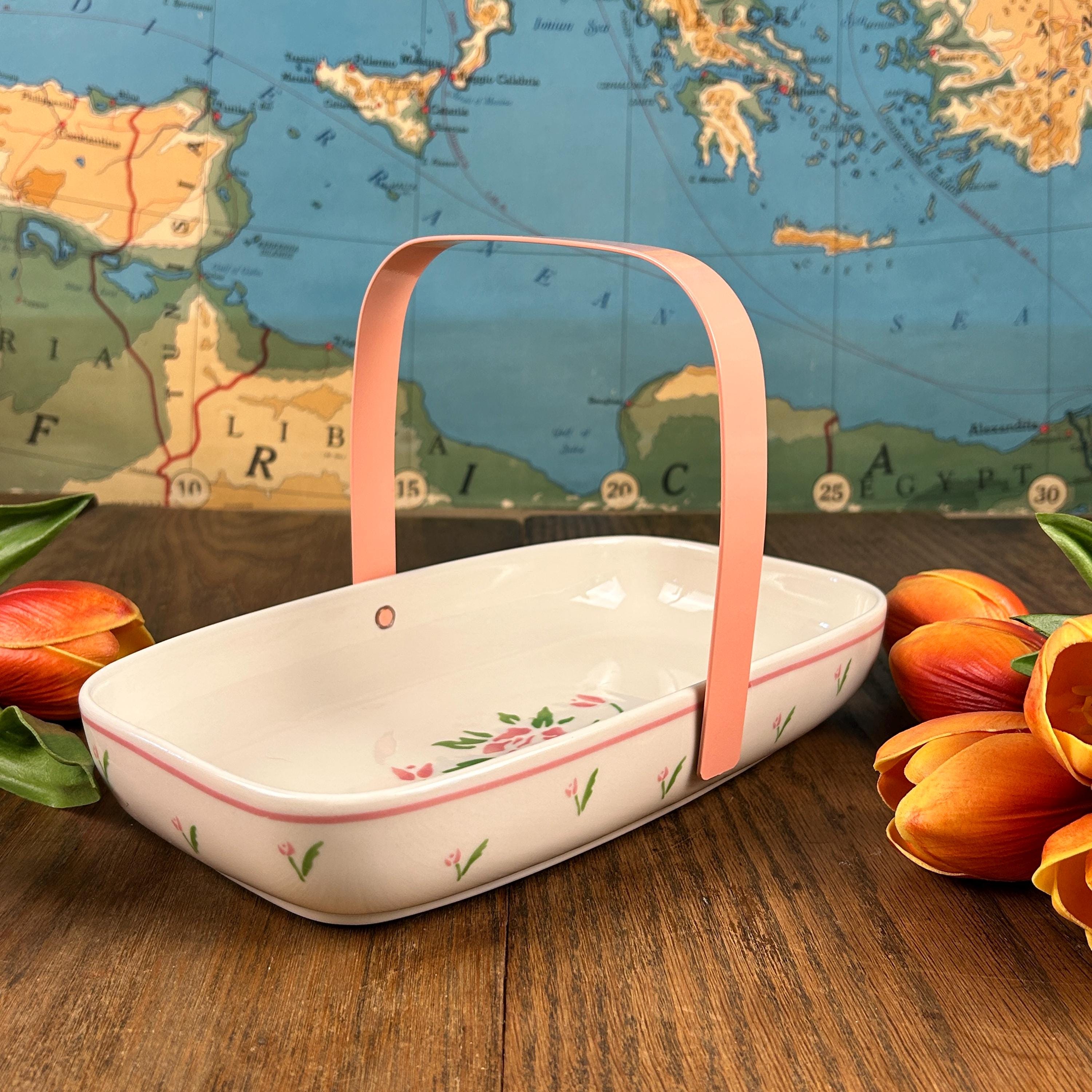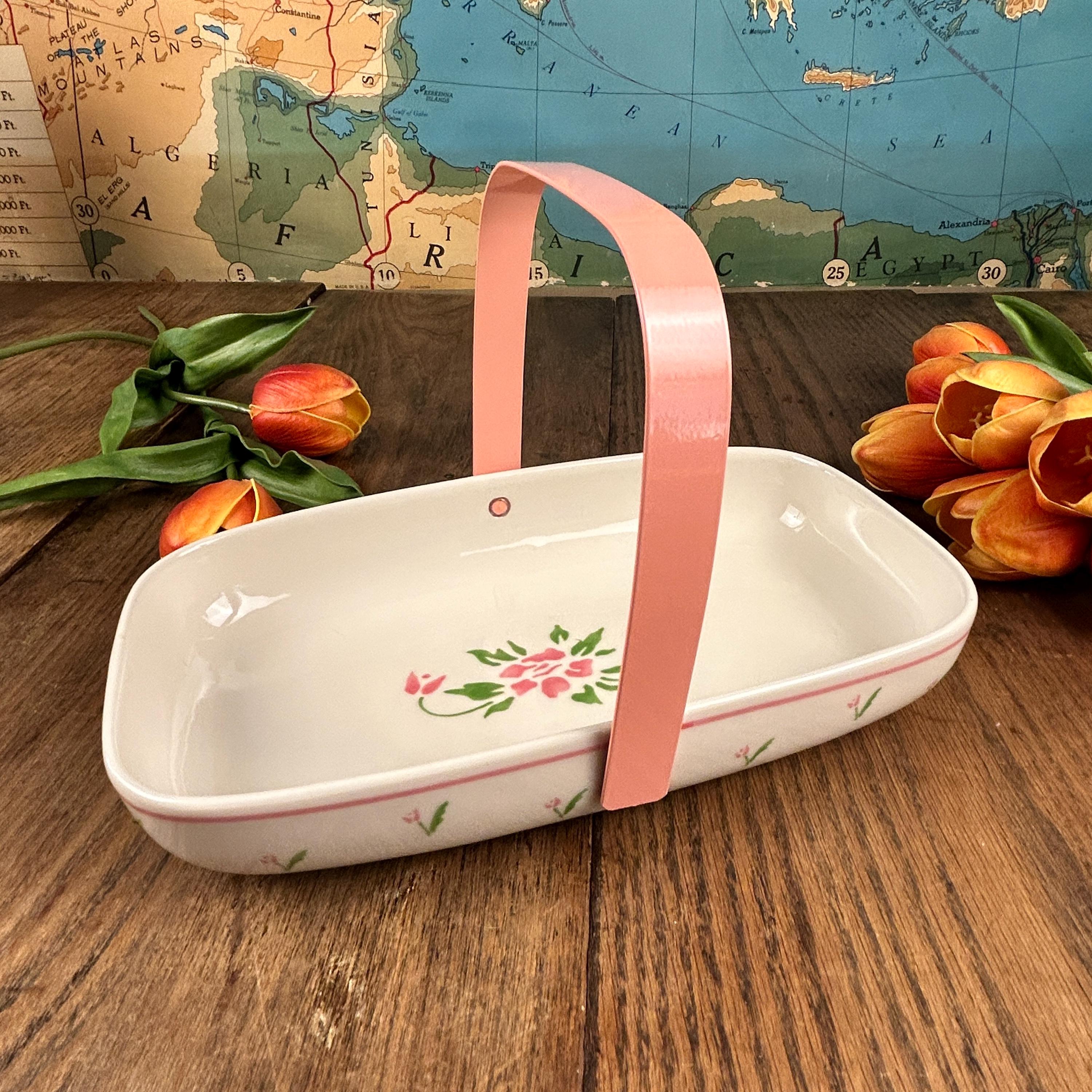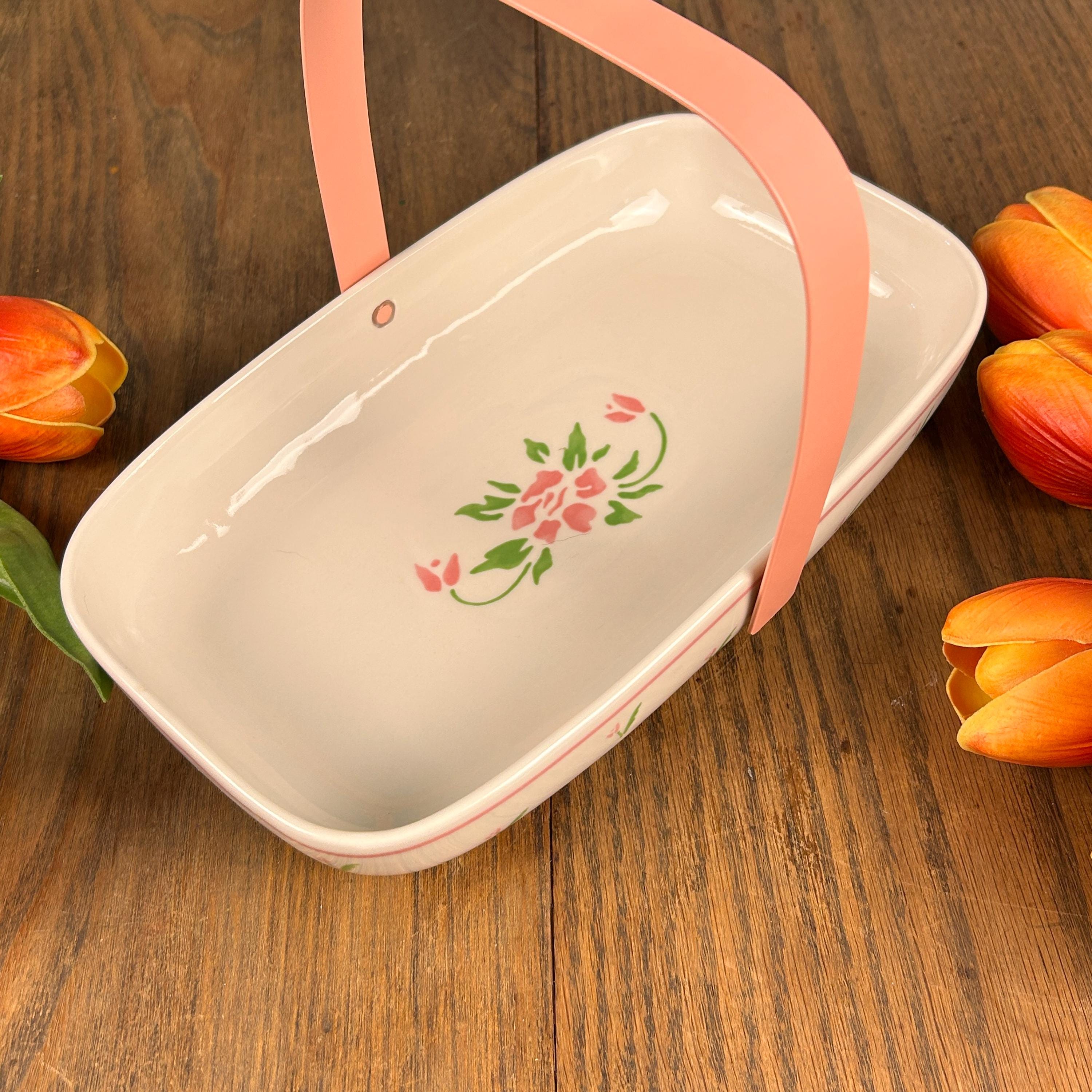 This adorable 1980s vintage Teleflora Planters Basket is simple, yet stunning. Simple pink and green flowers adorn the outside and a small pink and green bouquet sits in the middle of the basket.