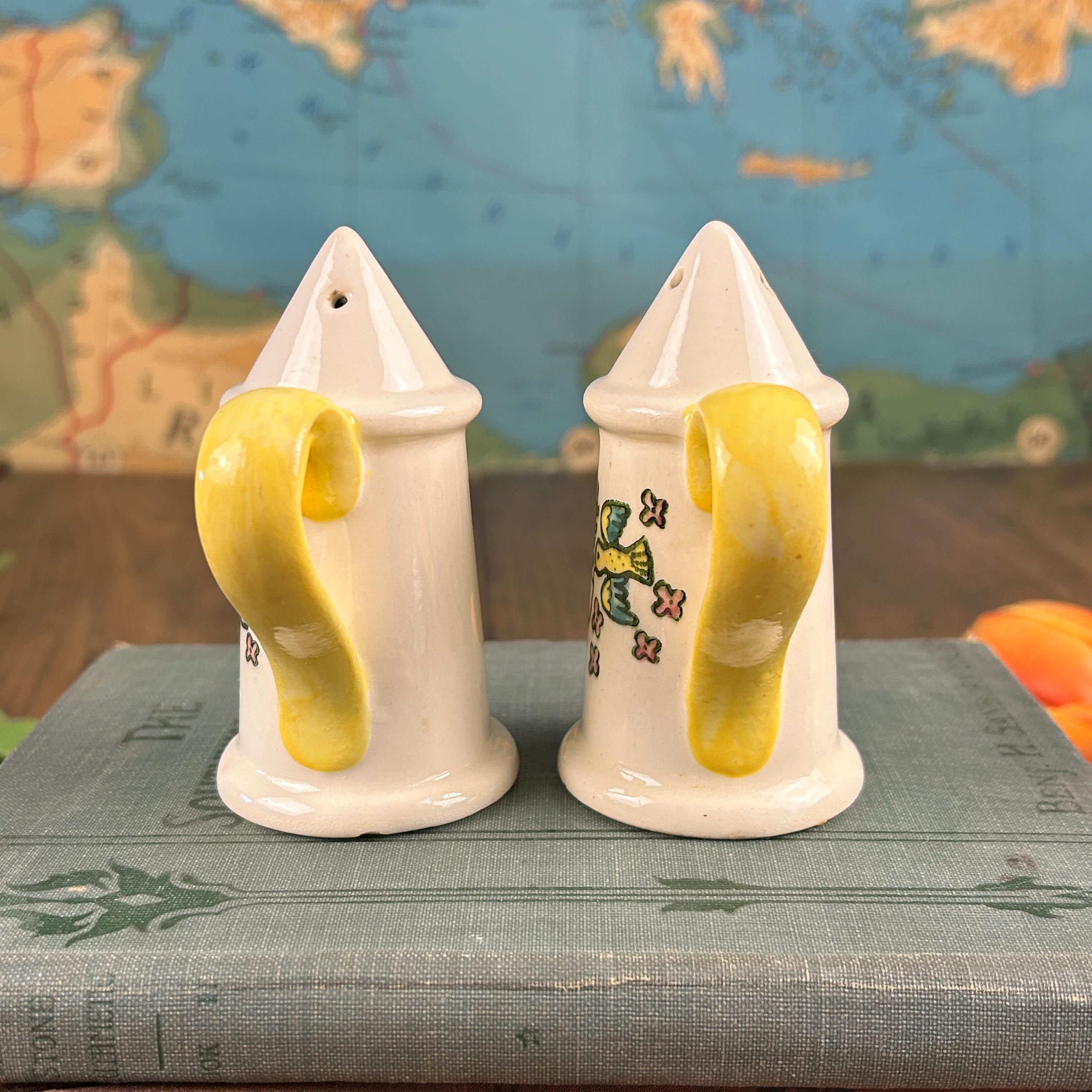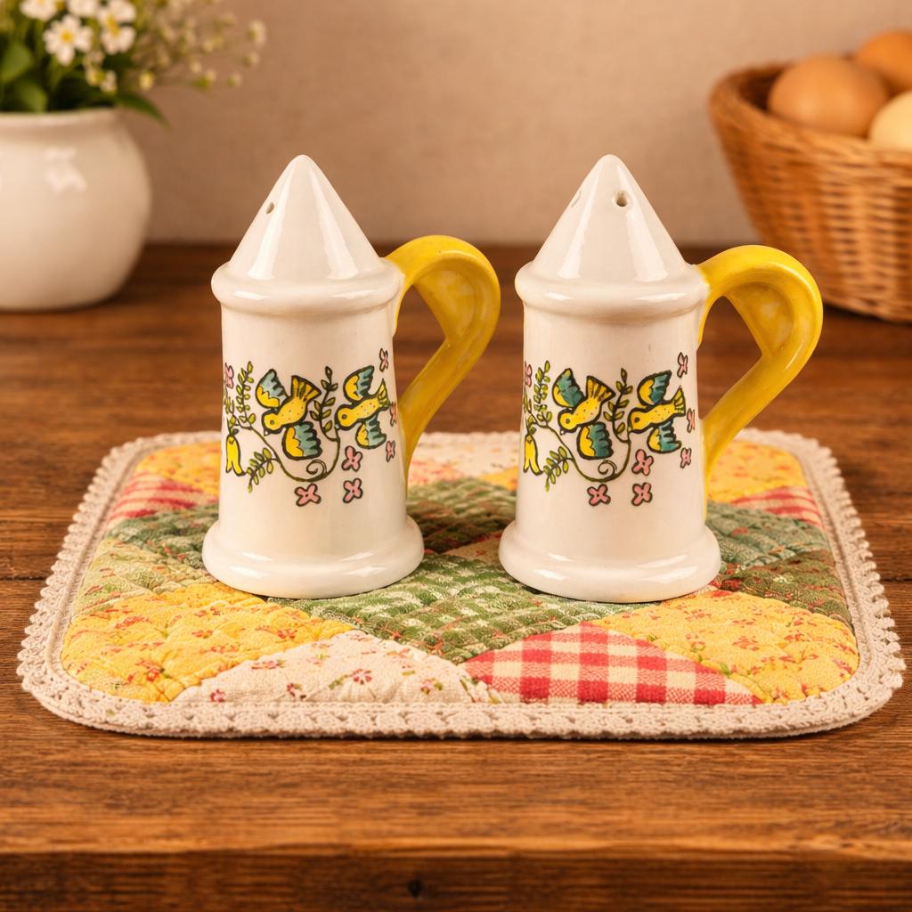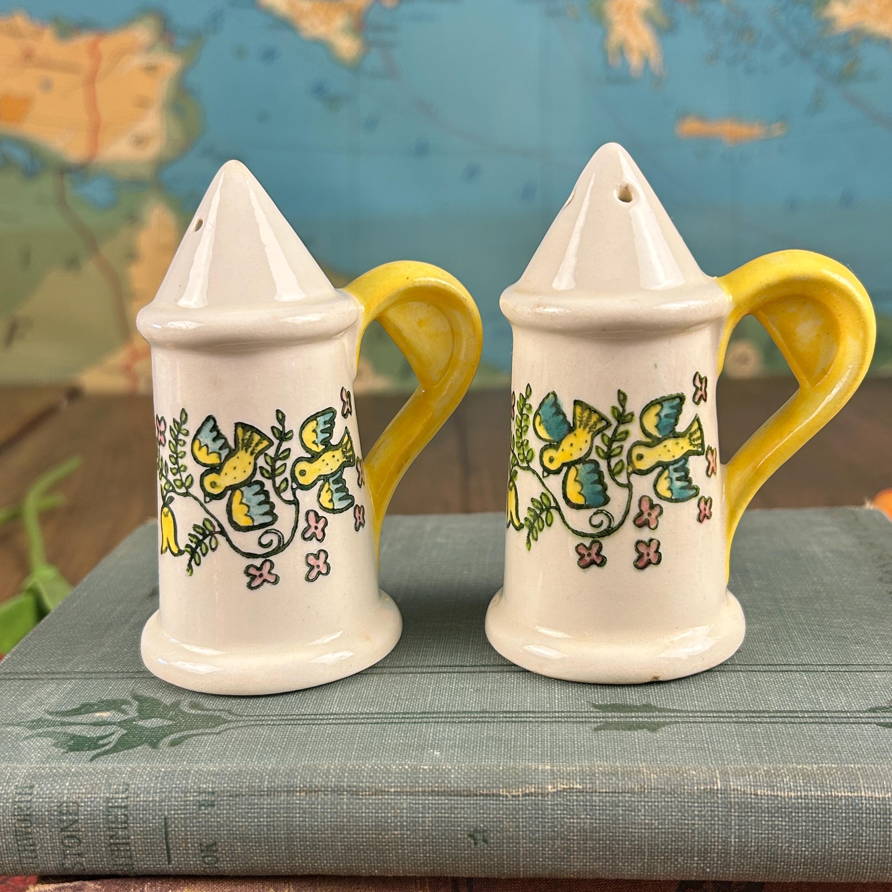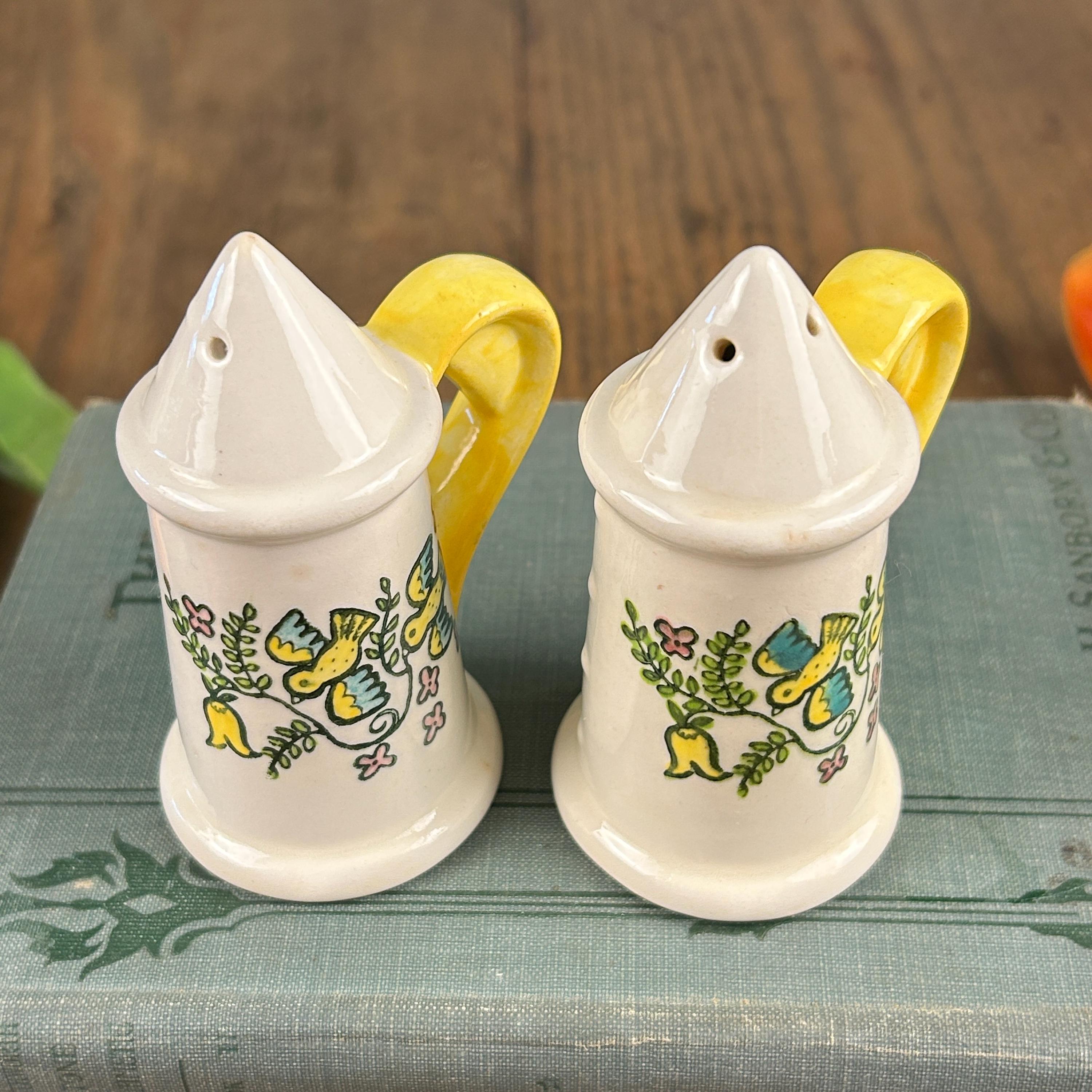 This salt and pepper set has the happiest design and beautiful yellow handles! Little birds and flowers in yellow, green, blue, and pink. Very unique handles as well. They measure 3 3/4" tall and 2" in diameter. The side look they have been 'buttoned up' with little white dots and a "seam".