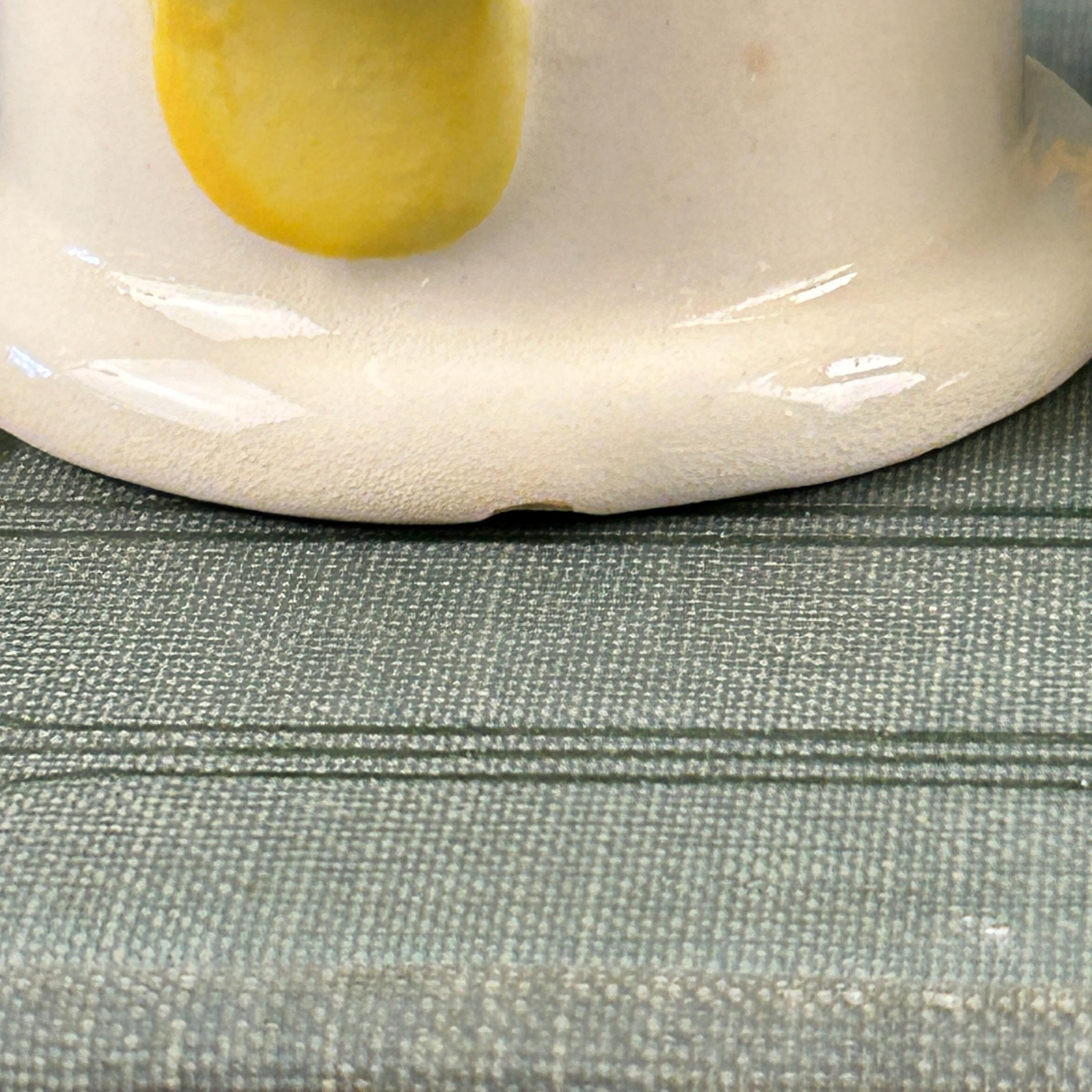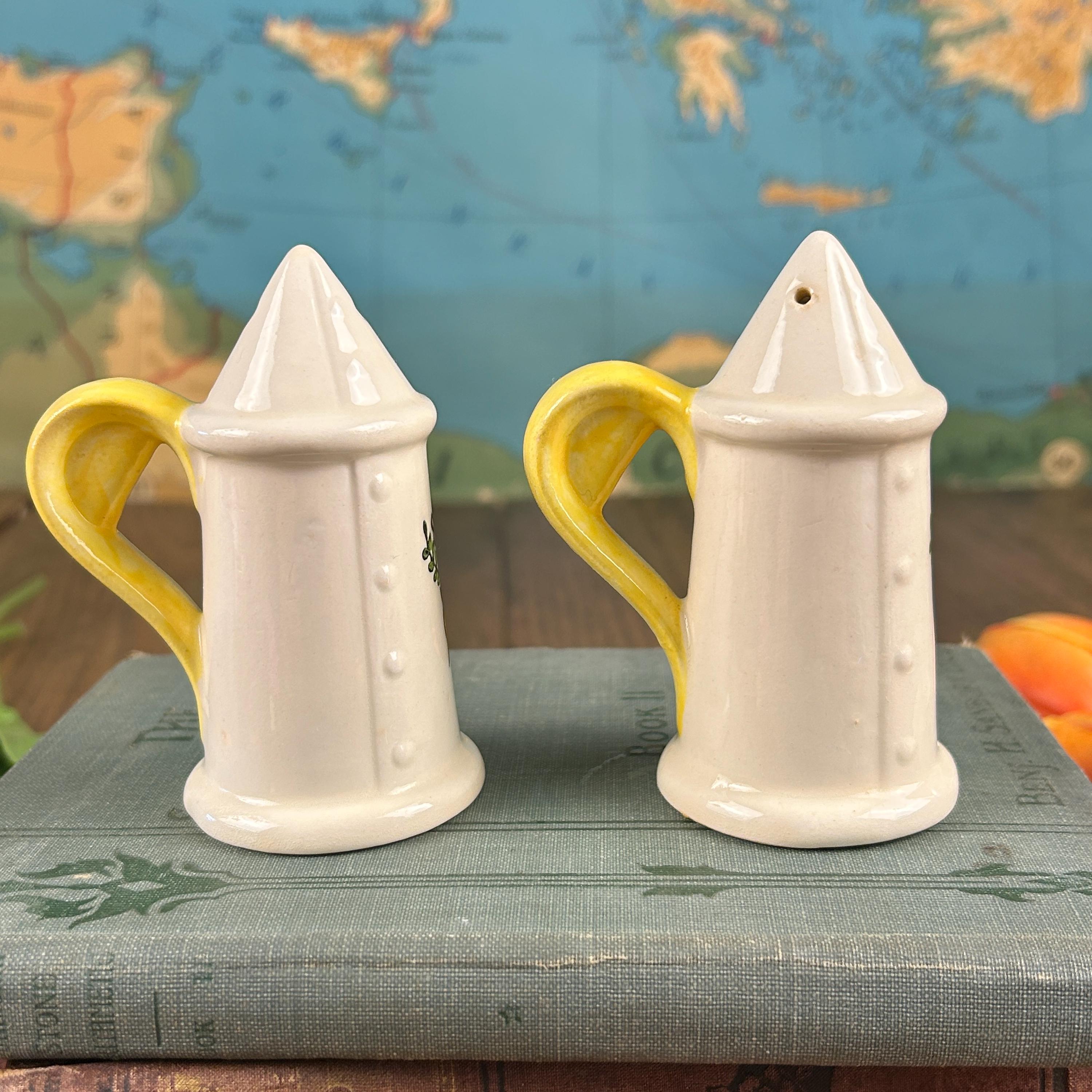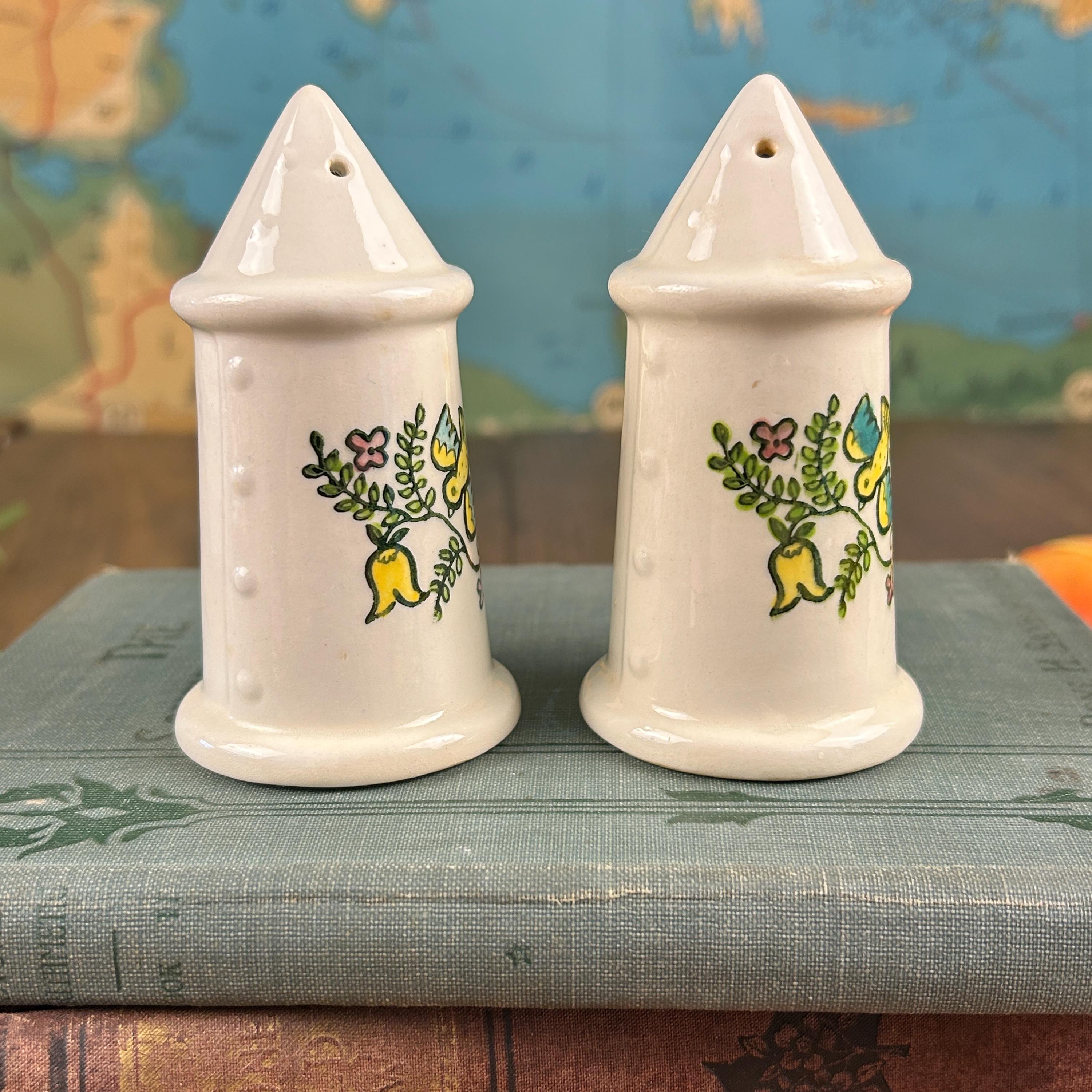 This salt and pepper set has the happiest design and beautiful yellow handles! Little birds and flowers in yellow, green, blue, and pink. Very unique handles as well. They measure 3 3/4" tall and 2" in diameter. The side look they have been 'buttoned up' with little white dots and a "seam".