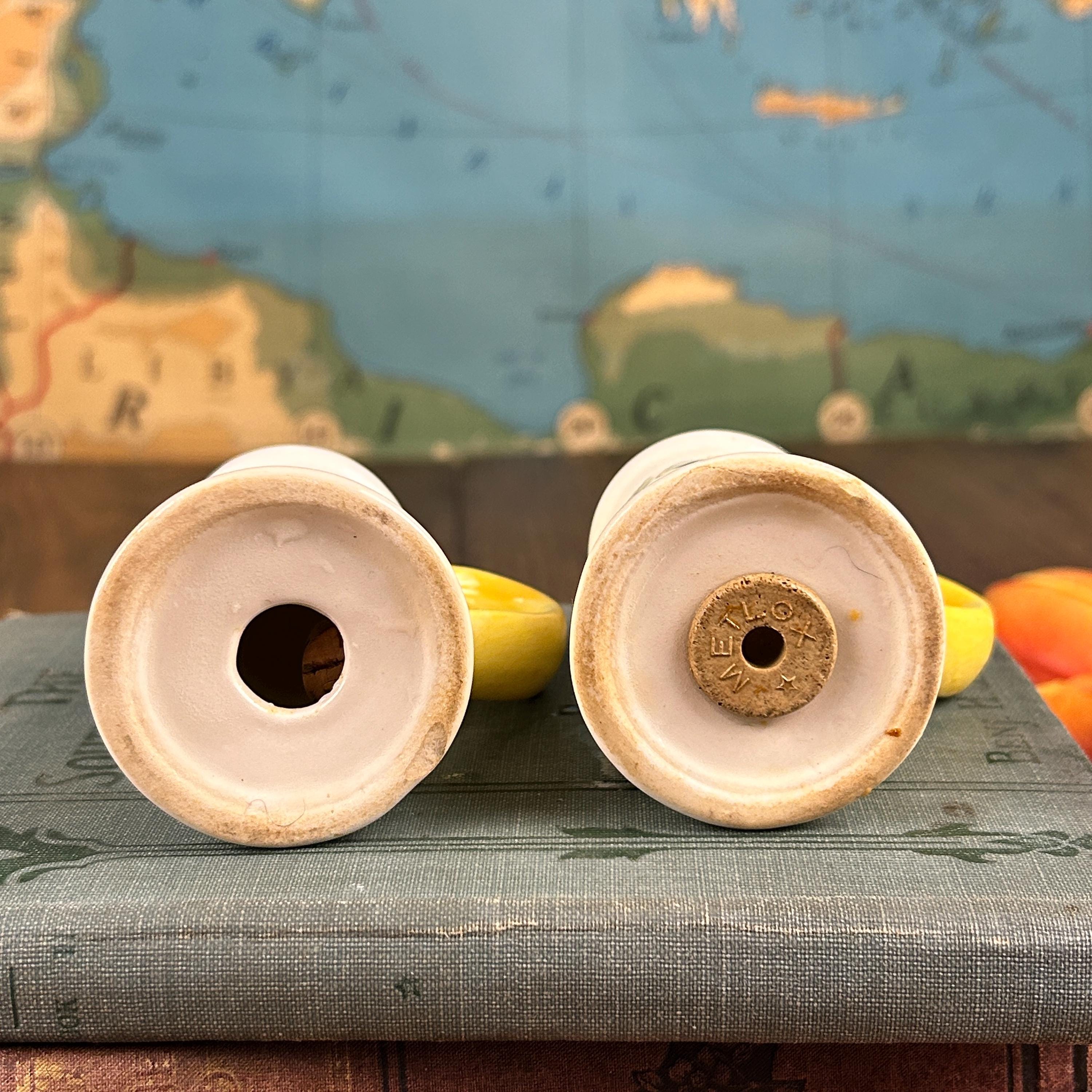 These are in excellent vintage condition with no chips or cracks or crazing. There is one small cihp on the bottom of one shaker. Barely noticeable, Please see all photos. The pepper shaker has two holes and the salt shaker has three holes at the top. Both corks are included, but one is stuck inside the shaker.
