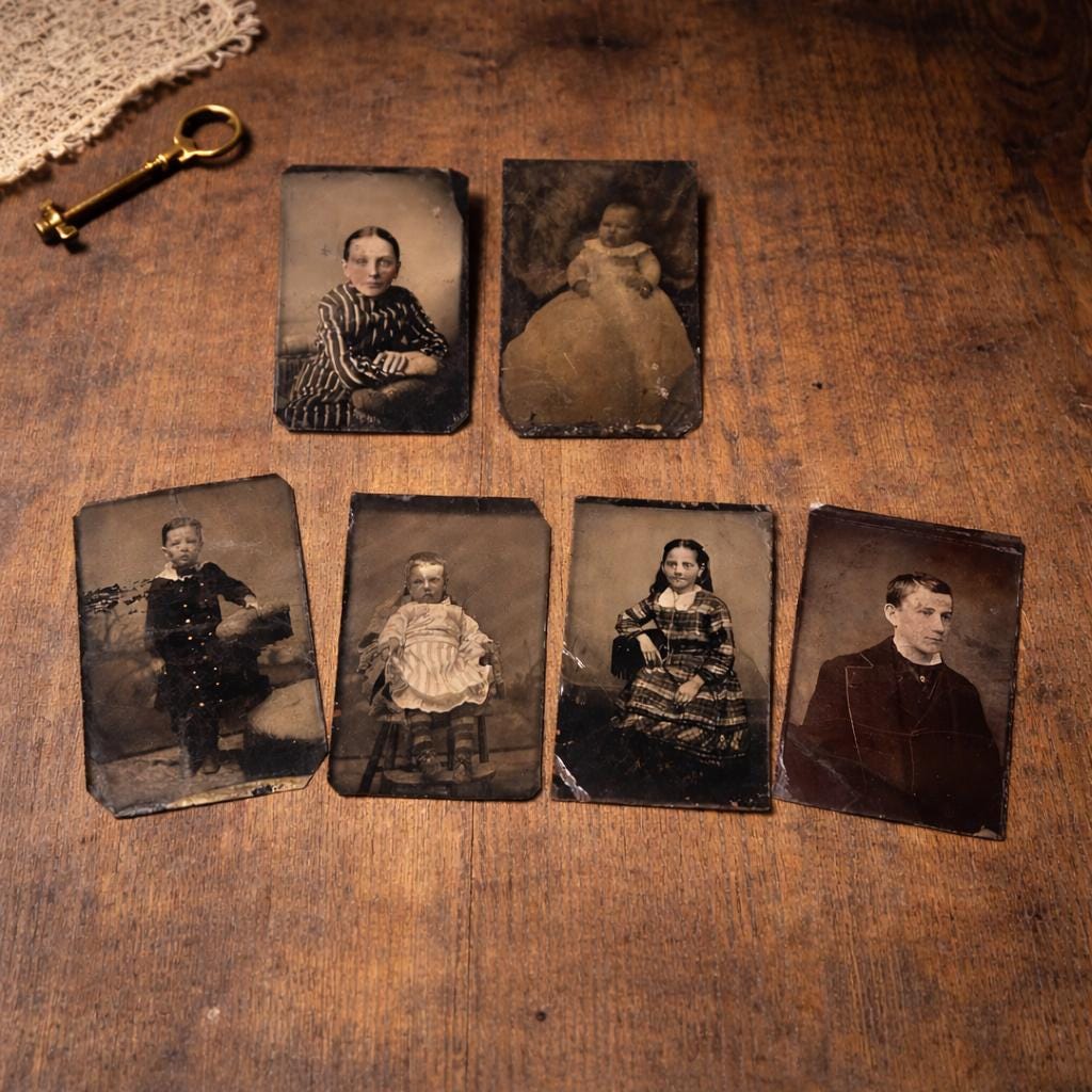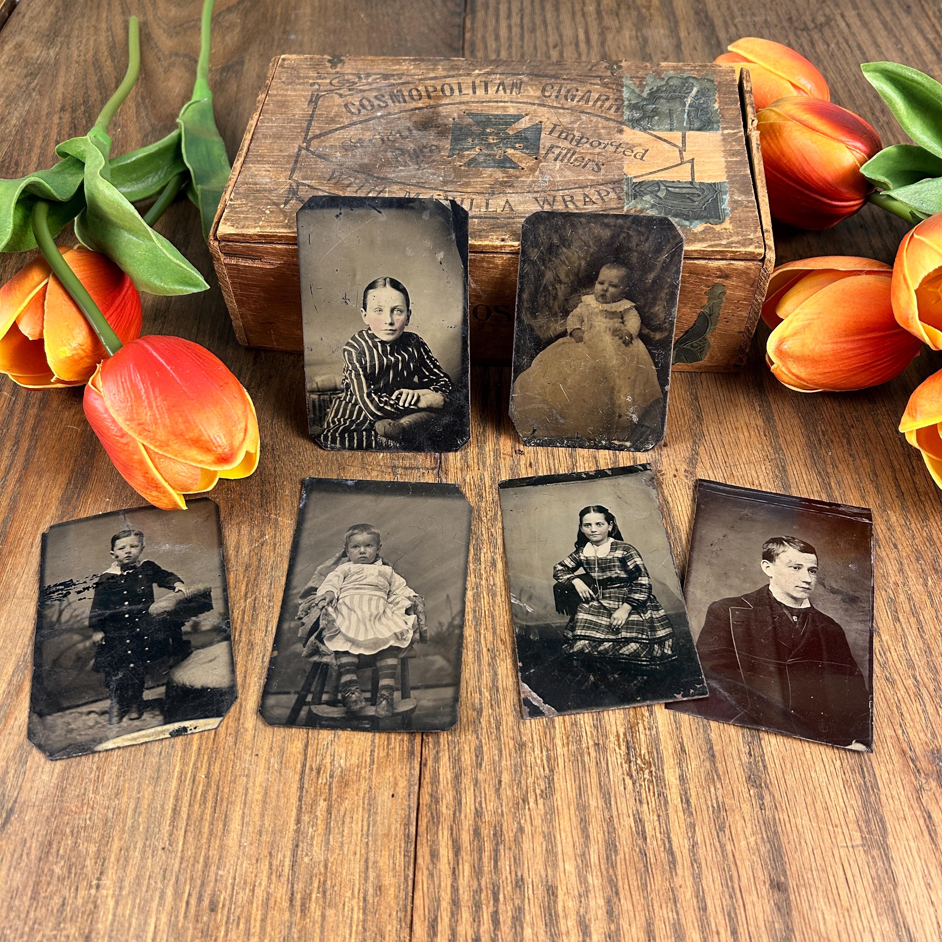 These six tintypes of children will make a stunning display! Dressed to impress and posing for the camera. Some of the children's cheeks have been lightly tinted and are absolutely beautiful.