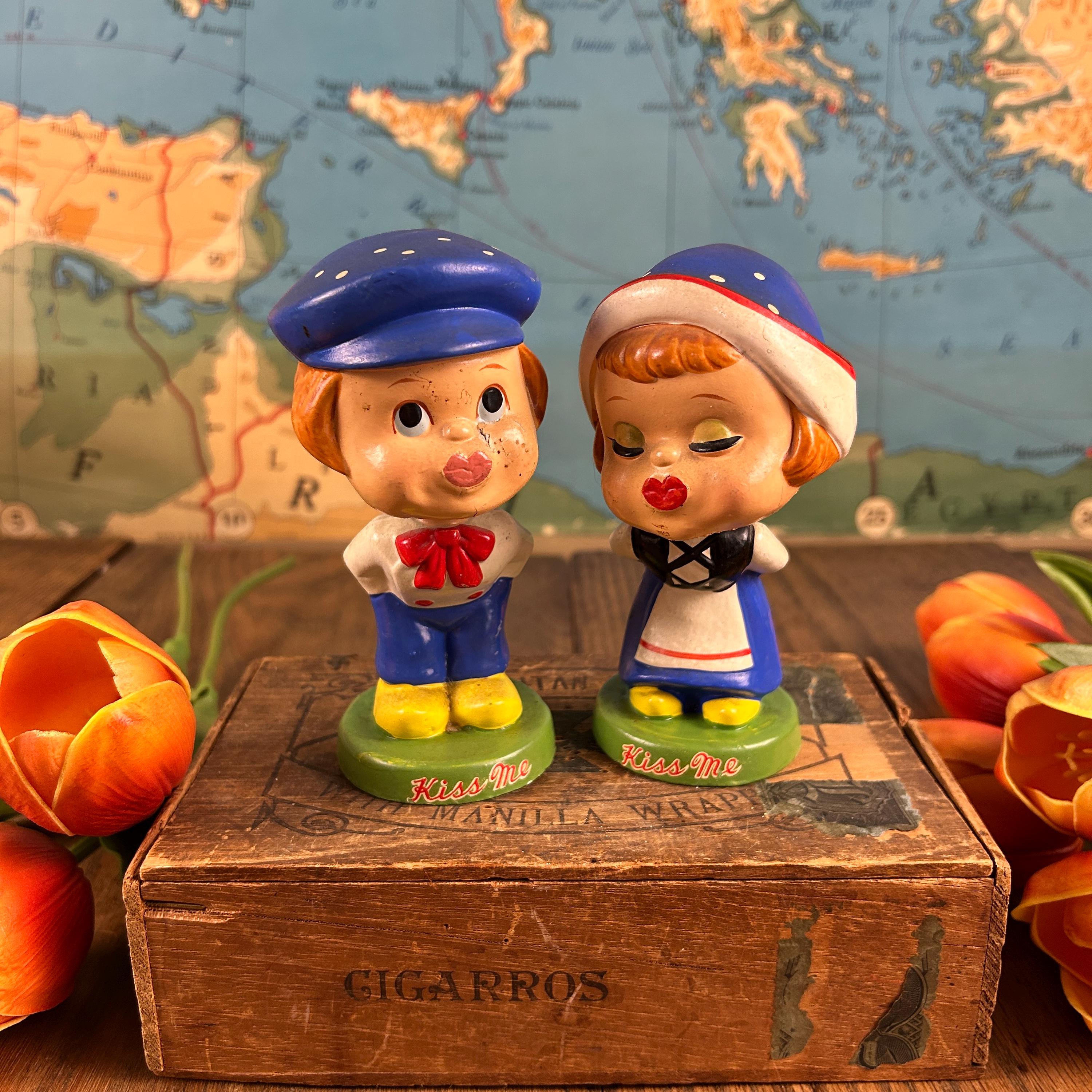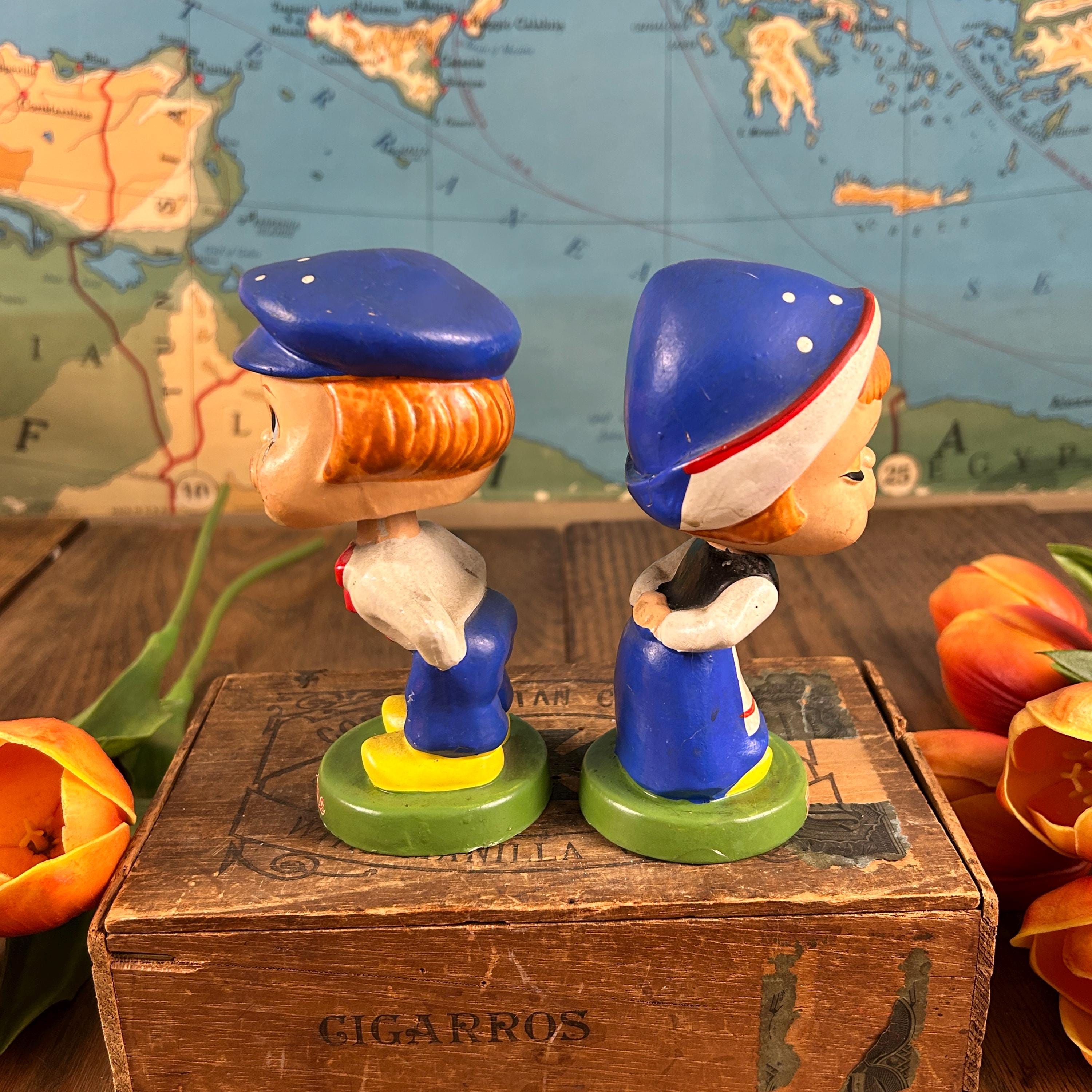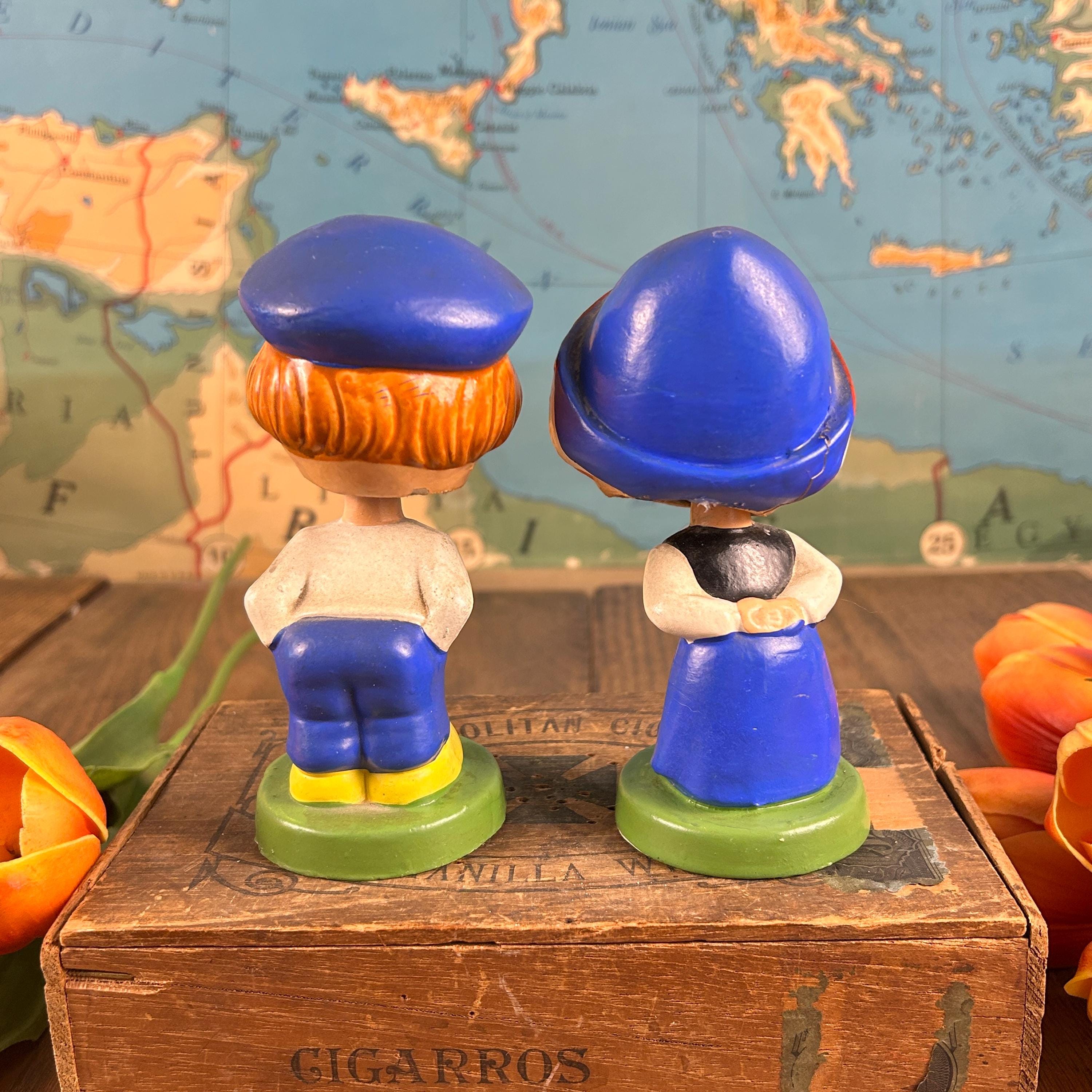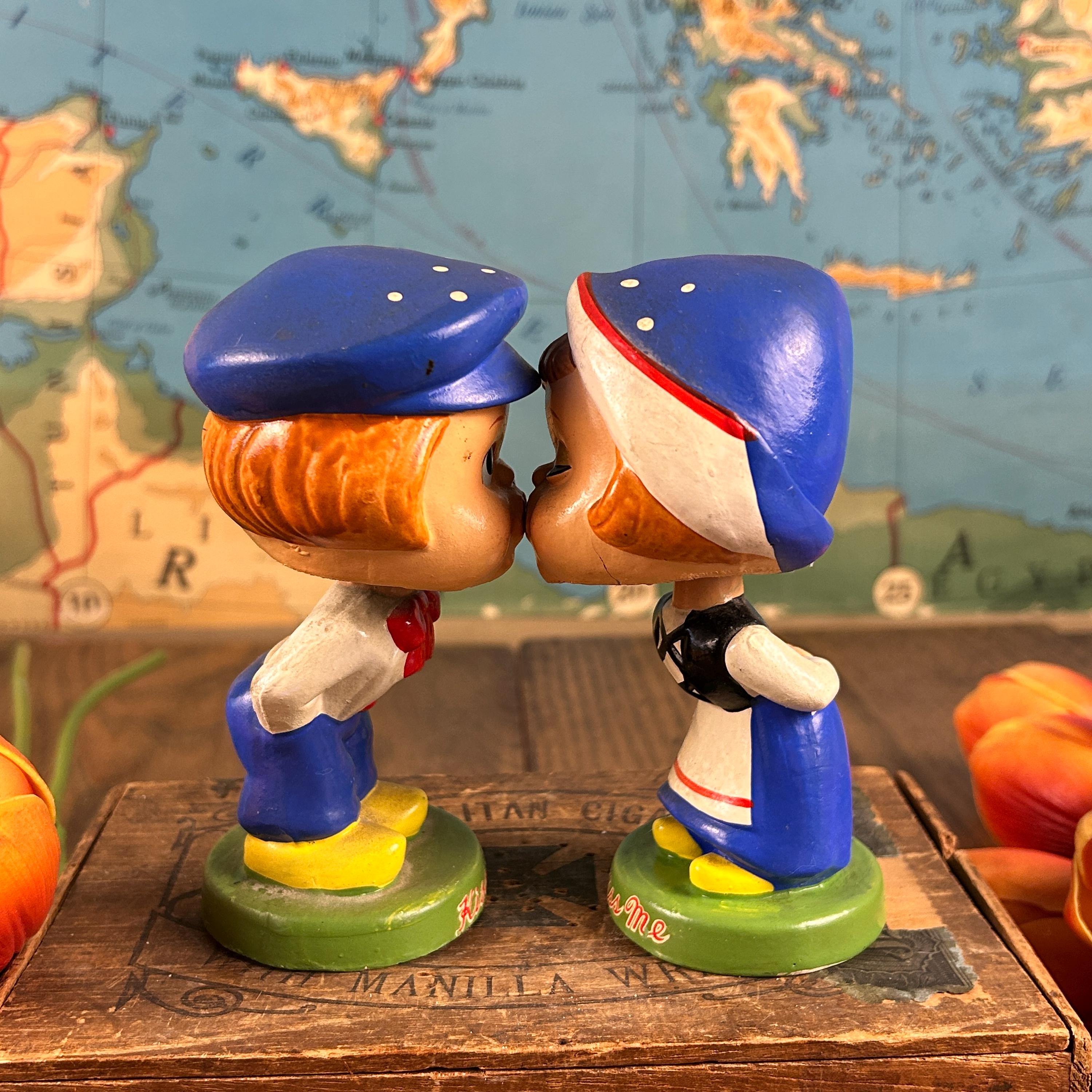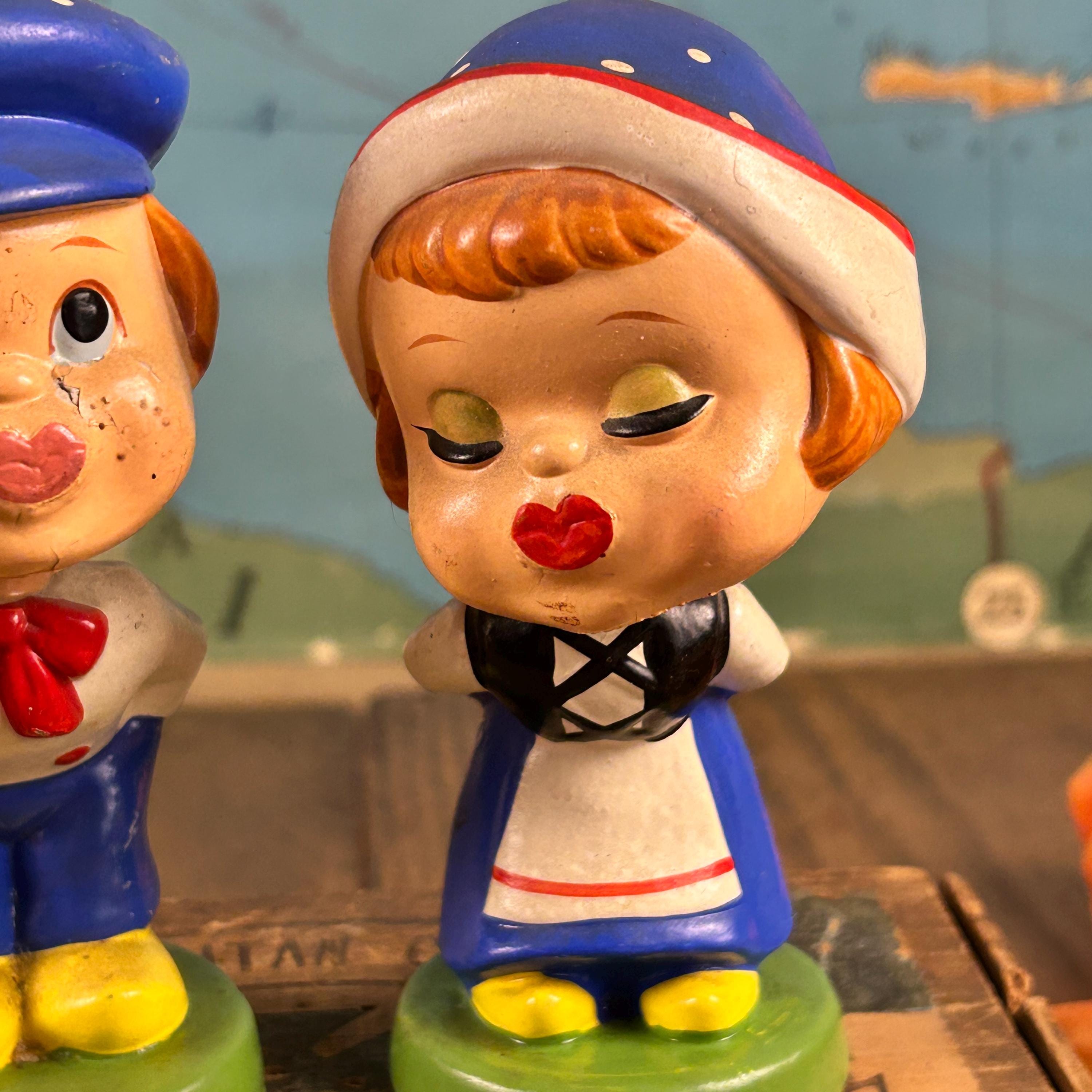 Marked Japan on the bottom of each. Original sticker on bottom of girl. They stand about 5" tall. Nice condition! Strong kissing magnet. Nice bright paint detail and clean! A couple of areas where paint has rubbed off and there is small crack in bottom of girl's hat. Please see all photos for more details!!