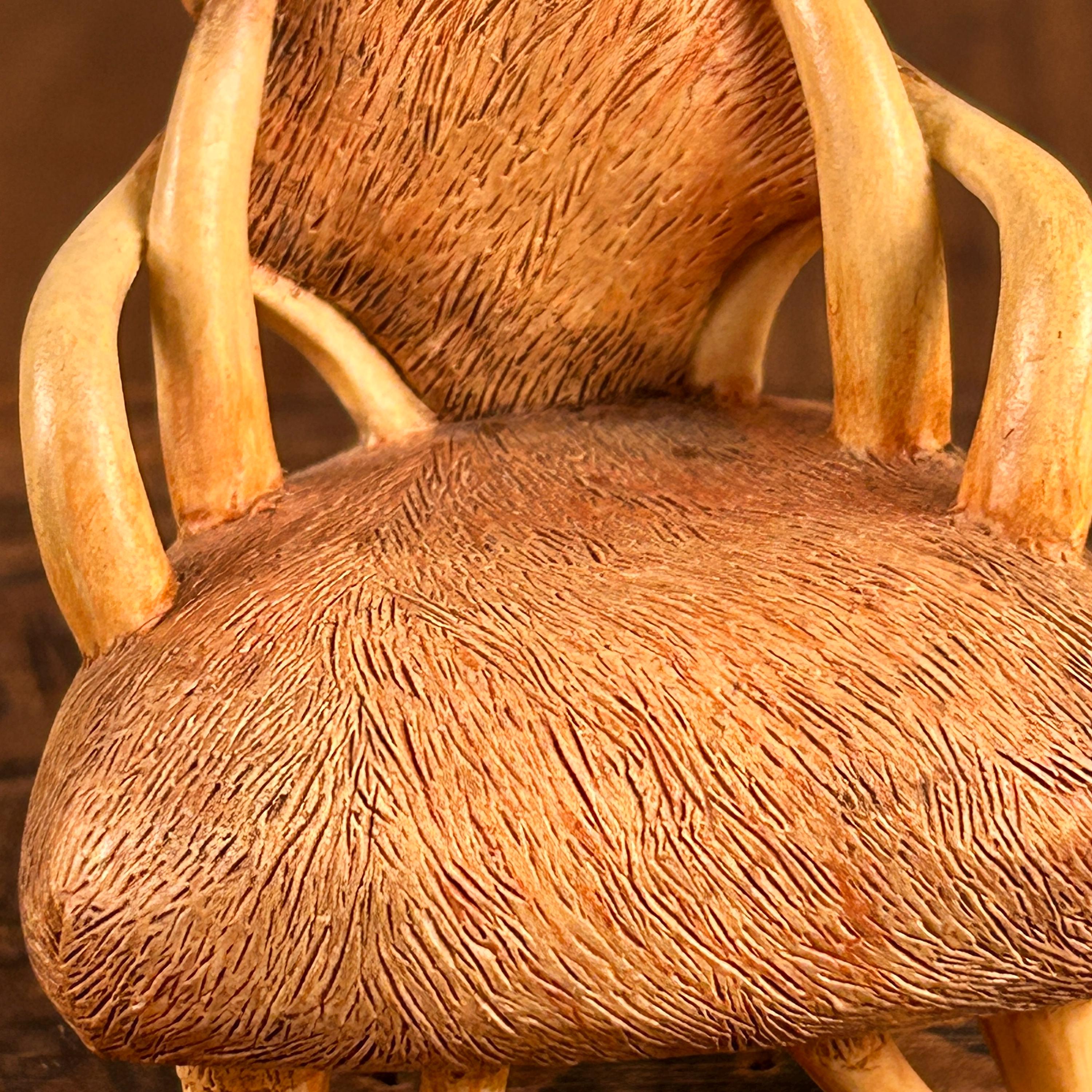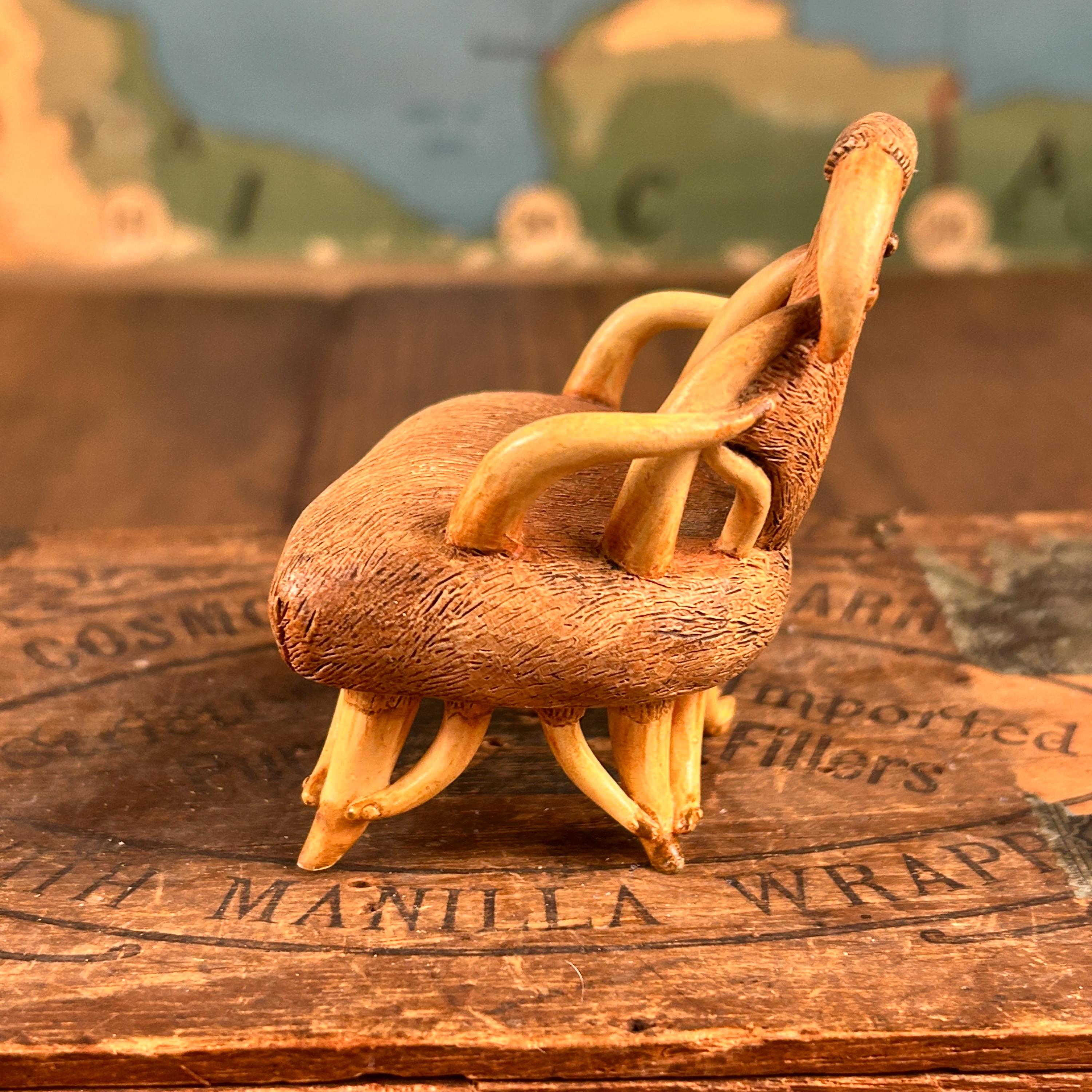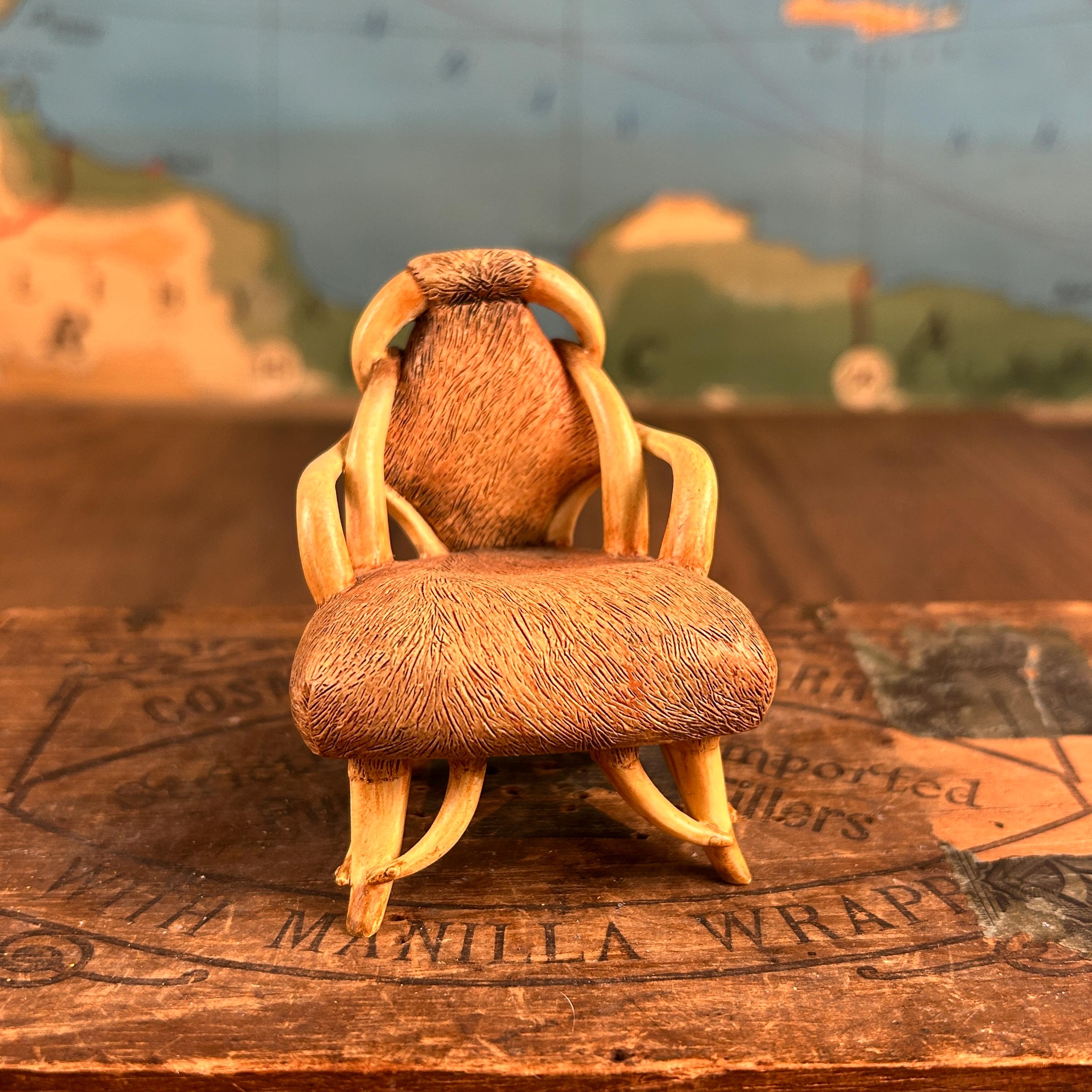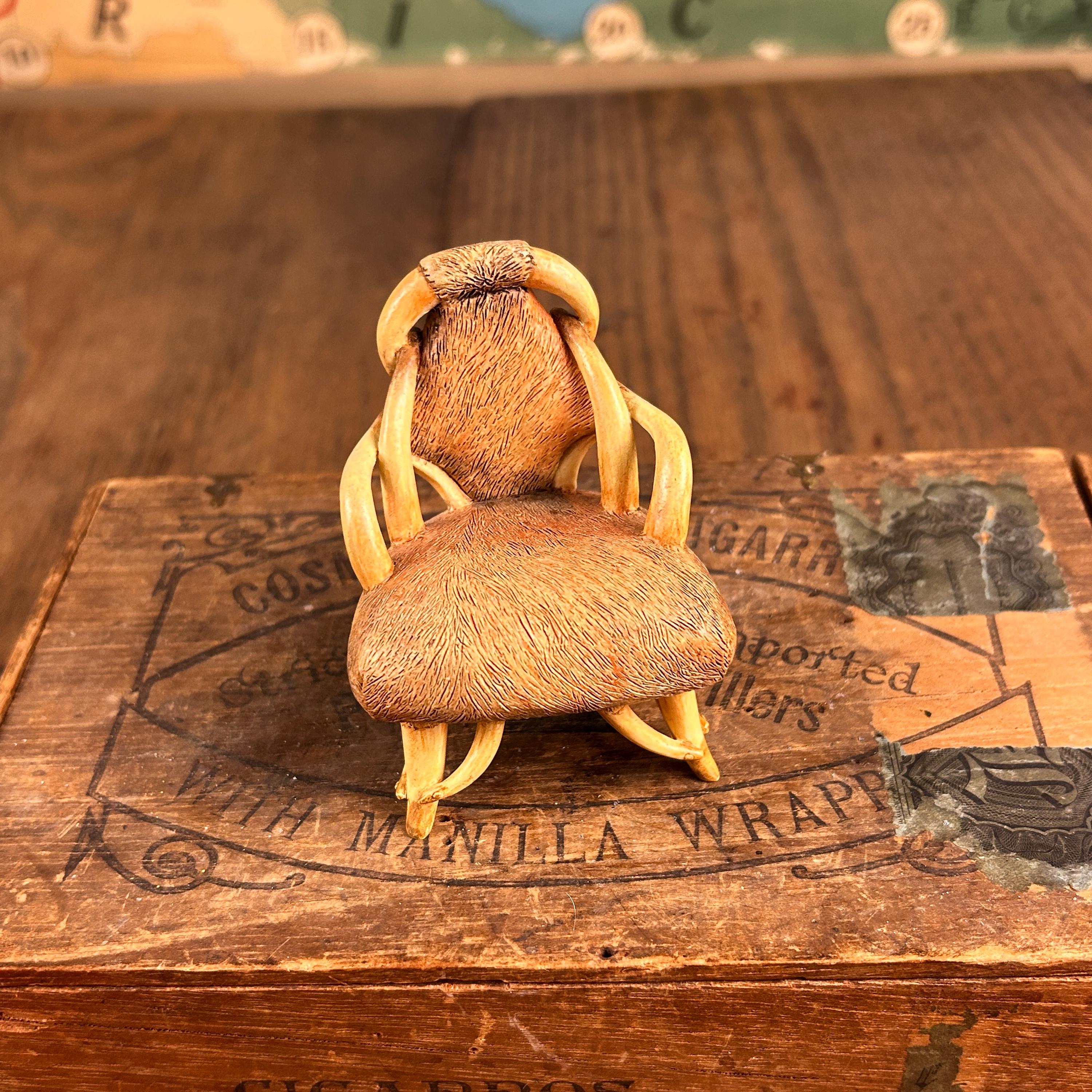 This miniature "Longhorn C.1930" chair from the "Take a Seat" collection by Raine Willitts is a collectible dollhouse miniature made of cast resin. The chair features a unique design with simulated fur and horn-like armrests and legs, giving it a distinctive Western aesthetic. It is made of cast resin.
