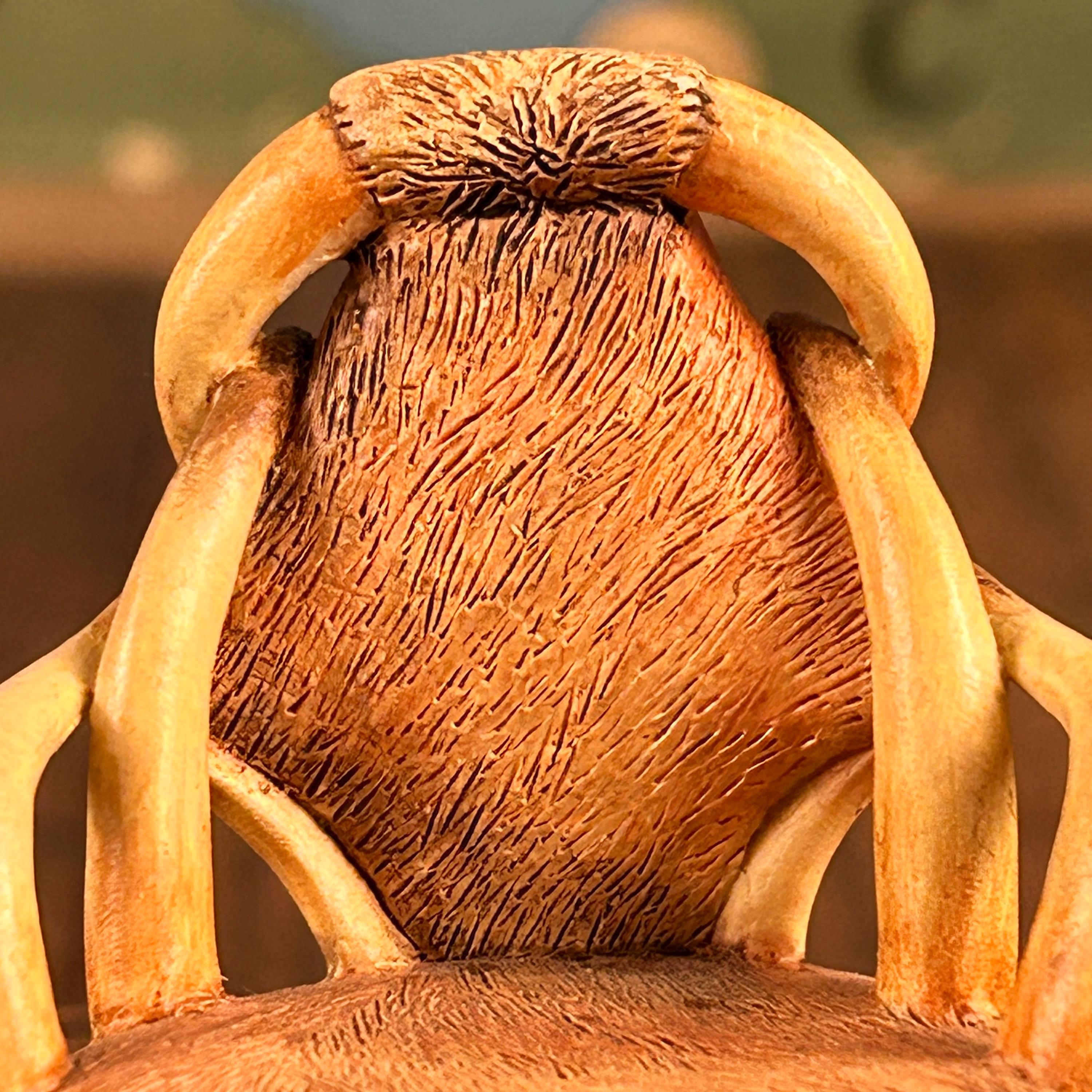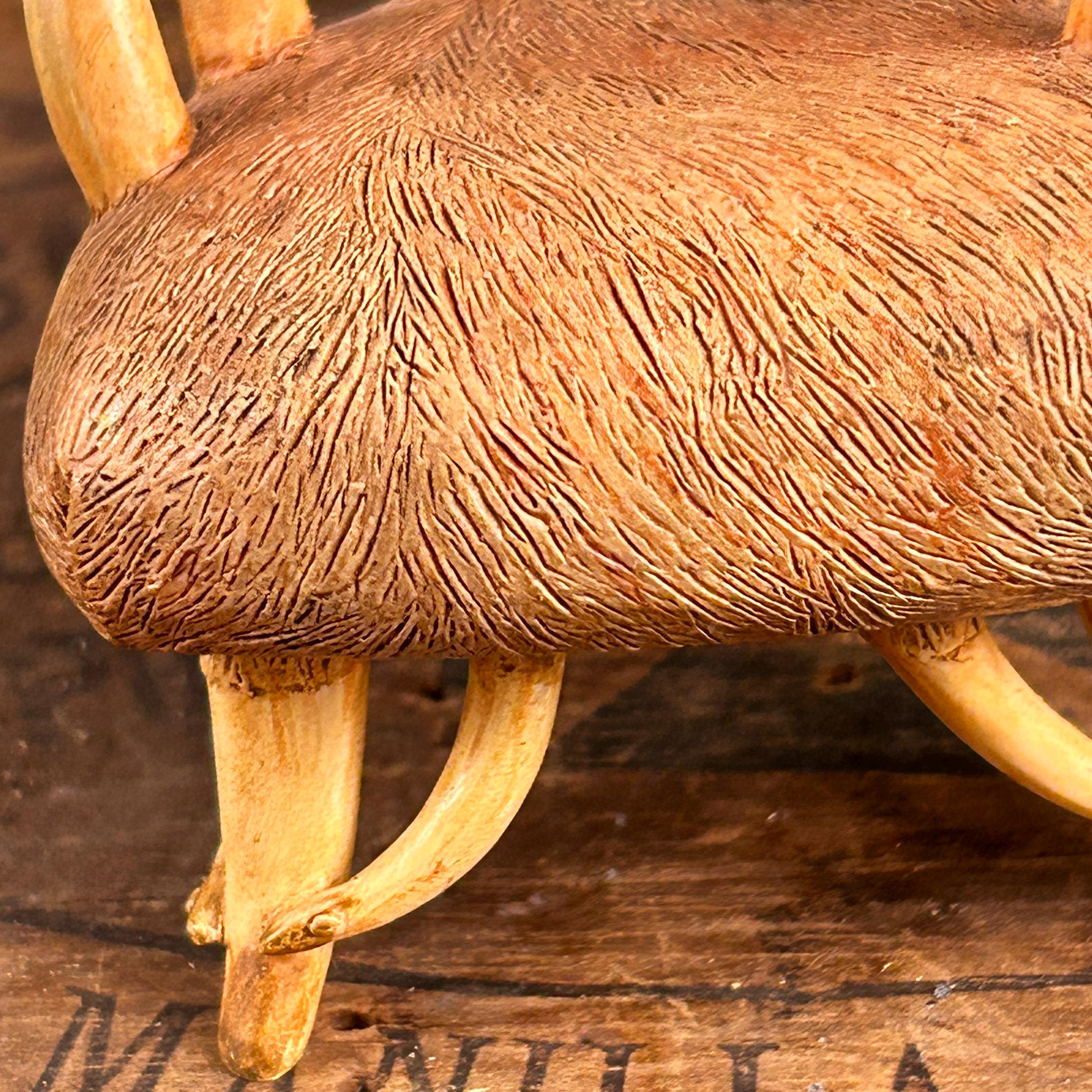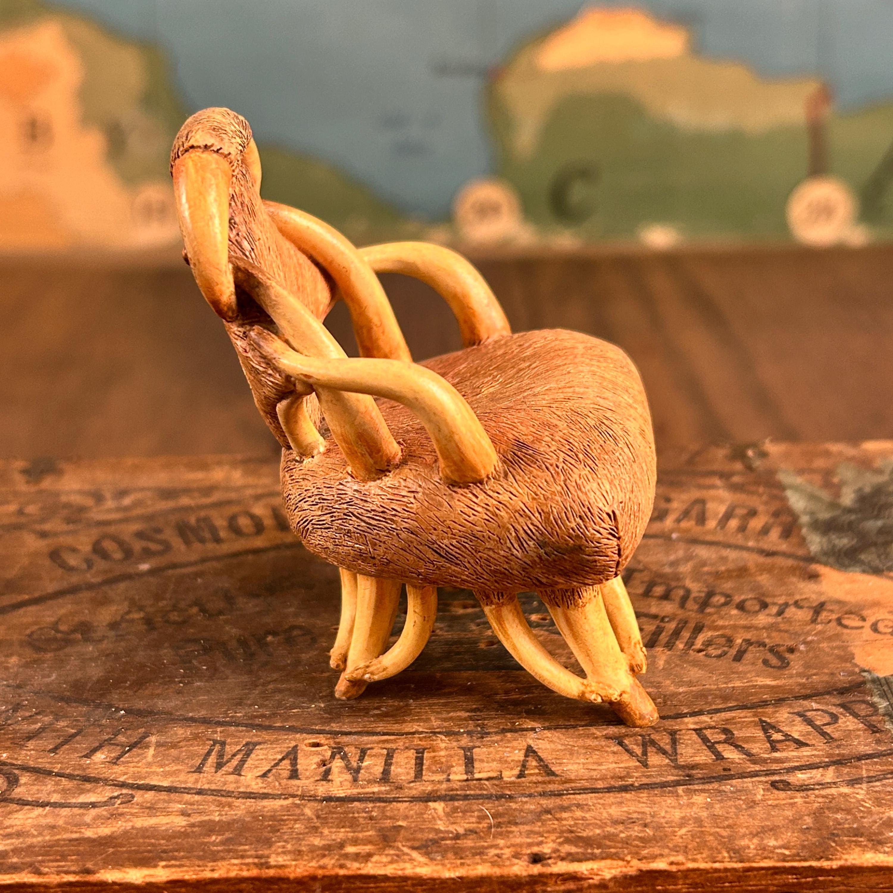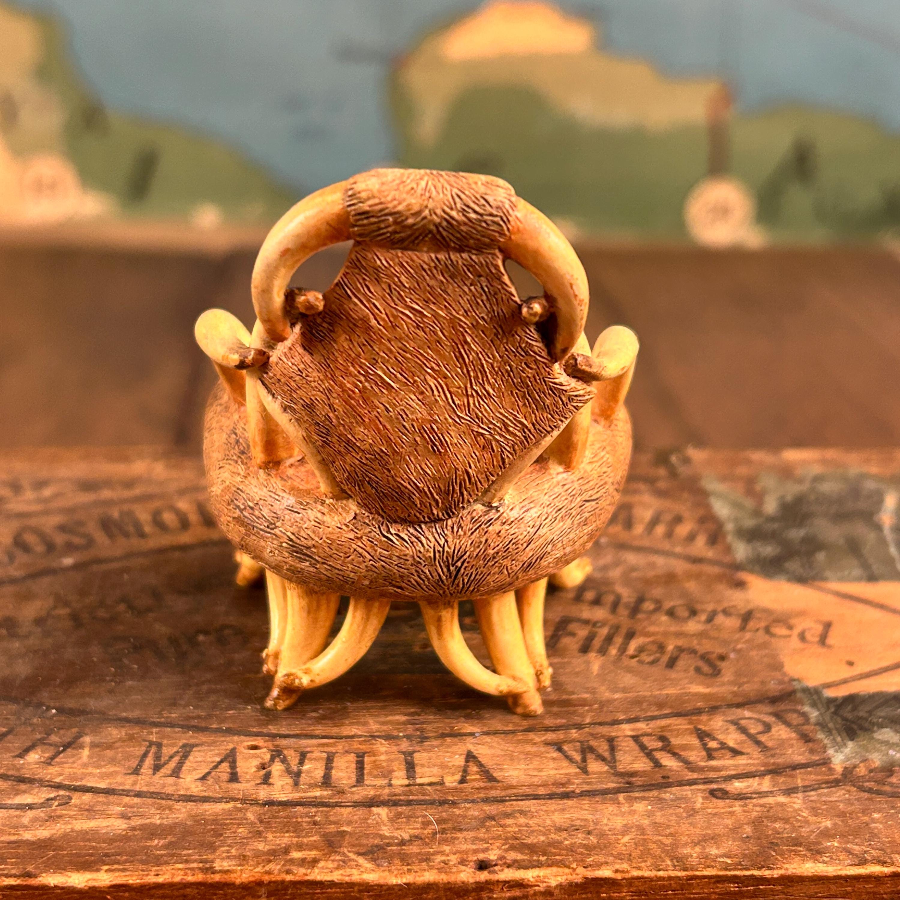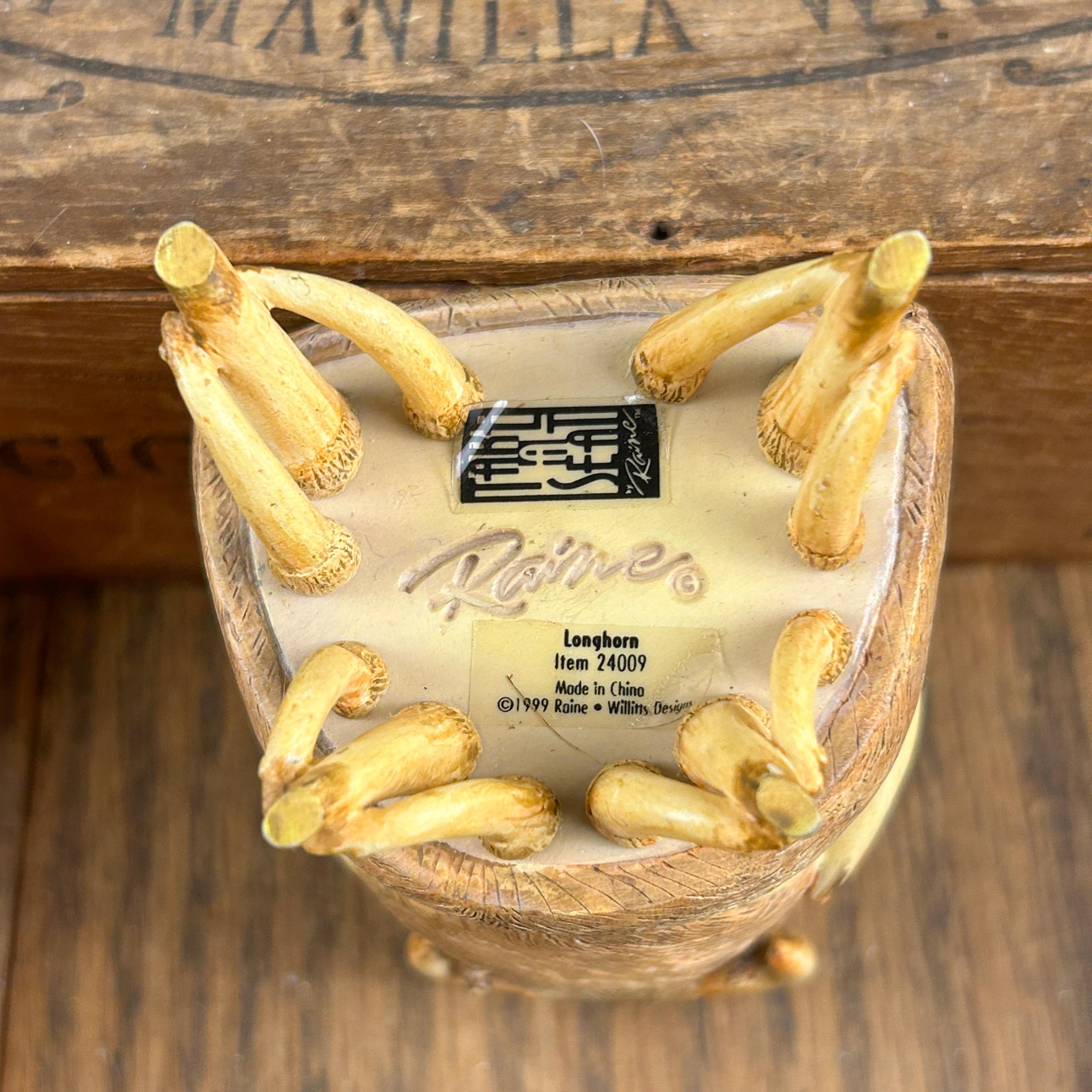 This miniature "Longhorn C.1930" chair from the "Take a Seat" collection by Raine Willitts is a collectible dollhouse miniature made of cast resin. The chair features a unique design with simulated fur and horn-like armrests and legs, giving it a distinctive Western aesthetic. It is made of cast resin.