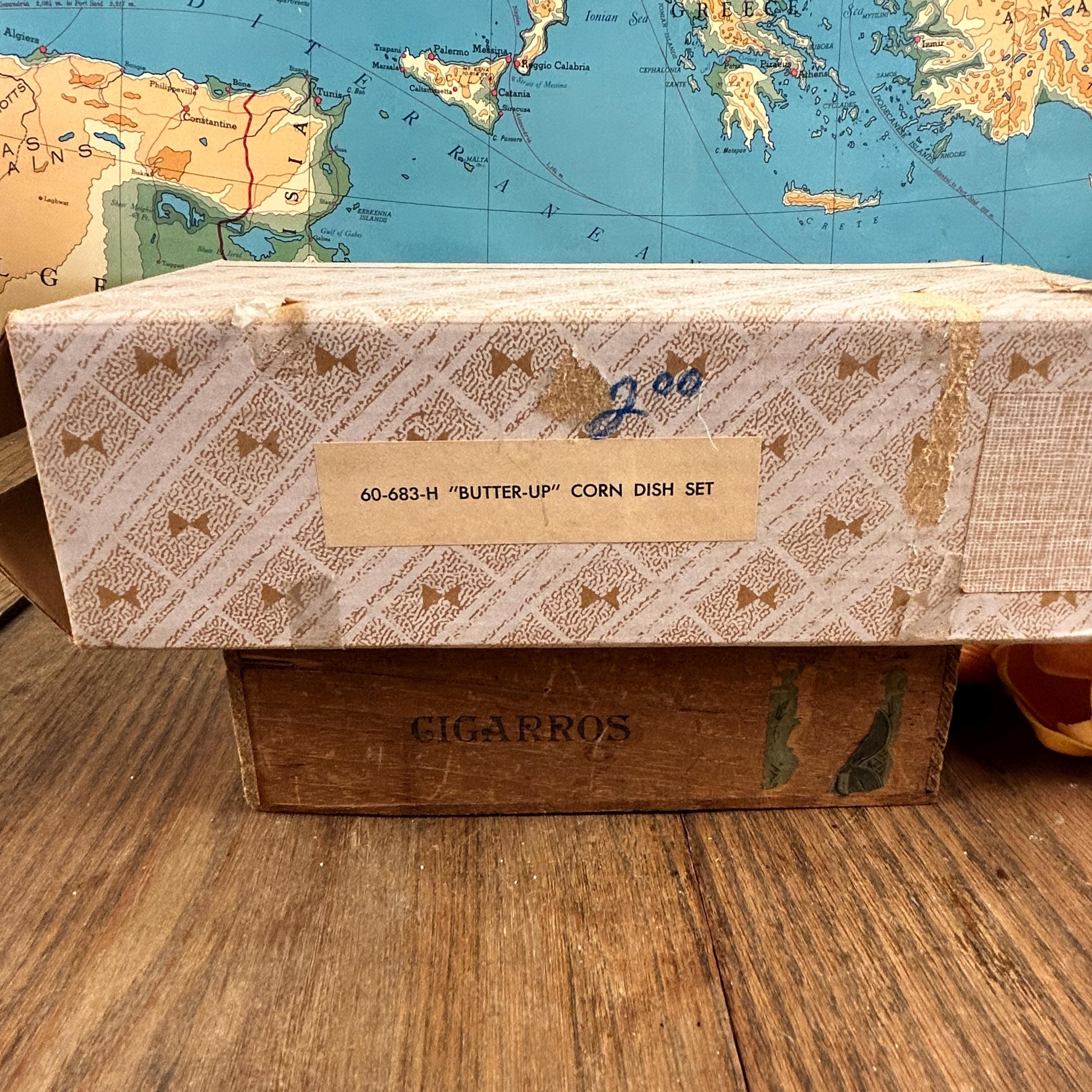 This line was called the "Butter Up" Corn Dish Set. 60-683-H. One of the trays is marked on the back with the Brown & Bigelow logo, Brown & Bigelow, Remembrance Advertising MI 6-4664