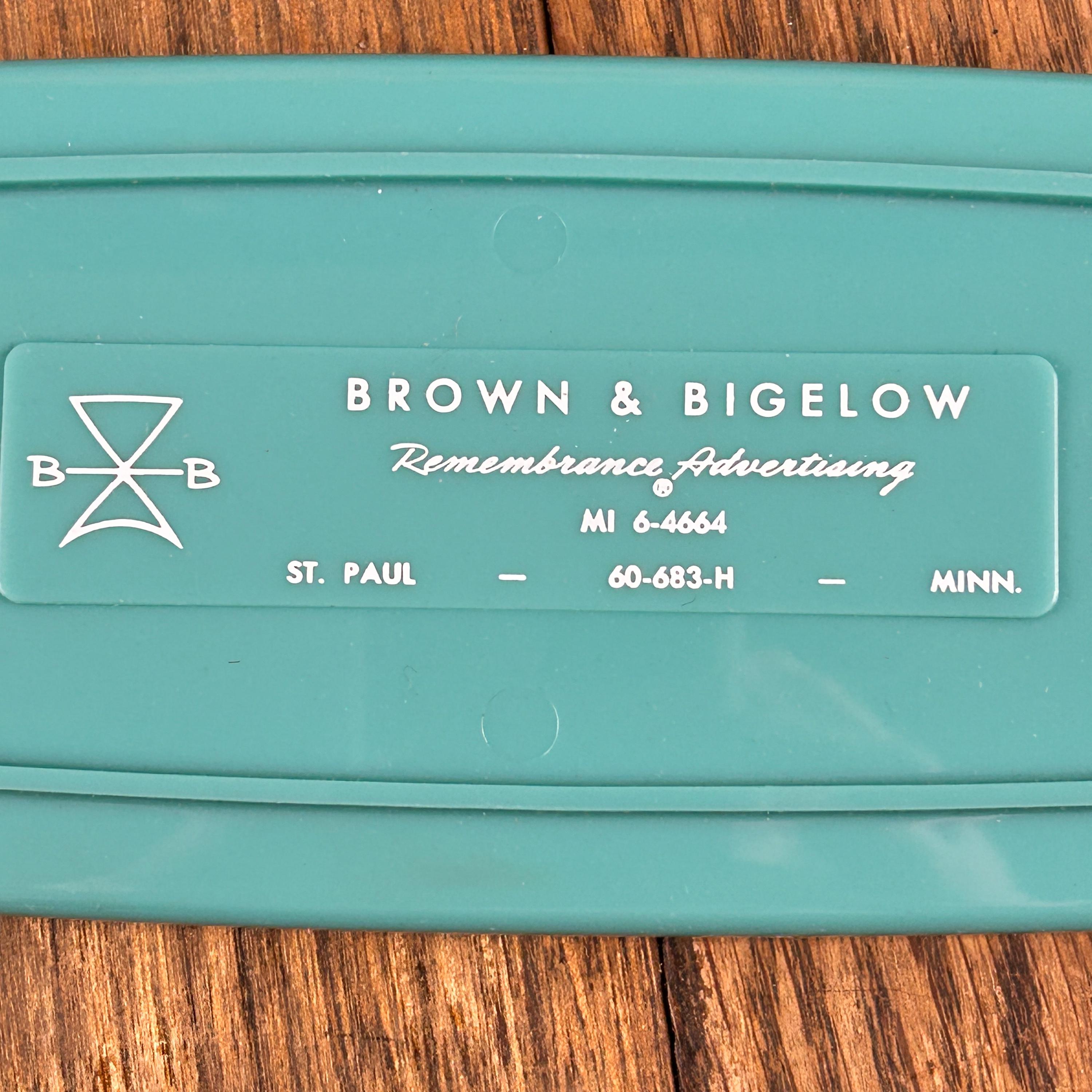 These corn holders were advertising products from Brown & Bigelow, founded in 1896 by Herbert Huse Bigelow and Hiram Brown. B&B has a long and diverse history, primarily in the promotional products and advertising specialty industry. The company initially focused on printing calendars, later expanding into other advertising items, playing cards, and even developing convict rehabilitation programs.