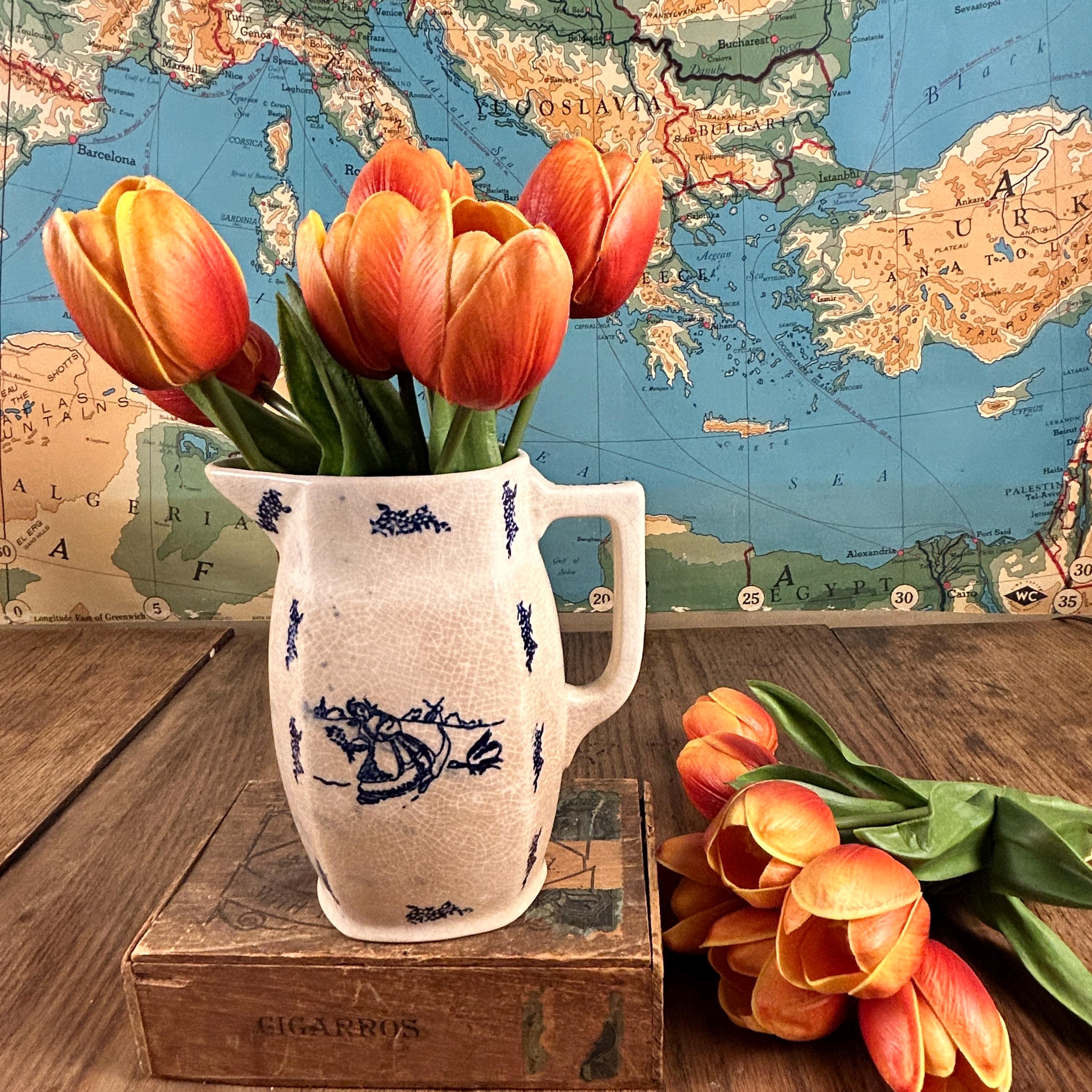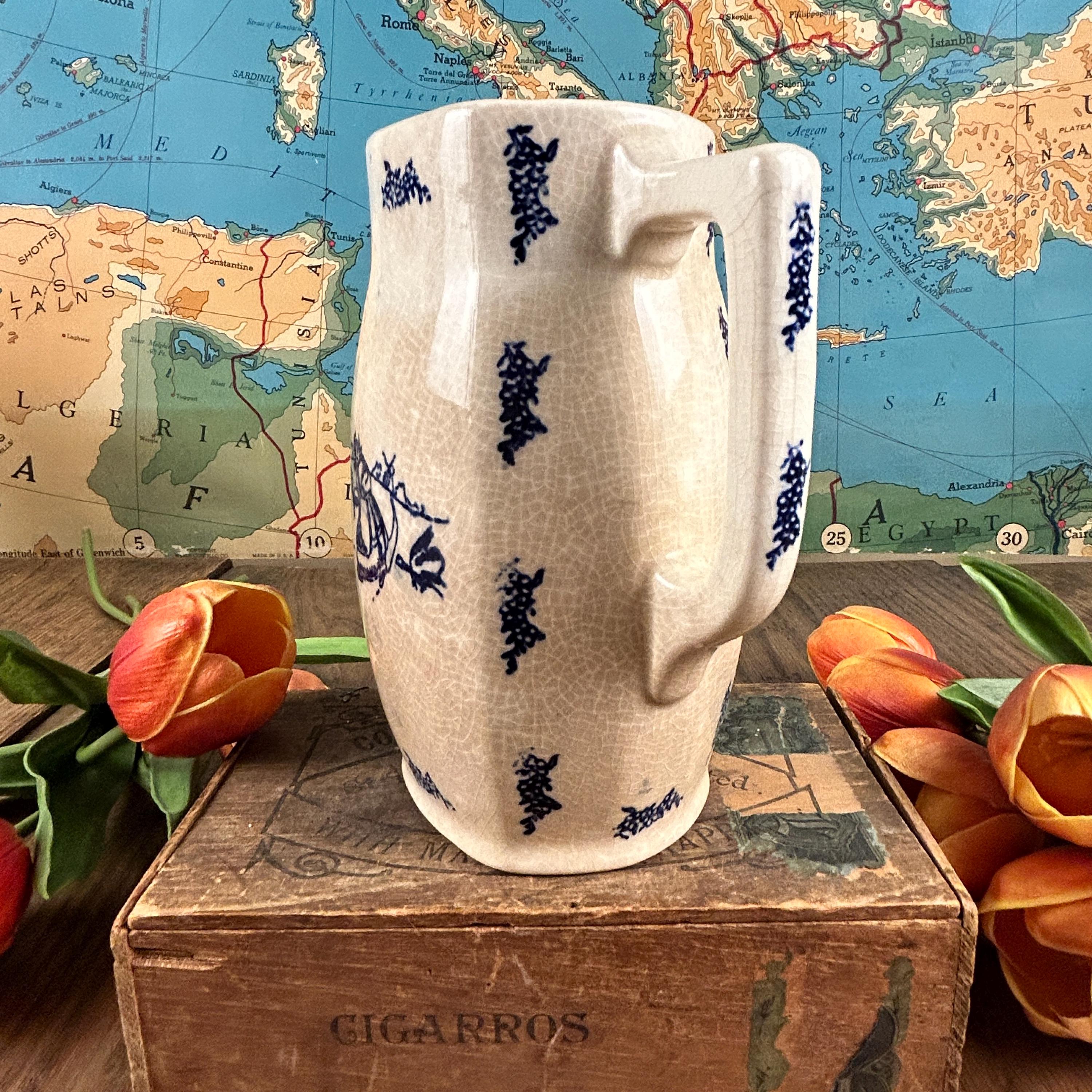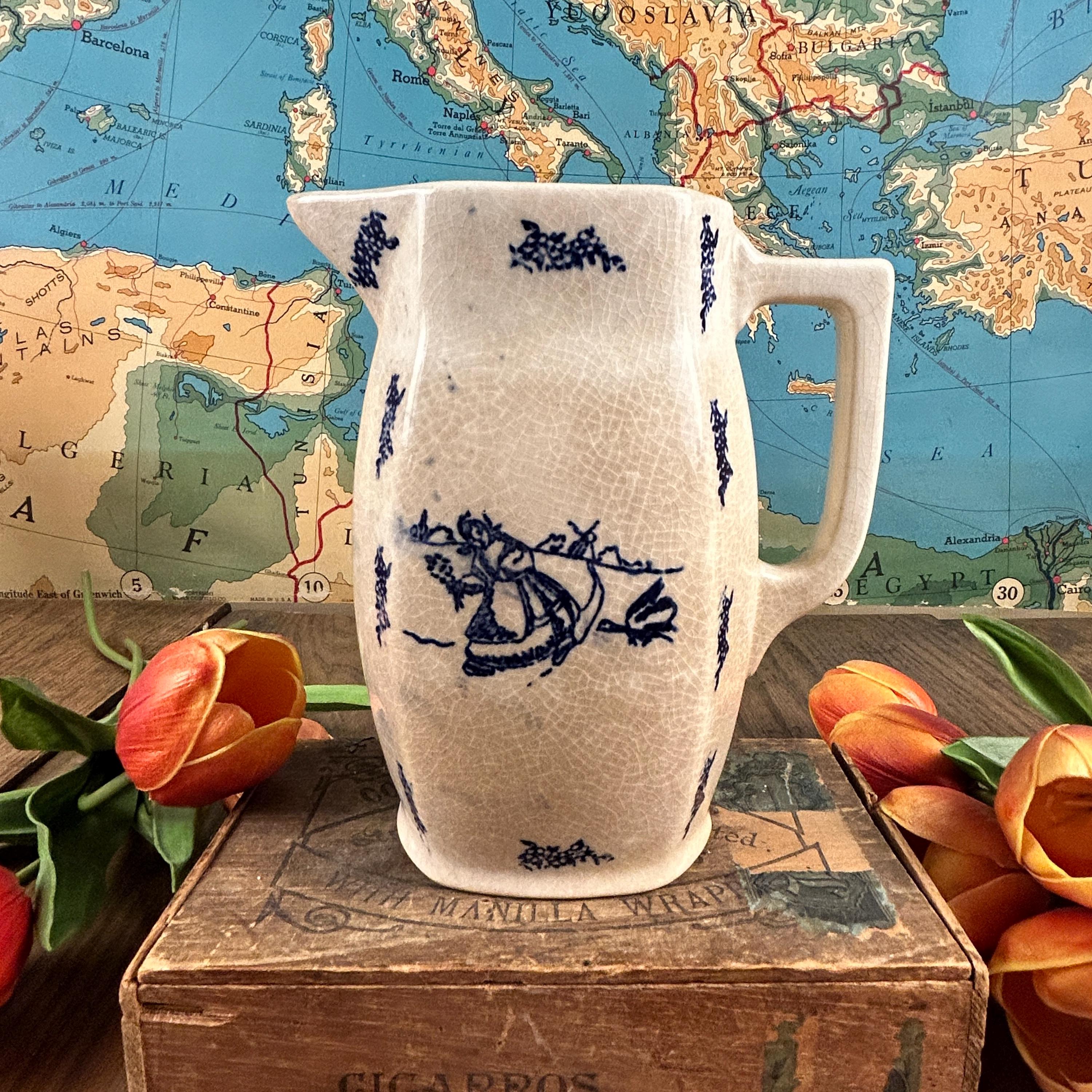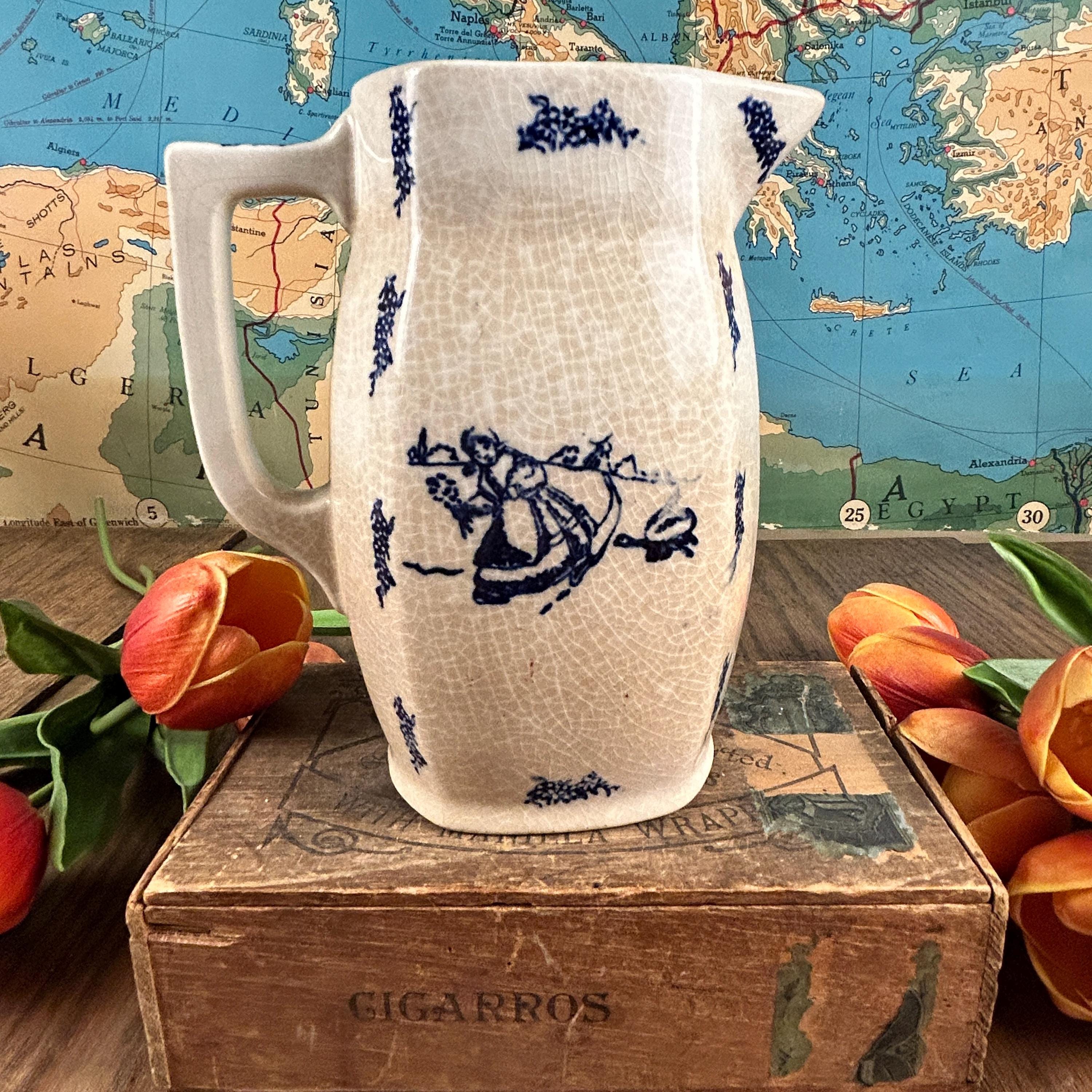 A simple, blue and white Dutch style transferware pitcher. This delicate painted scene depicts a girl collecting flowers in a field and being chased by a goose, with windmills in the distant background. This vintage ironstone milk pitcher has moderate crazing, consistent with its age and an authentic feature of vintage ironstone. We find the crazing to be one of its endearing features.