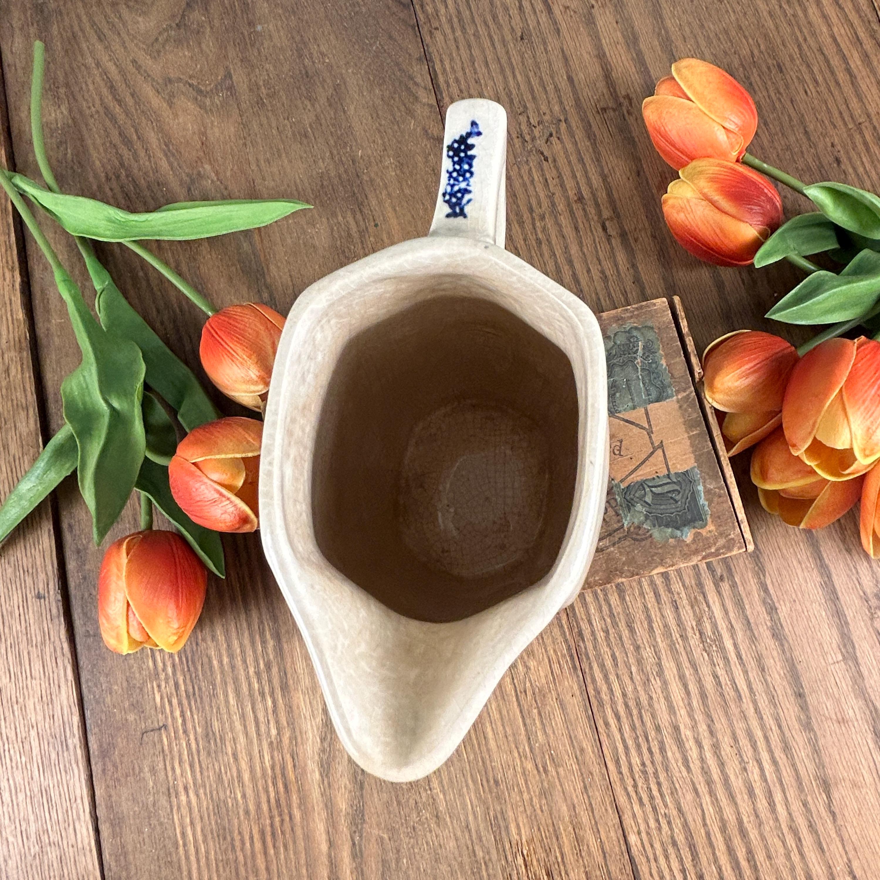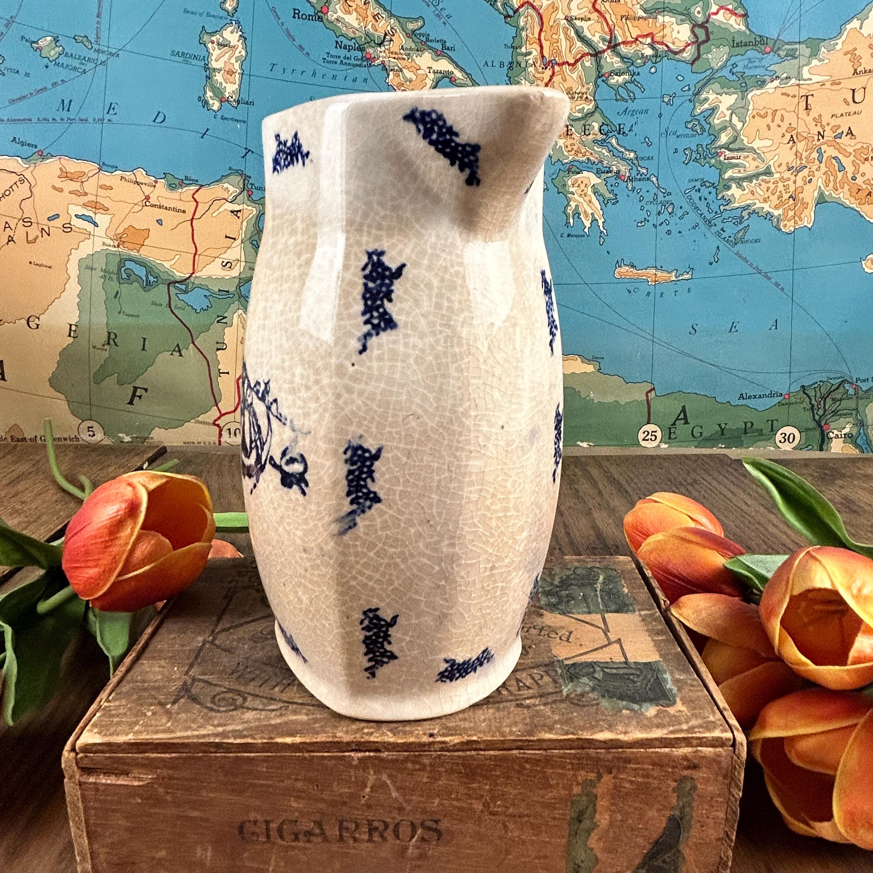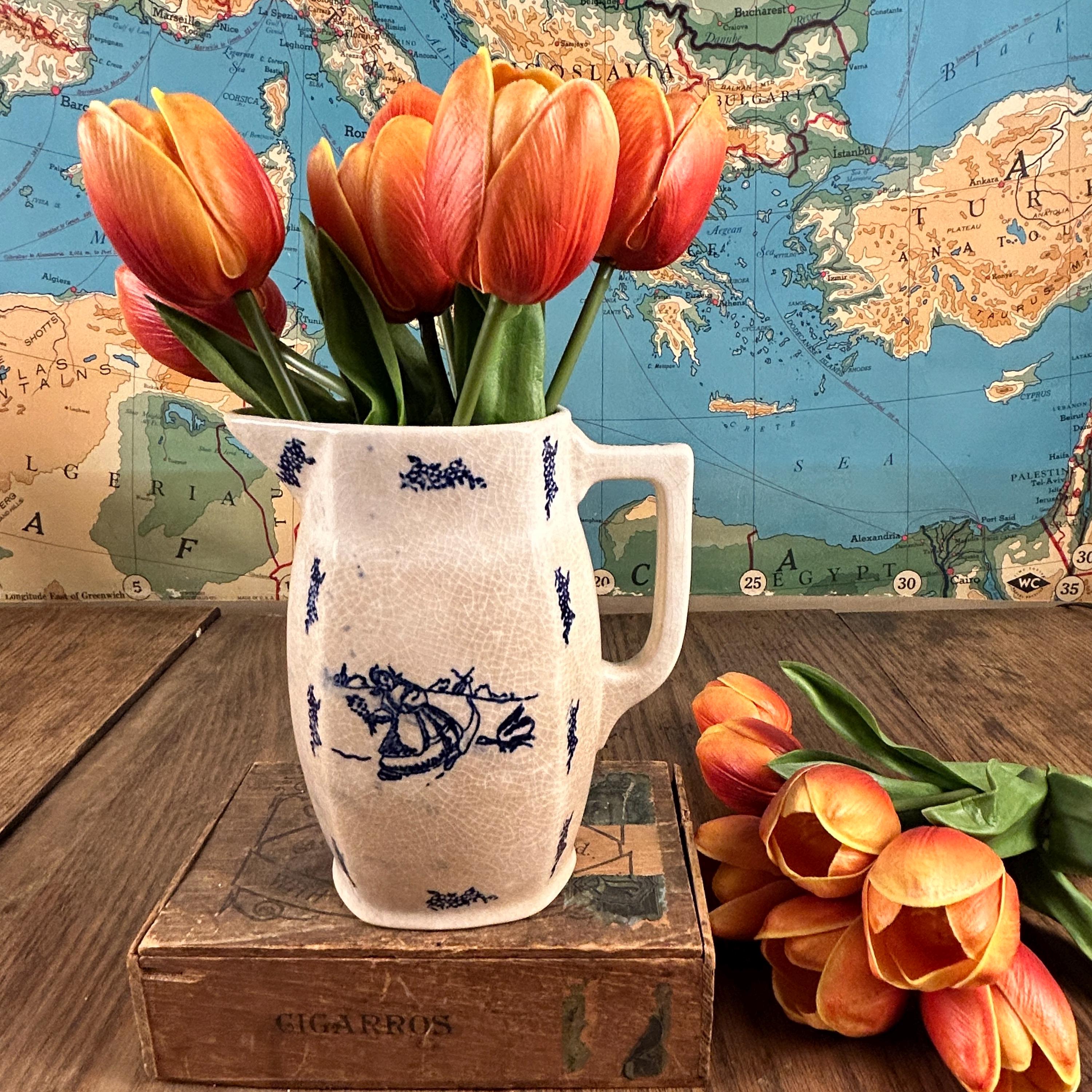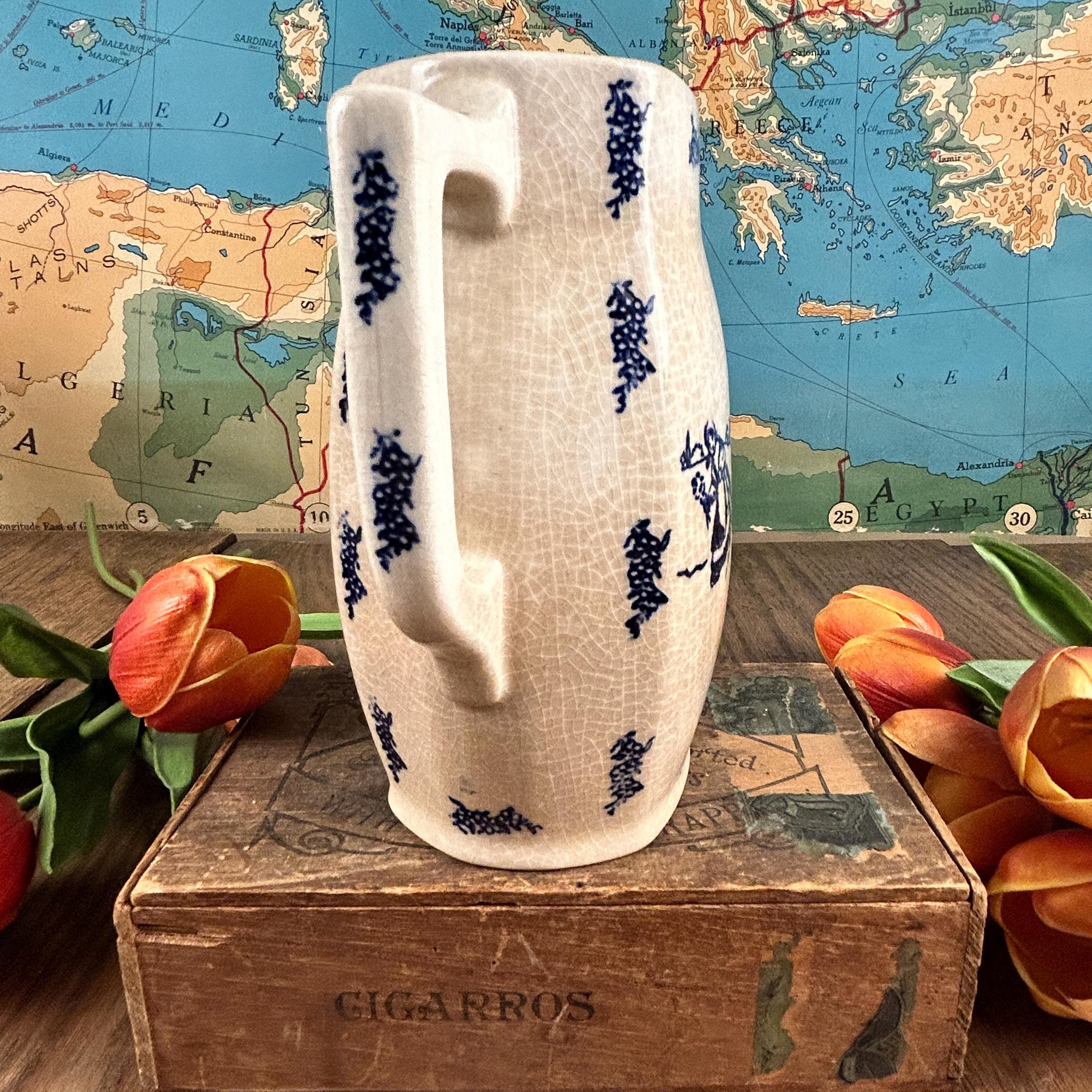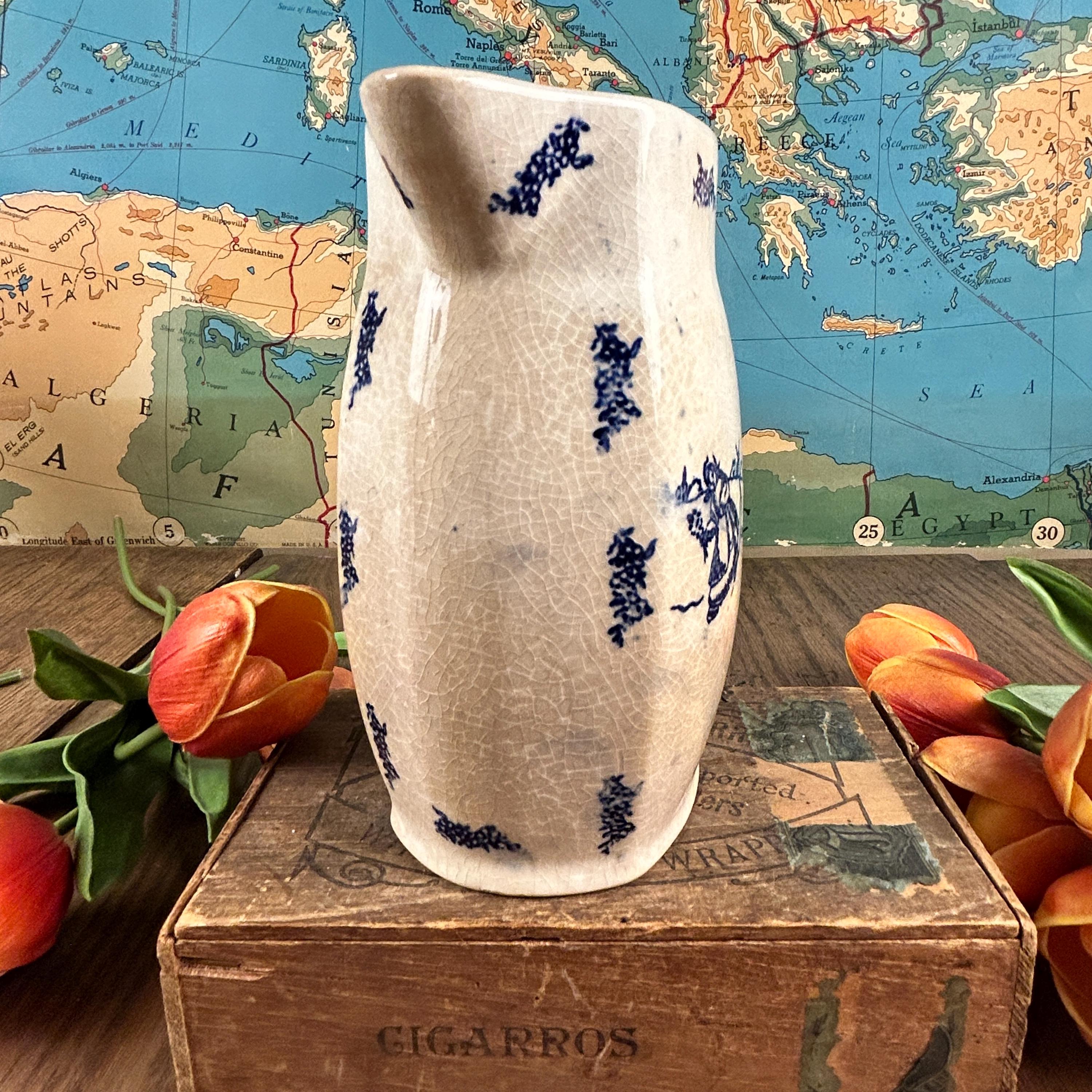 A simple, blue and white Dutch style transferware pitcher. This delicate painted scene depicts a girl collecting flowers in a field and being chased by a goose, with windmills in the distant background. This vintage ironstone milk pitcher has moderate crazing, consistent with its age and an authentic feature of vintage ironstone. We find the crazing to be one of its endearing features.
