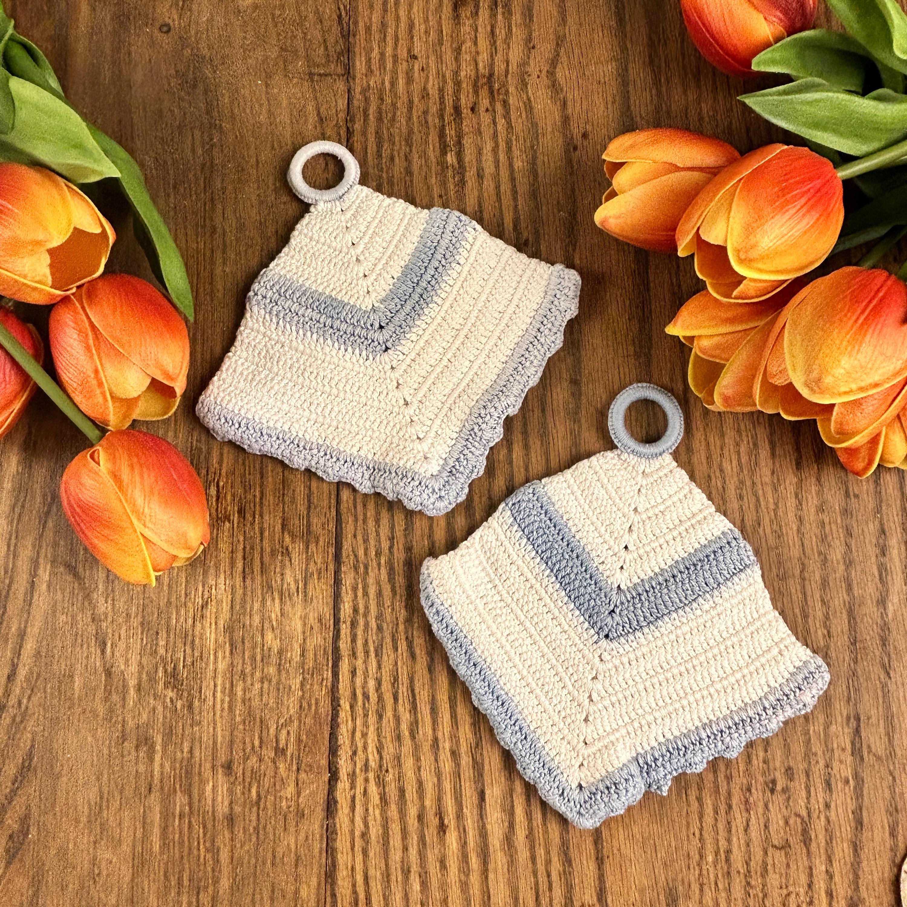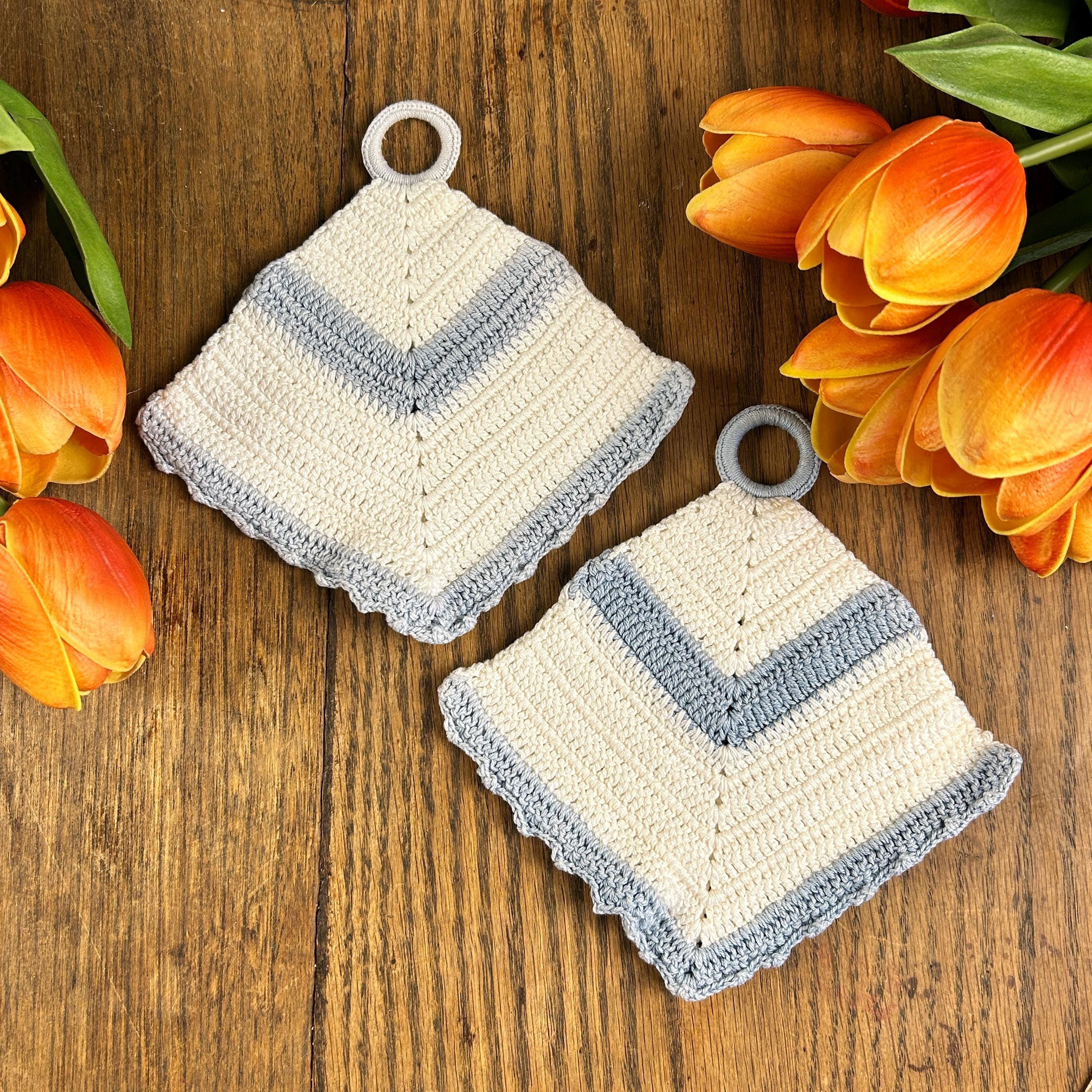 Adorable handmade crocheted potholders/trivets with loops for hanging. Perfect for your cottage core or granny chic kitchen. 100% cotton.