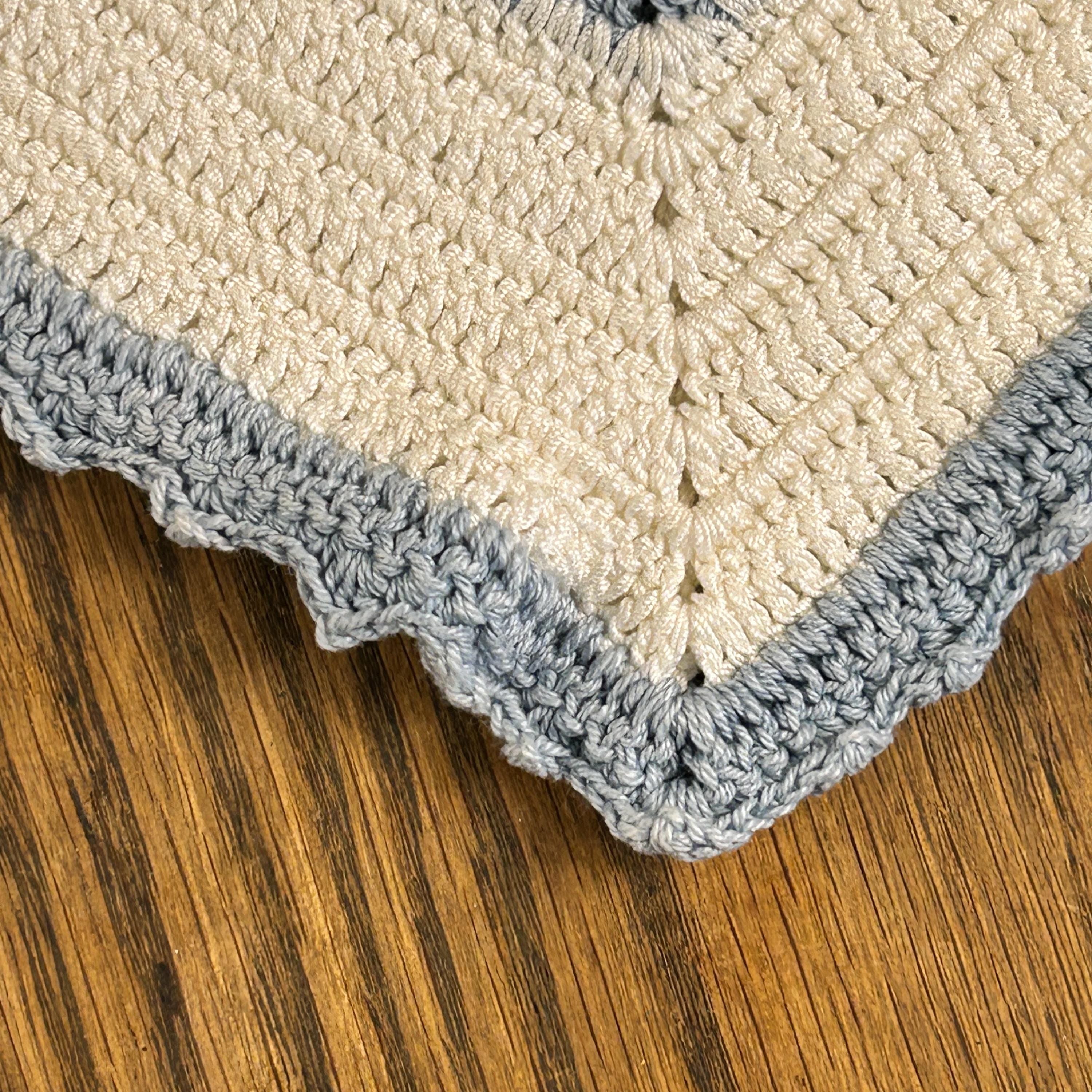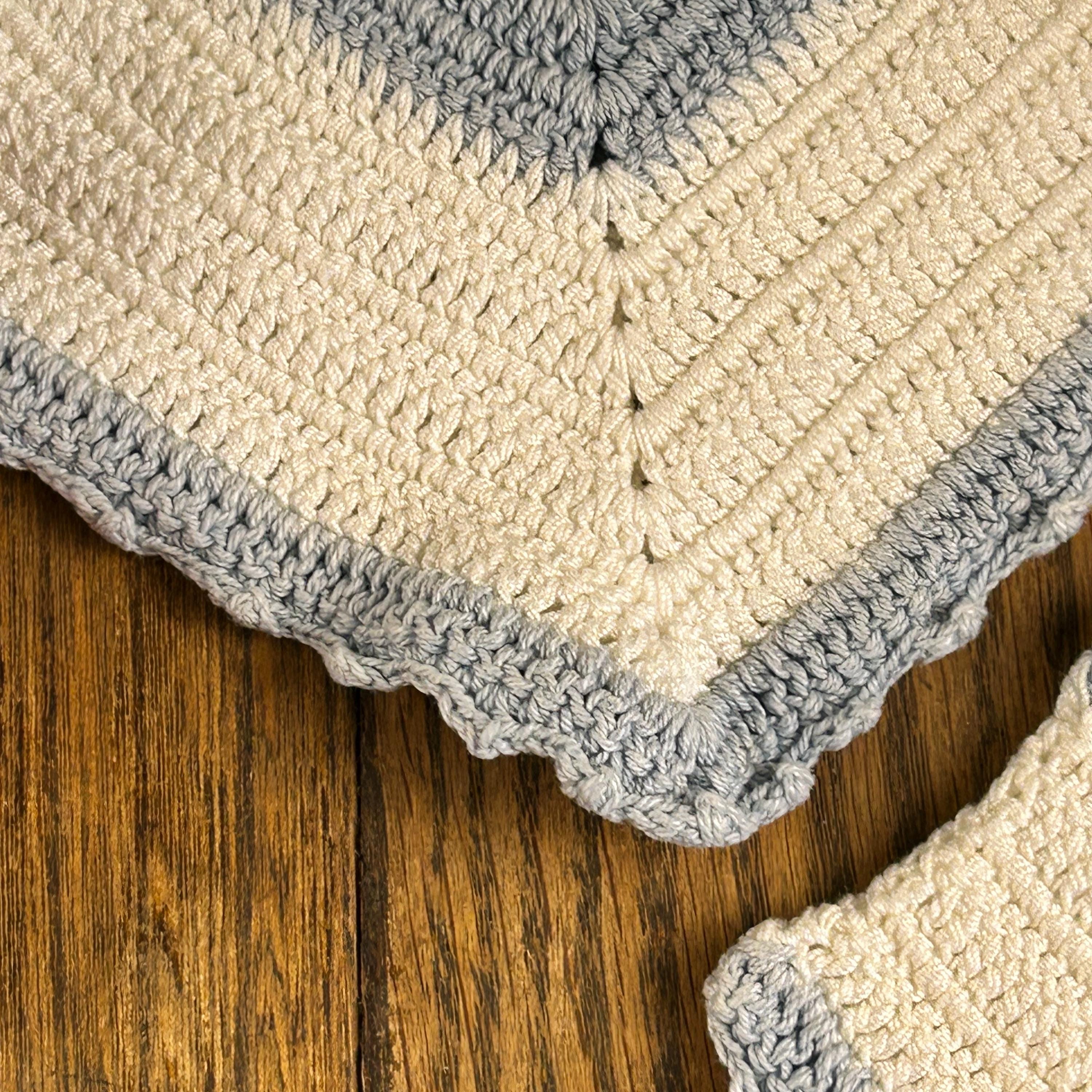 This is a set of two of vintage crocheted baby blue and white potholders or trivets, c. 1950s. Beautifully crafted; a soft blue combo -perfect for your retro kitchen or as a gift to your vintage loving friend. The price is for both together and they are in excellent condition. I do not see any visible stains on either.