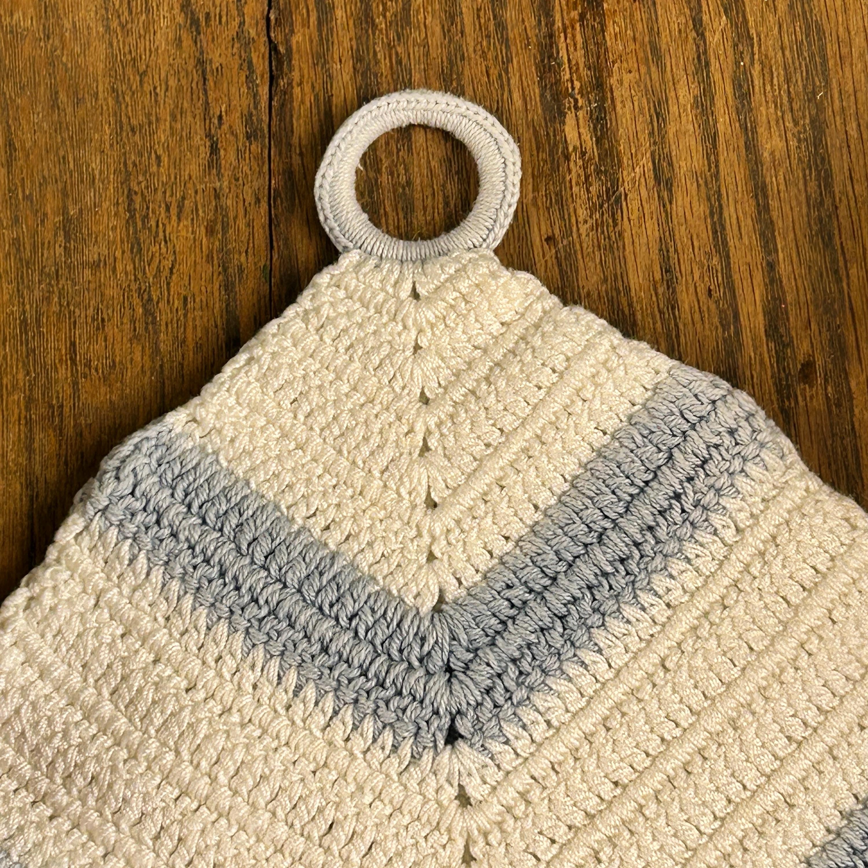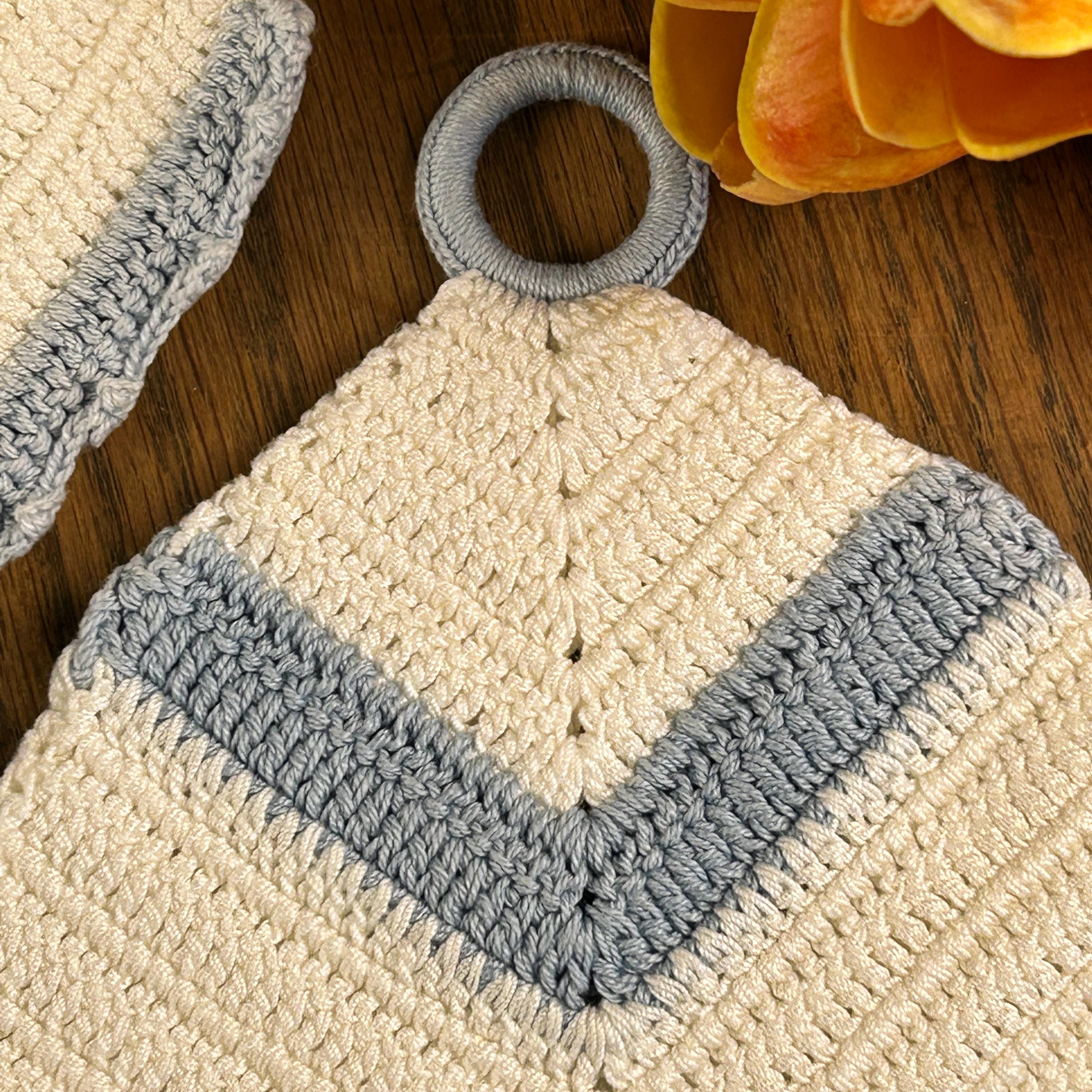 2 - White and Light Blue potholders measuring approximately 6 1/2" in width and 7" from top of hanging loop to bottom of potholder.