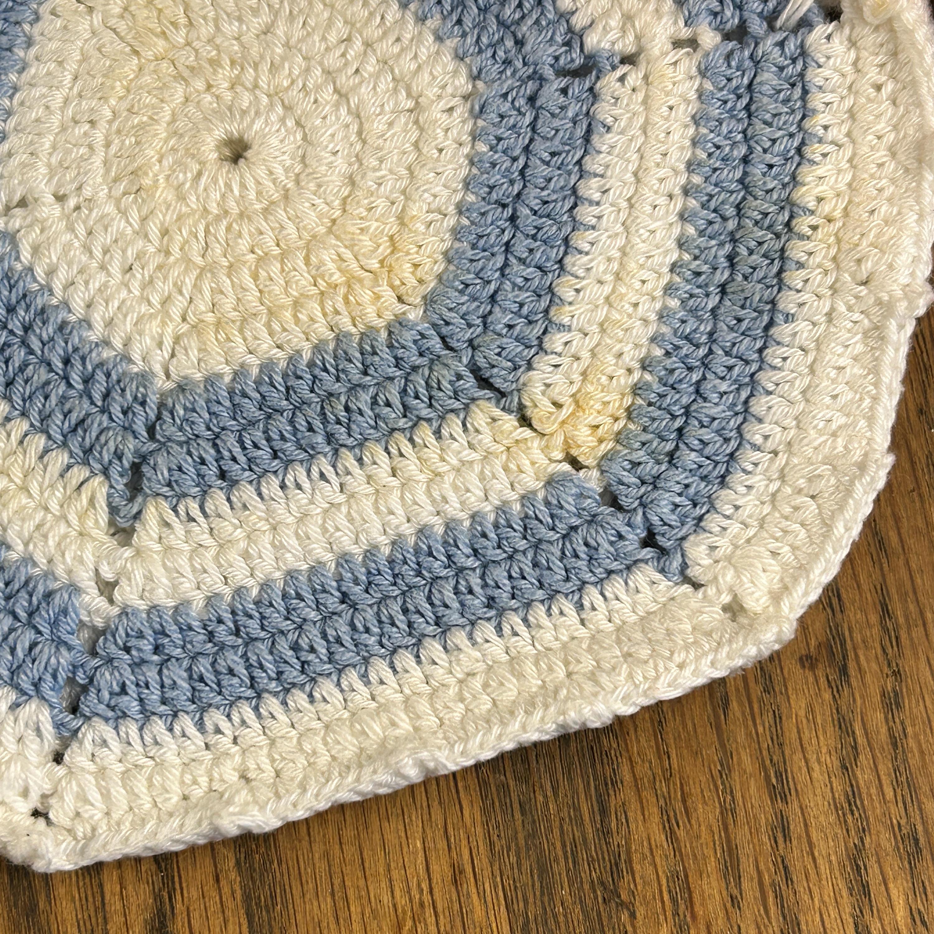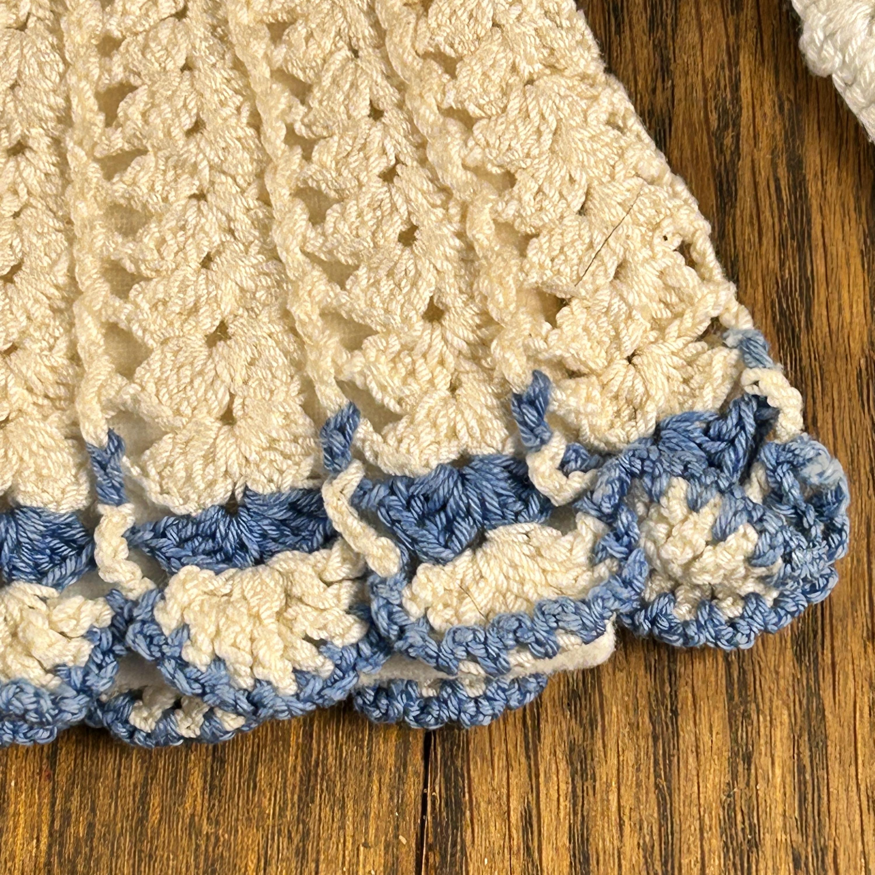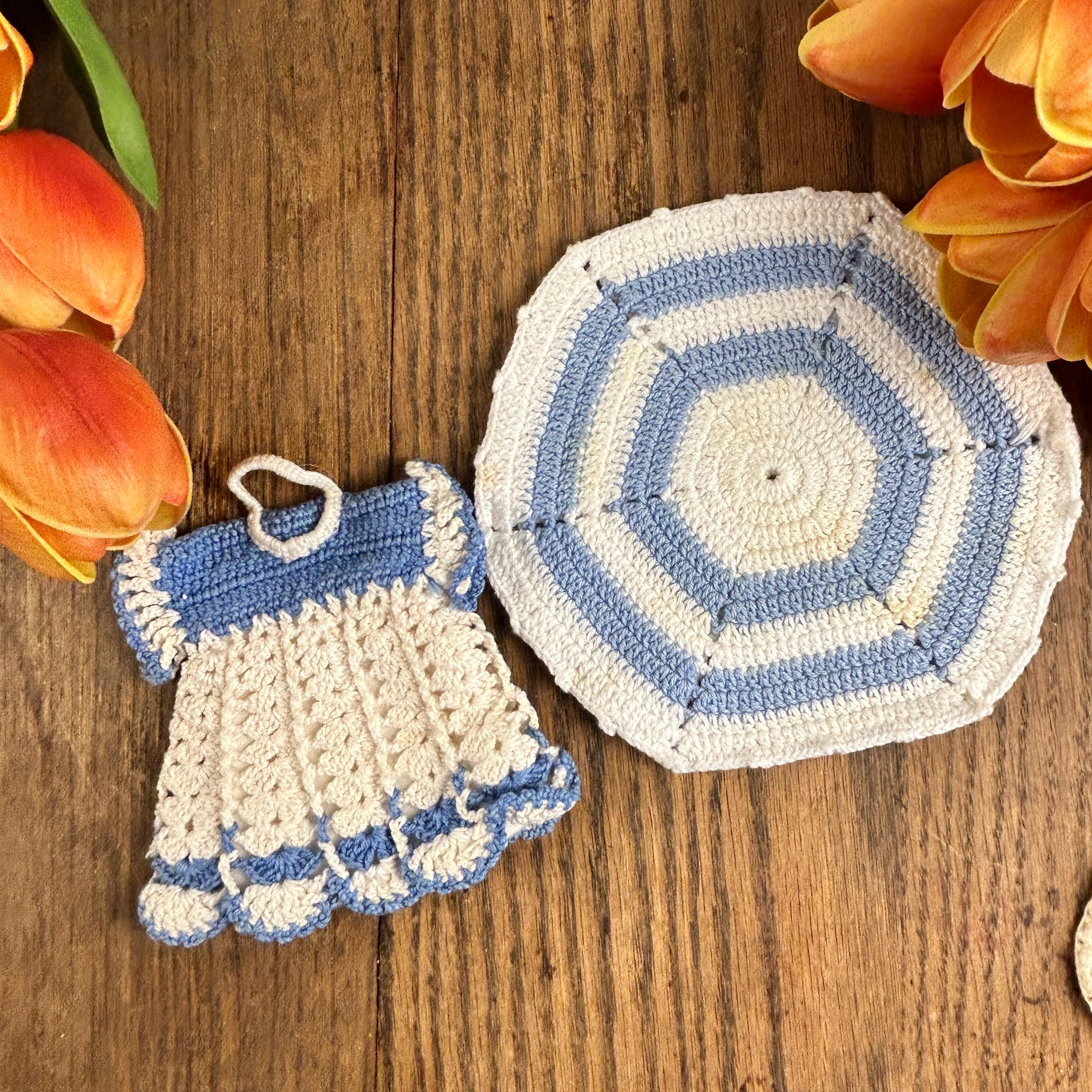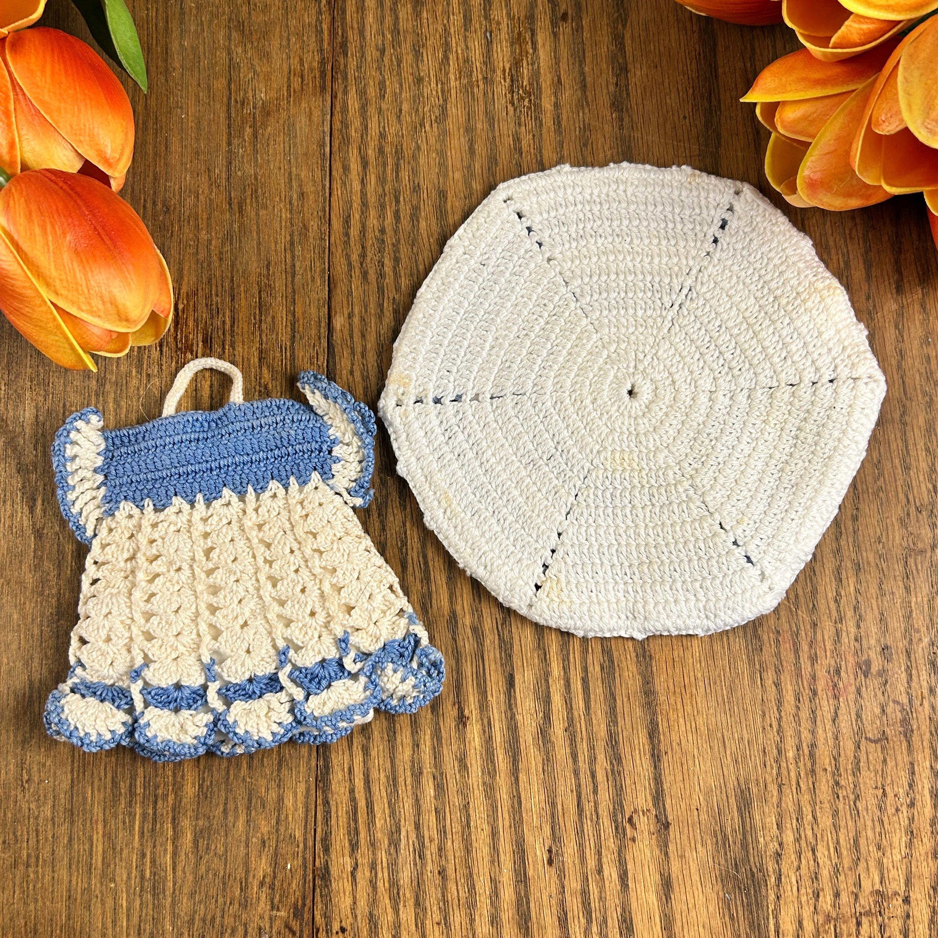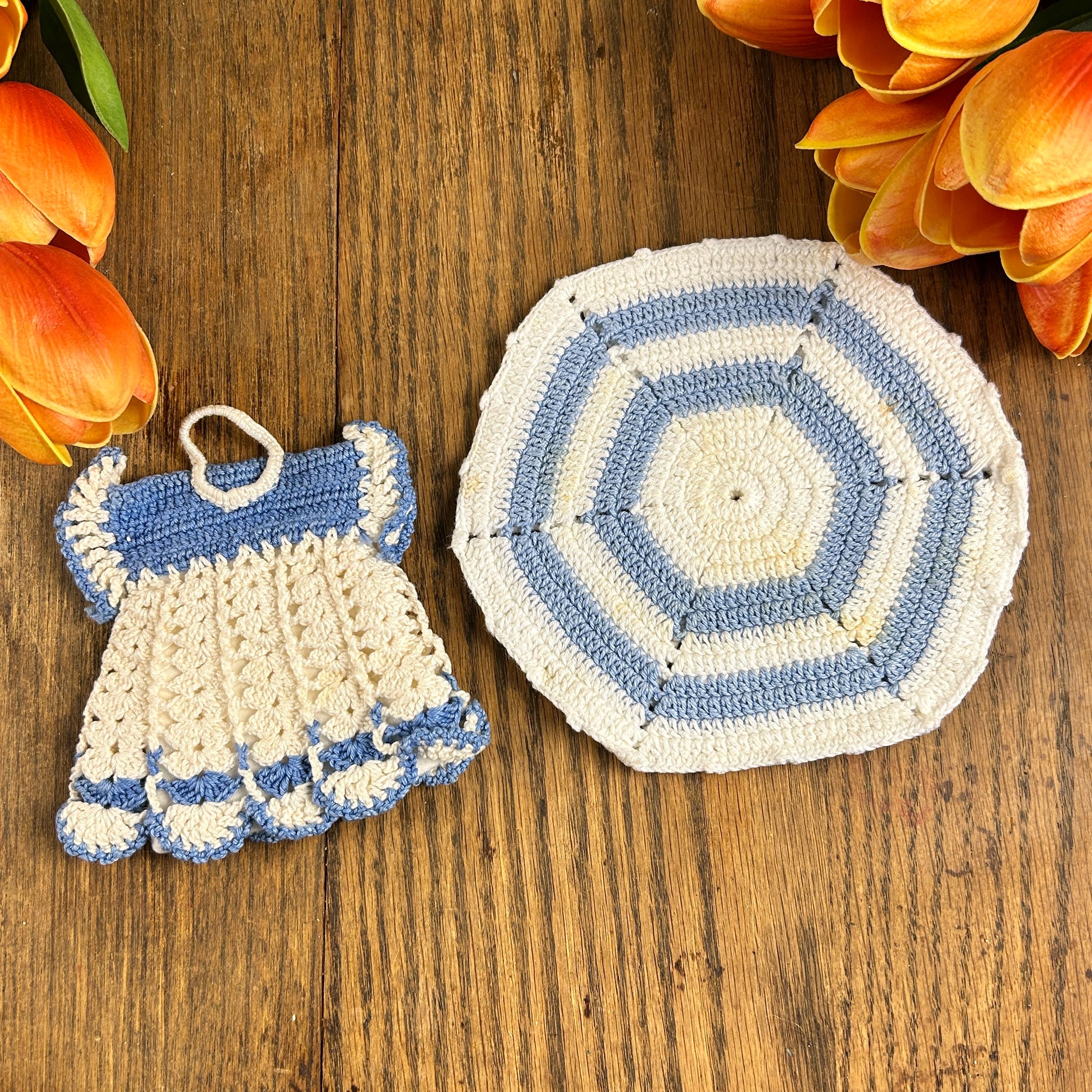 This is a set of two of vintage crocheted baby blue and white potholders or trivets, c. 1950s. Beautifully crafted; a soft blue combo -perfect for your retro kitchen or as a gift to your vintage loving friend. The price is for both together and they are in excellent condition. I do not see any visible stains on either. Please see all photos as they are part of the description.