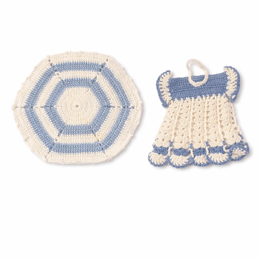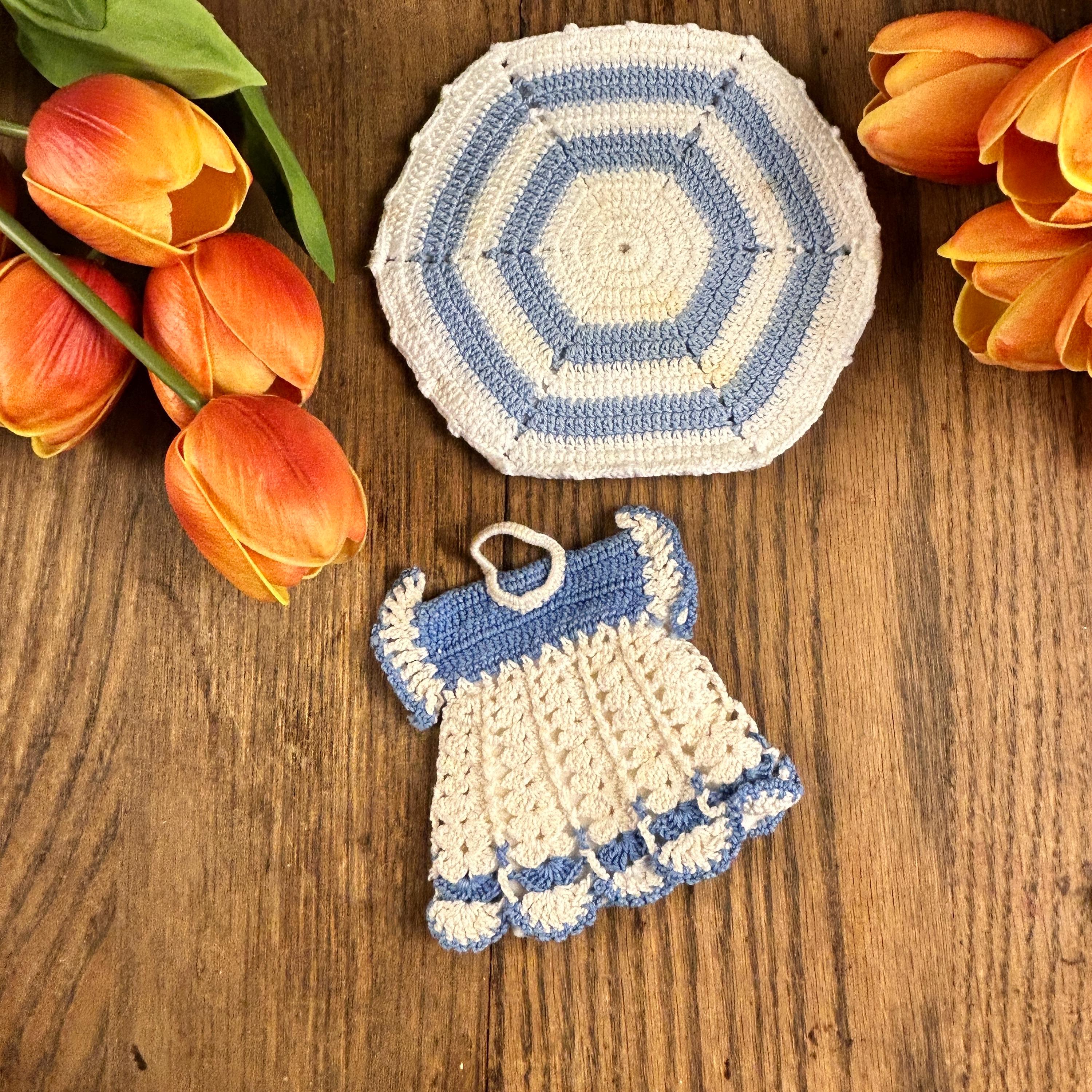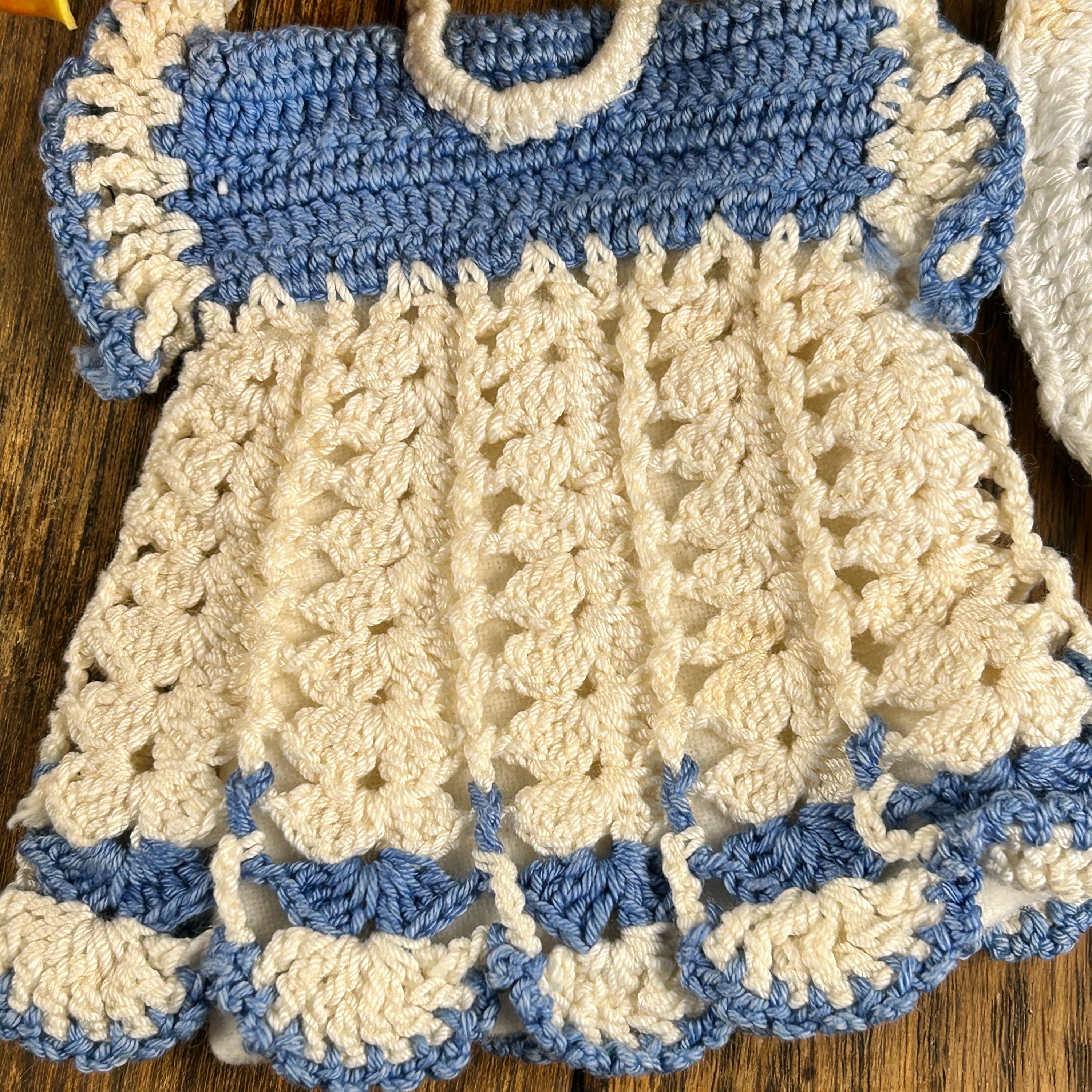 1 - White and Light Blue potholder shaped as a doll dress with scalloped edging and ruffled sleeves. Measures approximately 4 1/2" in width and 5" from top of hanging loop to bottom of potholder. Open at the bottom with cotton lining for your hand.