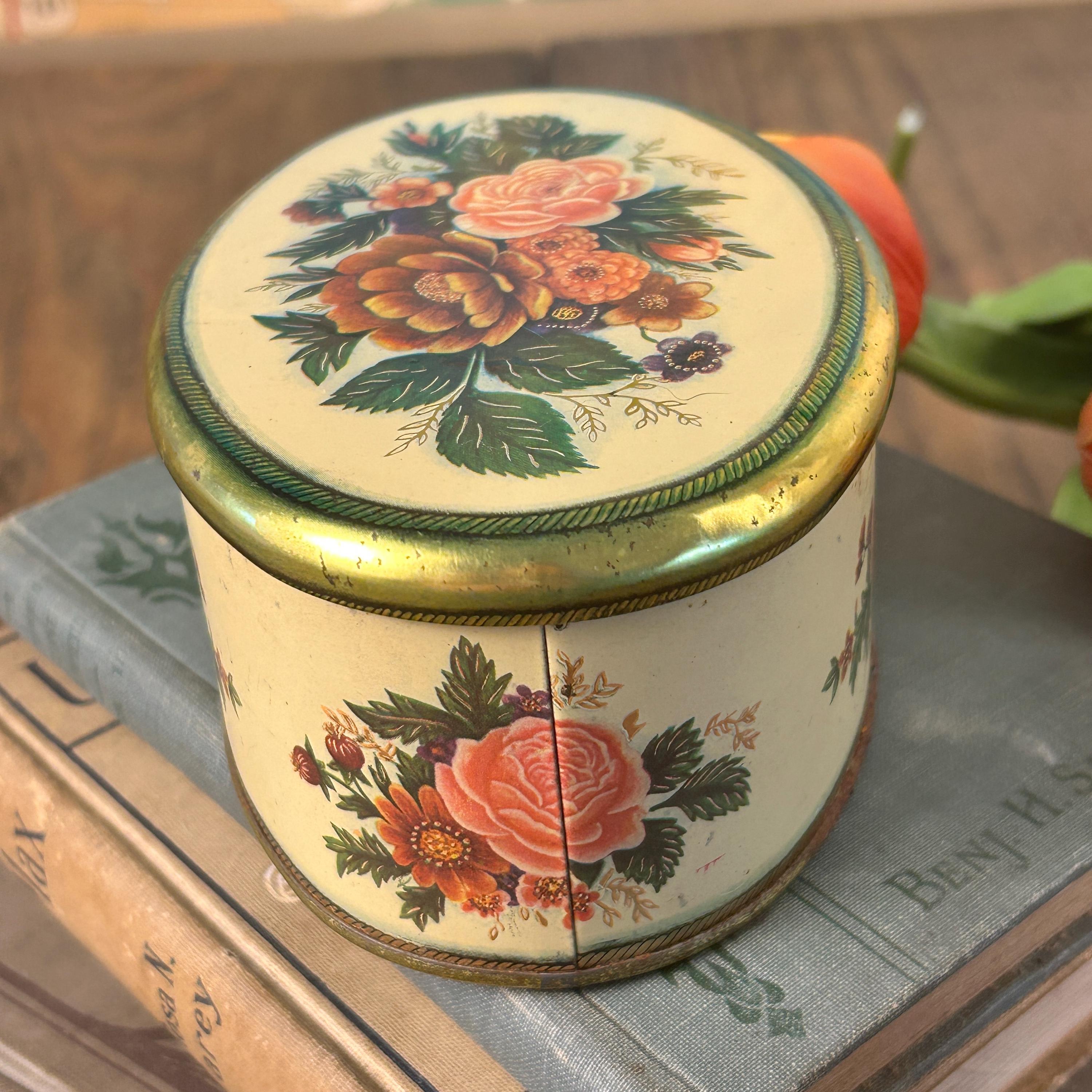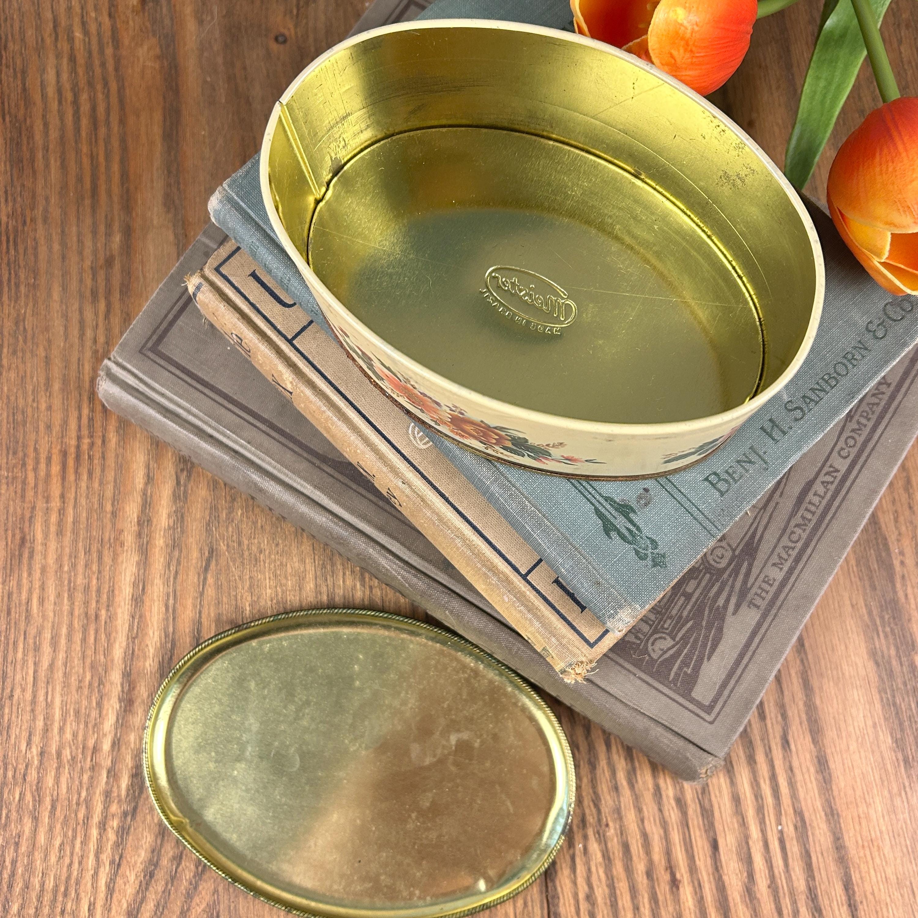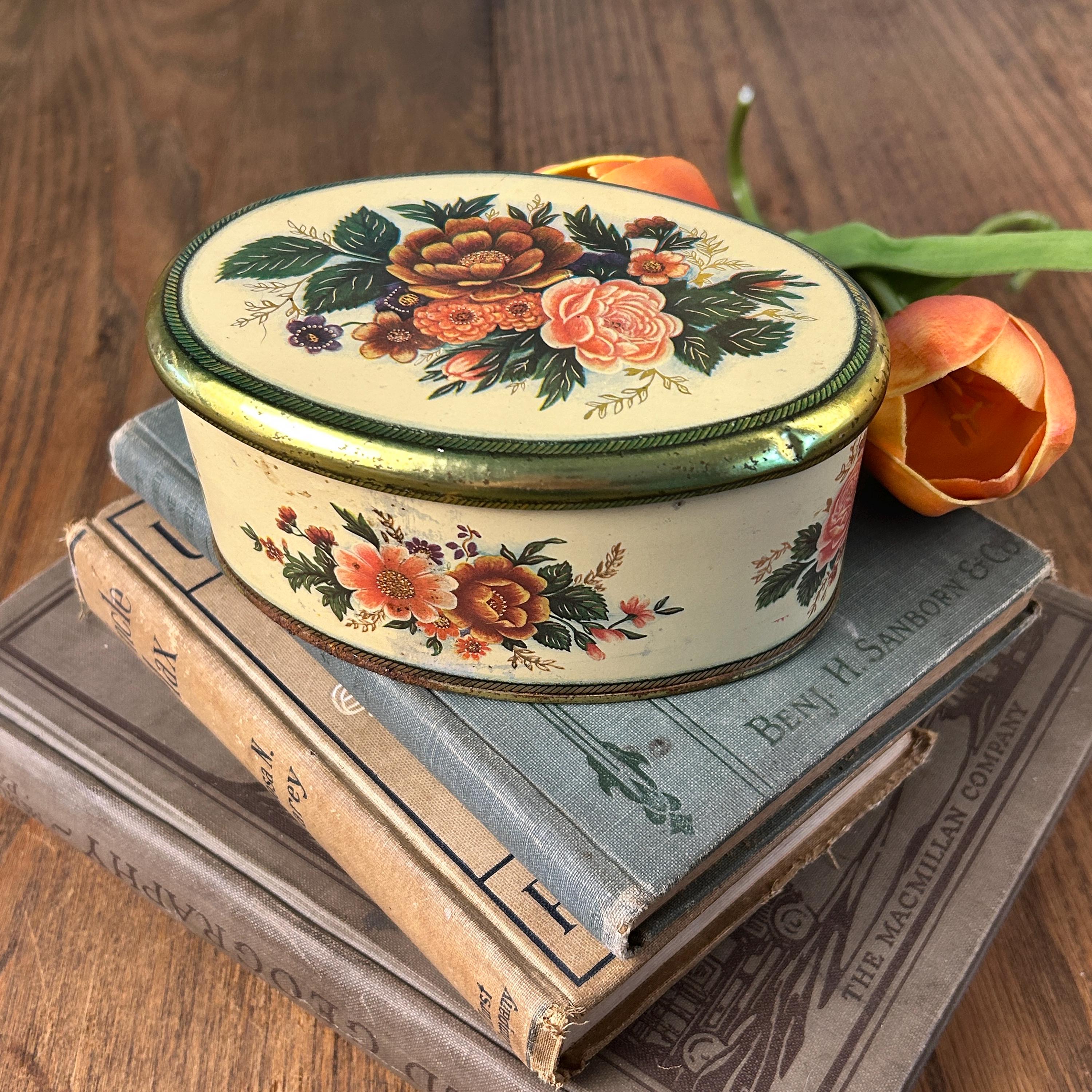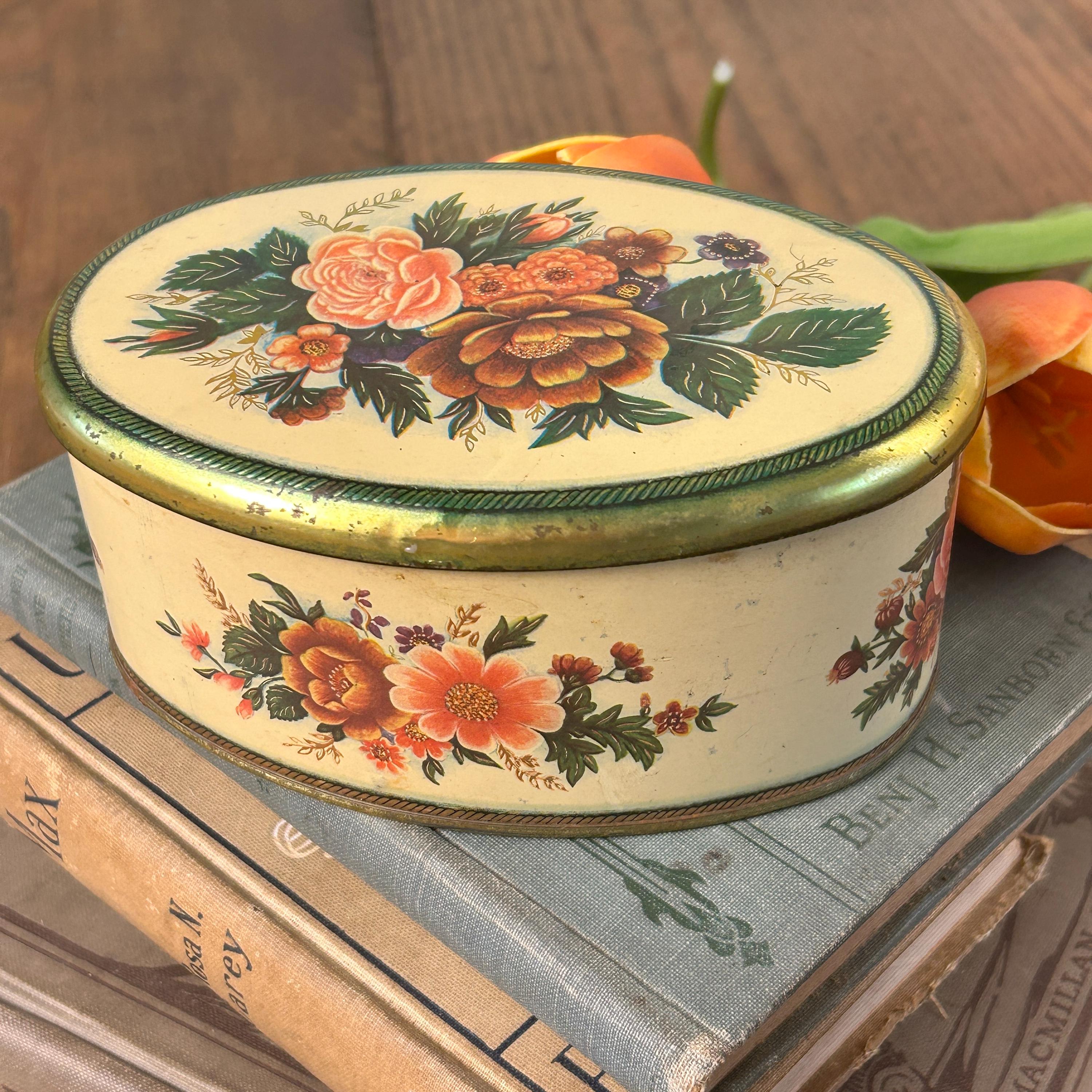 Sweet vintage candy tin by the Meister company, made in Brazil. An oval shaped tin depicting different floral bouquets. This tin is in good condition, some expected minor wear, one small dent on side of lid--see pictures for better details. Very clean.