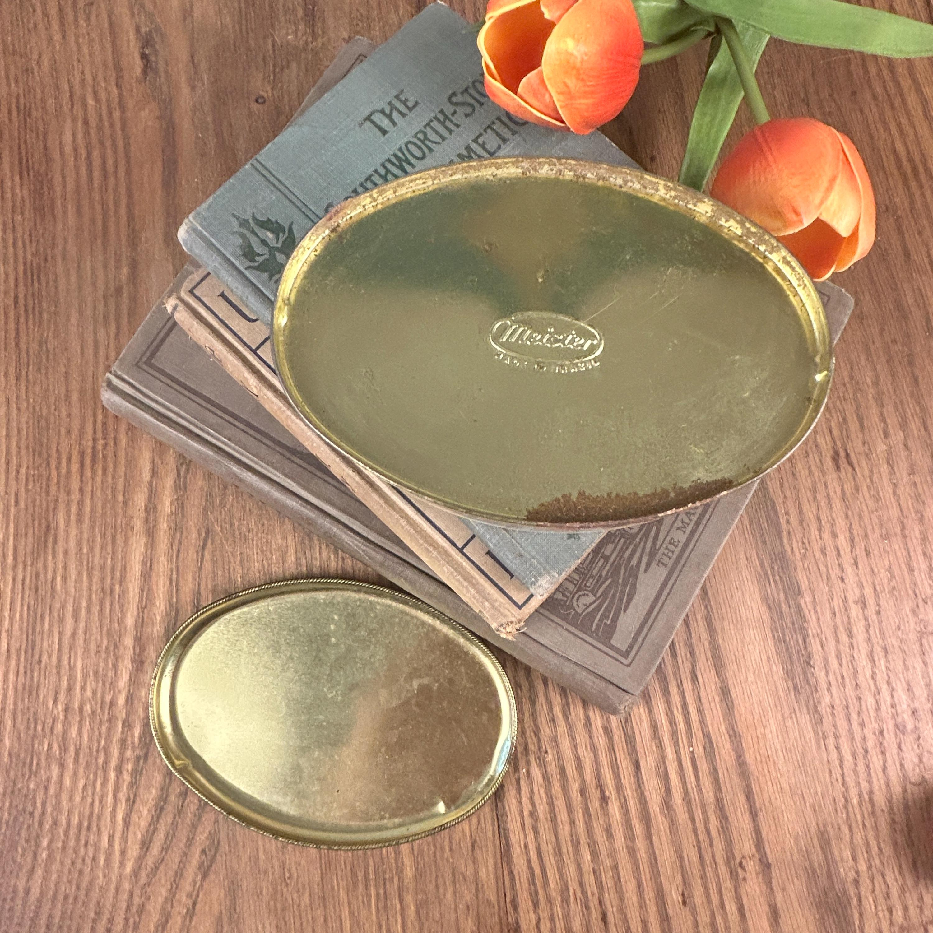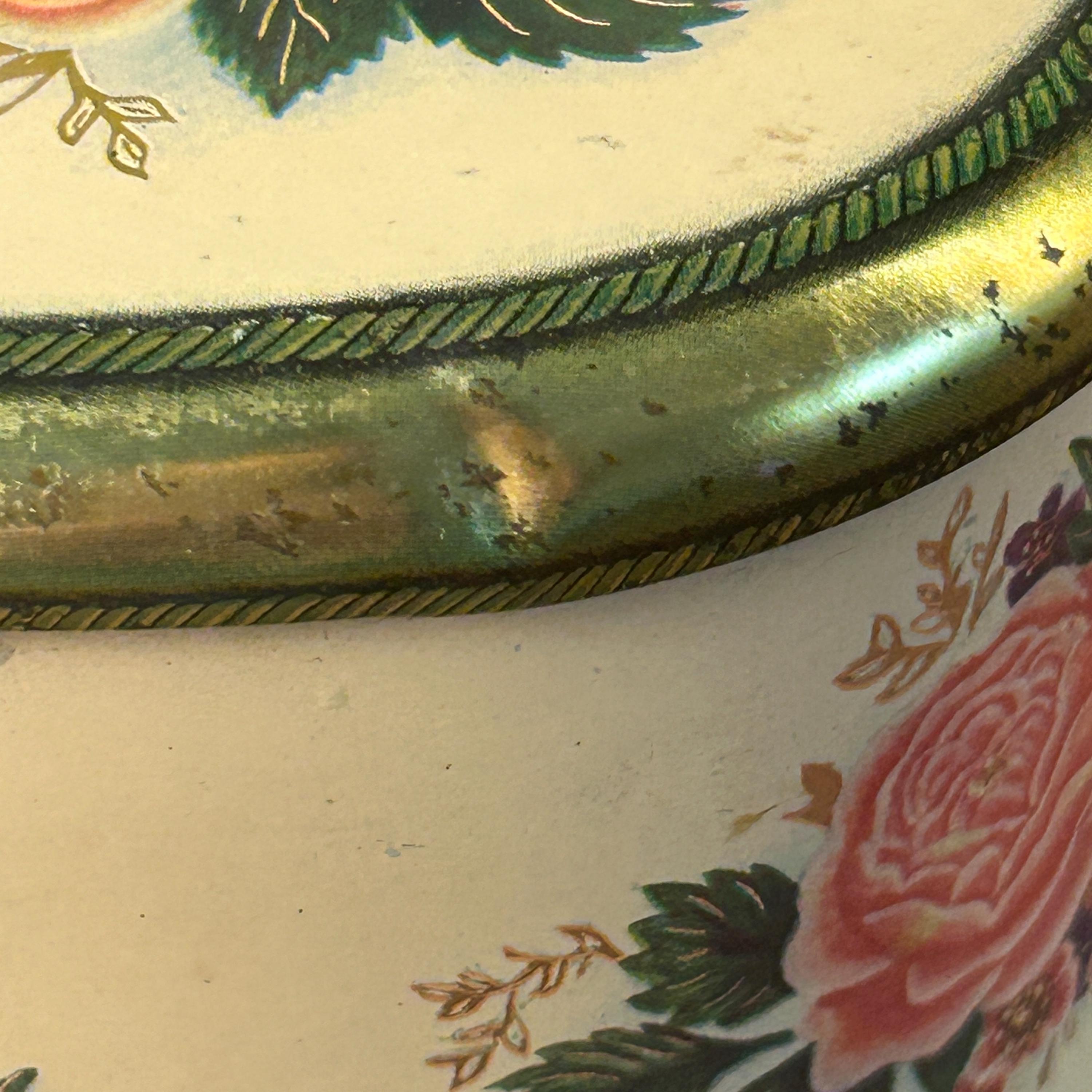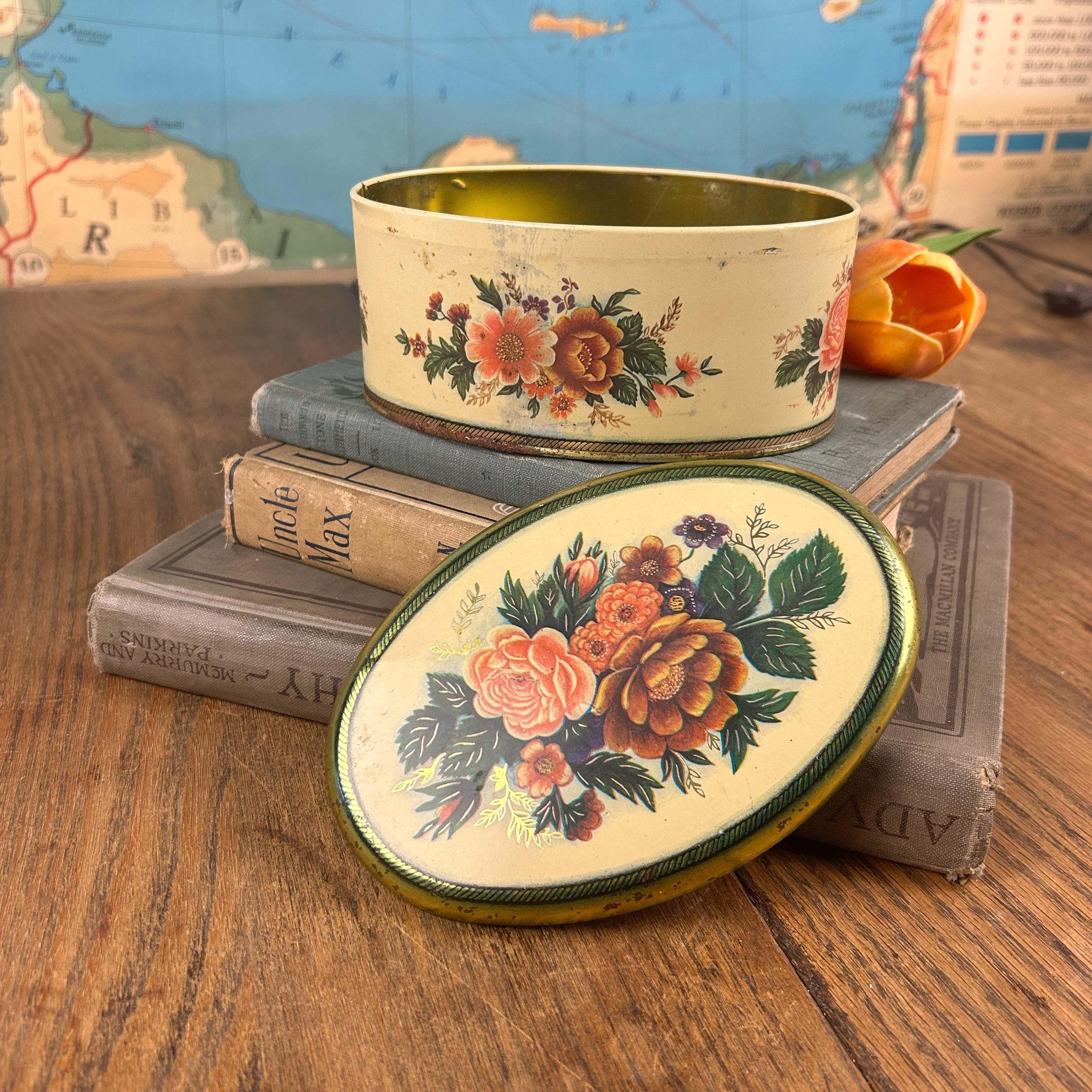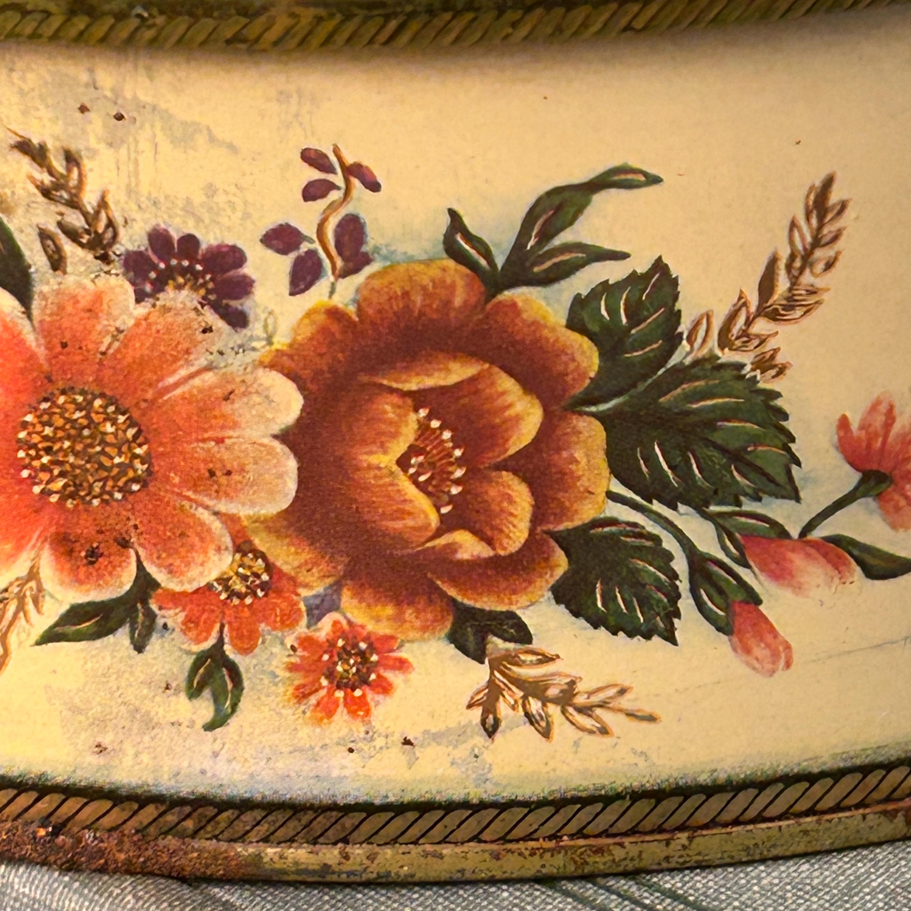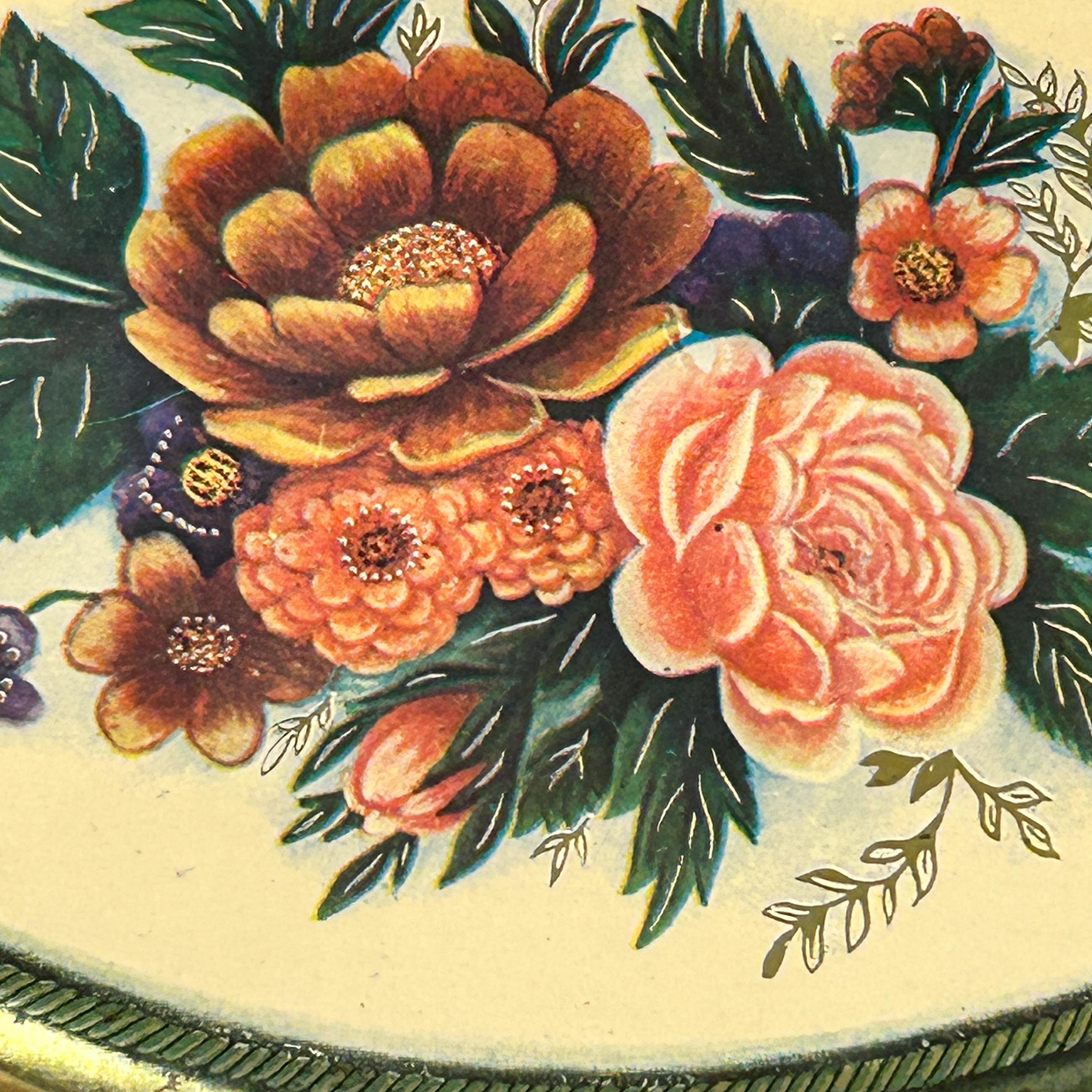 Sweet vintage candy tin by the Meister company, made in Brazil. An oval shaped tin depicting different floral bouquets. This tin is in good condition, some expected minor wear, one small dent on side of lid--see pictures for better details. Very clean.