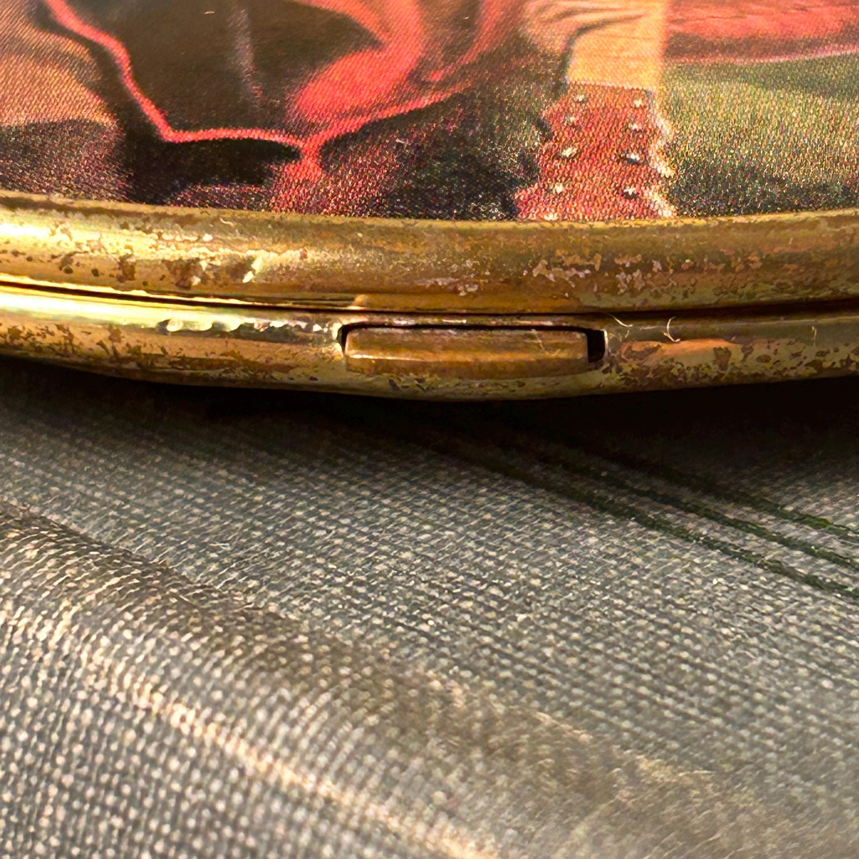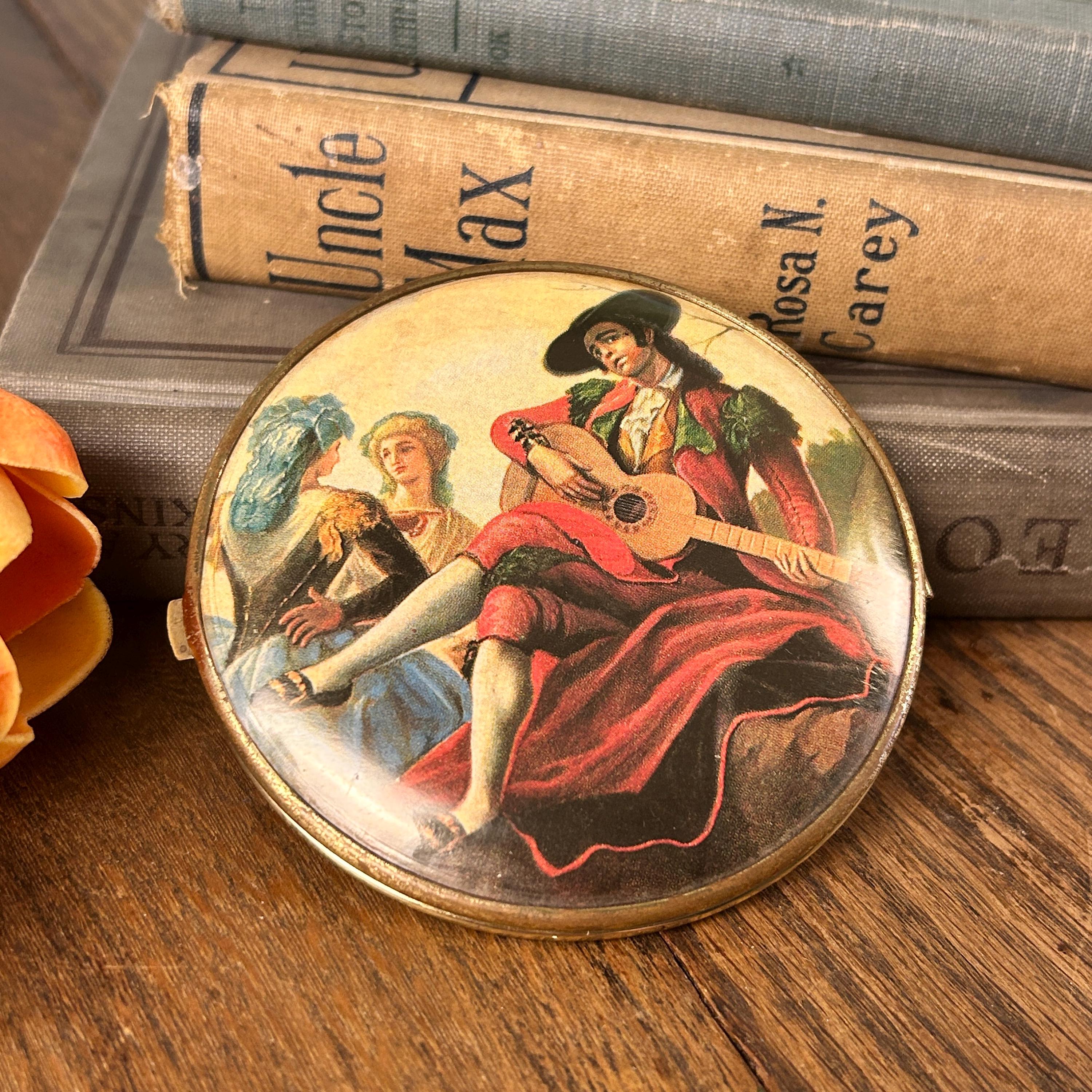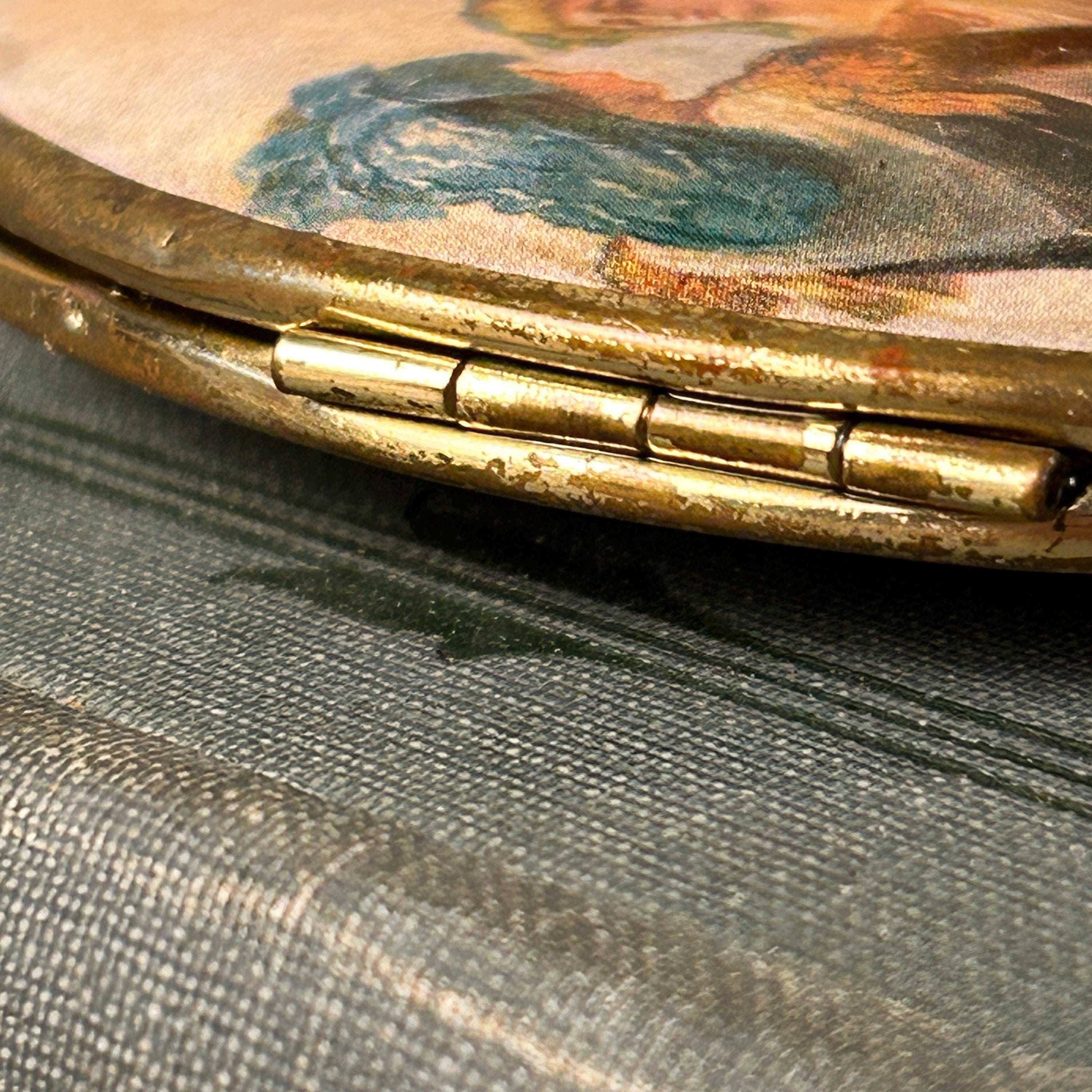 This piece is in good vintage condition. The artwork on the outsides are both clear and bright. One side is a bit brighter than the other. Please see all photos. Mirrors are in pristine condition as well as the gold inside the compact.