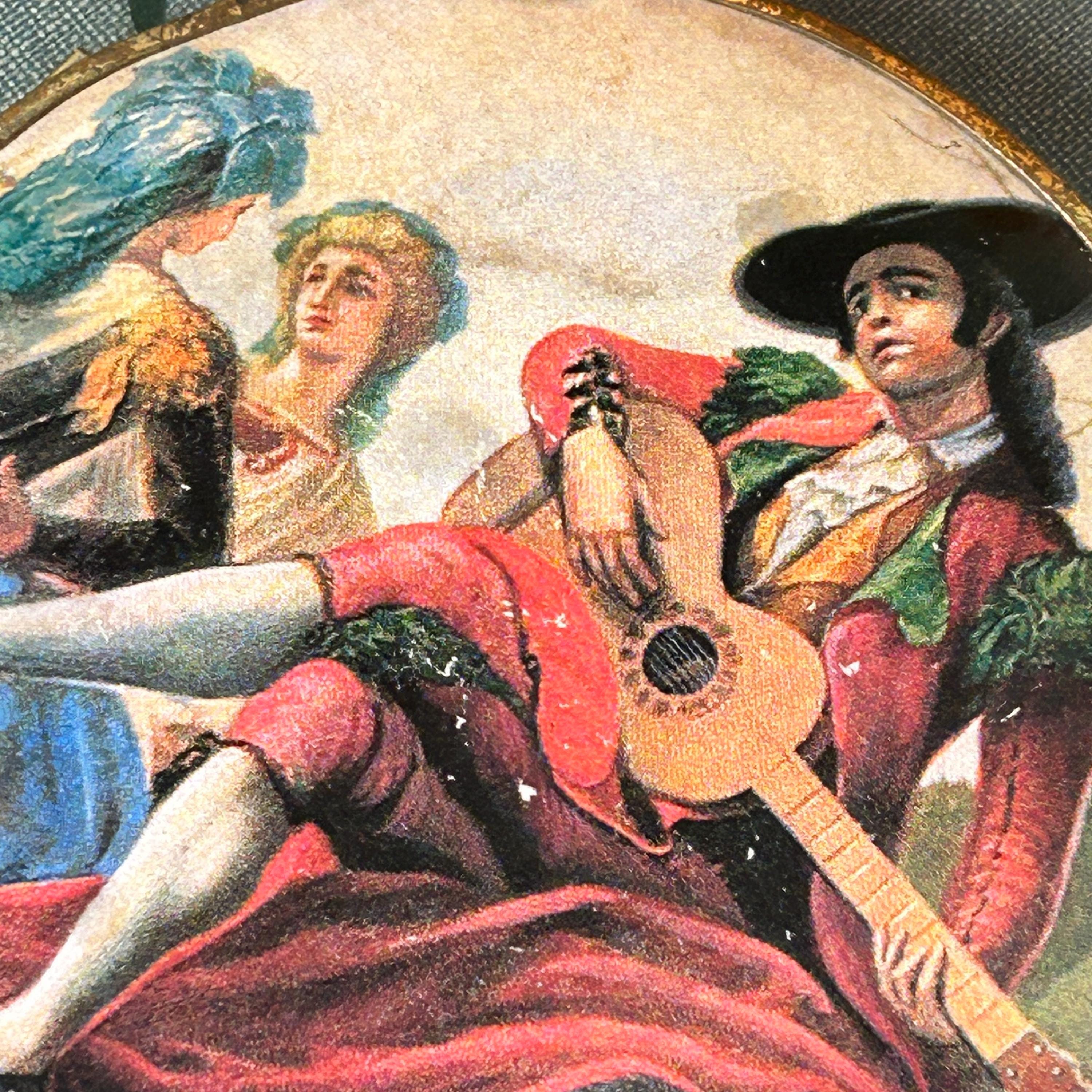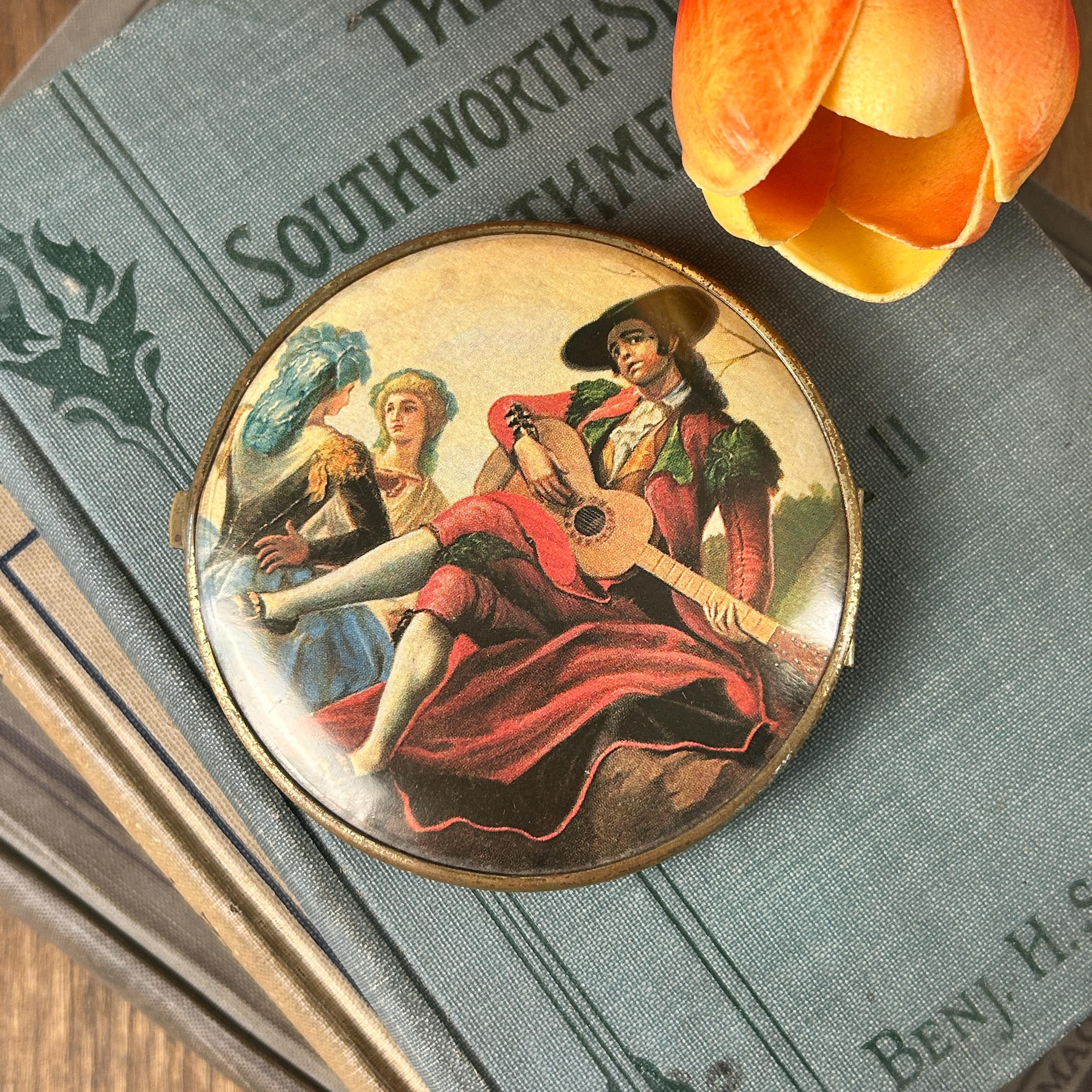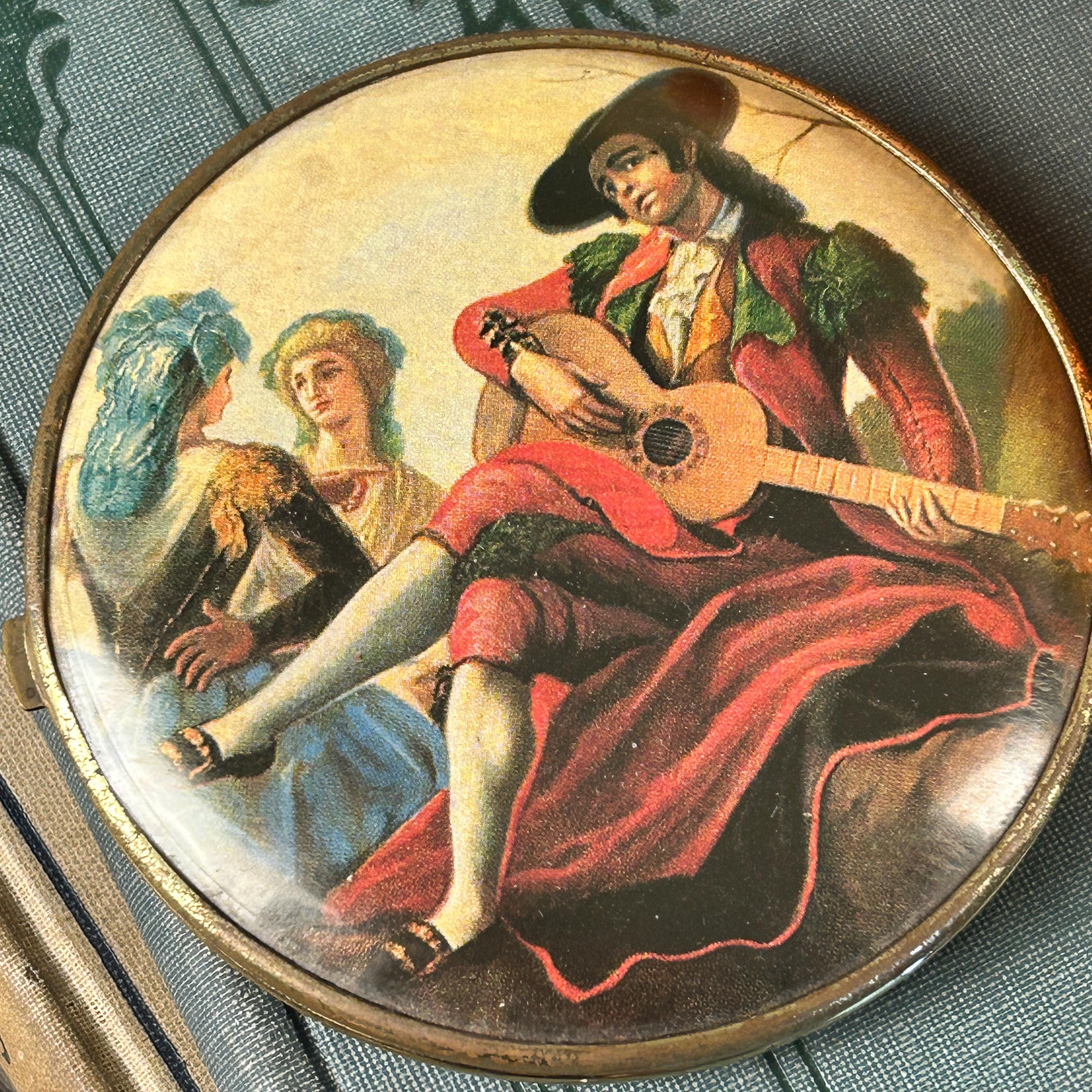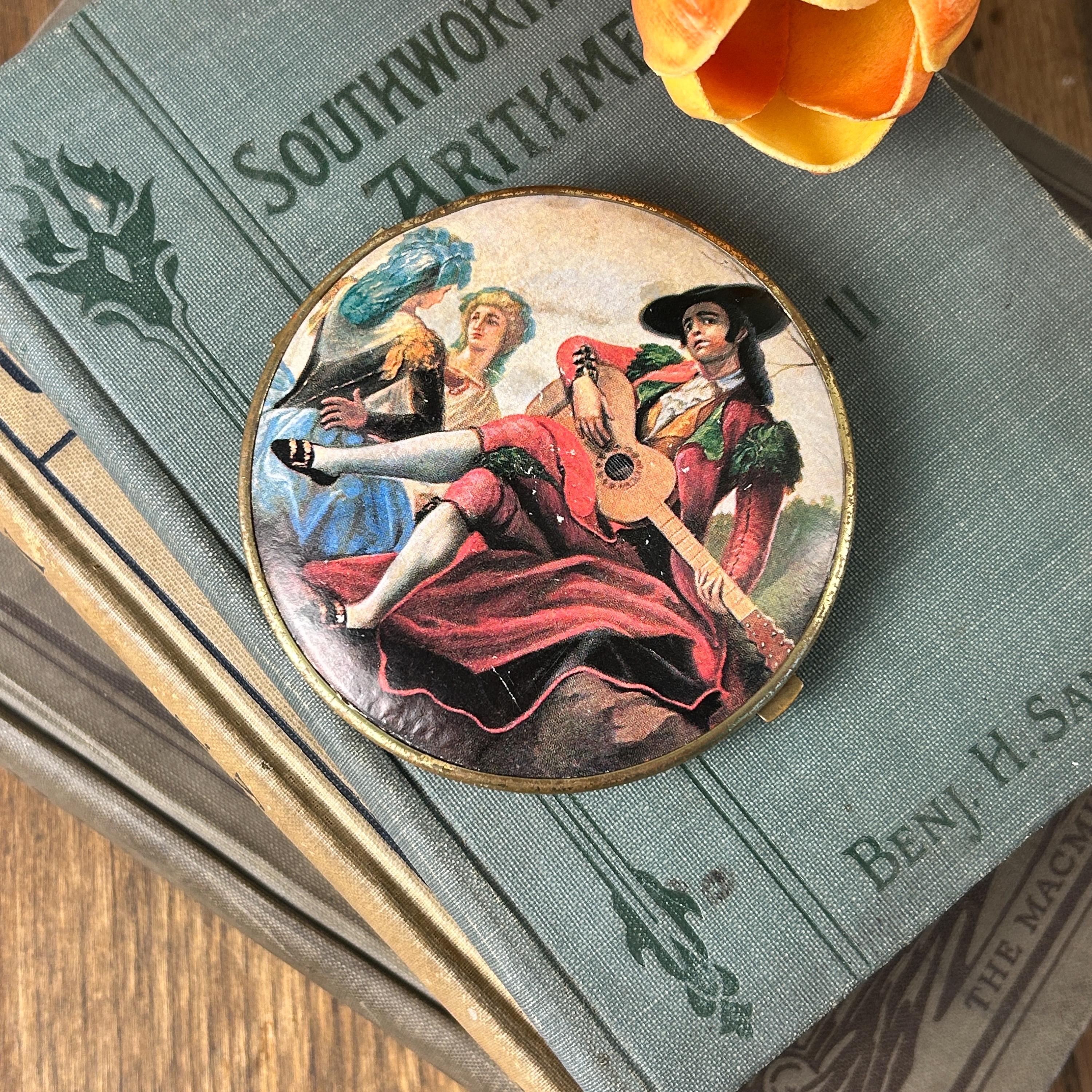 This piece is in good vintage condition. The artwork on the outsides are both clear and bright. One side is a bit brighter than the other. Please see all photos. Mirrors are in pristine condition as well as the gold inside the compact.
