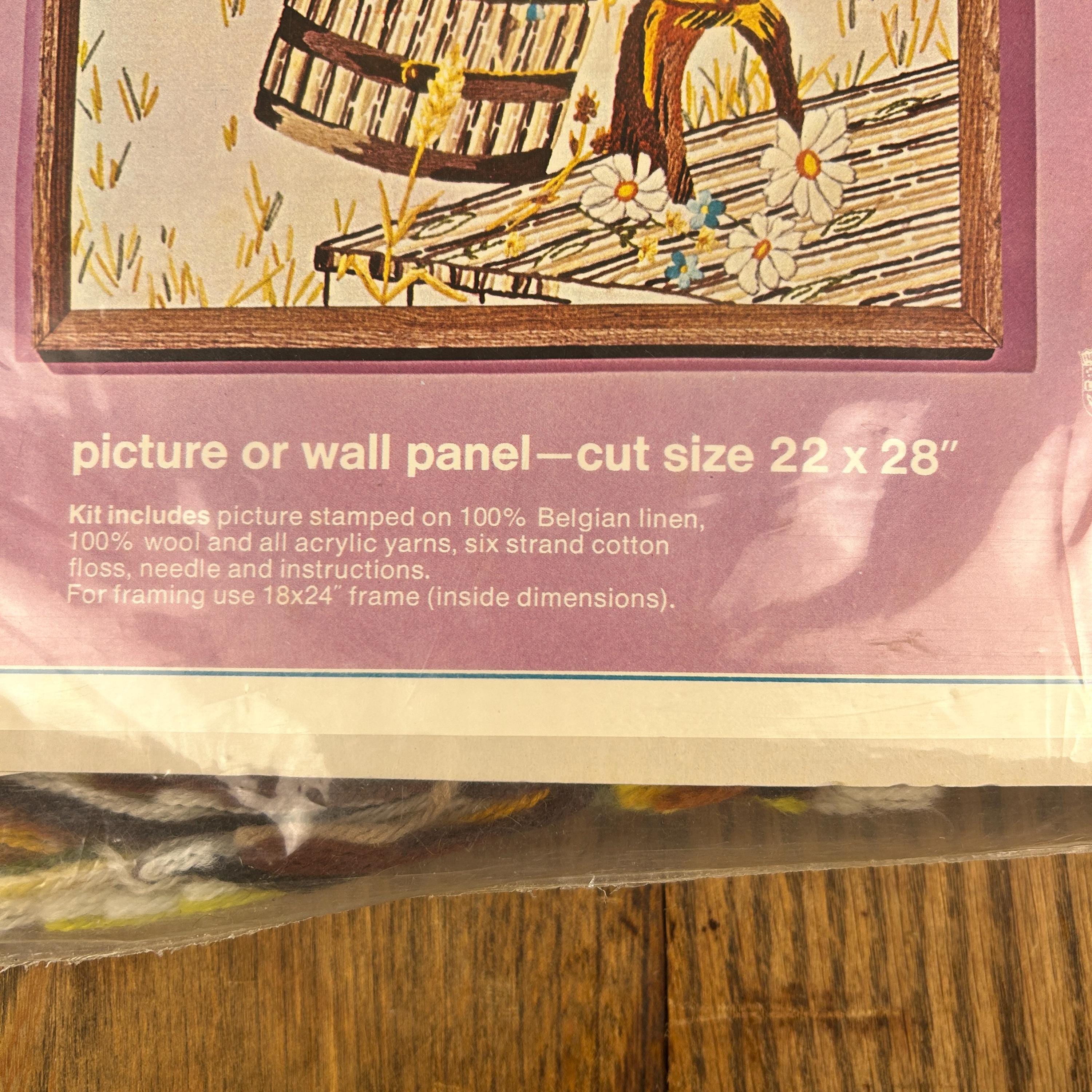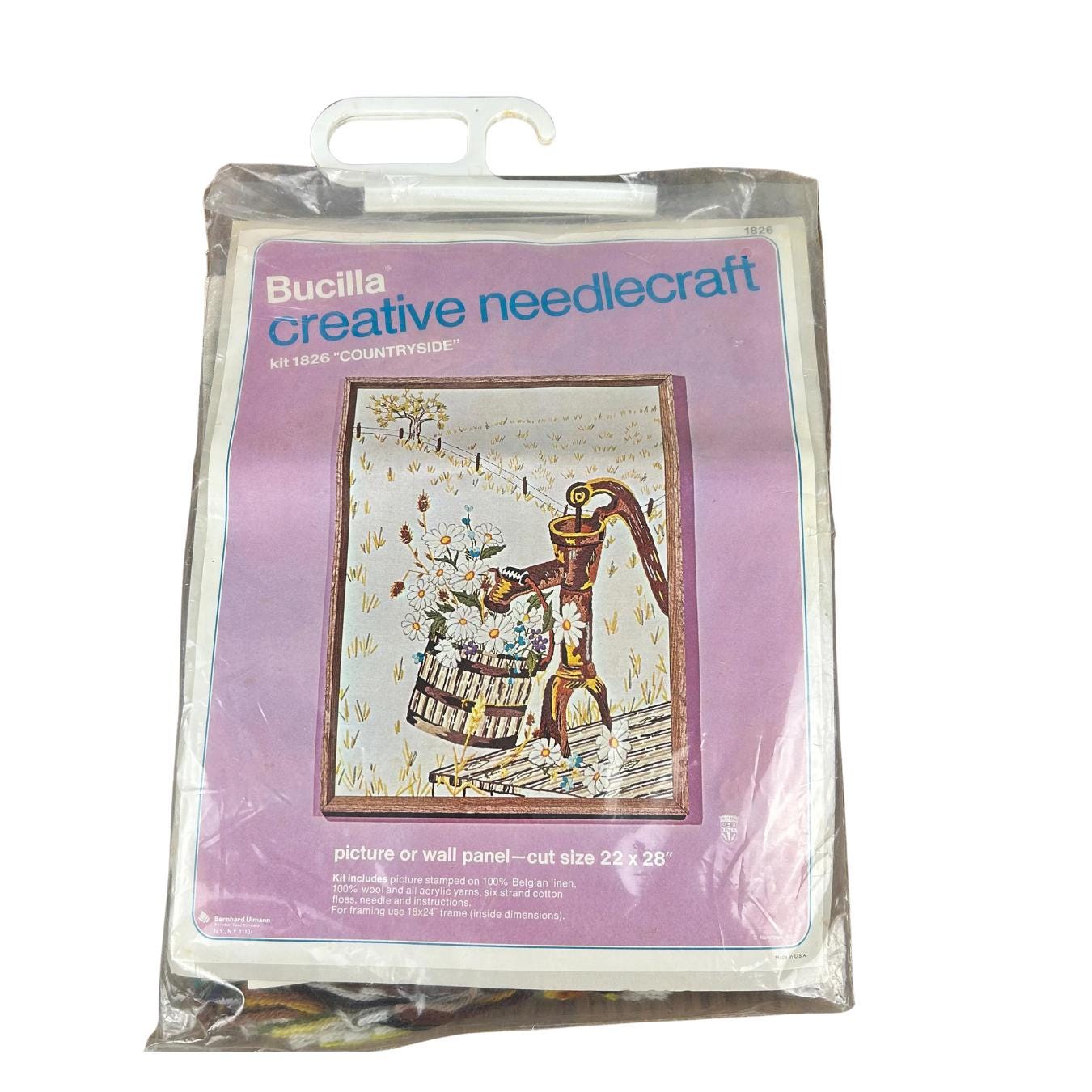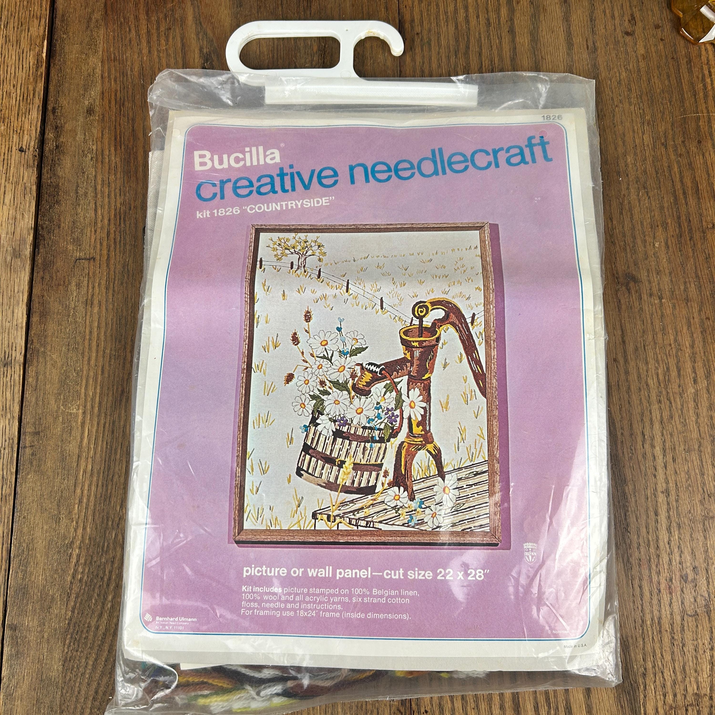 Bucilla Creative Needlecraft Kit 1826, ‘Countryside’. Kit includes picture stamped on 100% Belgian linen, 100% wool and acrylic yarns, 6 thread cotton floss, needle and instructions. For framing in 18" x 24" frame. Embroidery hoop is not included.