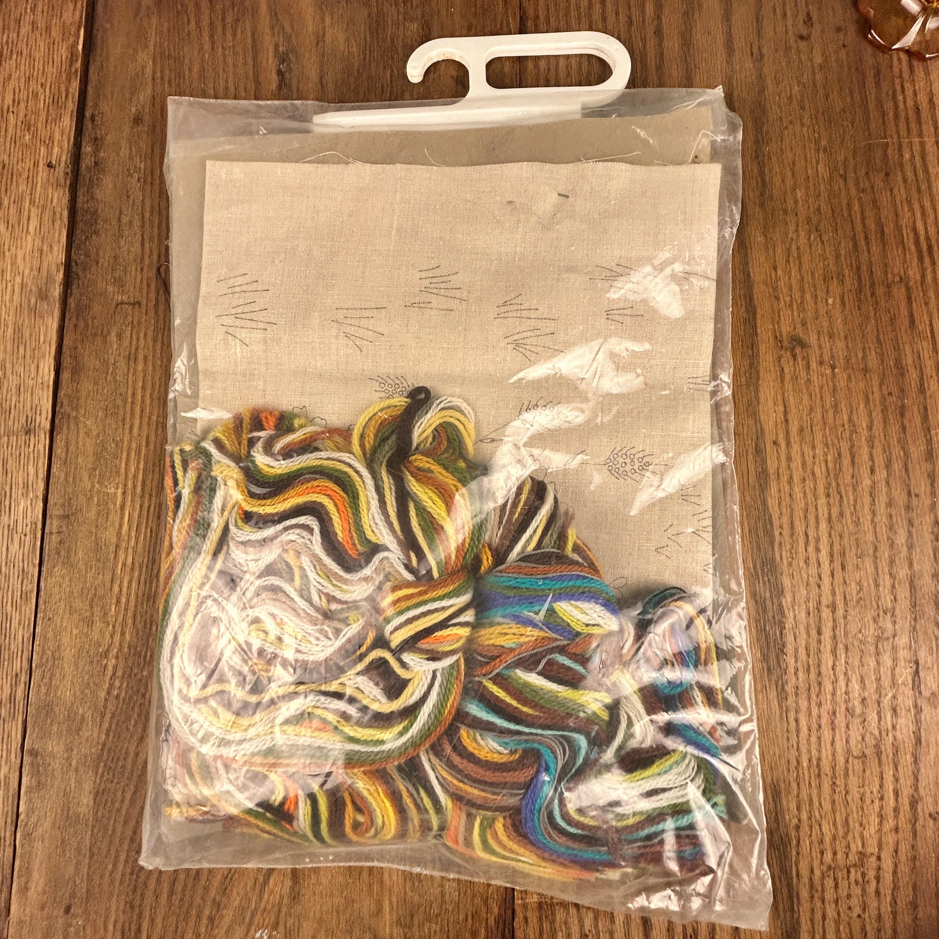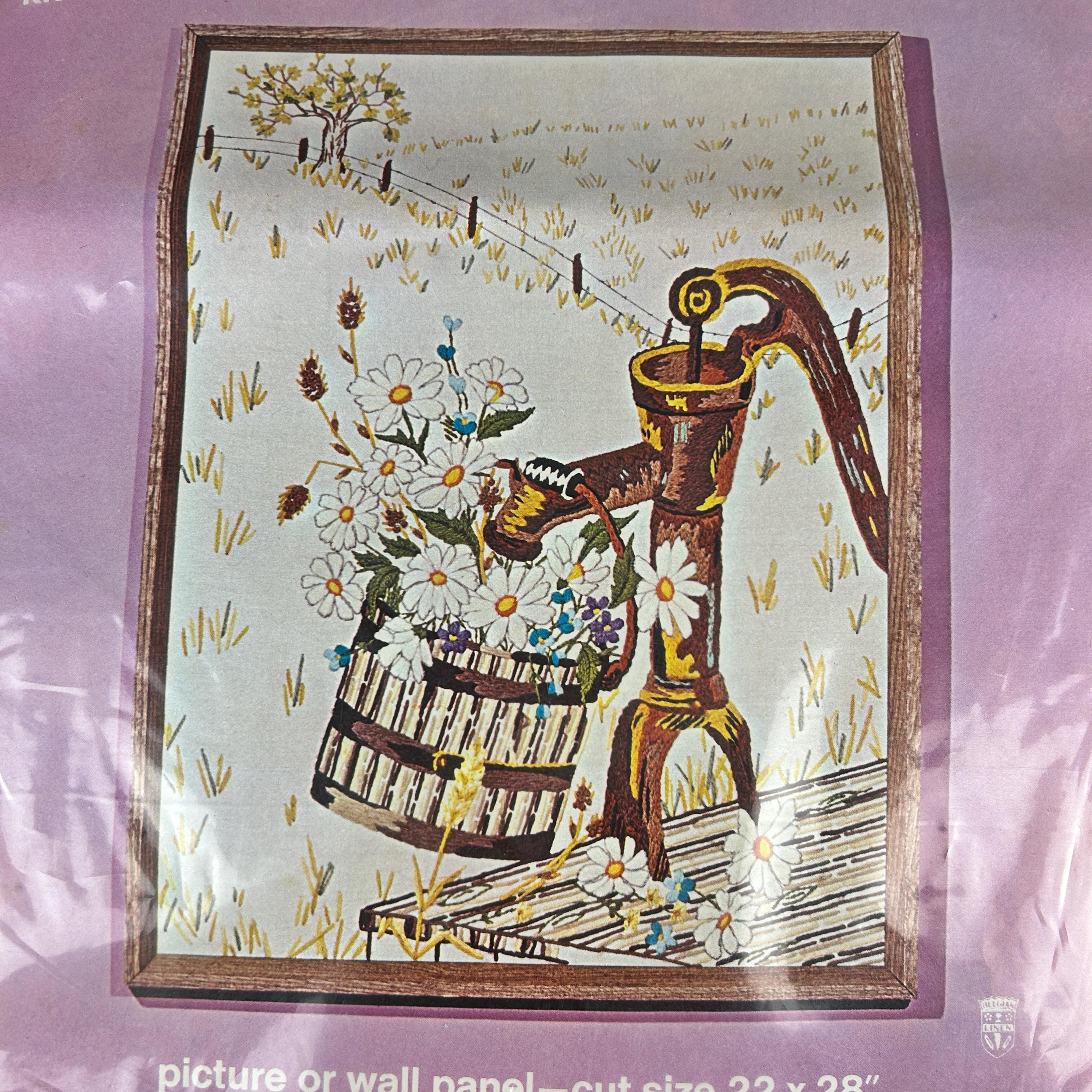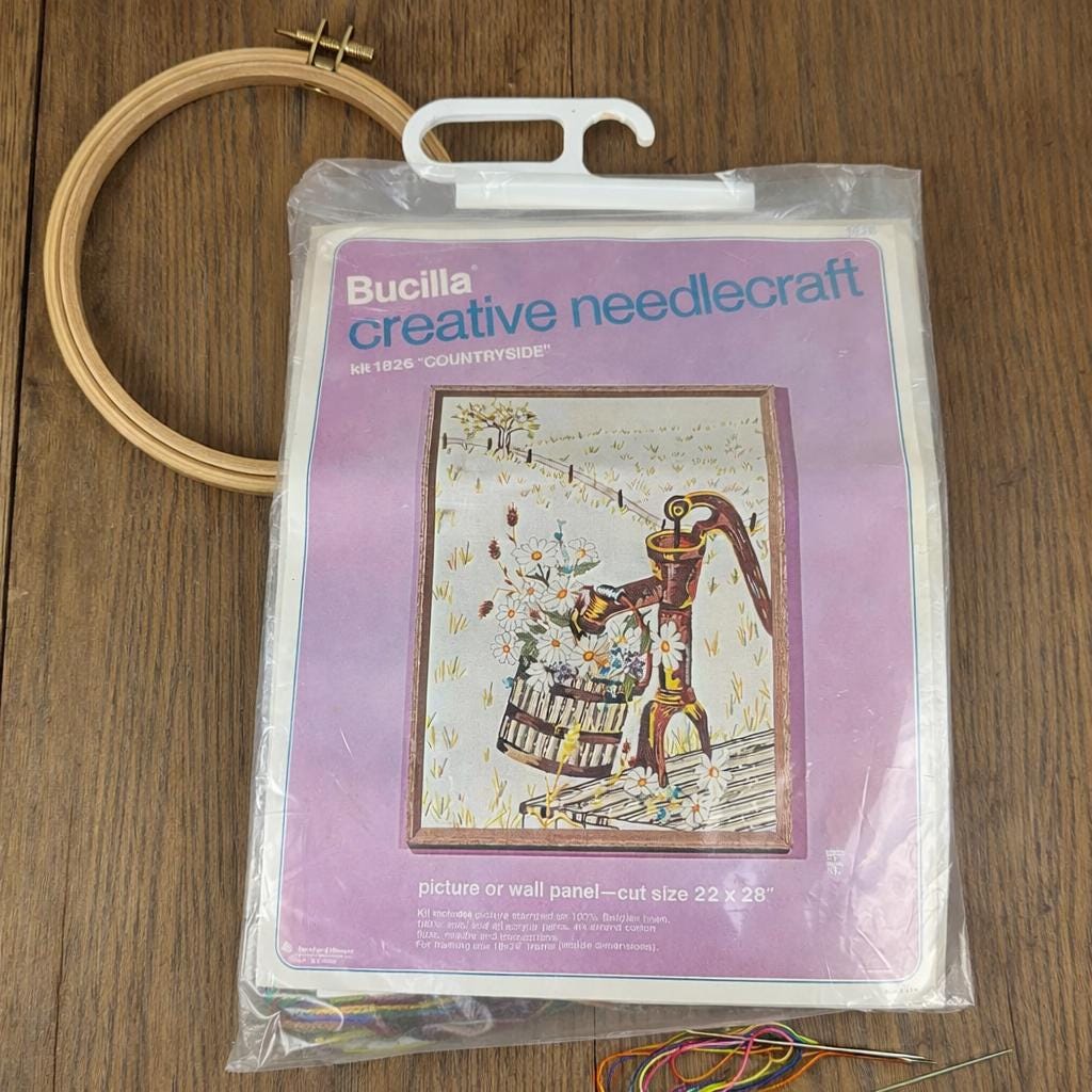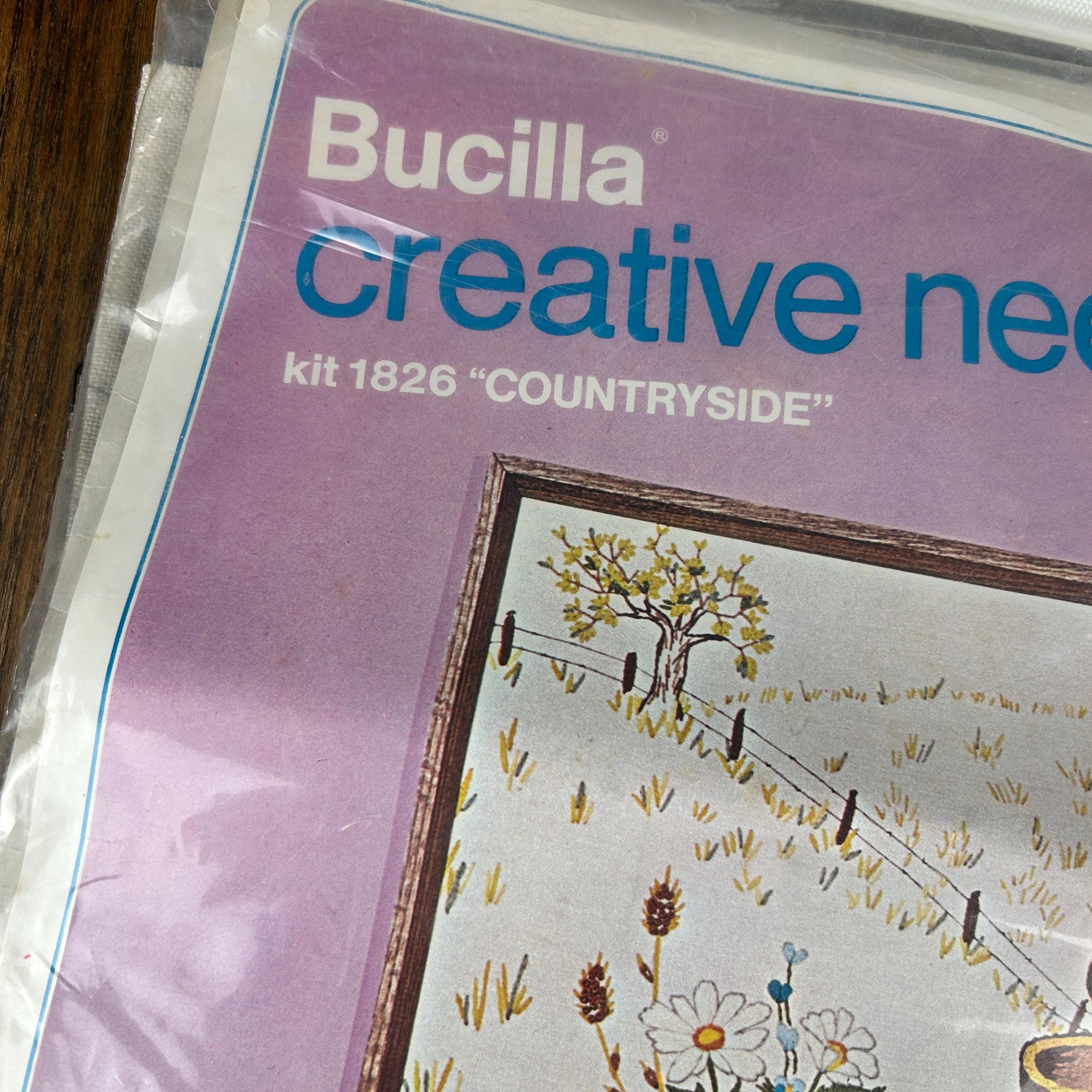 Bucilla Creative Needlecraft Kit 1826, ‘Countryside’. Kit includes picture stamped on 100% Belgian linen, 100% wool and acrylic yarns, 6 thread cotton floss, needle and instructions. For framing in 18" x 24" frame. Embroidery hoop is not included.