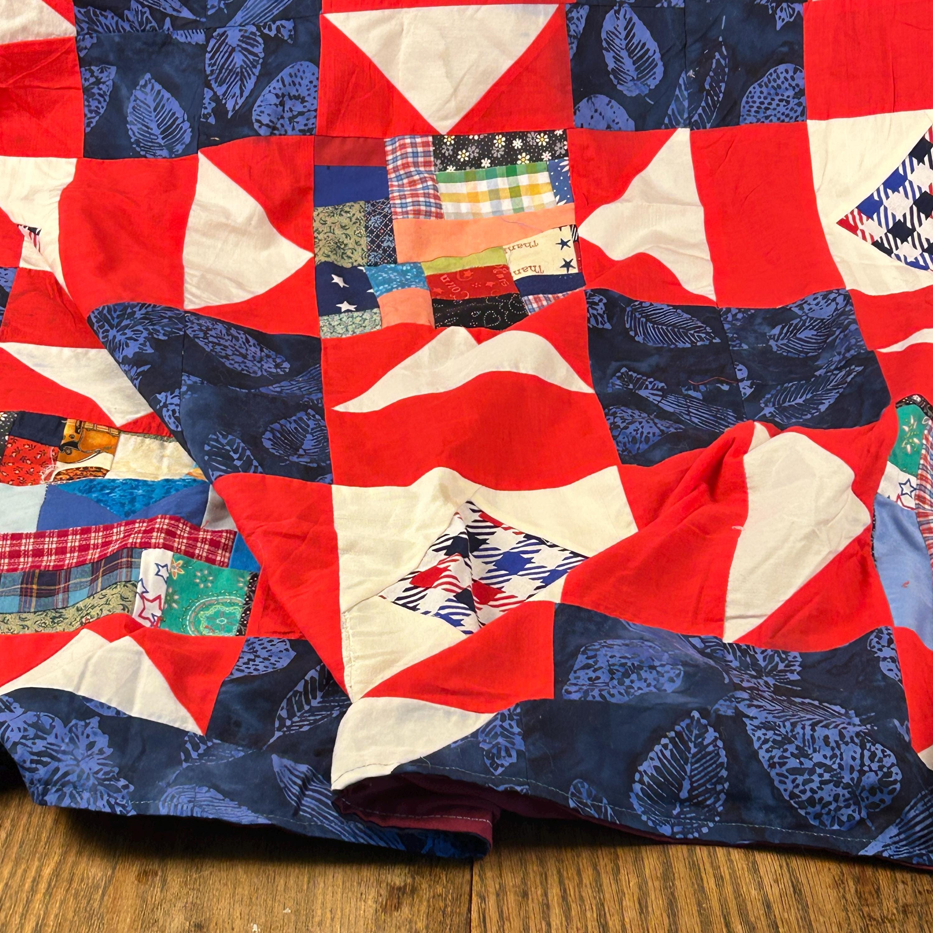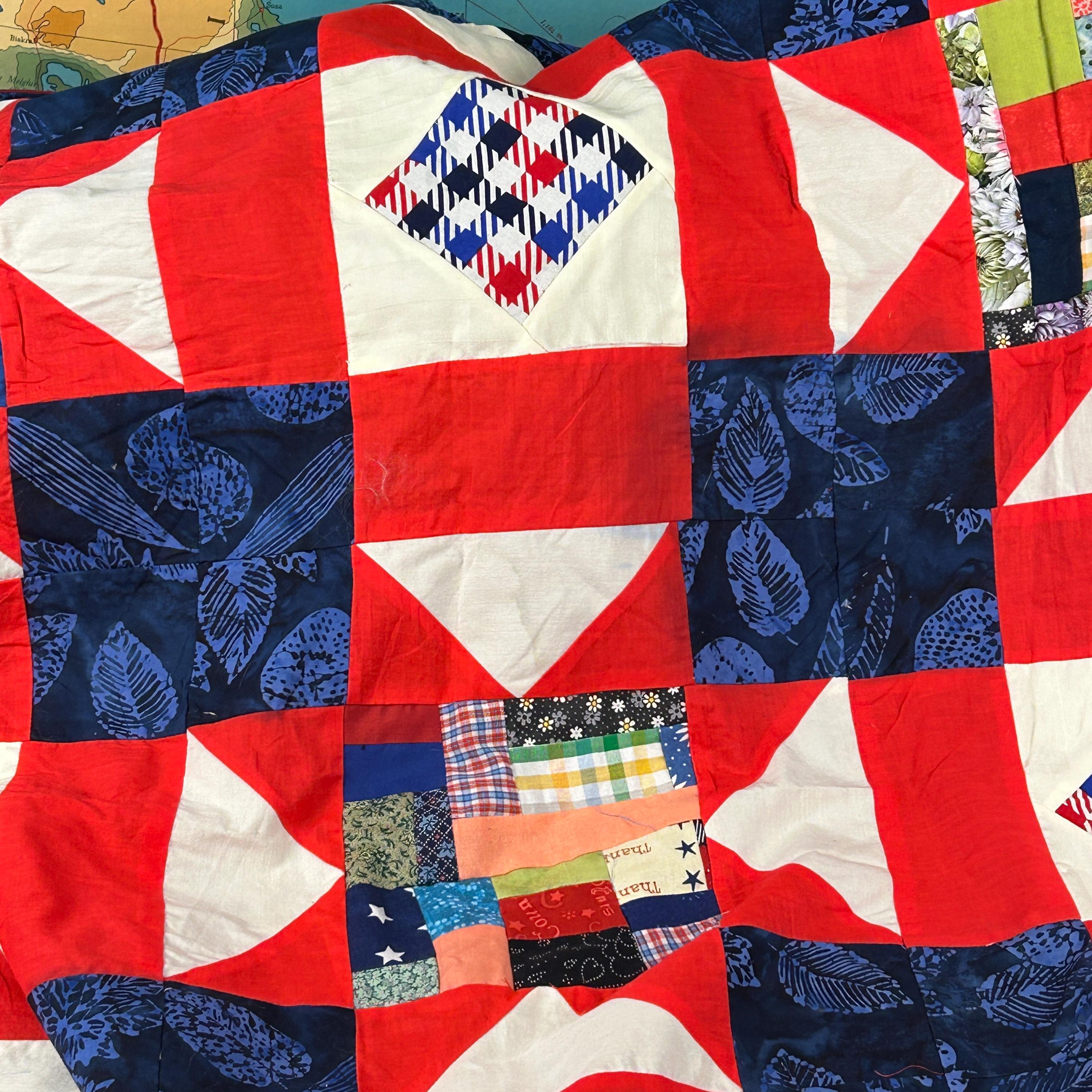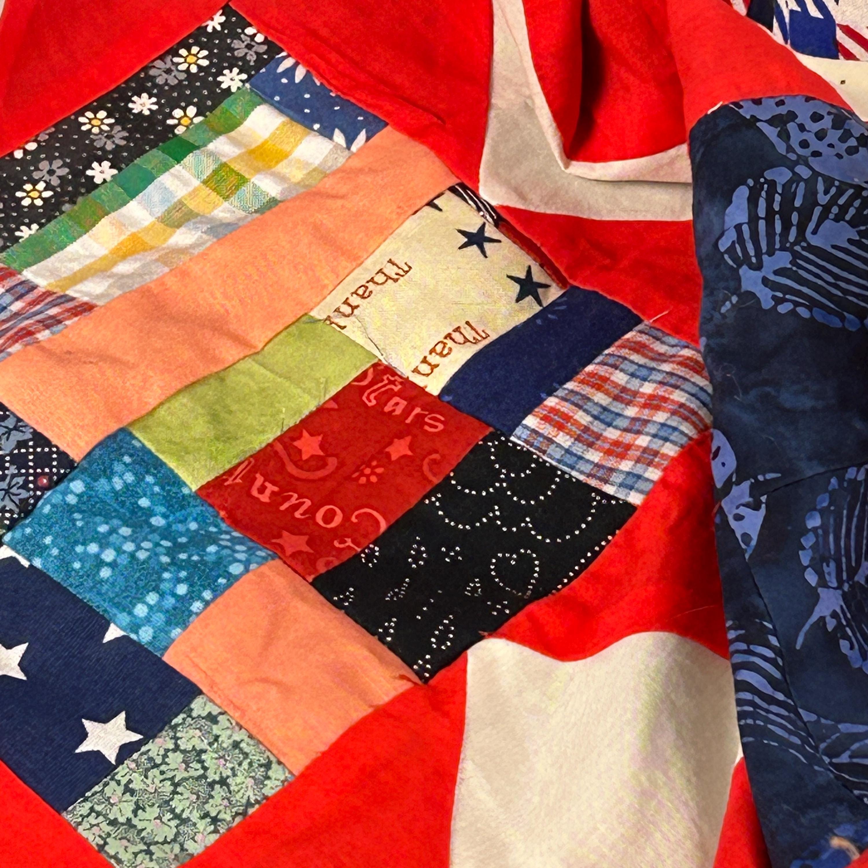 The use of various blue, white, and red fabrics, including patterns like stars and stripes, contributes to a patriotic aesthetic, commonly associated with "Quilts of Valor" which are made to honor service members.