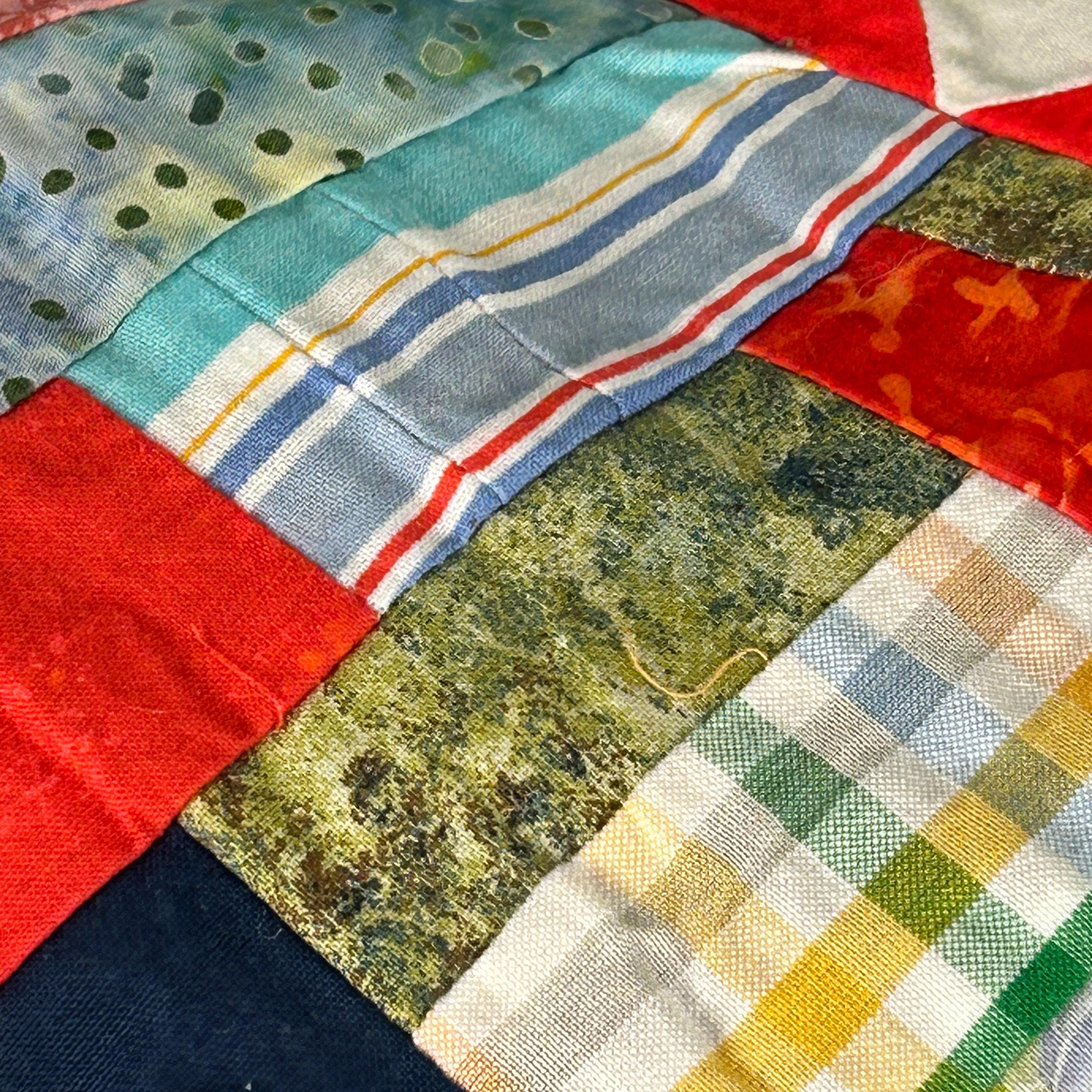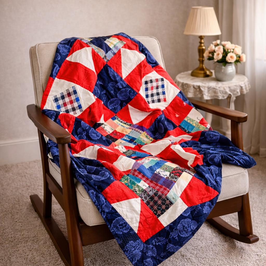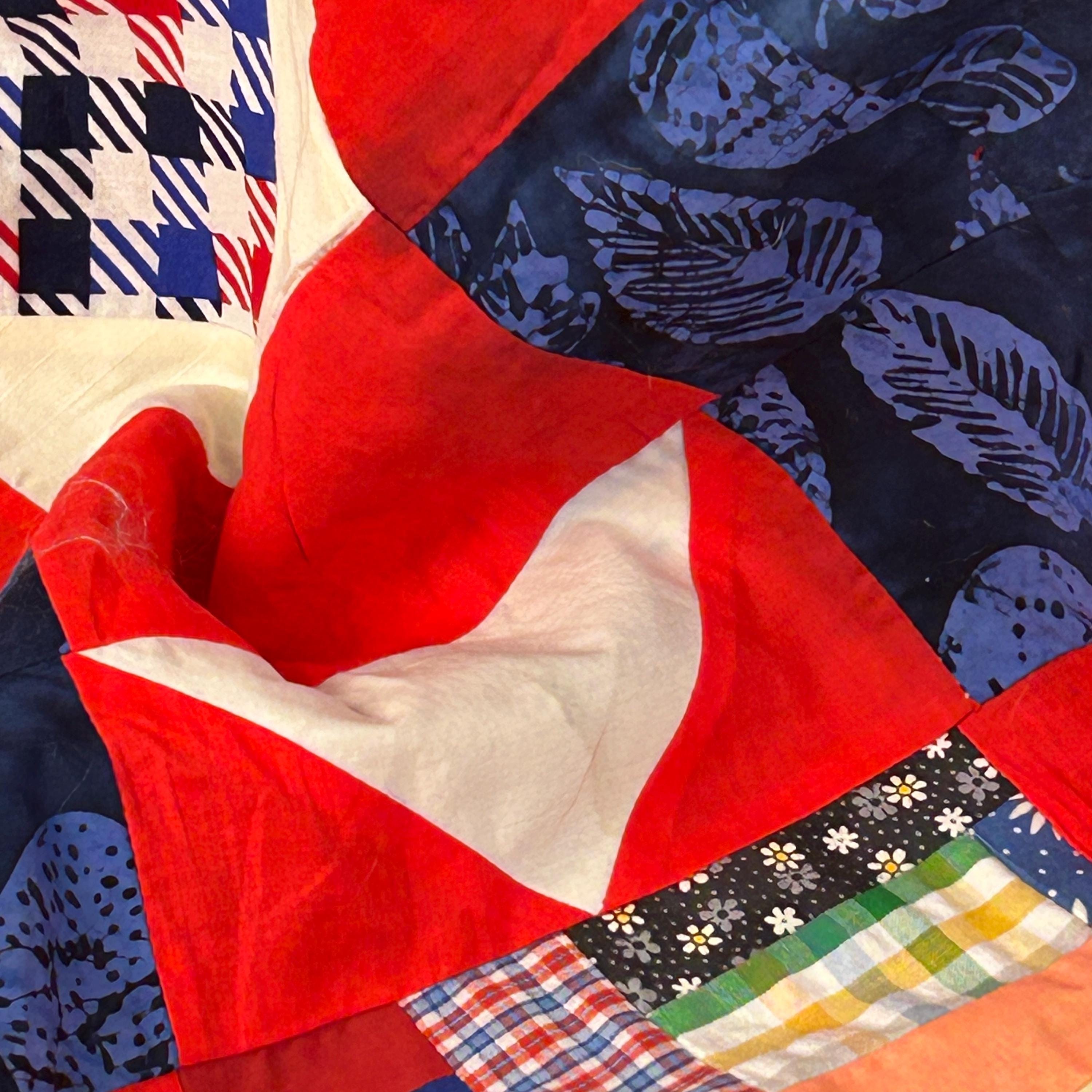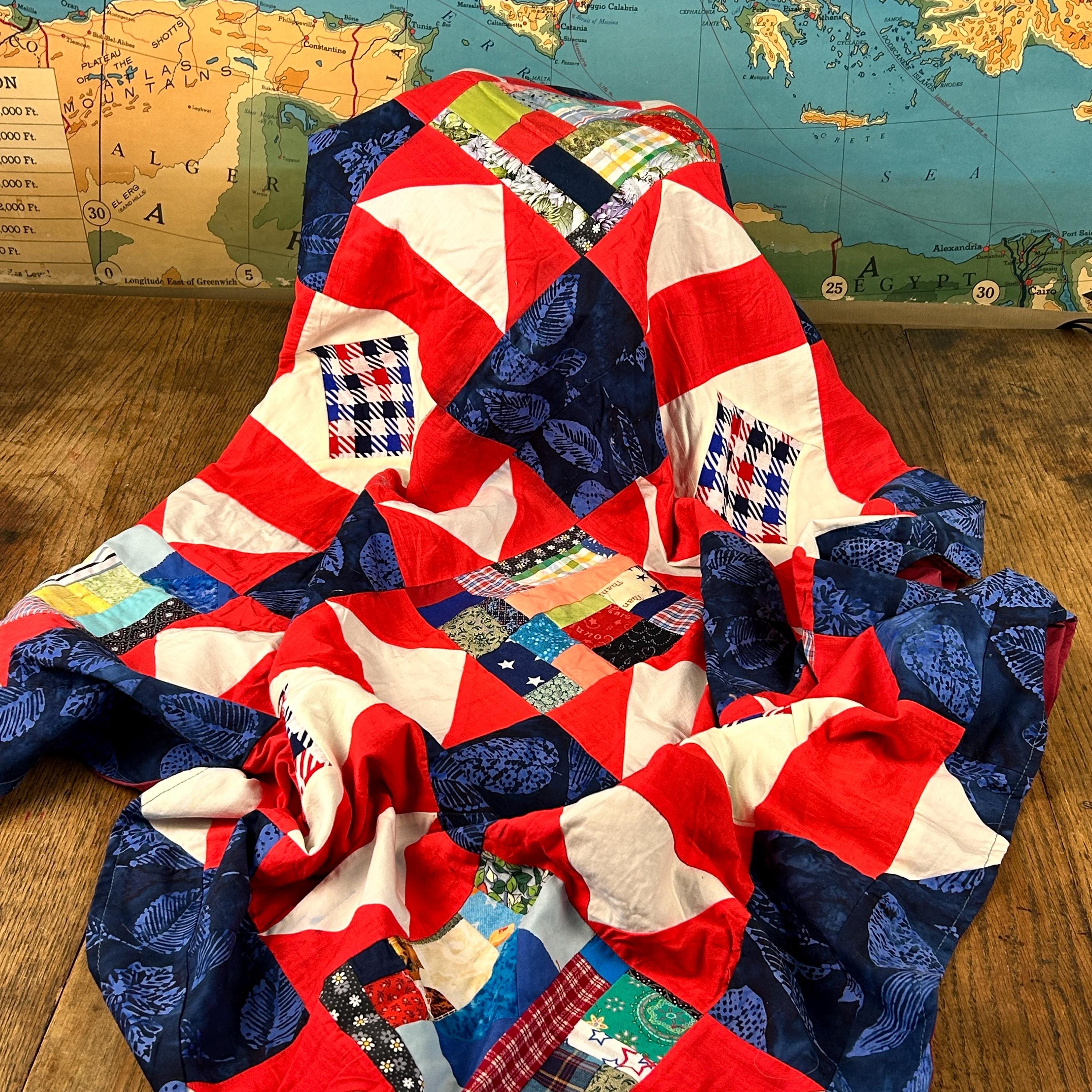 The use of various blue, white, and red fabrics, including patterns like stars and stripes, contributes to a patriotic aesthetic, commonly associated with "Quilts of Valor" which are made to honor service members.