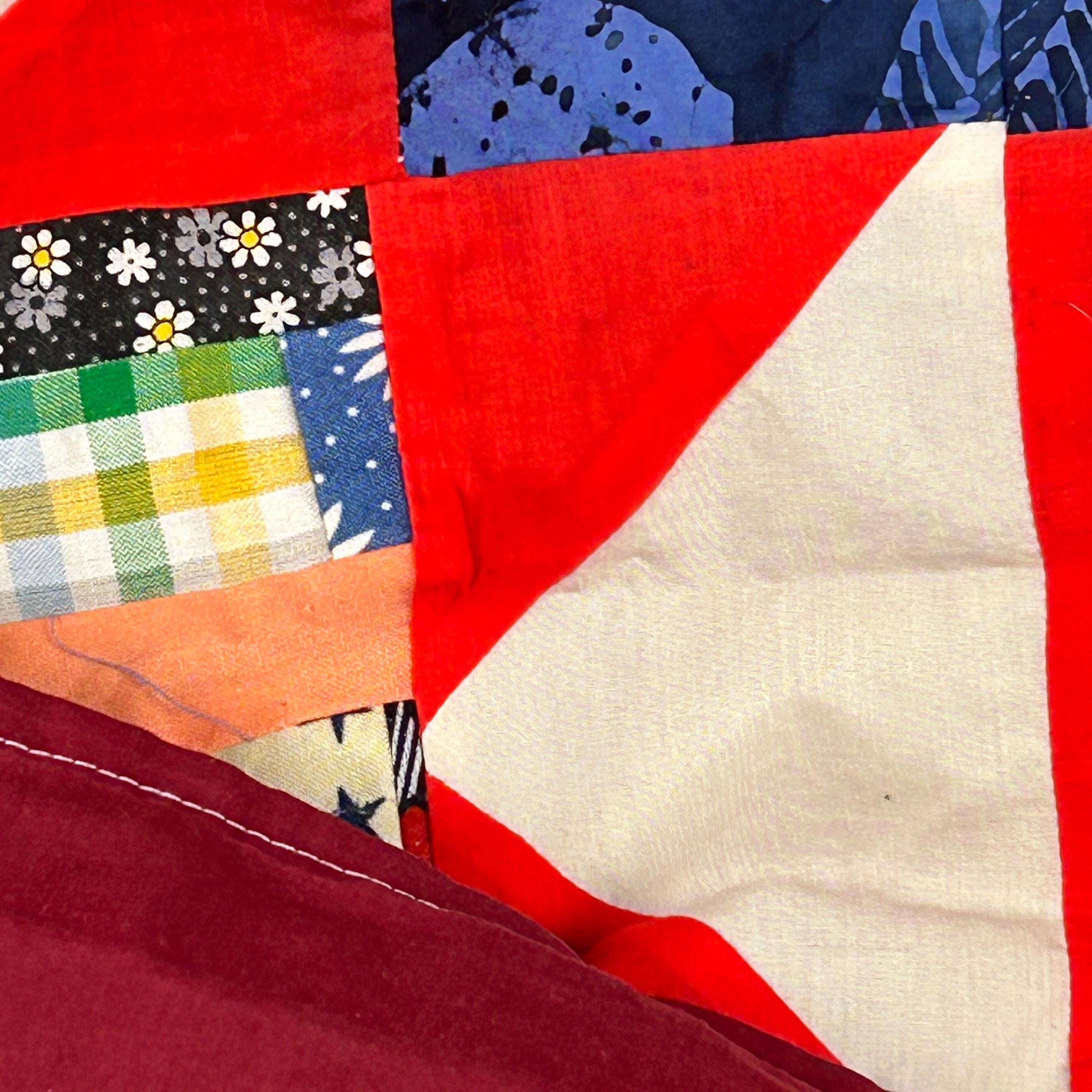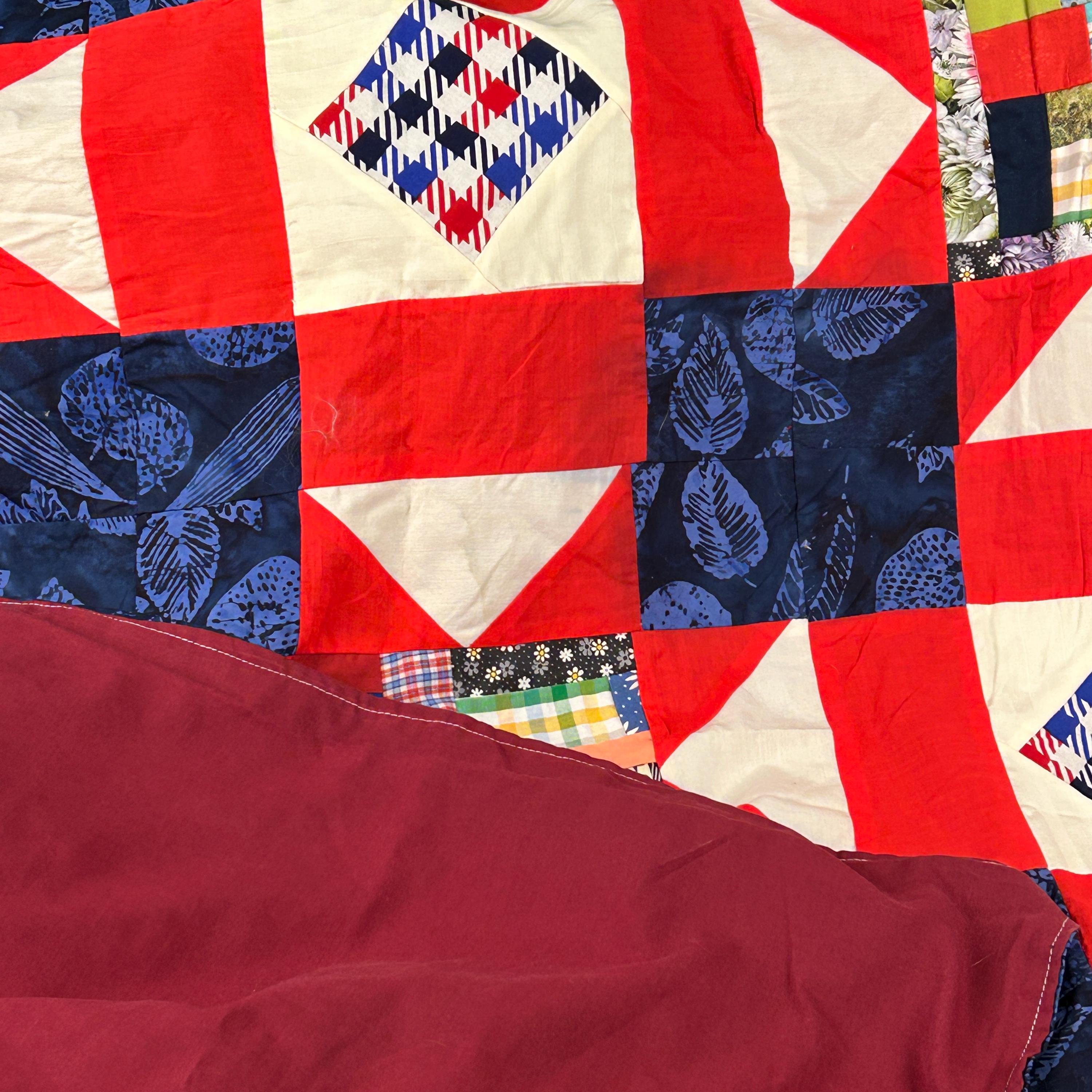 This beautiful lap quilt will add lots of patriotic décor or warm anyone up when they are feeling a chill. It is a quilt pattern with main blocks of multi-colored 4th of July printed cotton blocks surrounded with with red, white and blue cotton fabric pieces. The quilt is trimmed in dark blue printed fabric. It is backed with a solid dark red cotton fabric. This would an excellent gift for 4th of July, a housewarming gift, or a gift for any occasion of someone that loves quilted lap blankets.