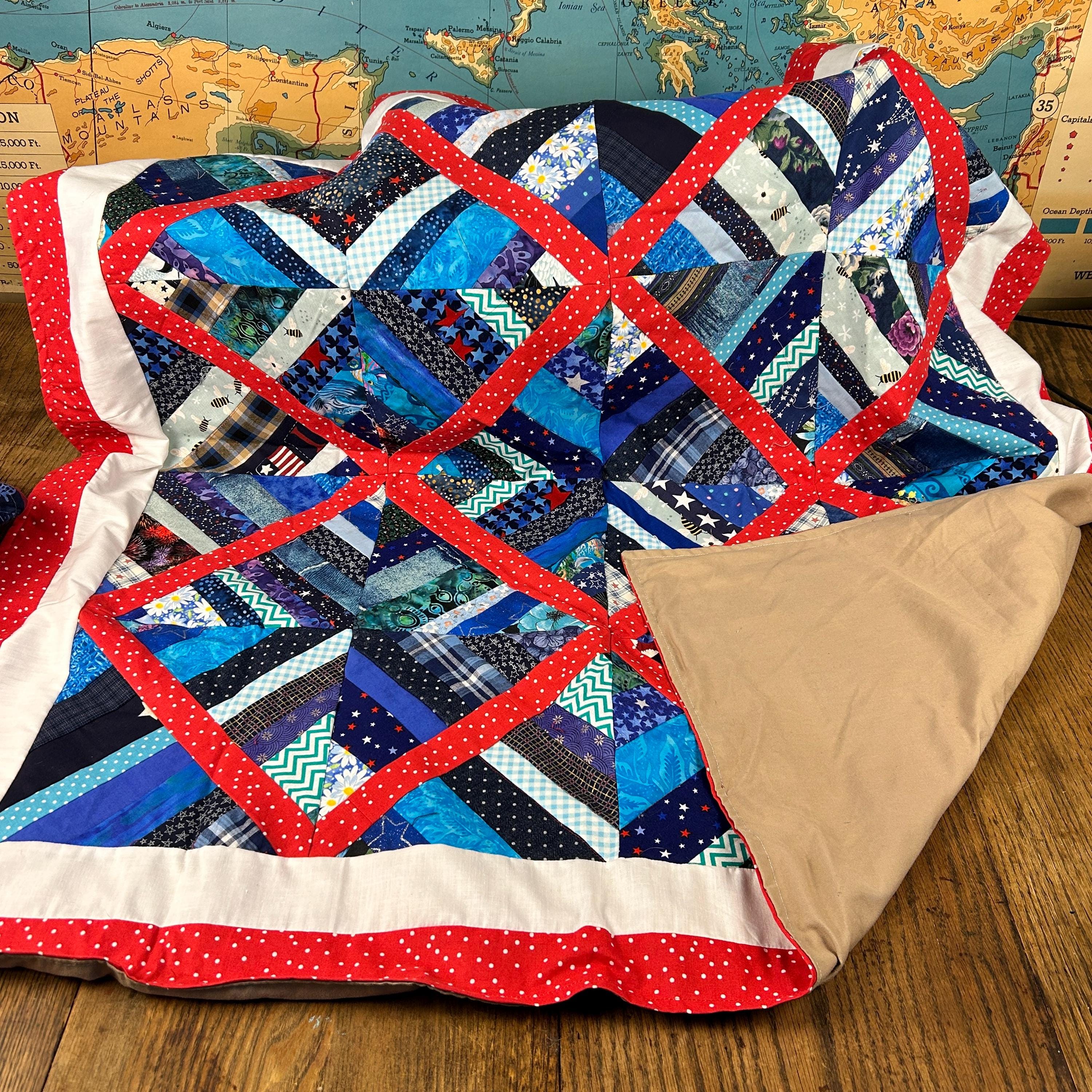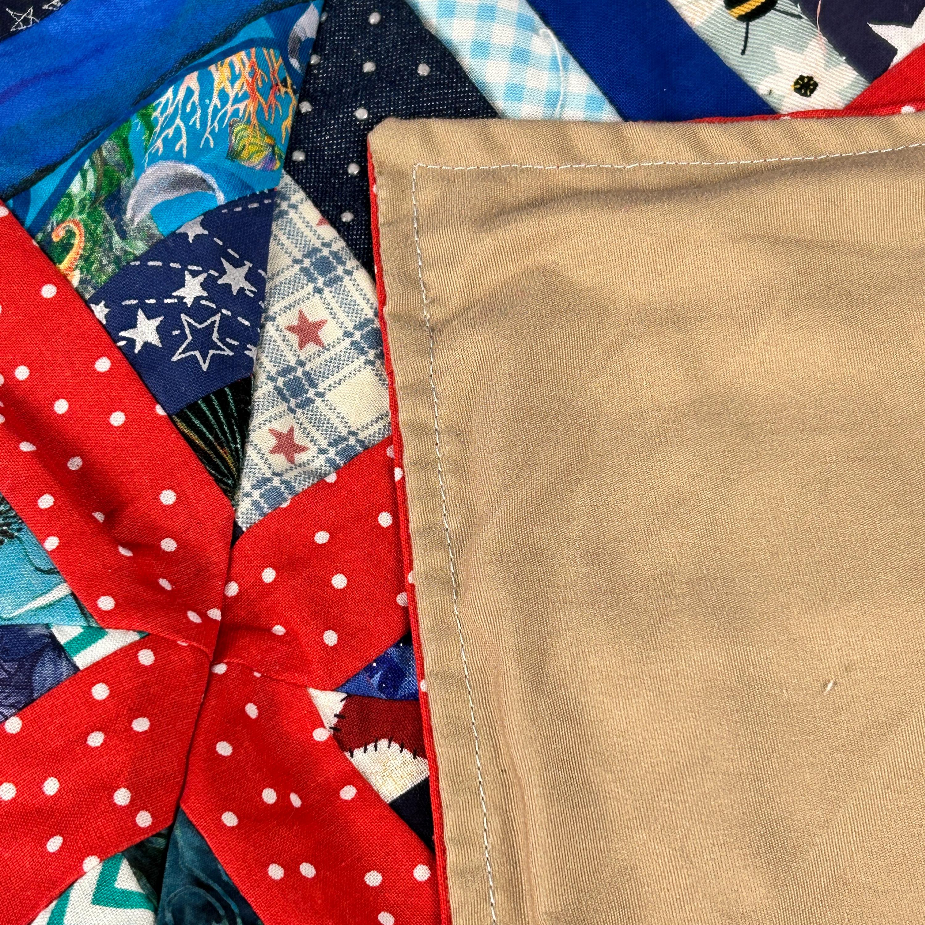 This beautiful lap quilt will add lots of patriotic décor or warm anyone up when they are feeling a chill. It is a quilt pattern with main blocks of multi-colored 4th of July printed cotton blocks surrounded with offset red polka dotted cotton fabric pieces. The quilt is framed in white cotton fabric and is trimmed in the red polka dotted fabric. It is backed with a solid beige cotton fabric. This would an excellent gift for 4th of July, a housewarming gift, or a gift for any occasion of someone that loves quilted lap blankets.