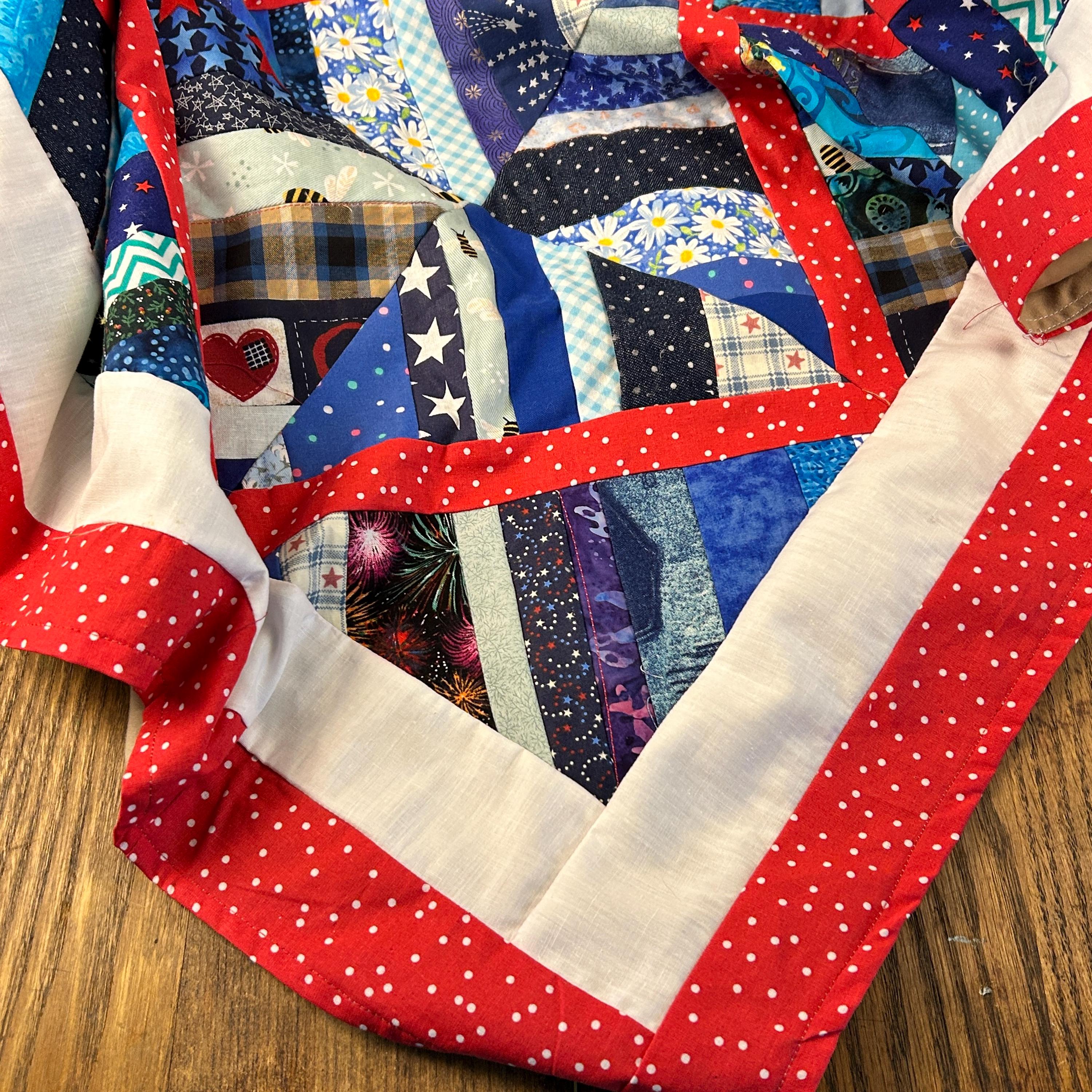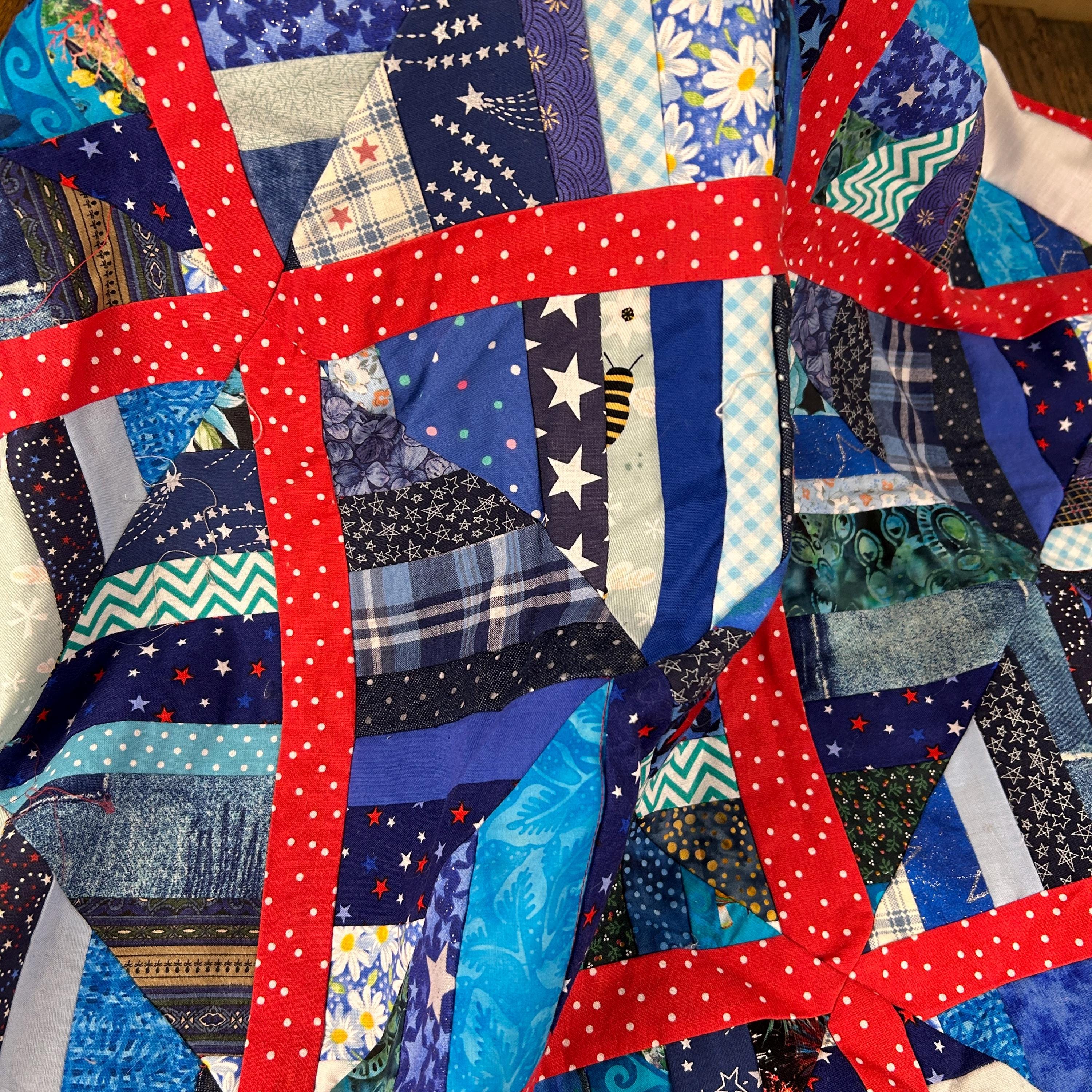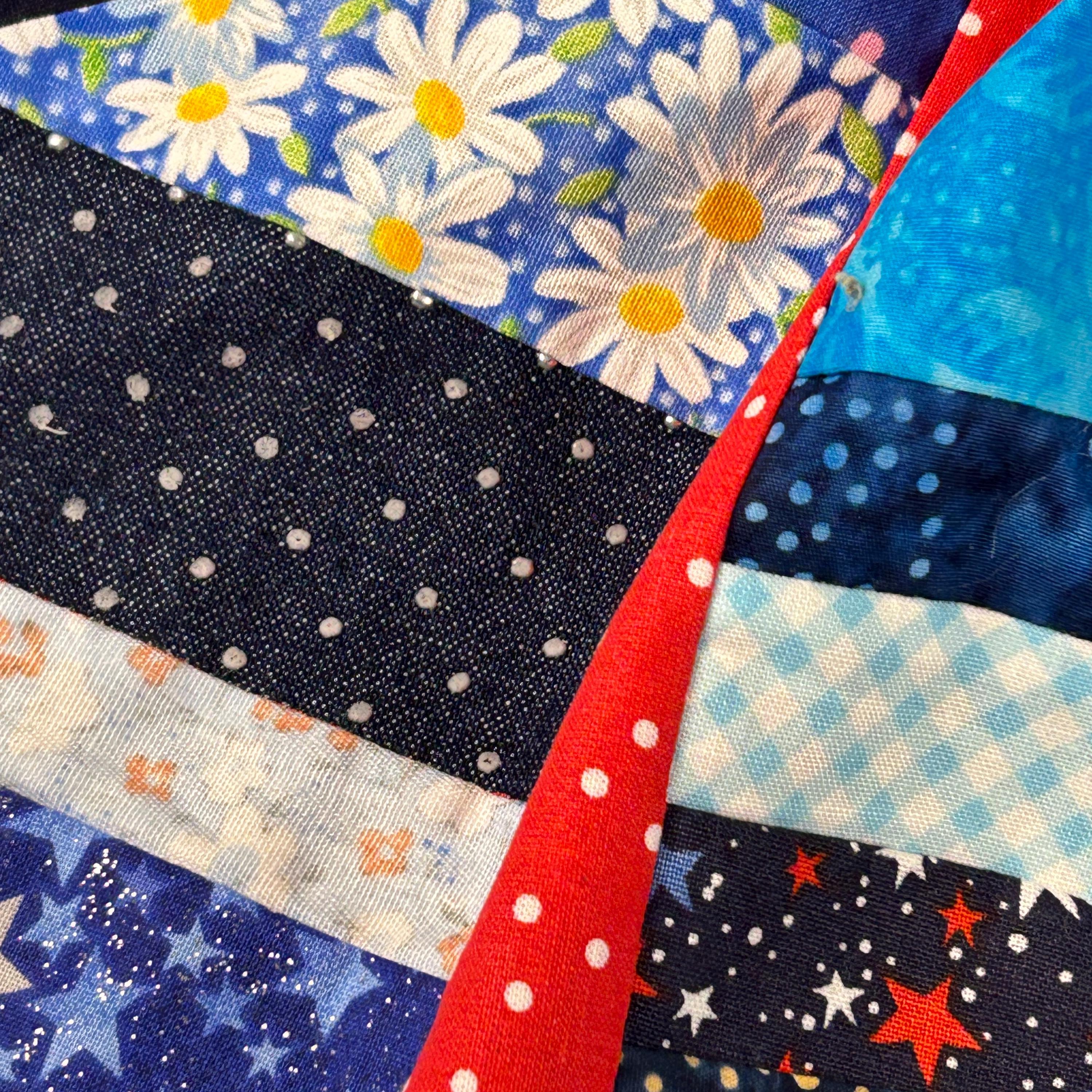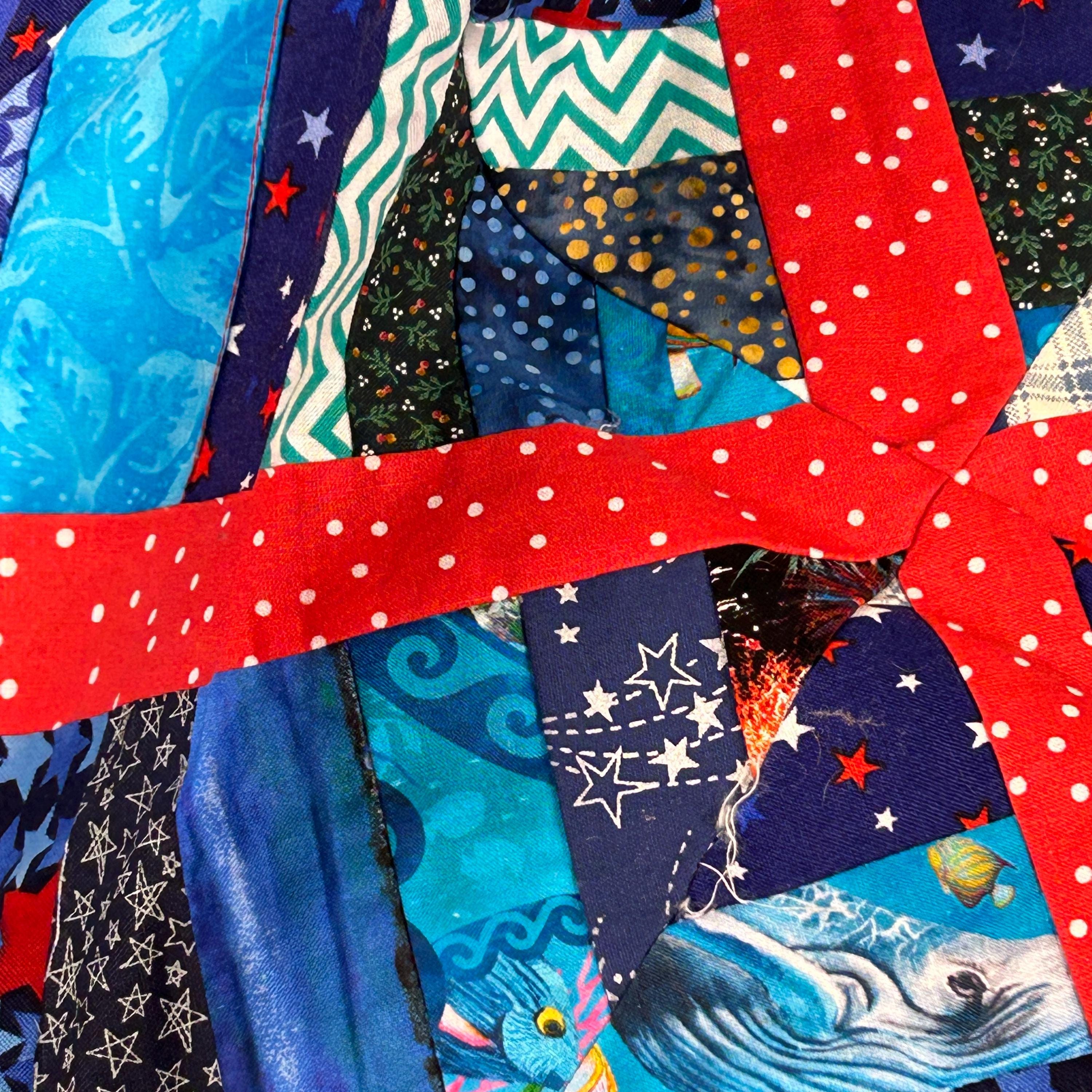 The use of various blue, white, and red fabrics, including patterns like stars and stripes, contributes to a patriotic aesthetic, commonly associated with "Quilts of Valor" which are made to honor service members.