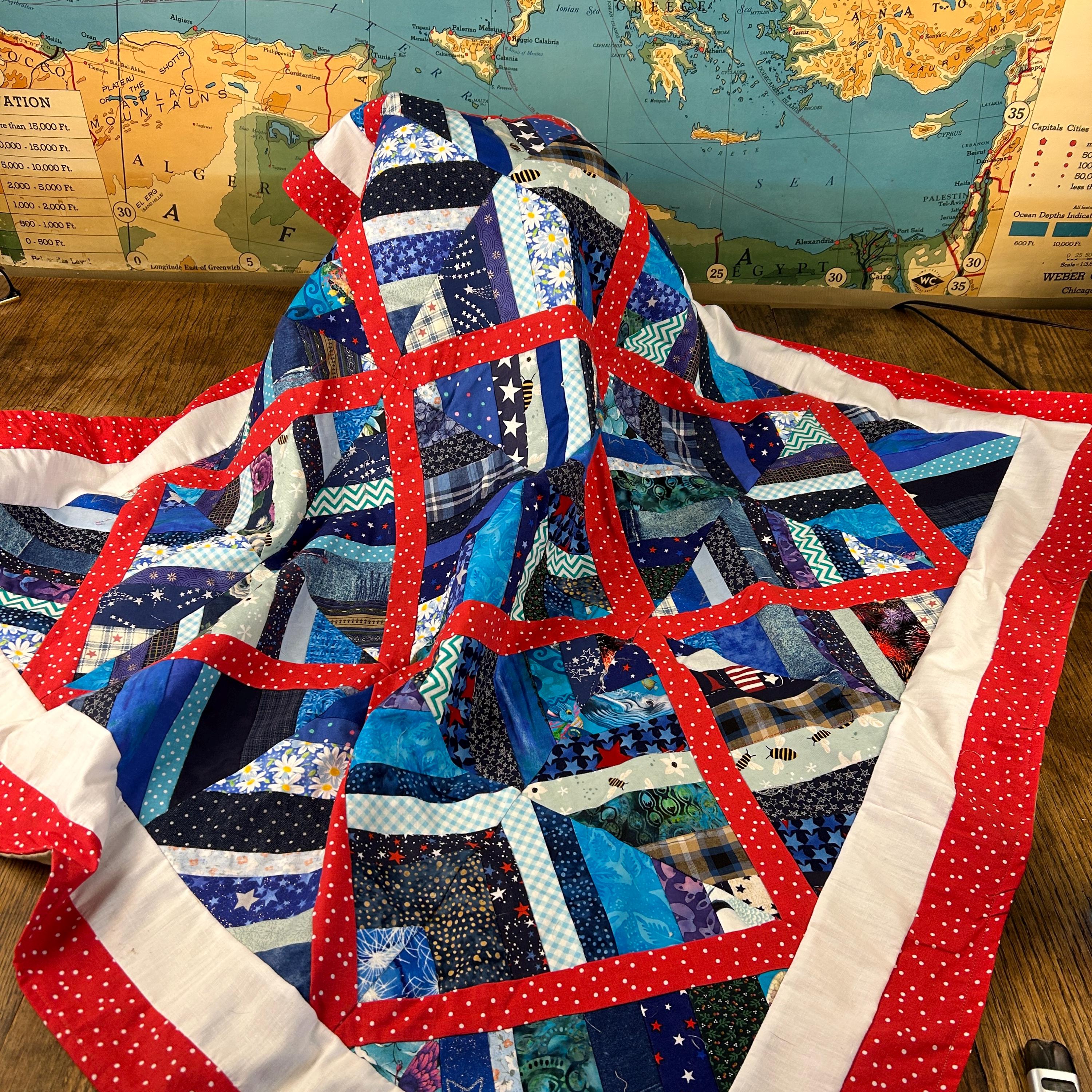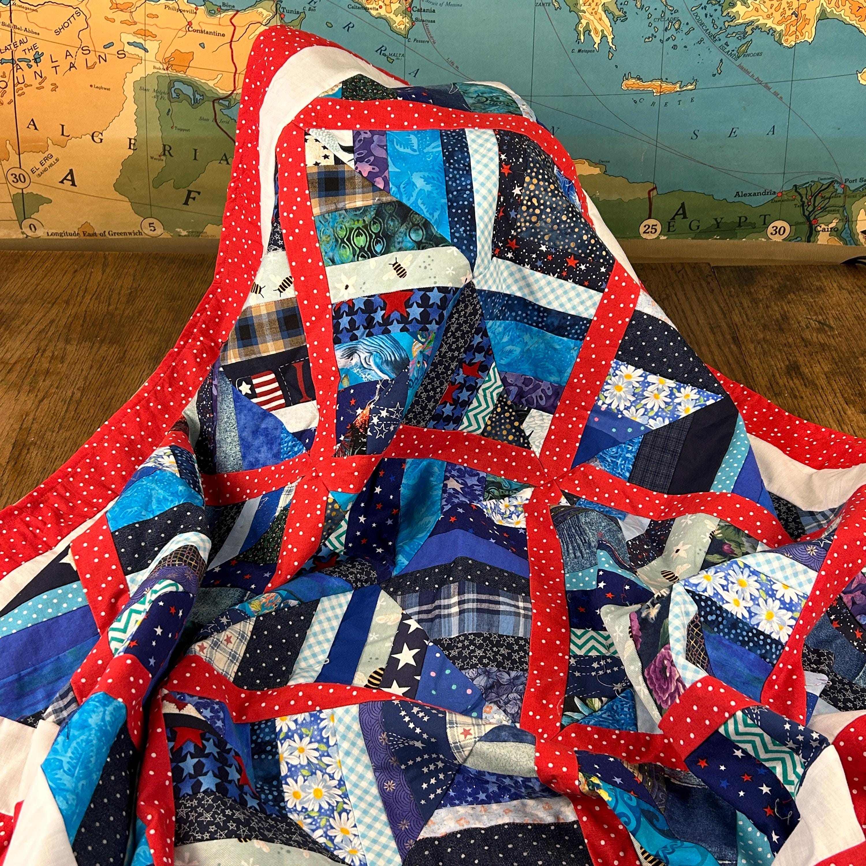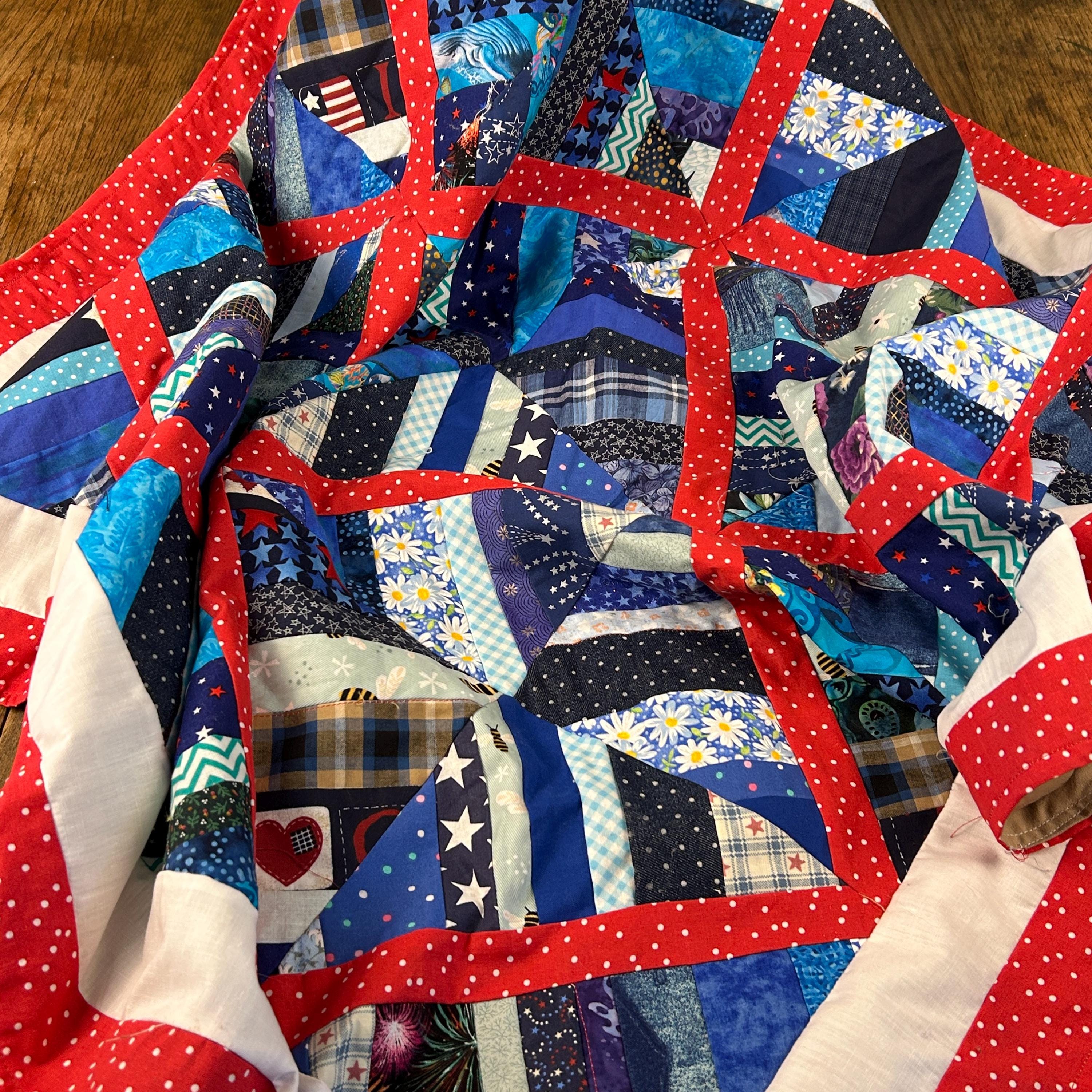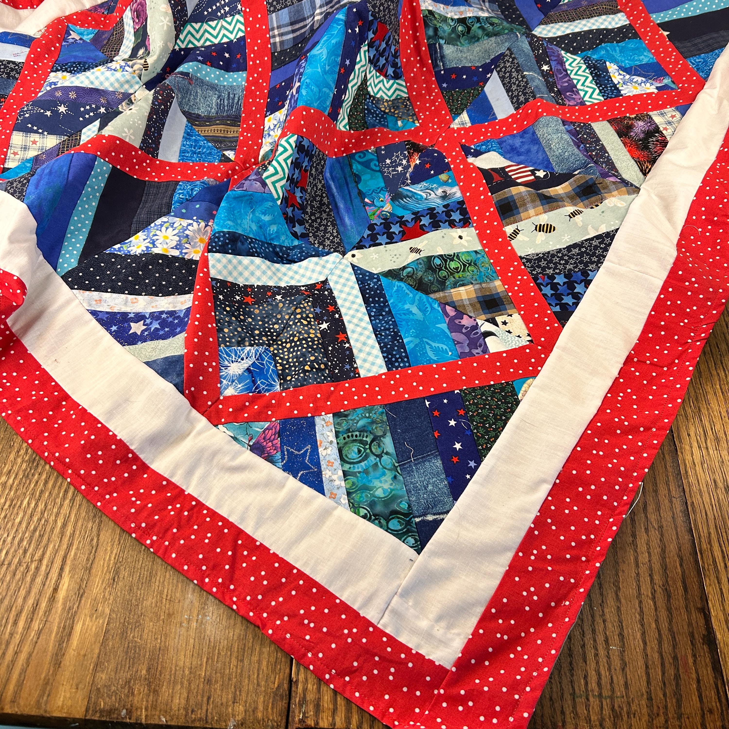 The use of various blue, white, and red fabrics, including patterns like stars and stripes, contributes to a patriotic aesthetic, commonly associated with "Quilts of Valor" which are made to honor service members.