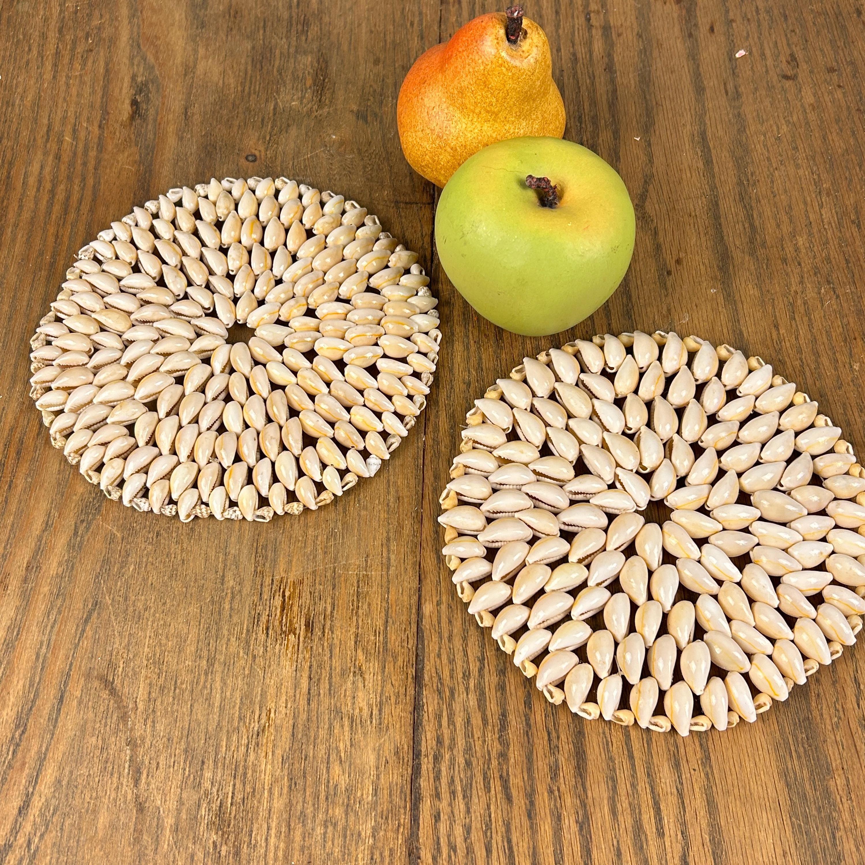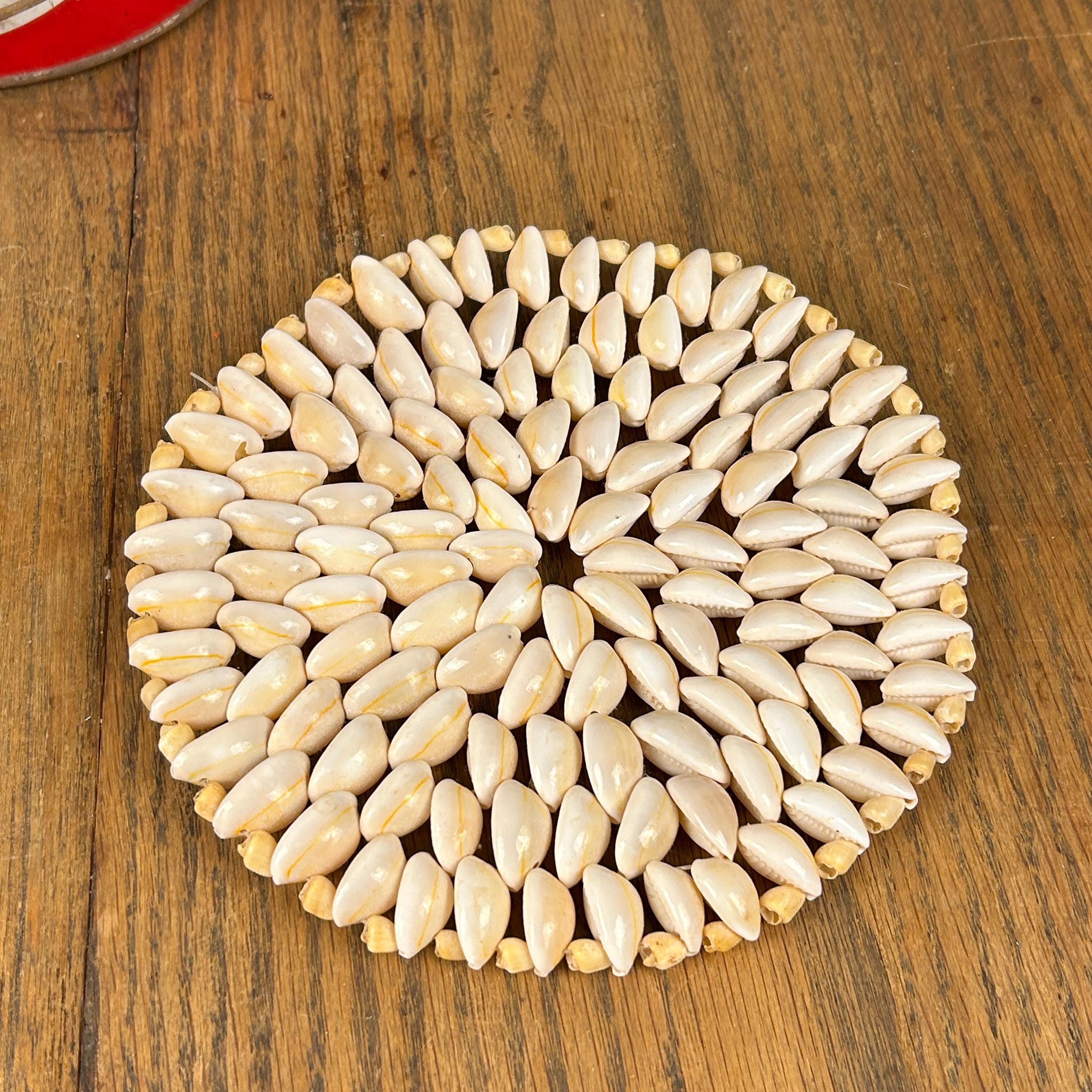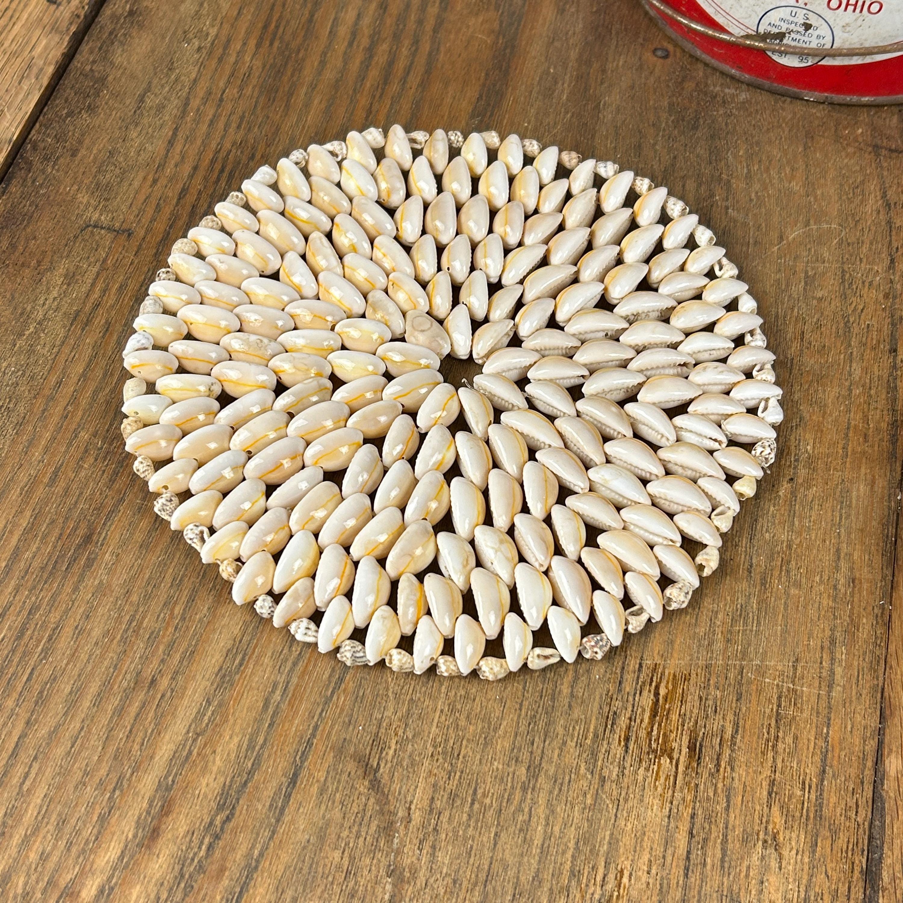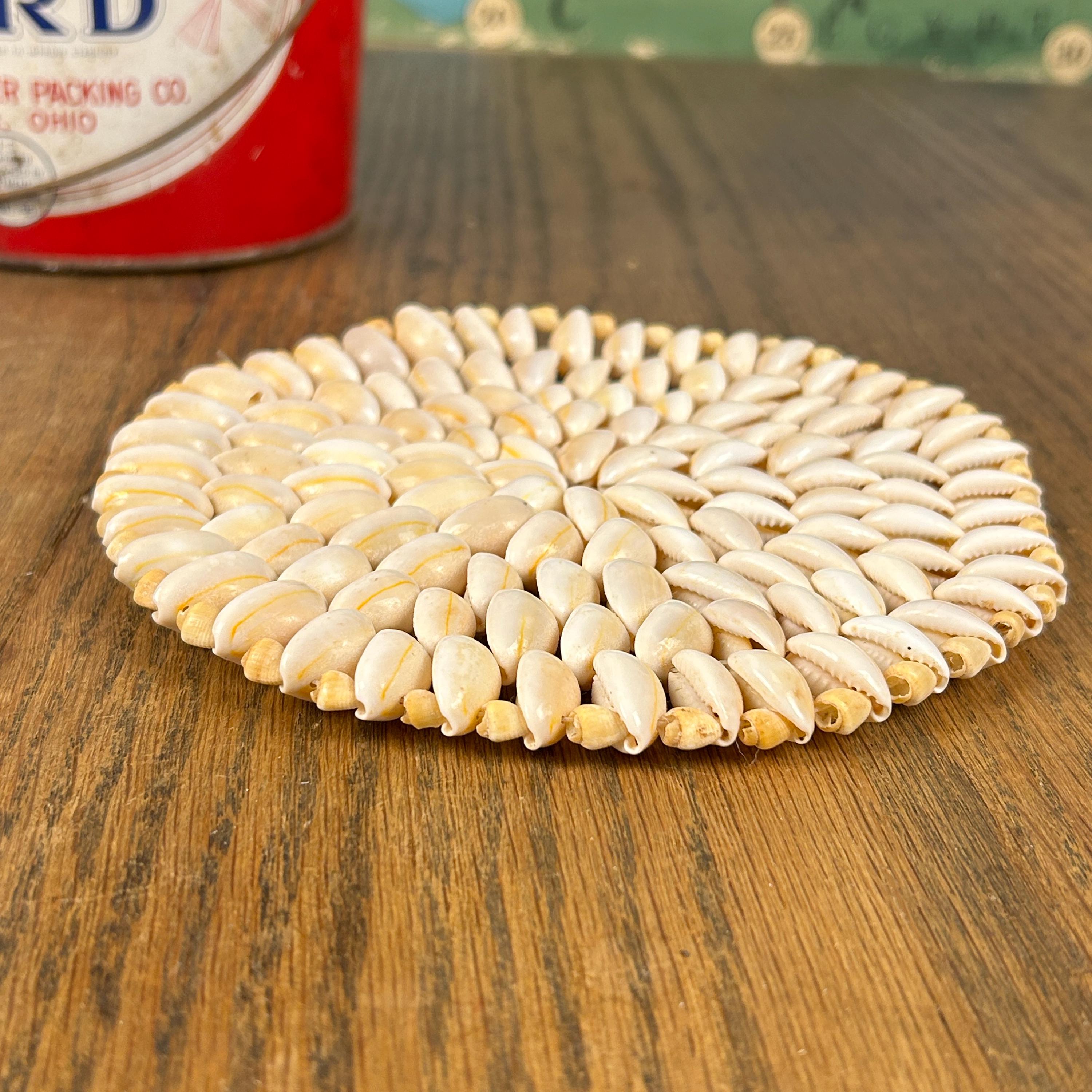 Add a touch of boho charm to your home with this beautiful set of two vintage cowrie shell trivets. Lovingly handcrafted, each trivet is made with meticulously arranged natural cowrie shells, showcasing their organic beauty and unique variations in creamy white and soft beige tones. The set includes two round trivets. These trivets are perfect for a beach-themed kitchen, a bohemian dining table, or as eye-catching wall decor.