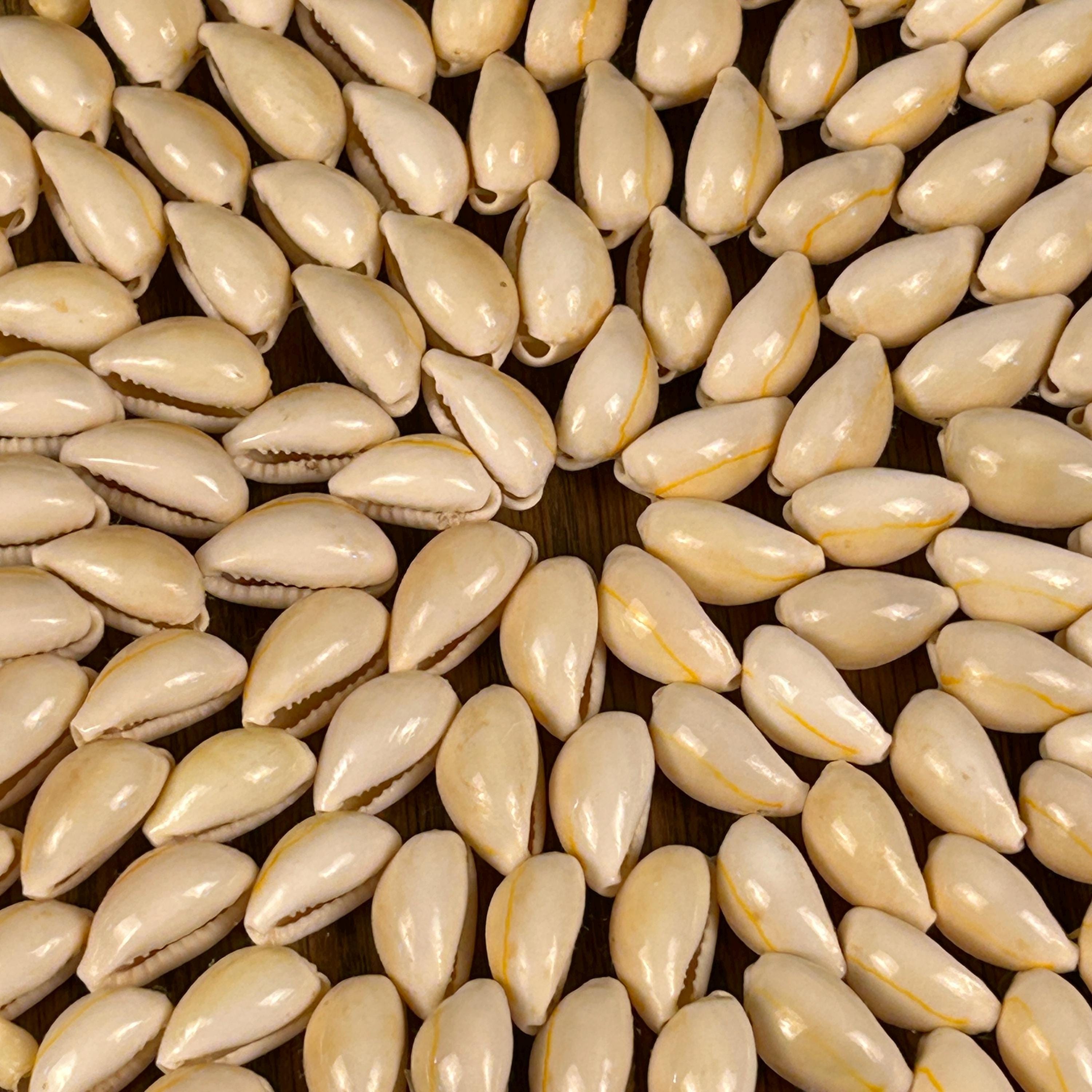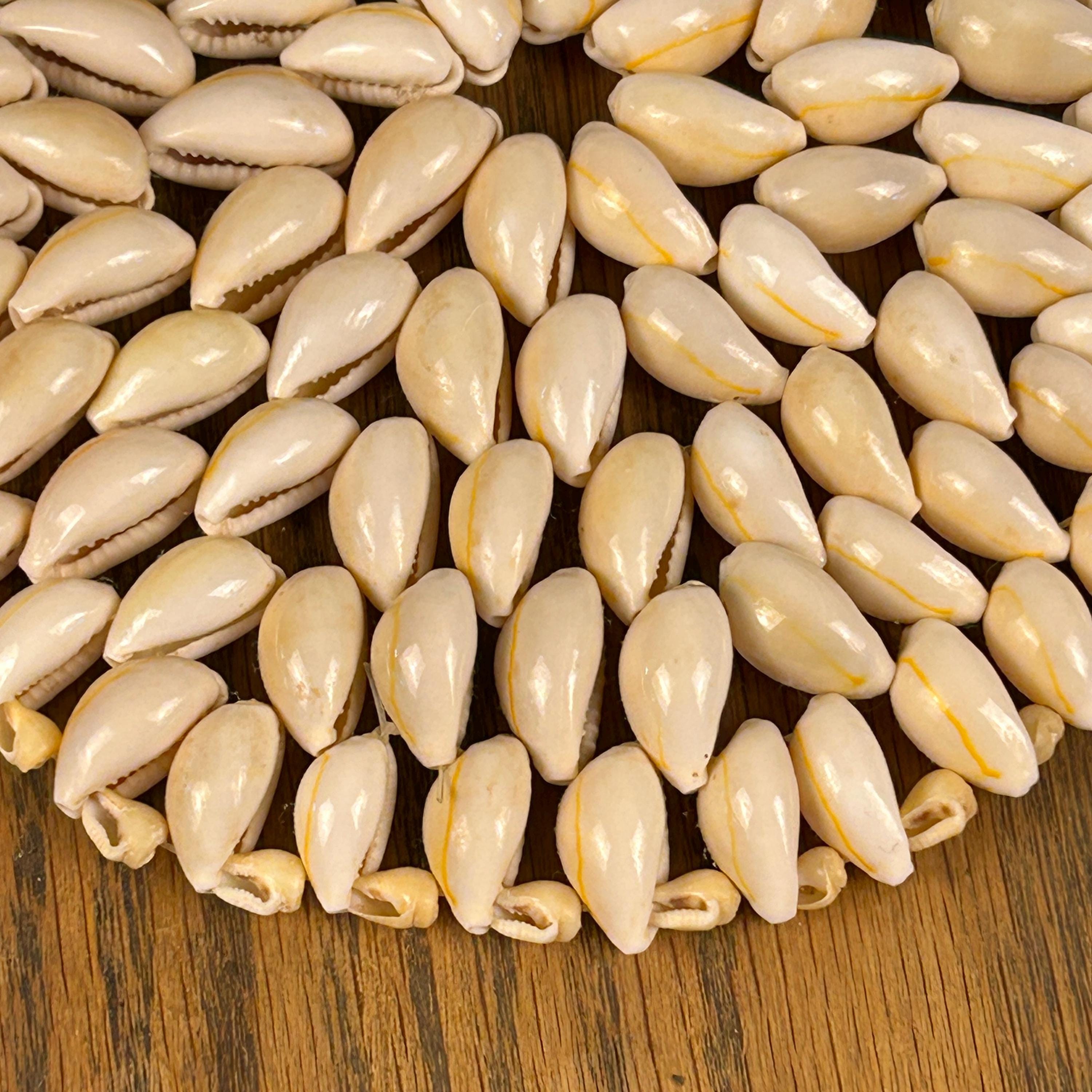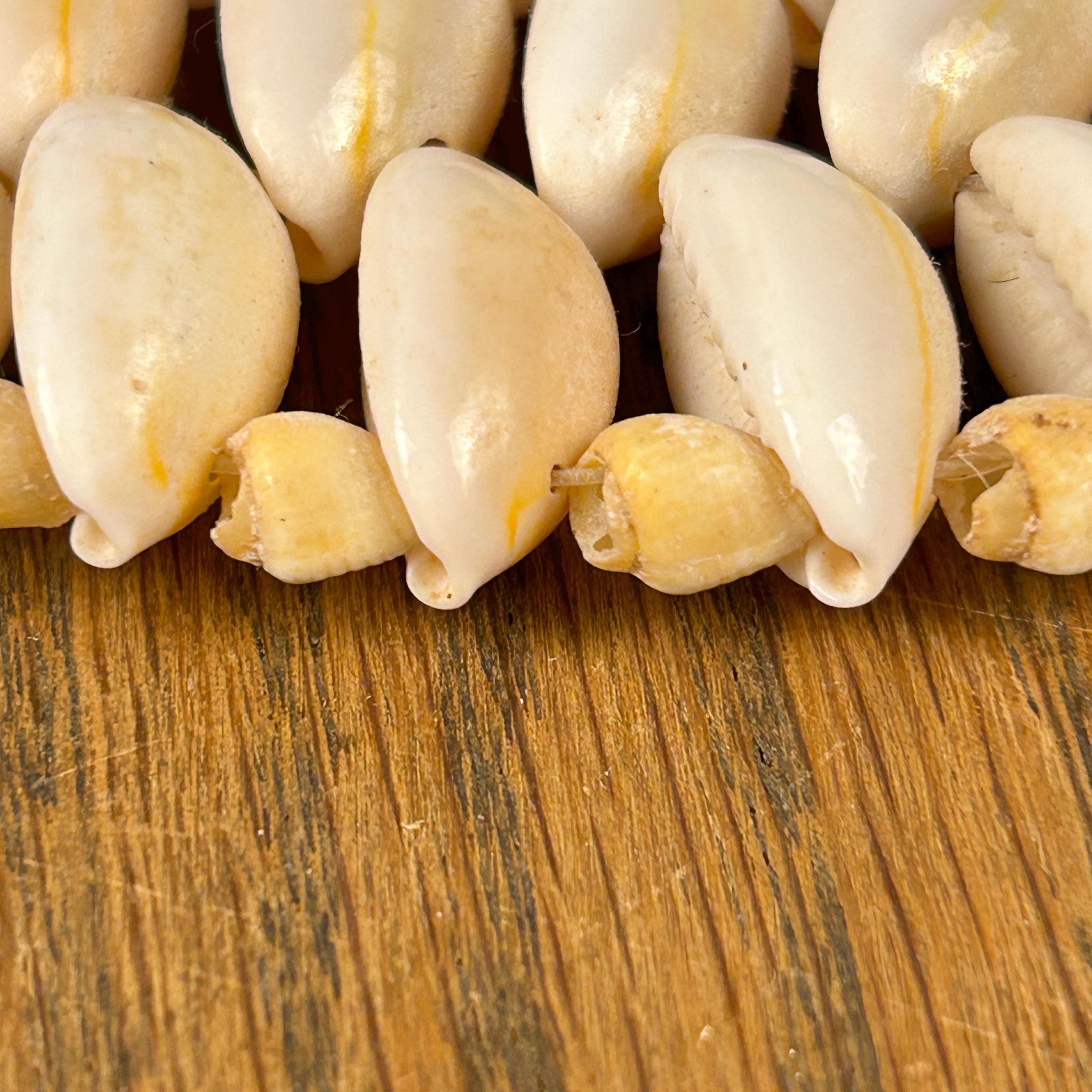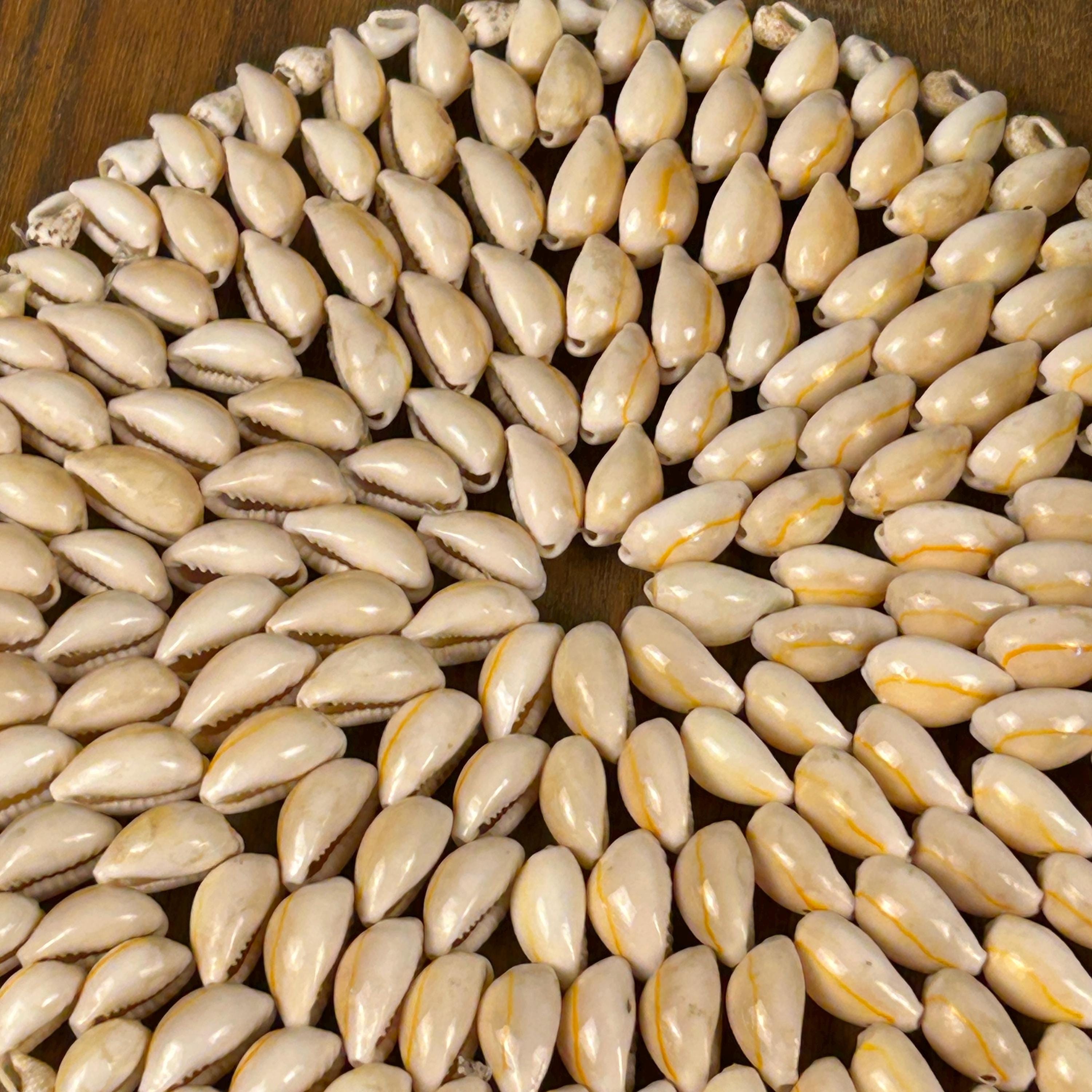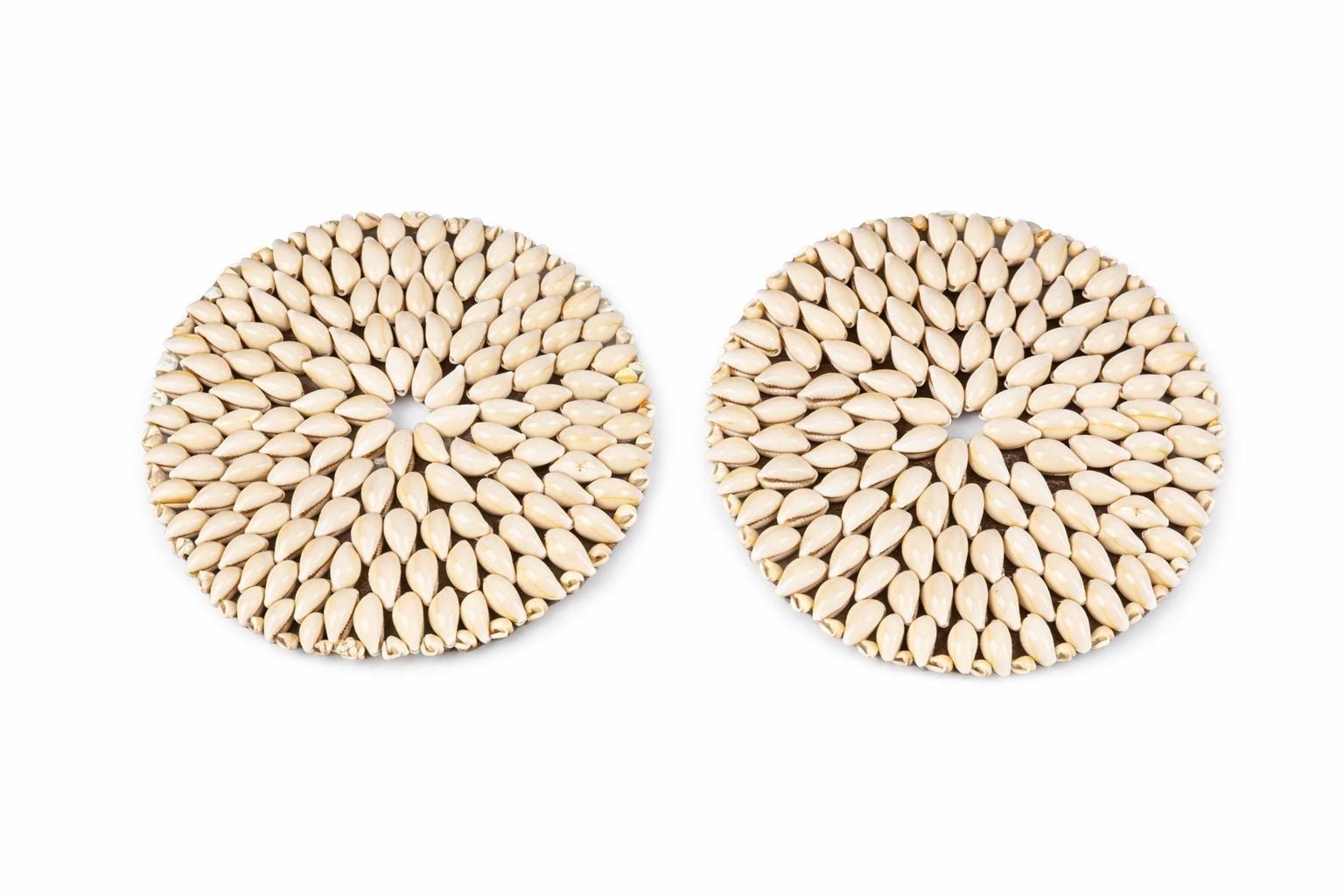 Add a touch of boho charm to your home with this beautiful set of two vintage cowrie shell trivets. Lovingly handcrafted, each trivet is made with meticulously arranged natural cowrie shells, showcasing their organic beauty and unique variations in creamy white and soft beige tones. The set includes two round trivets. These trivets are perfect for a beach-themed kitchen, a bohemian dining table, or as eye-catching wall decor.