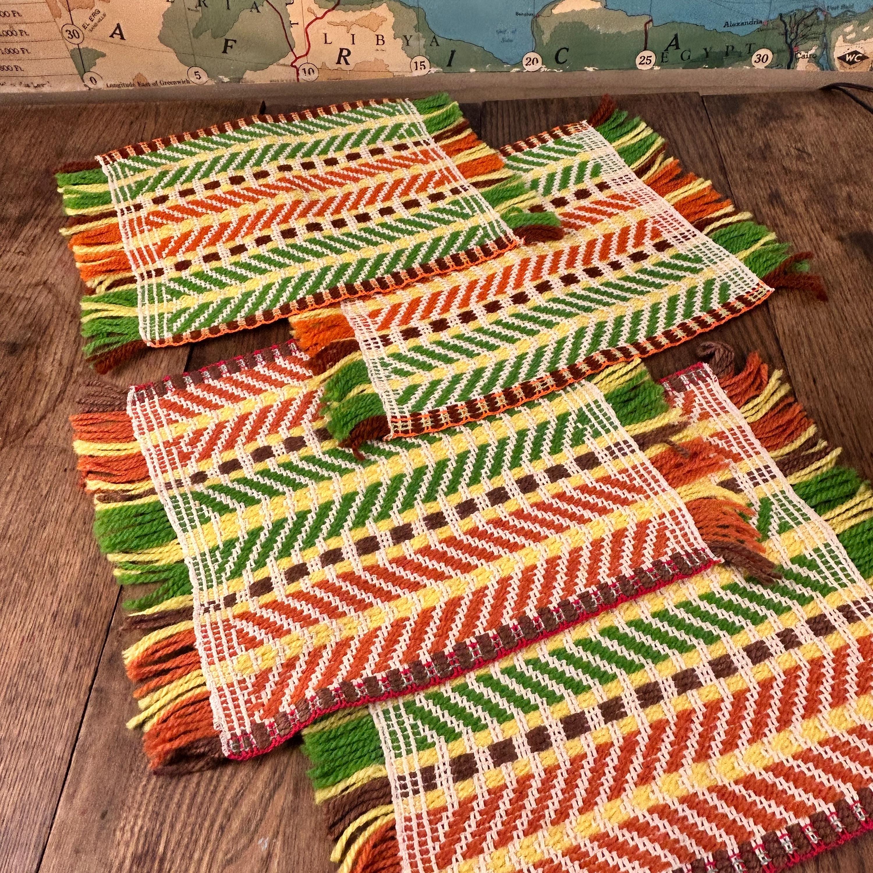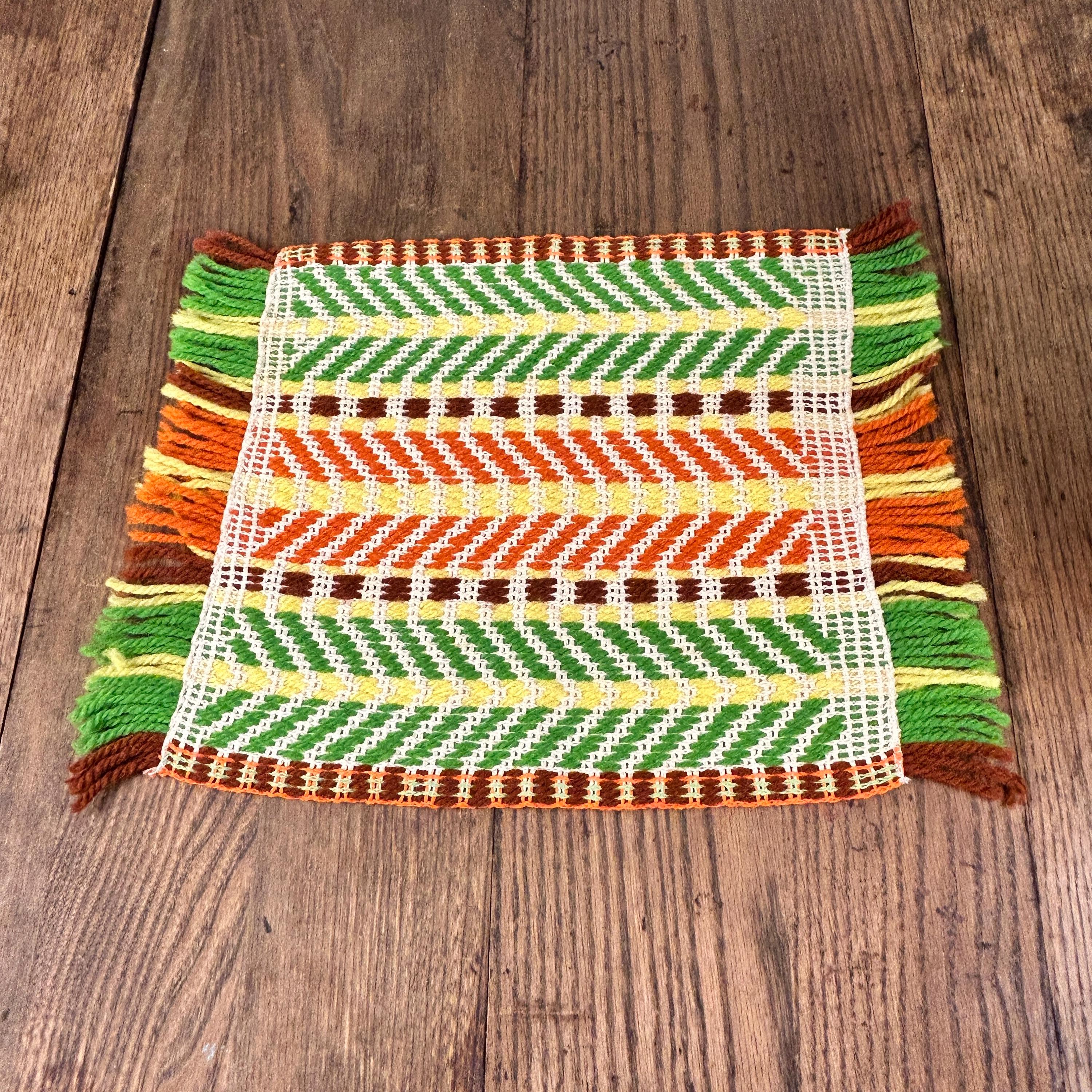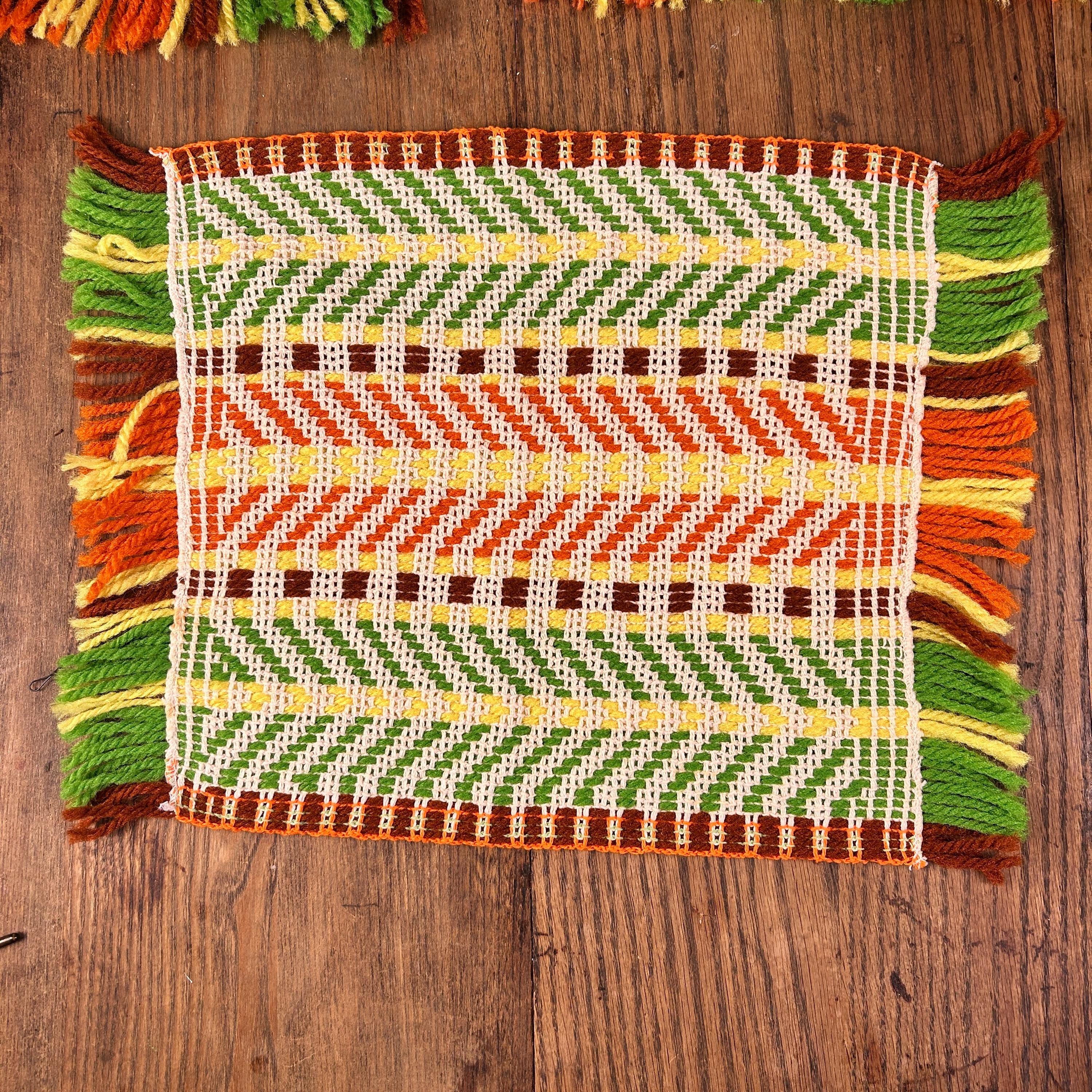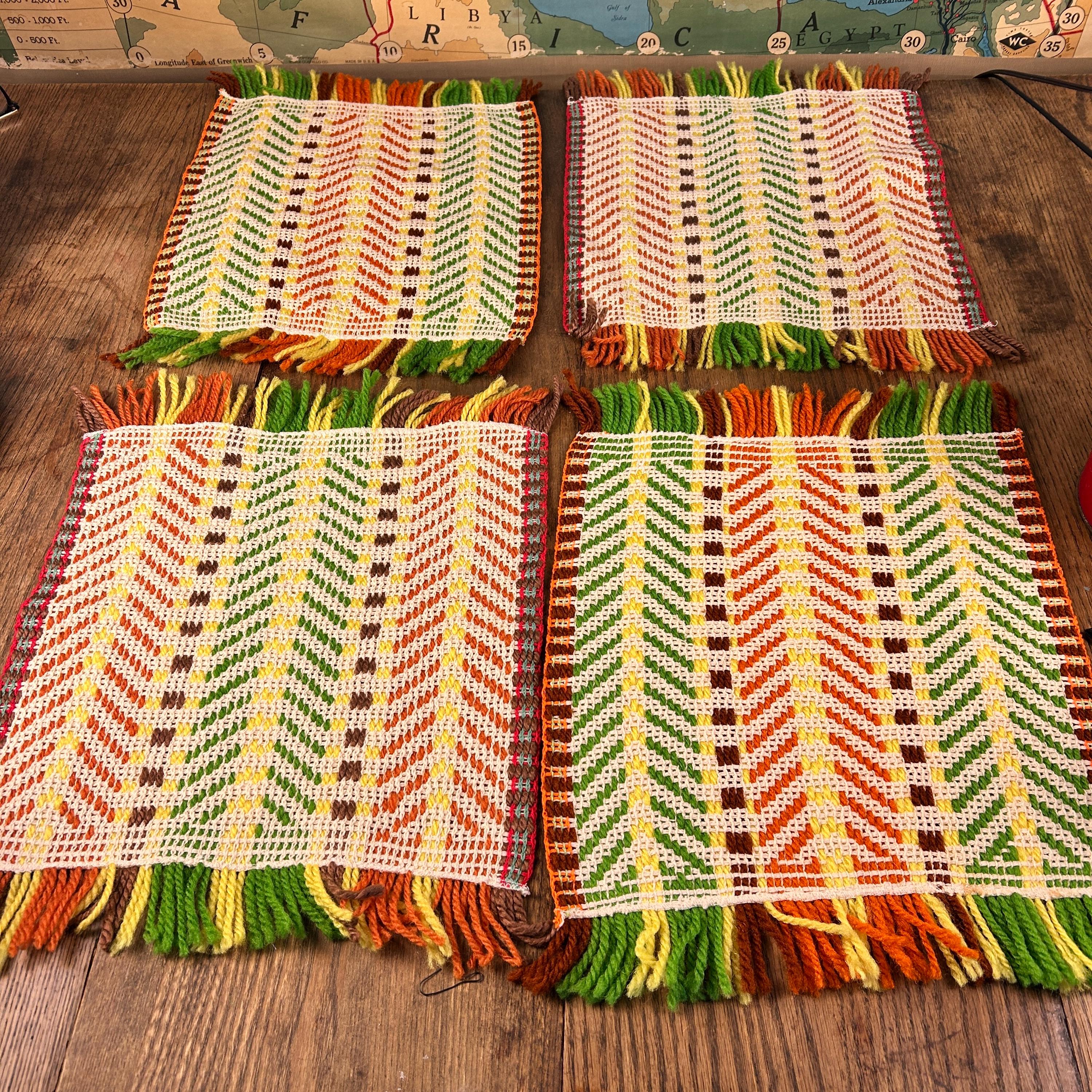 Either way you flip 'em, they're groovy as all get out. These placemats appear to have been handwoven. They are in the classic 70s color scheme - yellow, brown, orange, and green woven with beige yarn to highlight the woven design.